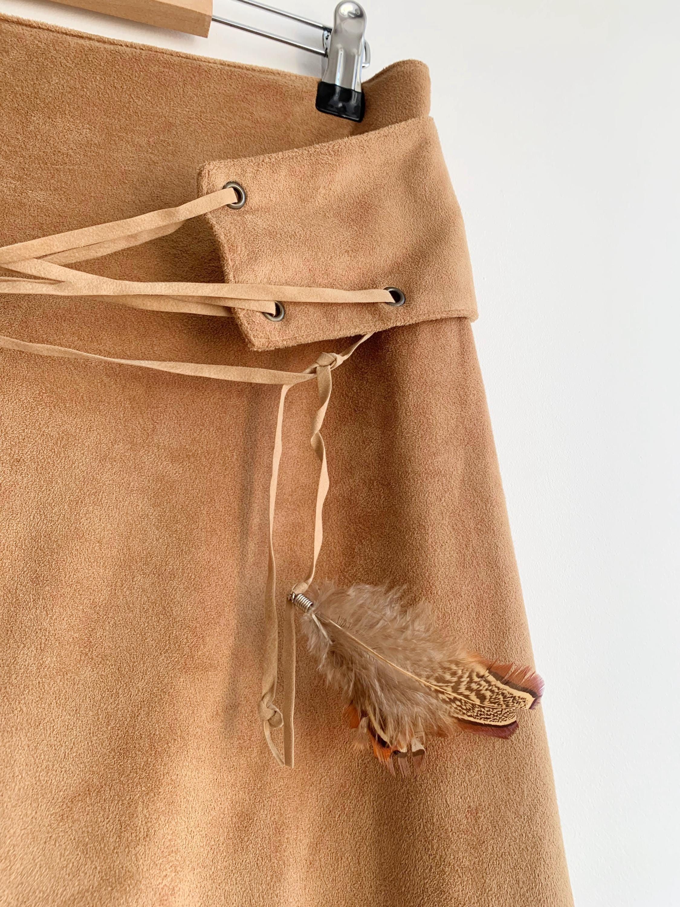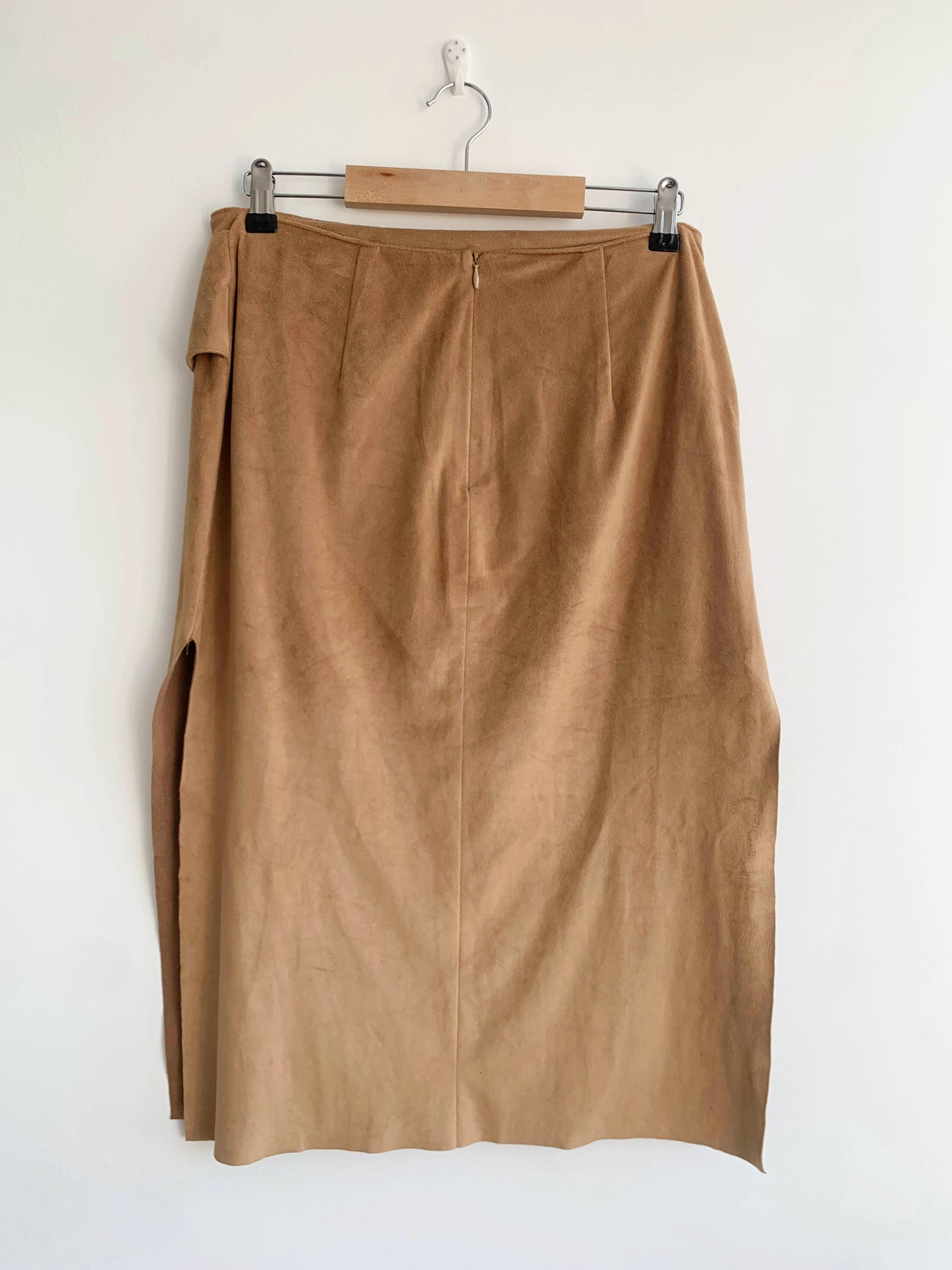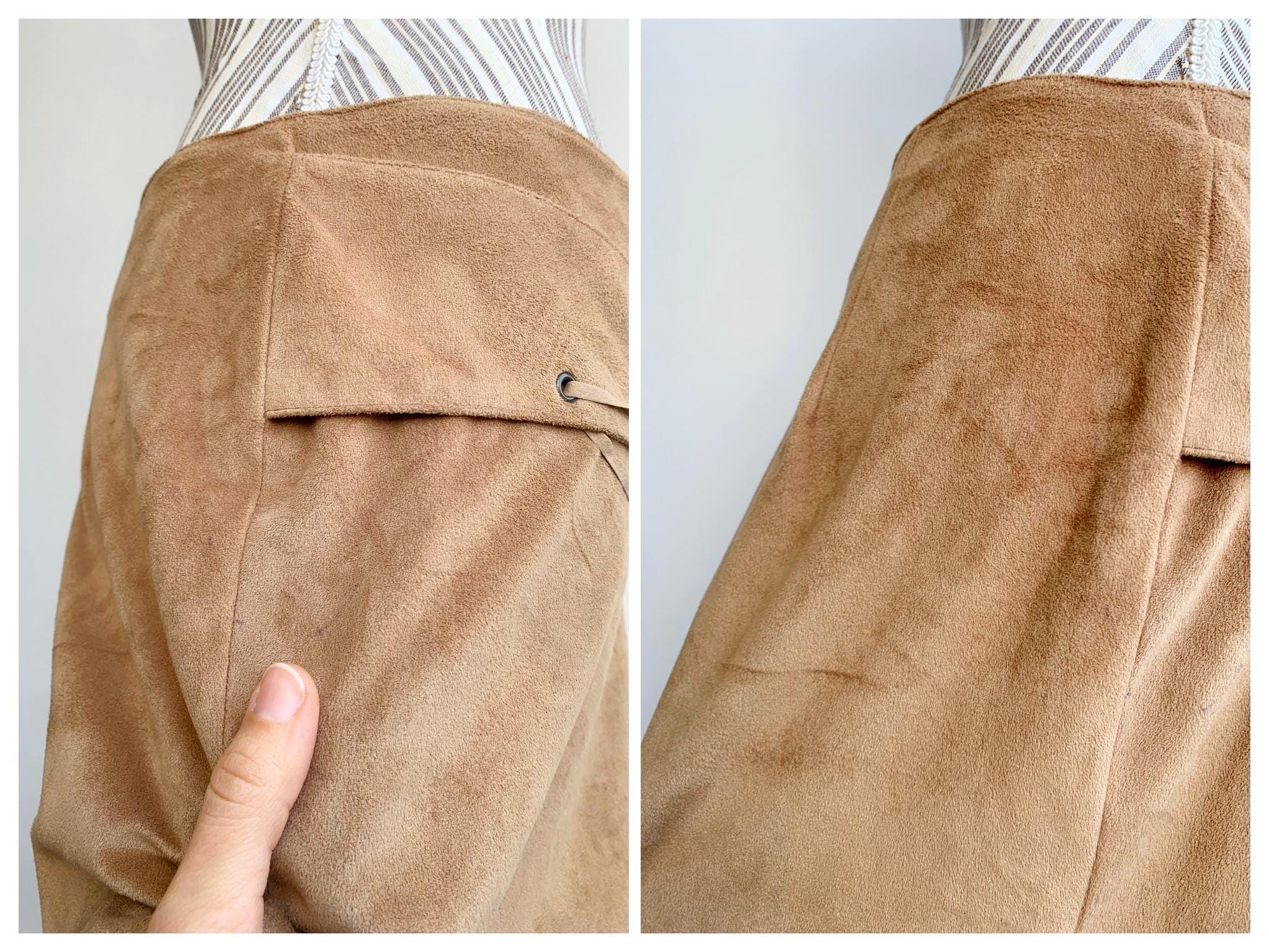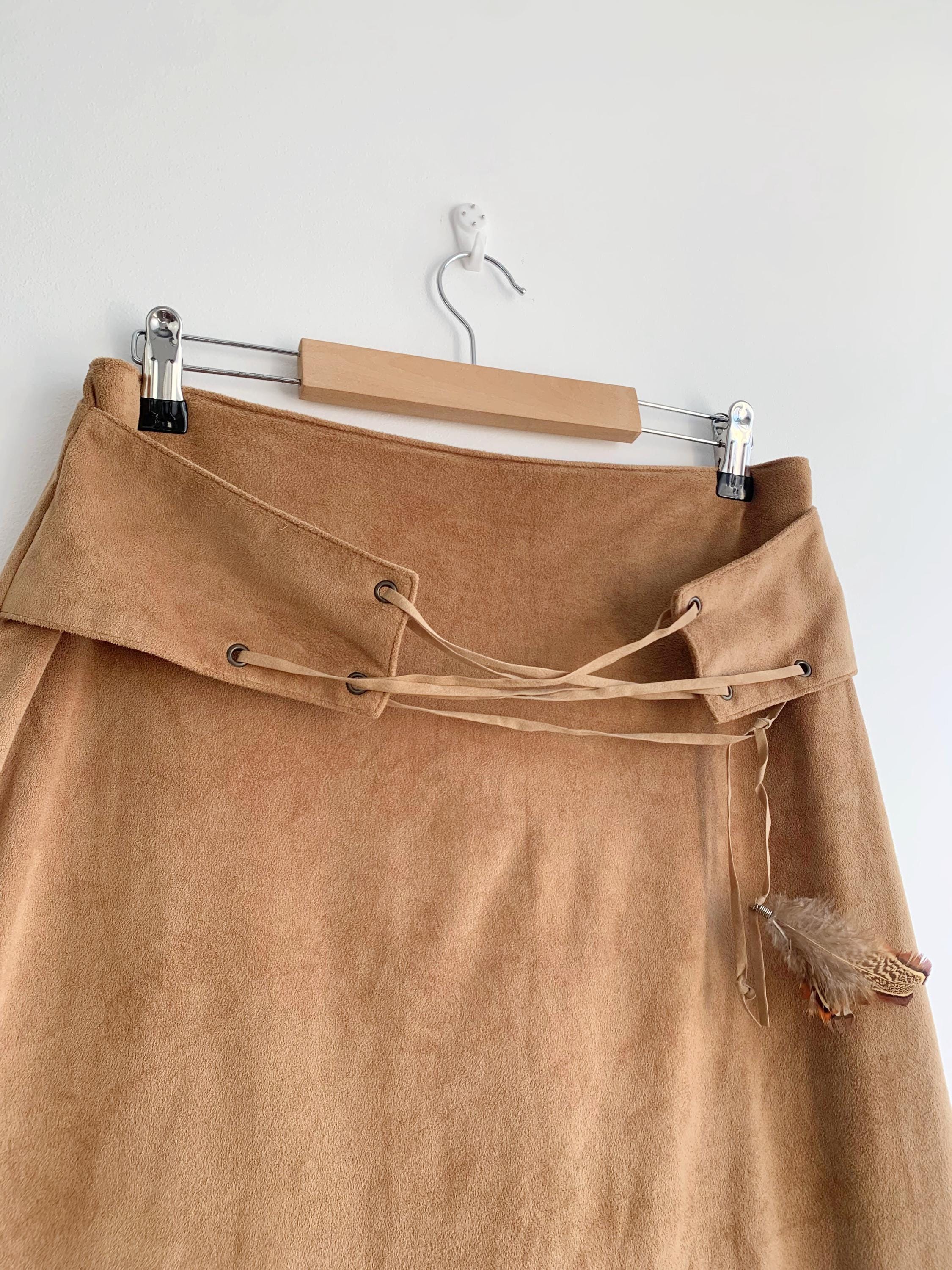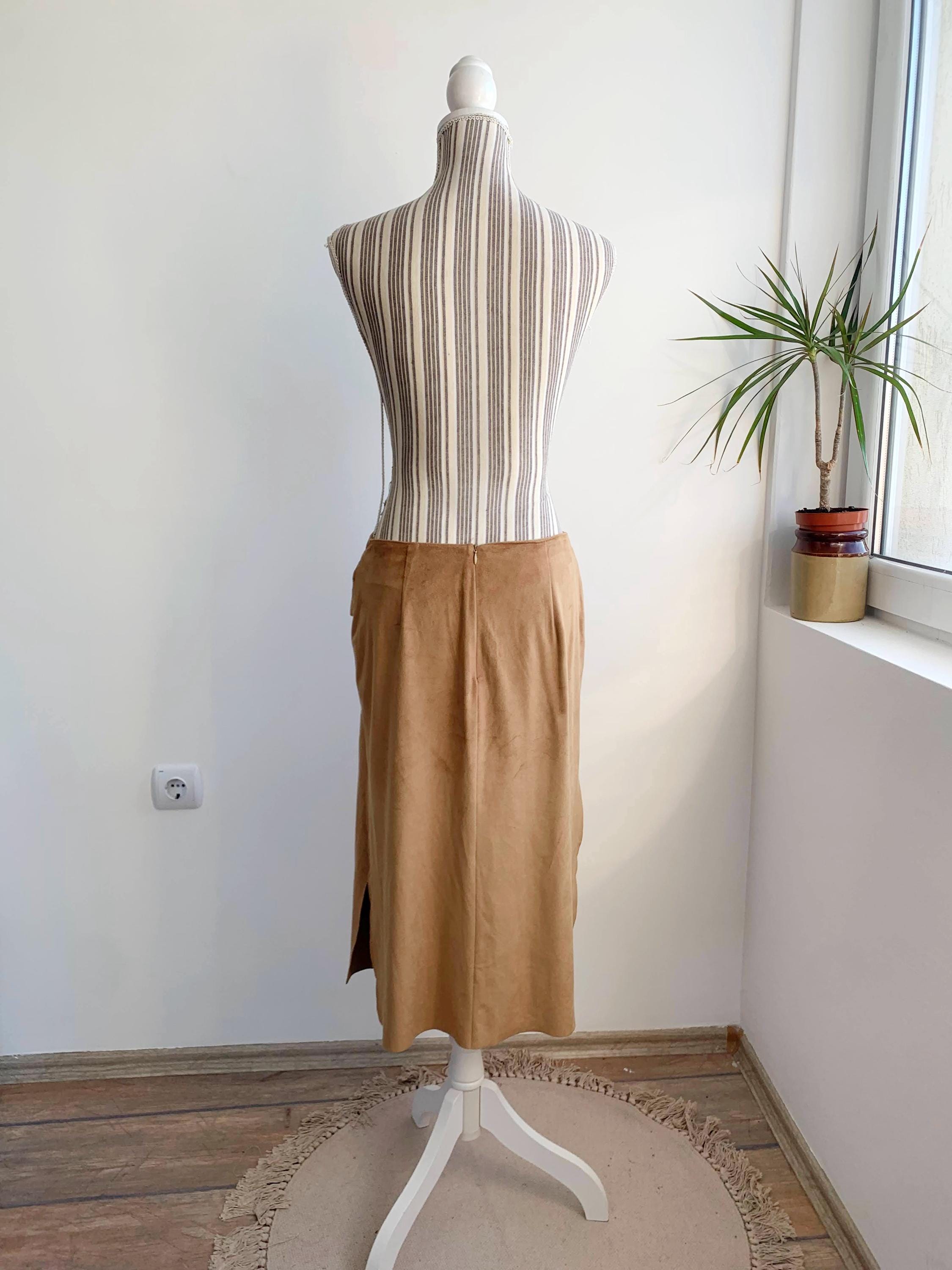 This is a vintage 90s camel brown velour midi skirt for women made of stretchy velour fabric made of 100% polyester with zip up back and lace up front. This stretchy mid calf boho skirt has straight silhouette and side slits on both sides. This grunge velour skirt was made in Italy. The size marked is M. Please check the measurements below.