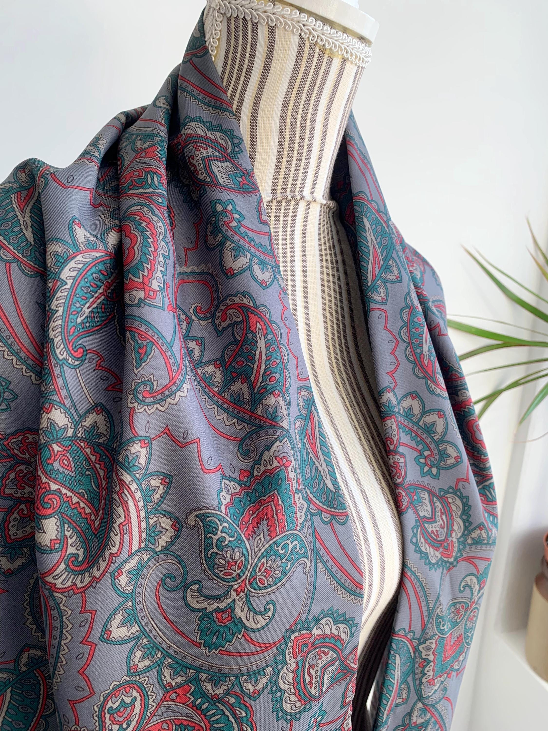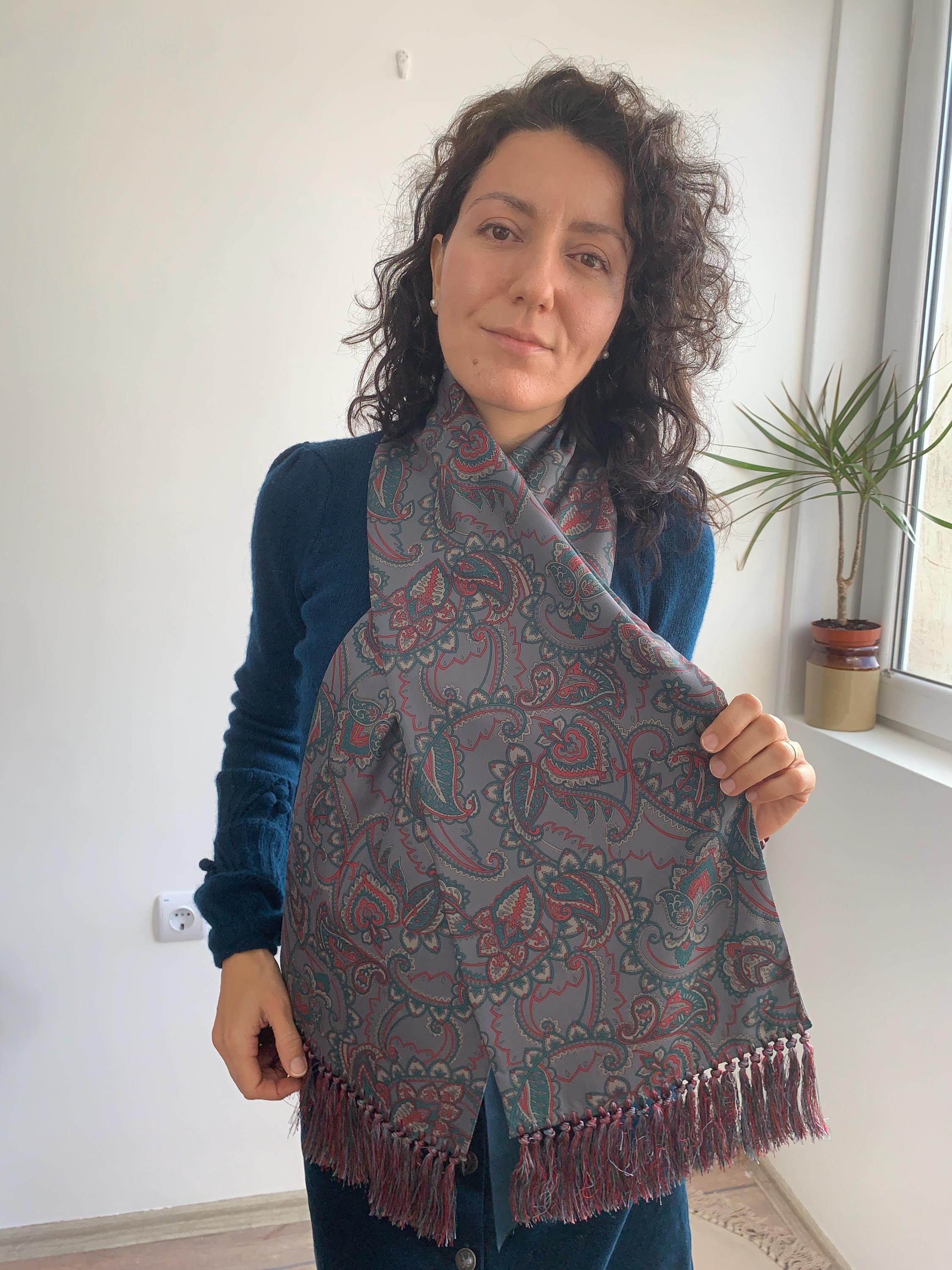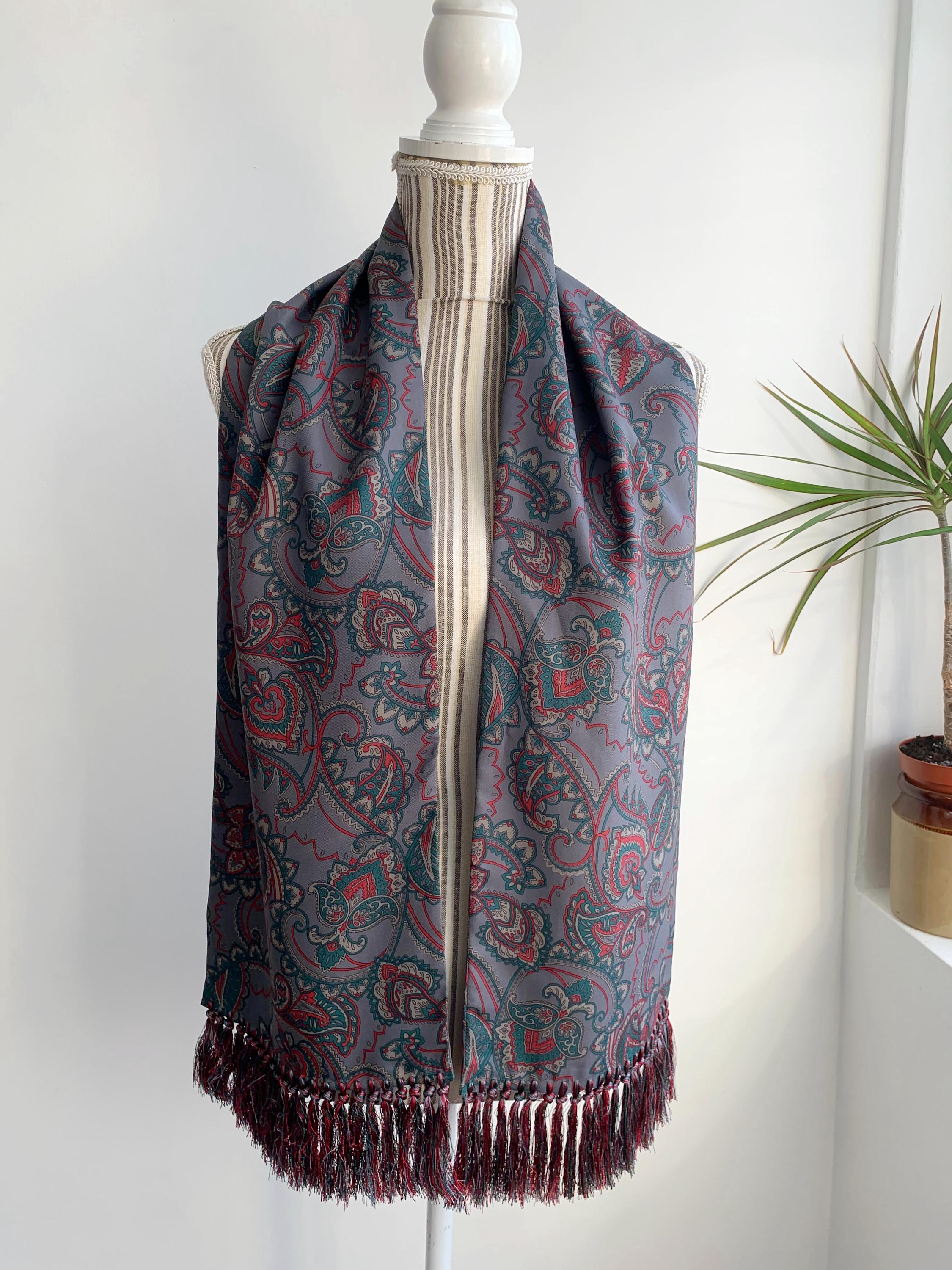 This is a vintage silver grey double sided neck scarf with floral paisley print in burgundy red and teal green. This unisex elegant neck scarf is identical on both sides with silk fringe at the bottom