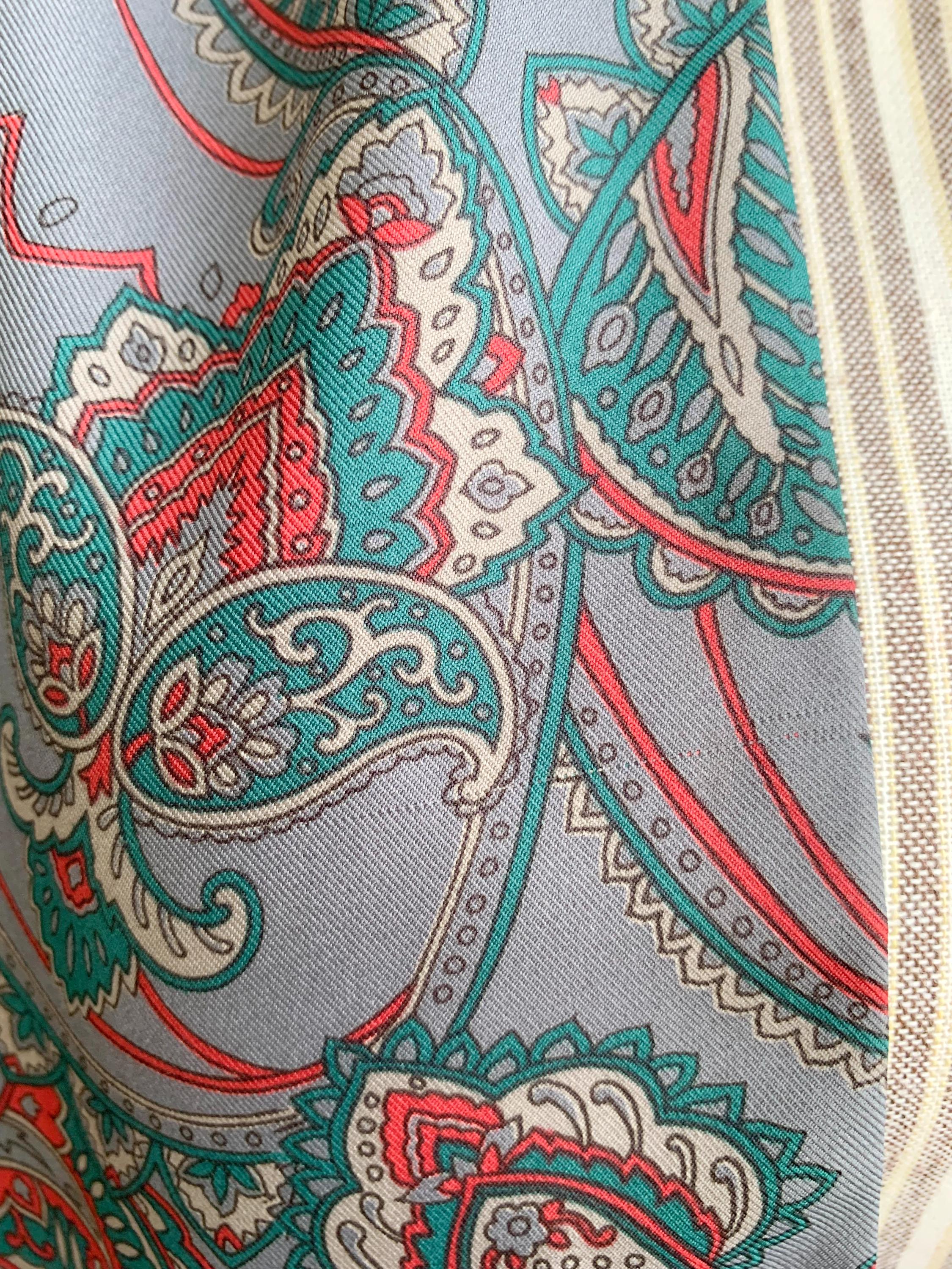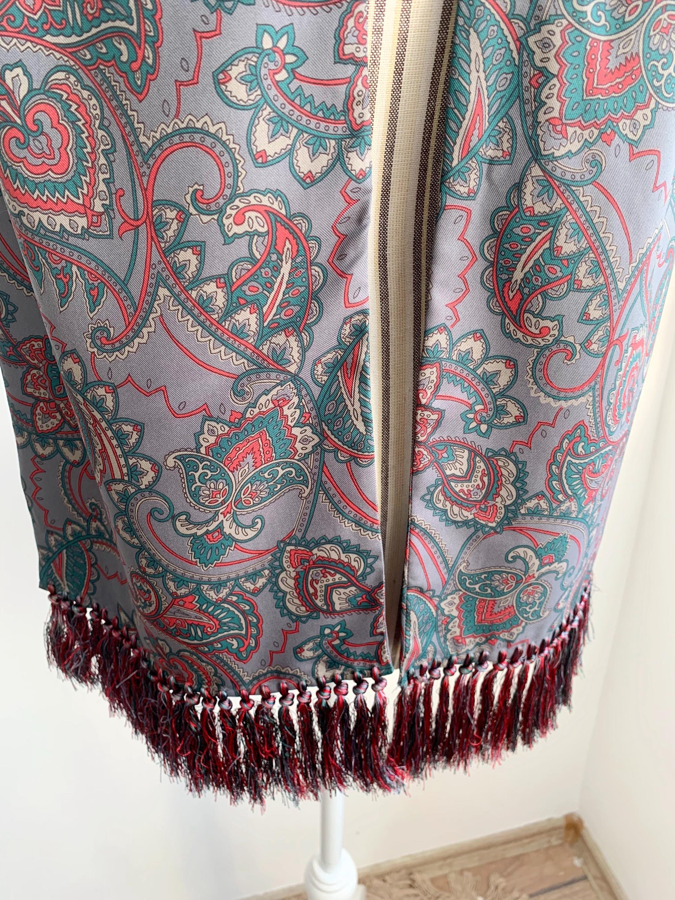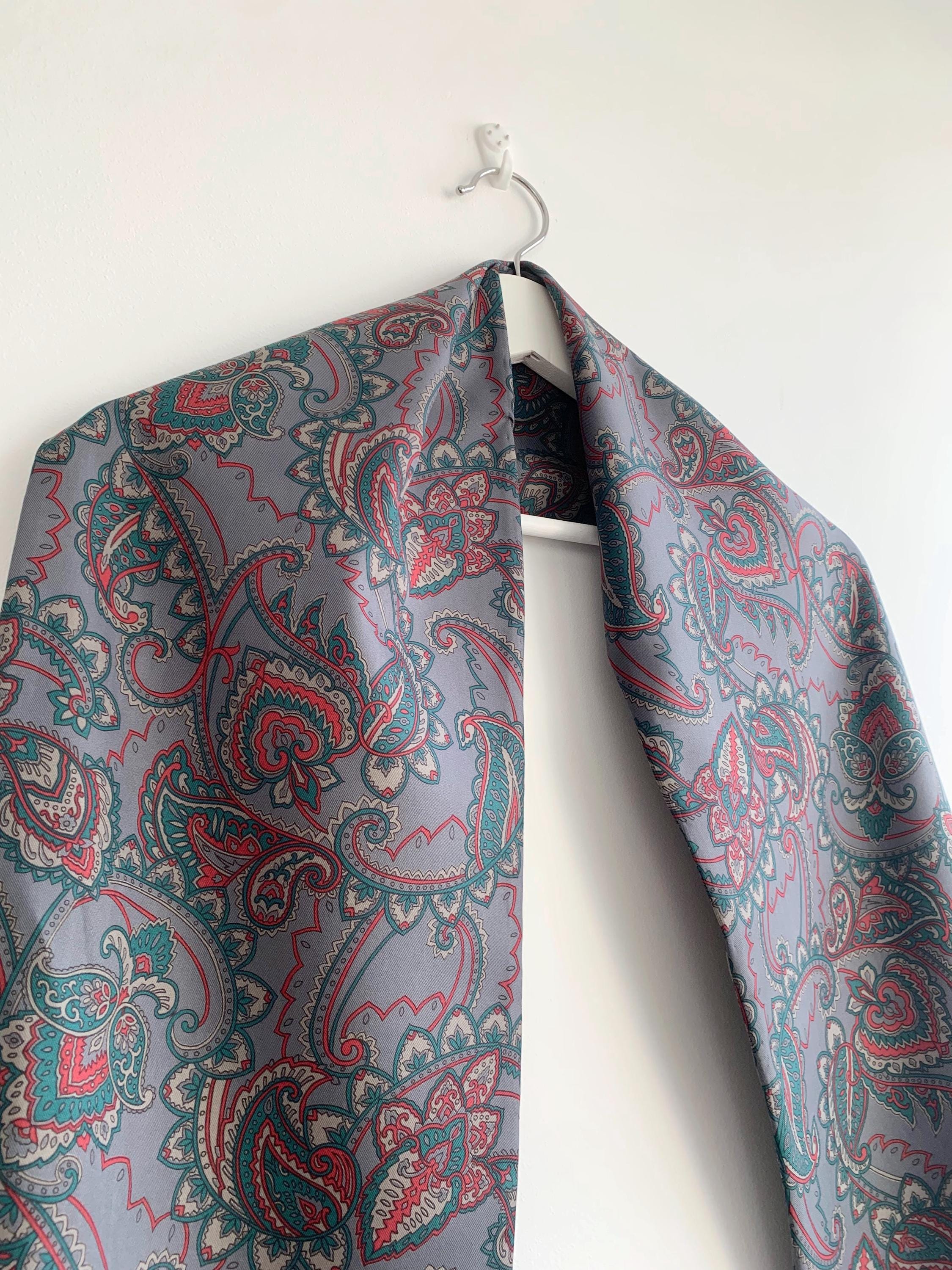 This is a vintage silver grey double sided neck scarf with floral paisley print in burgundy red and teal green. This unisex elegant neck scarf is identical on both sides with silk fringe at the bottom