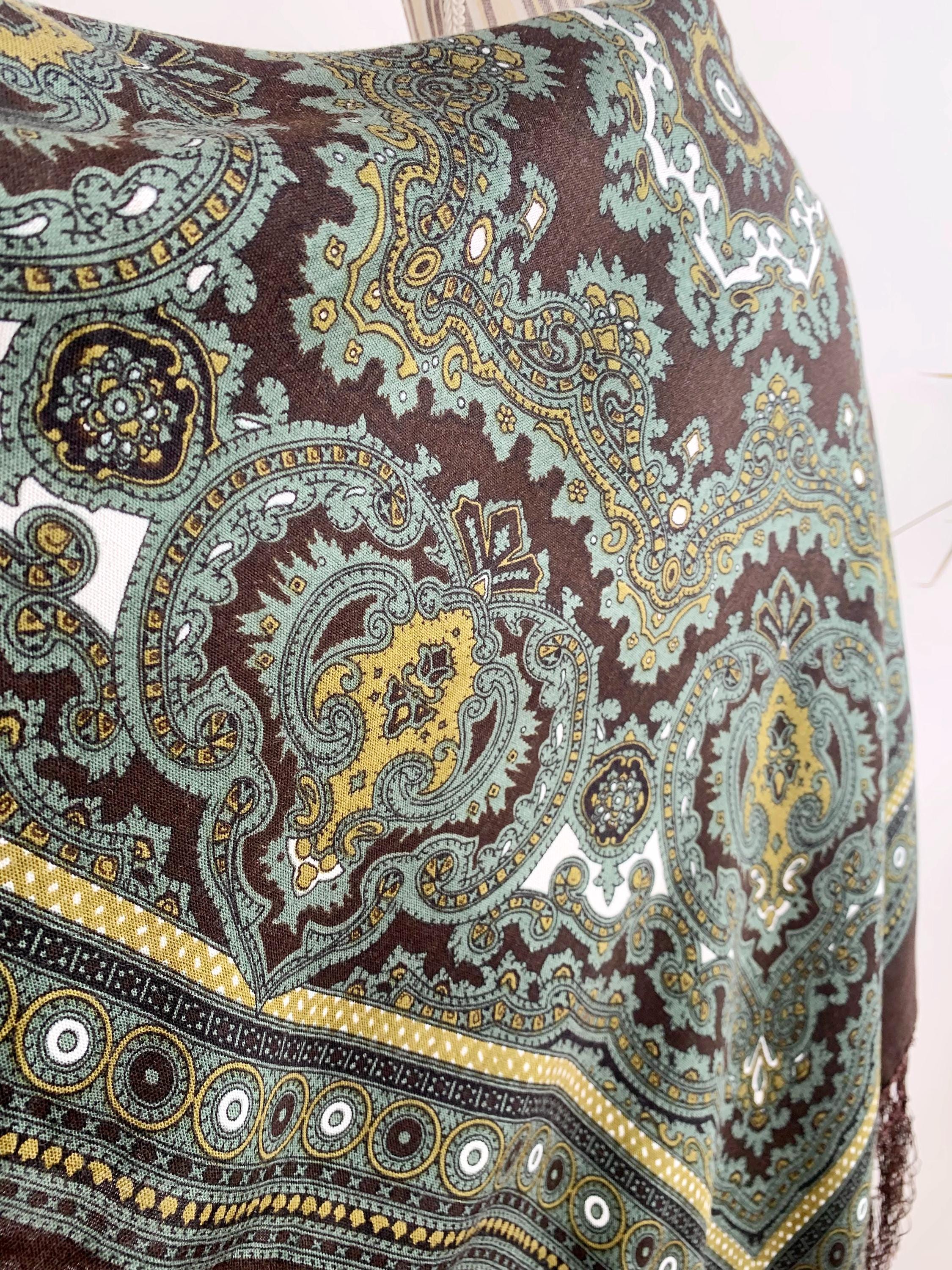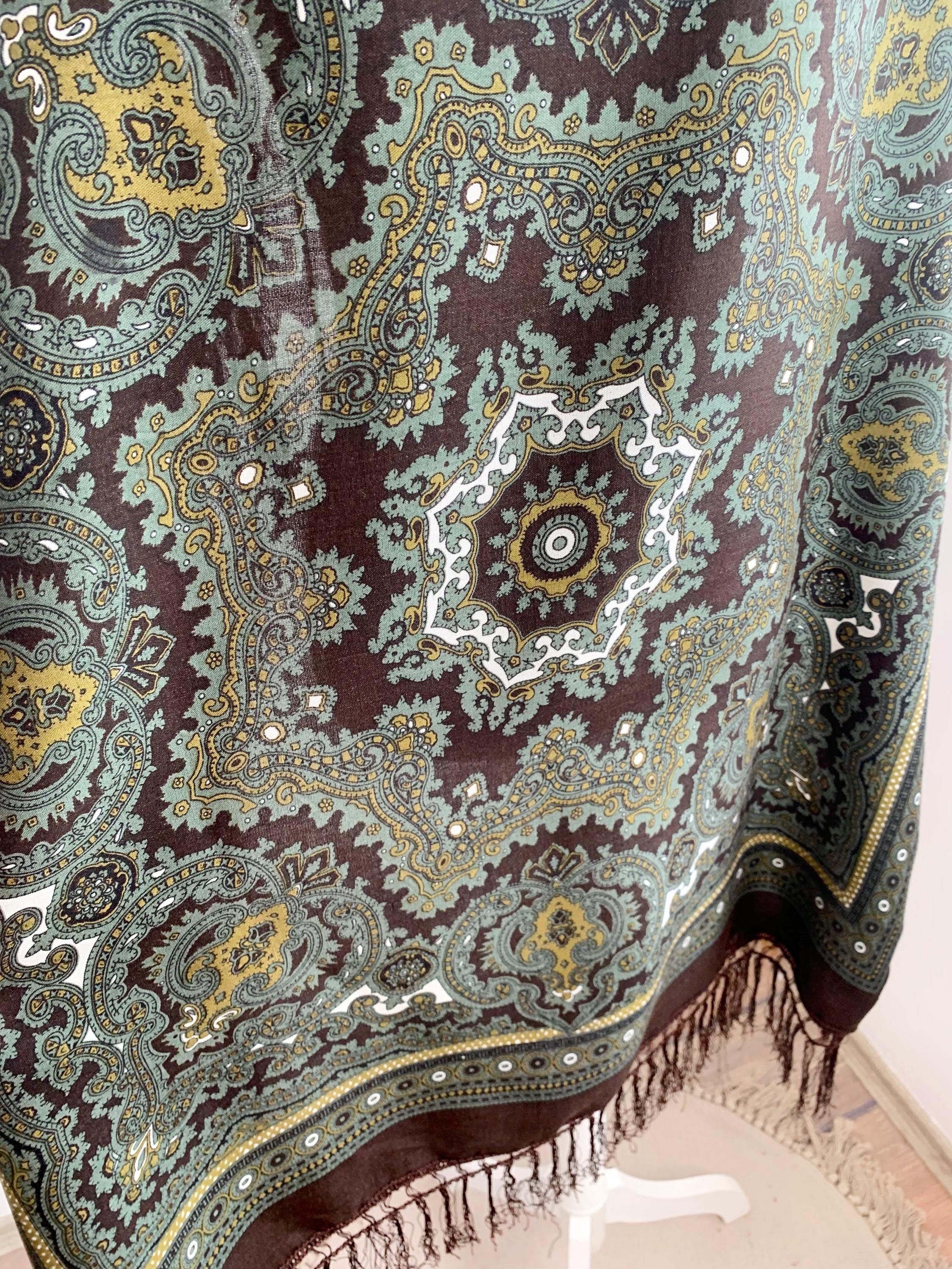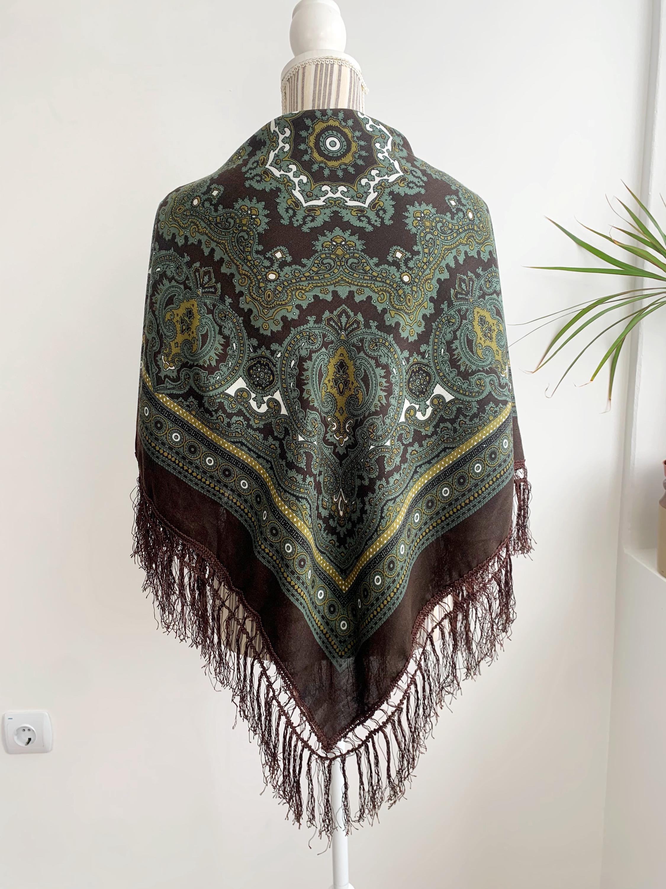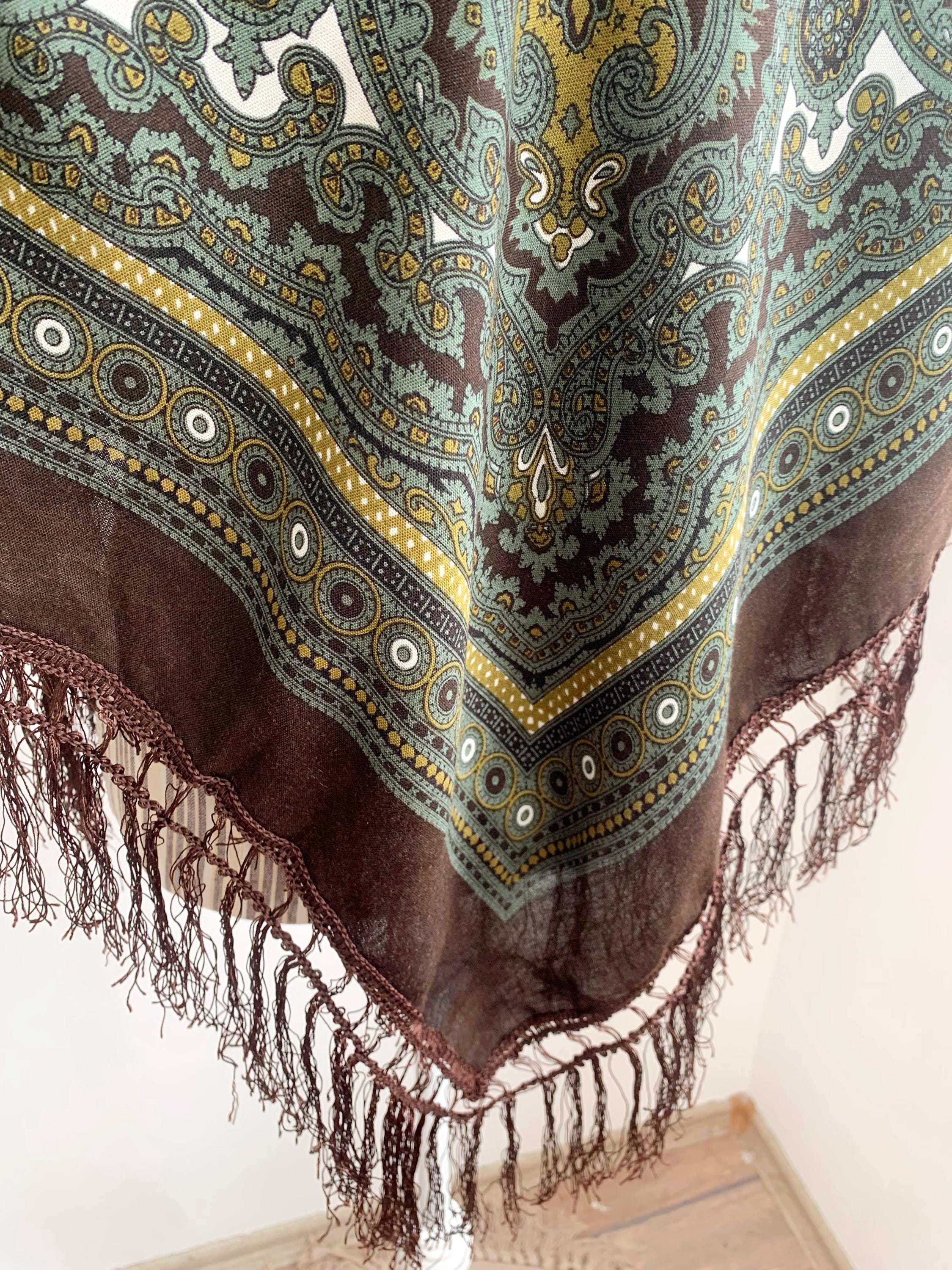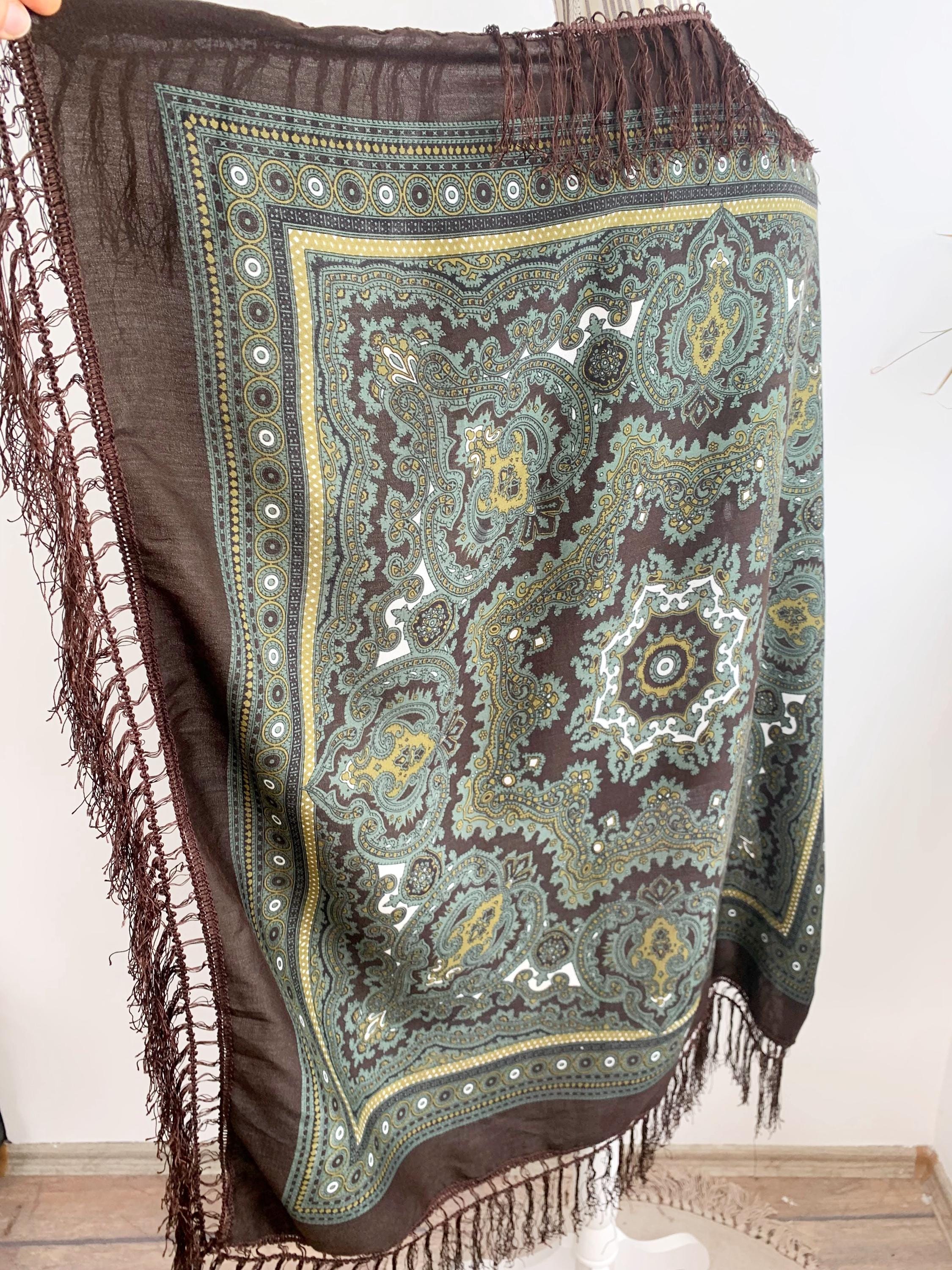 This is an oversized Babushka style scarf in shades of brown, khaki green, chartreuse green and white. This abstract floral print scarf is made of semi sheer fabric which feels like thin wool with silk fringe. Perfect bohemian shawl to add a pop of glaborous 70s vibe to your outfit. This large square scarf can be worn in so many different ways - as a neck or head scarf, or as a shoulder shawl.