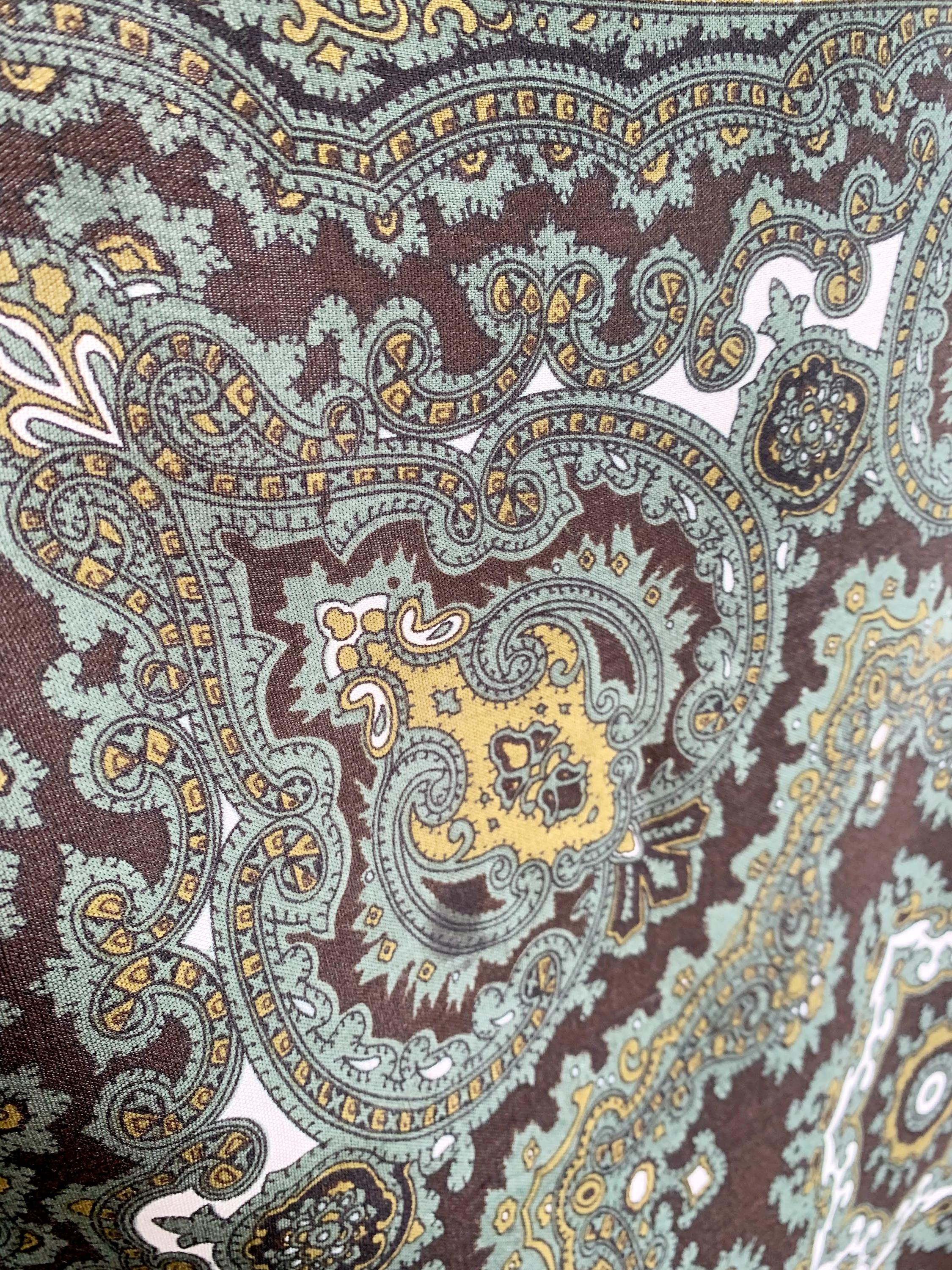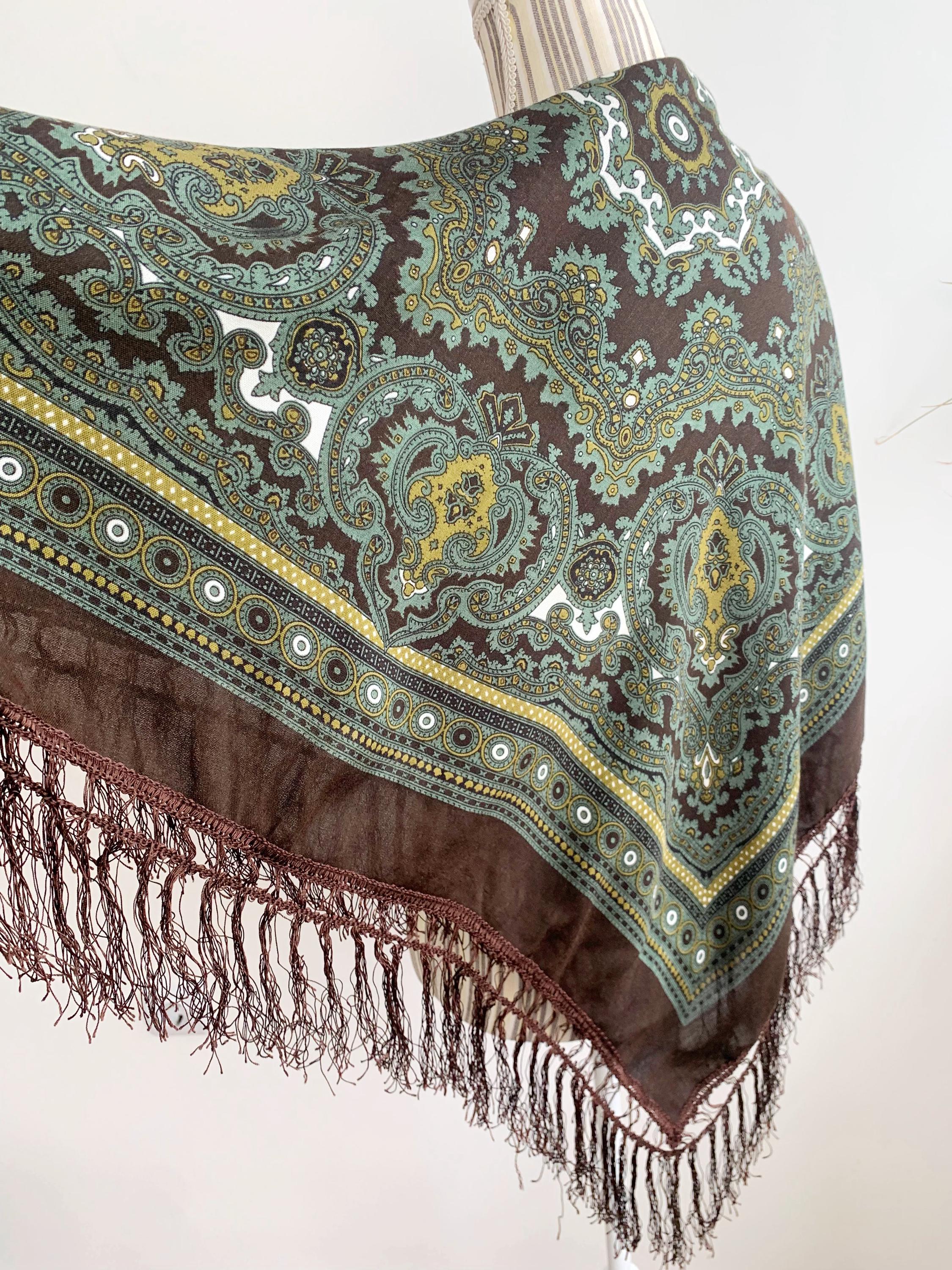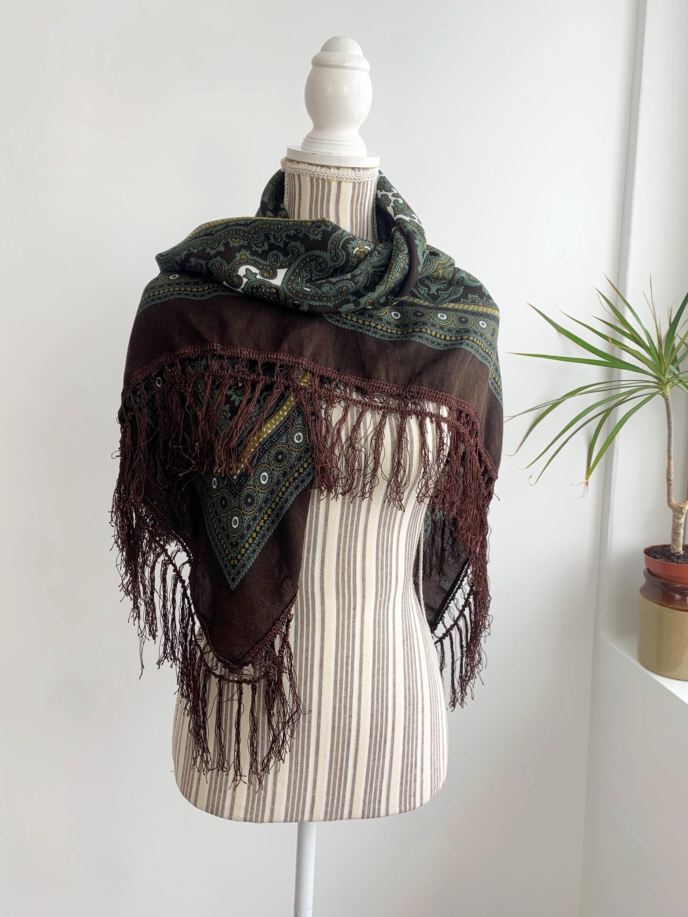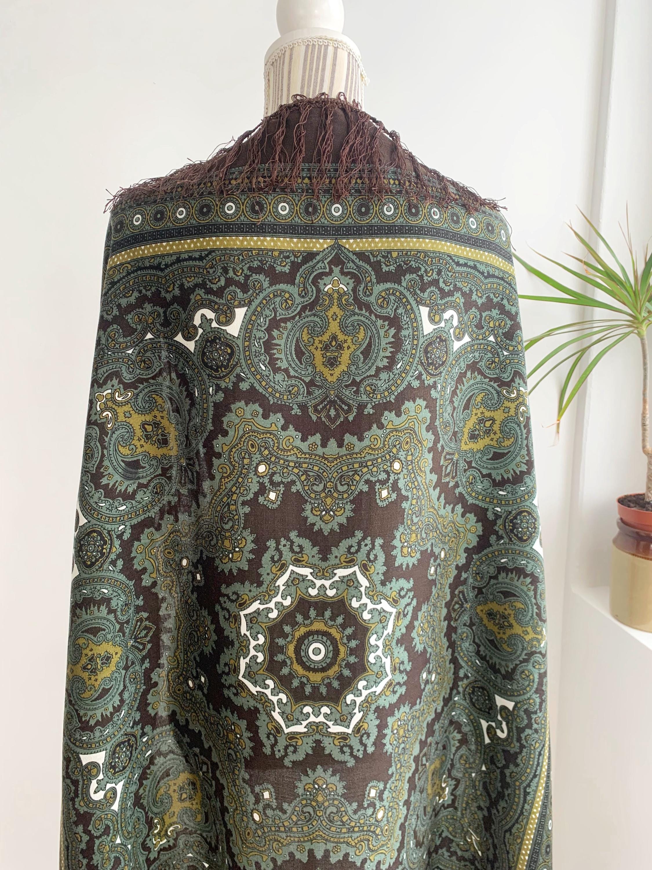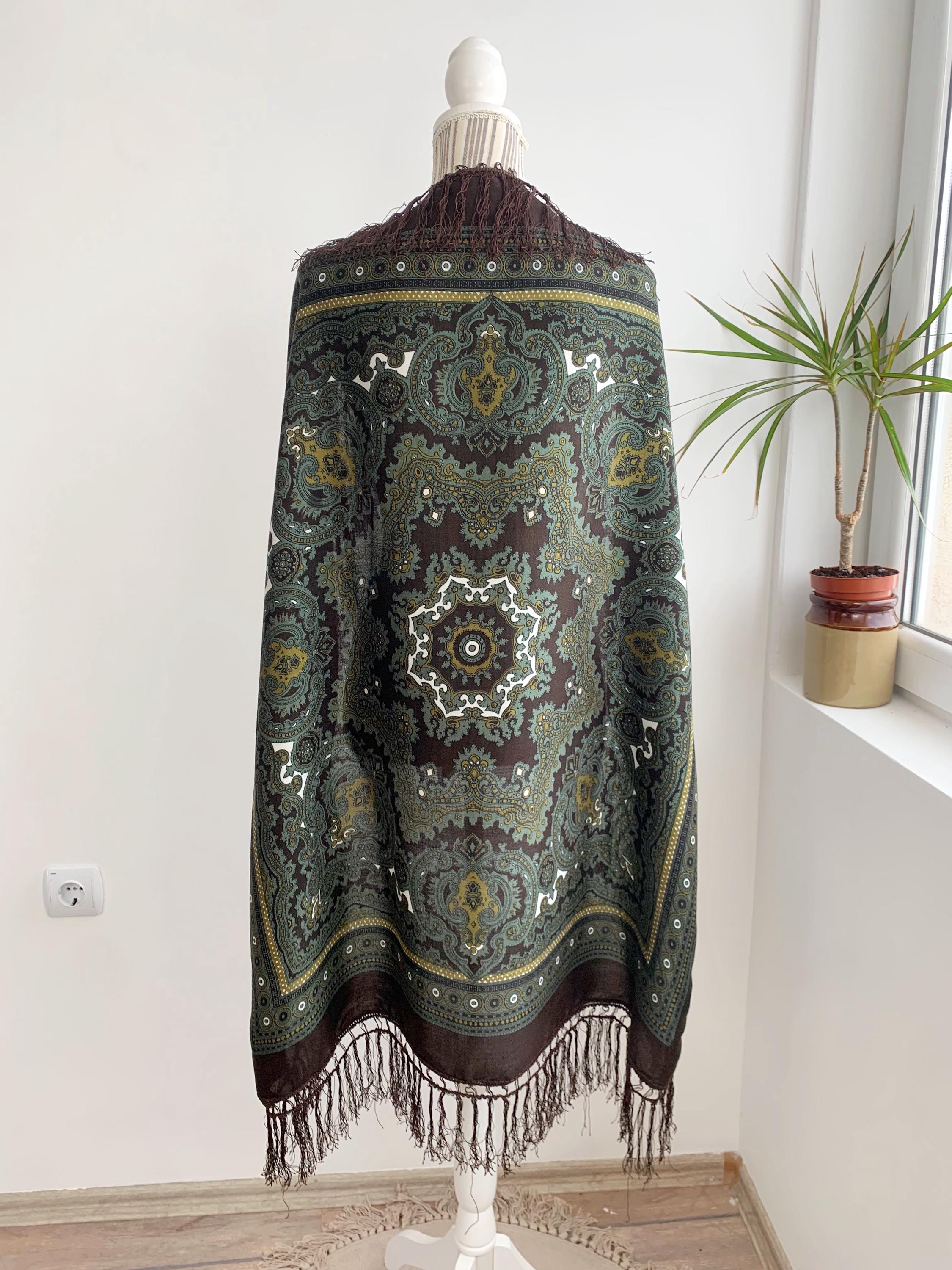 This is an oversized Babushka style scarf in shades of brown, khaki green, chartreuse green and white. This abstract floral print scarf is made of semi sheer fabric which feels like thin wool with silk fringe. Perfect bohemian shawl to add a pop of glaborous 70s vibe to your outfit. This large square scarf can be worn in so many different ways - as a neck or head scarf, or as a shoulder shawl.