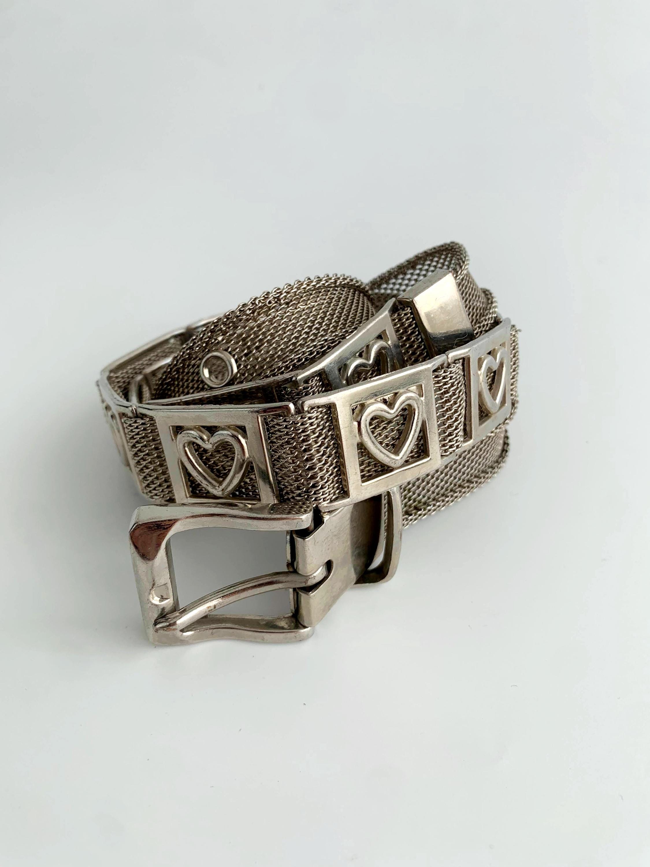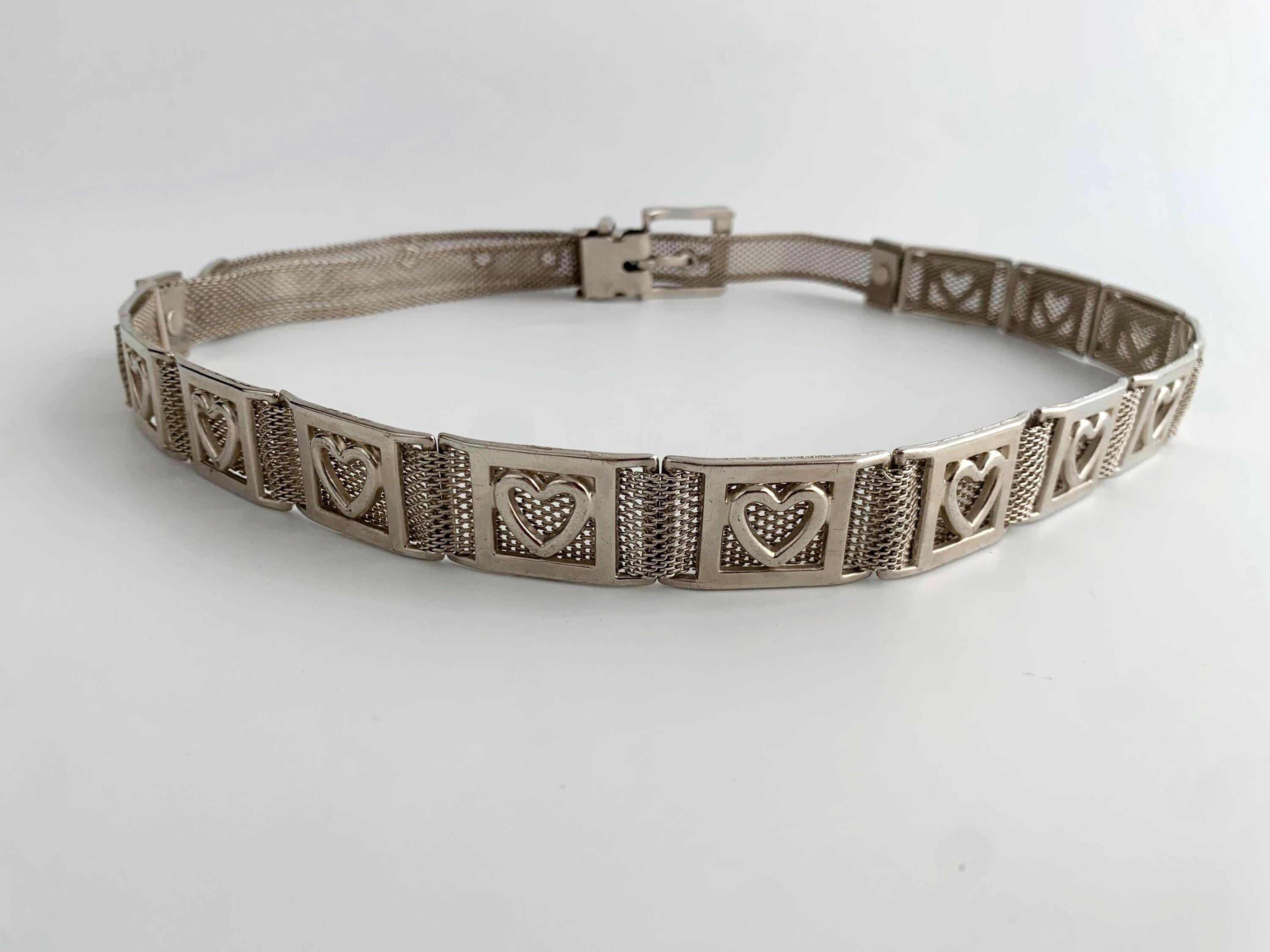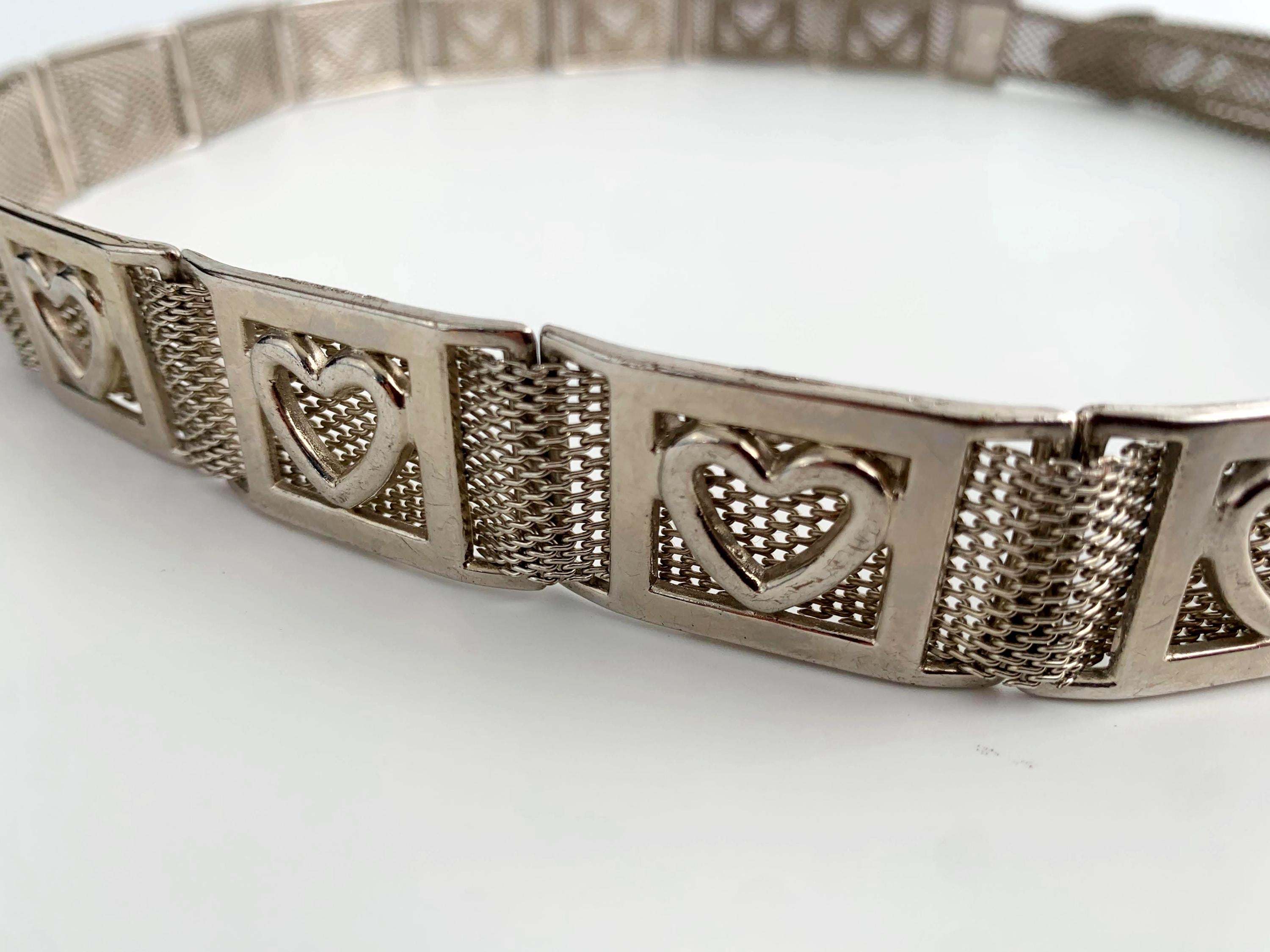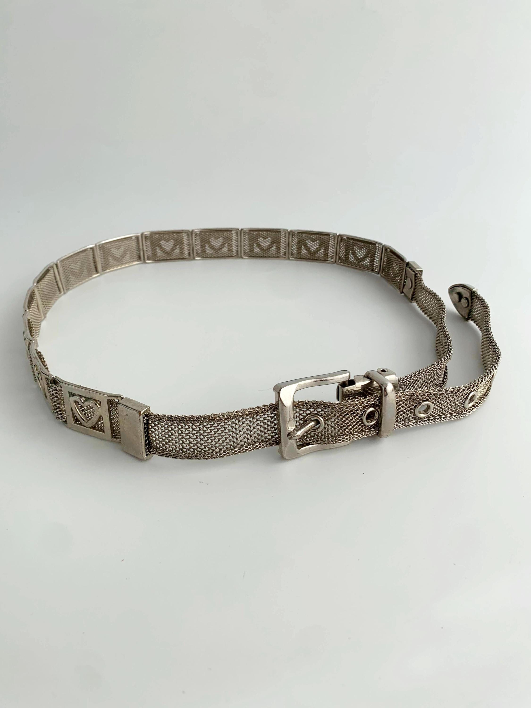 This is a vintage 80s silver tone mesh belt for women with heart shaped metal plates and slim silver tone buckle. This slim disco belt is made of mesh silver metal.