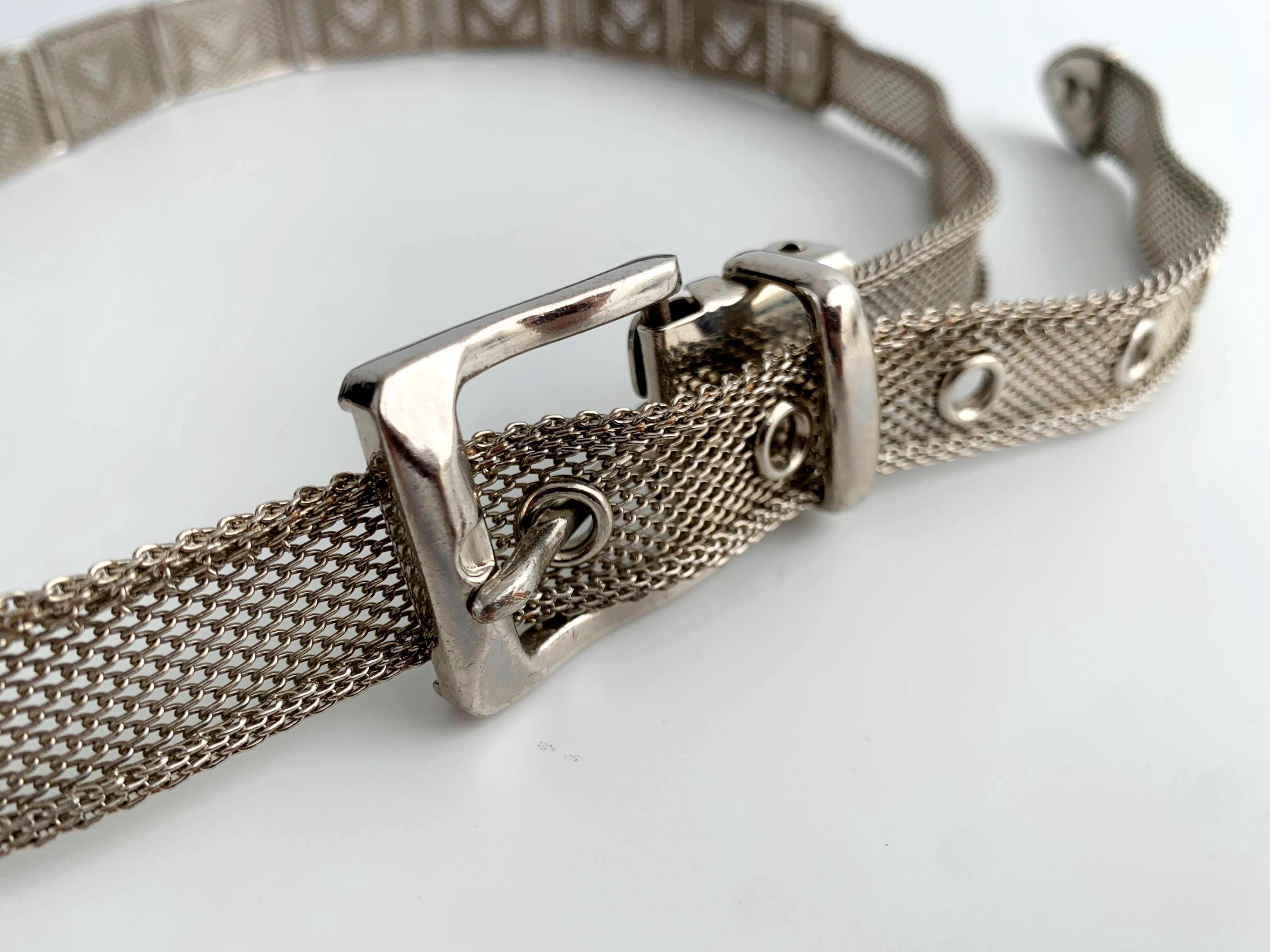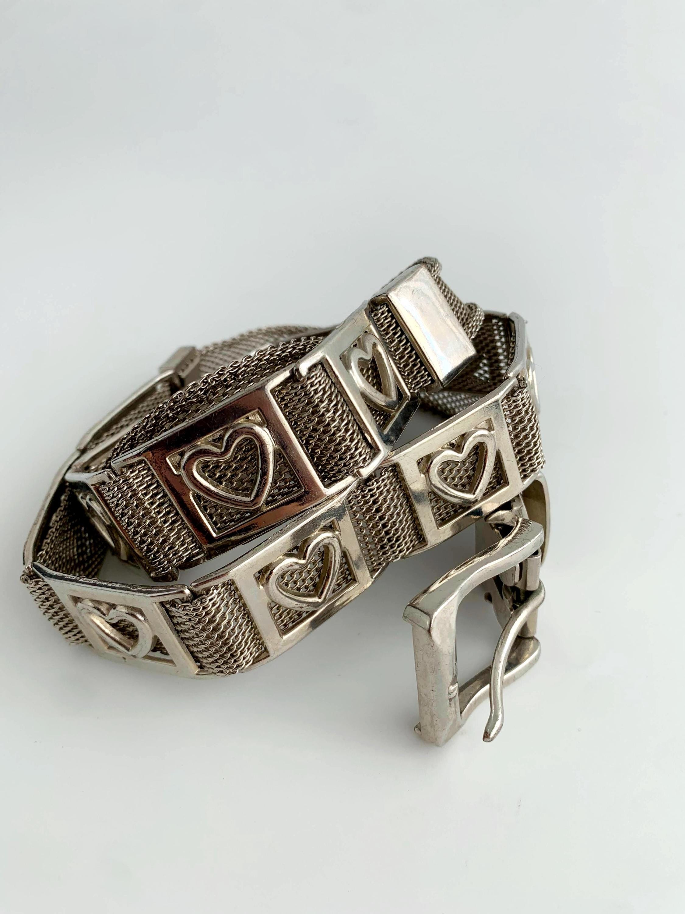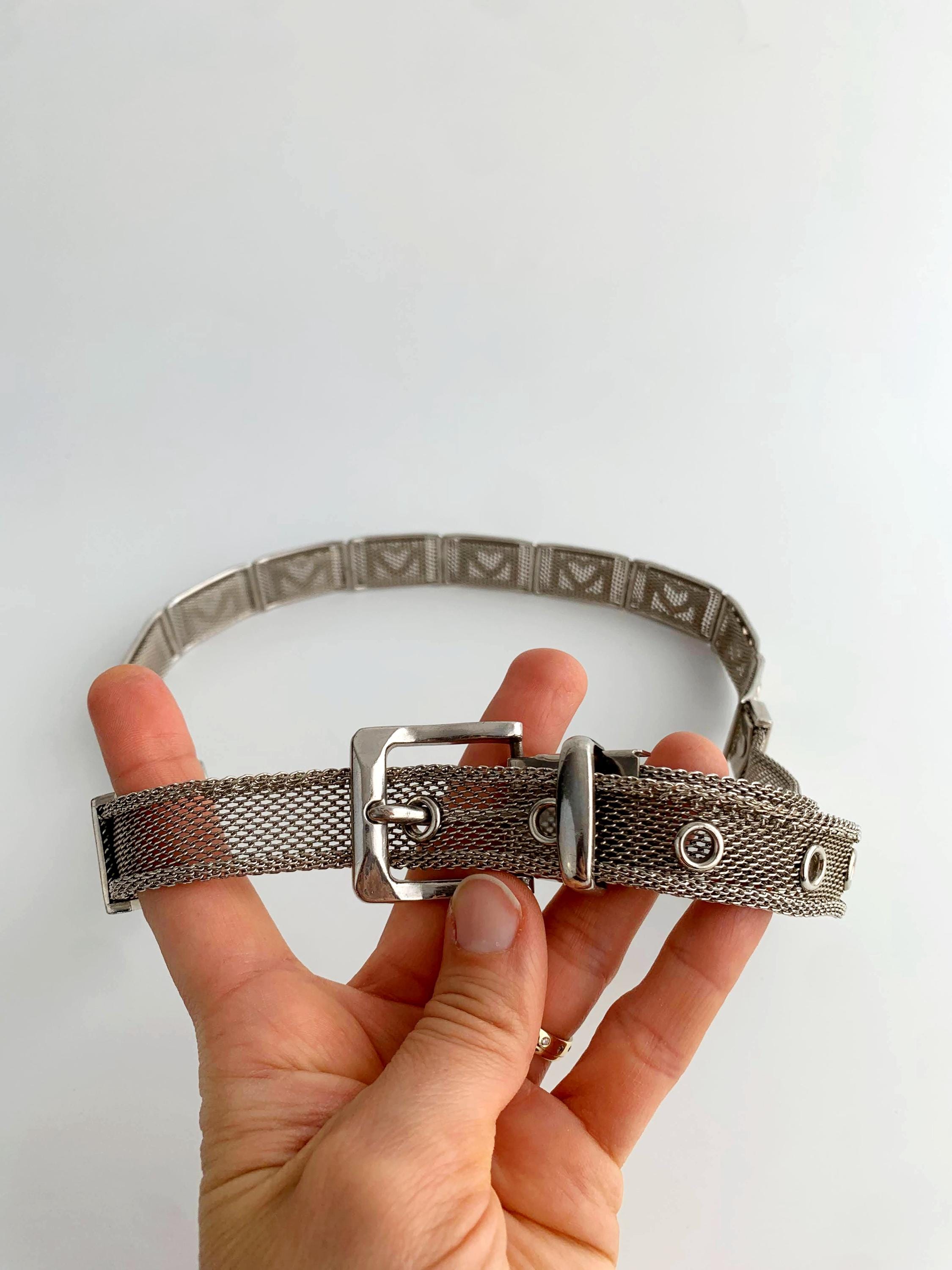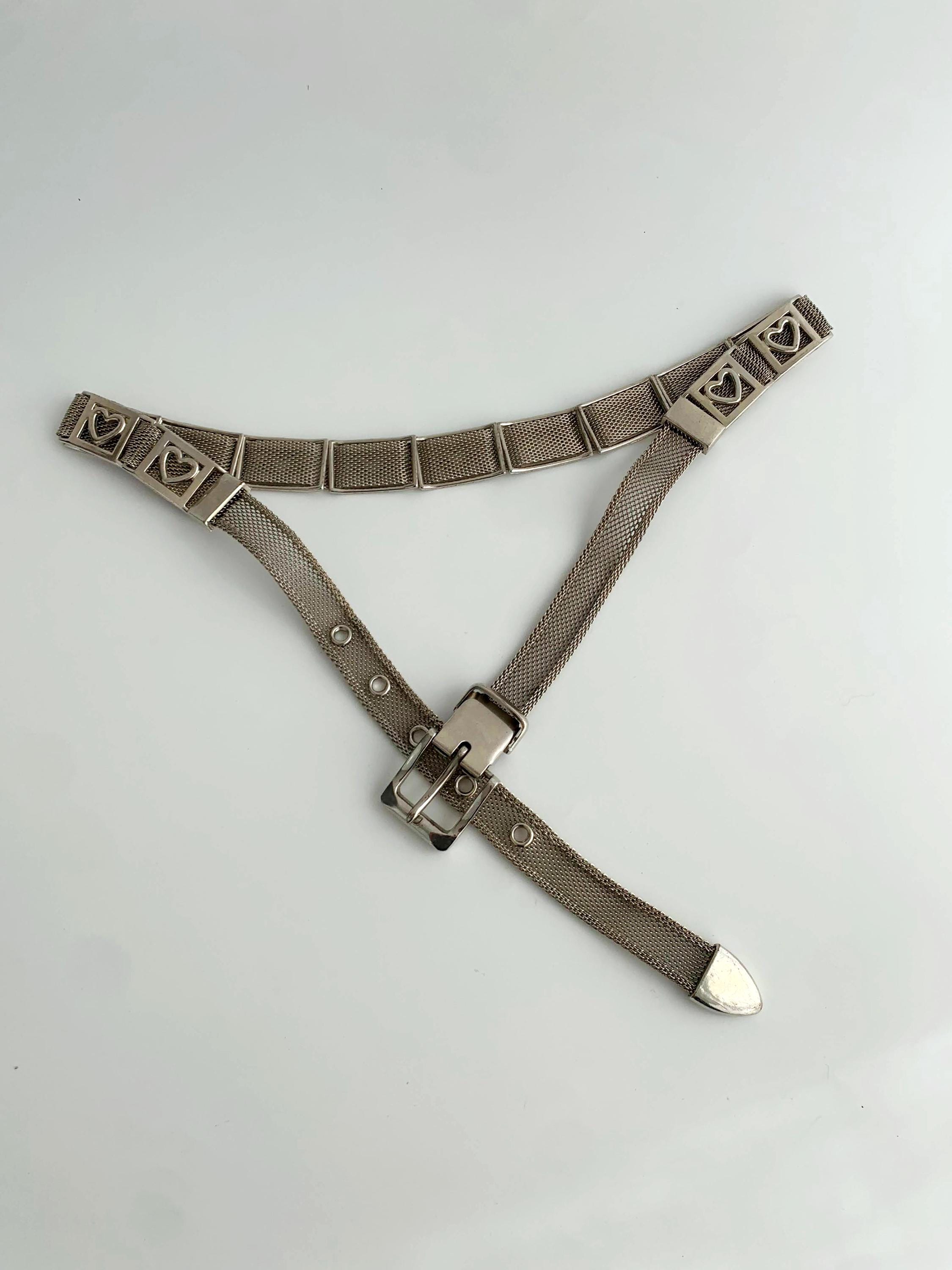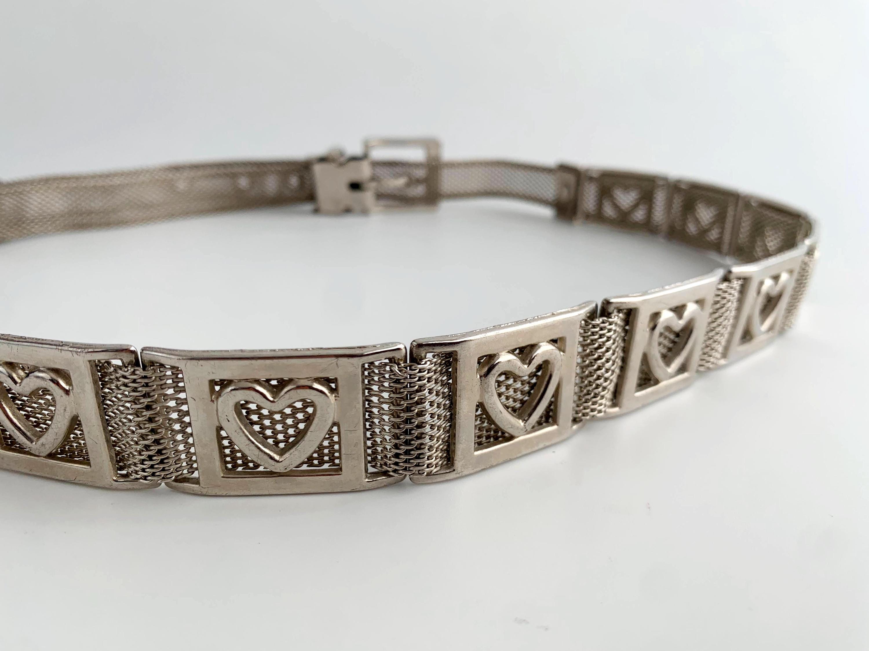 This is a vintage 80s silver tone mesh belt for women with heart shaped metal plates and slim silver tone buckle. This slim disco belt is made of mesh silver metal.