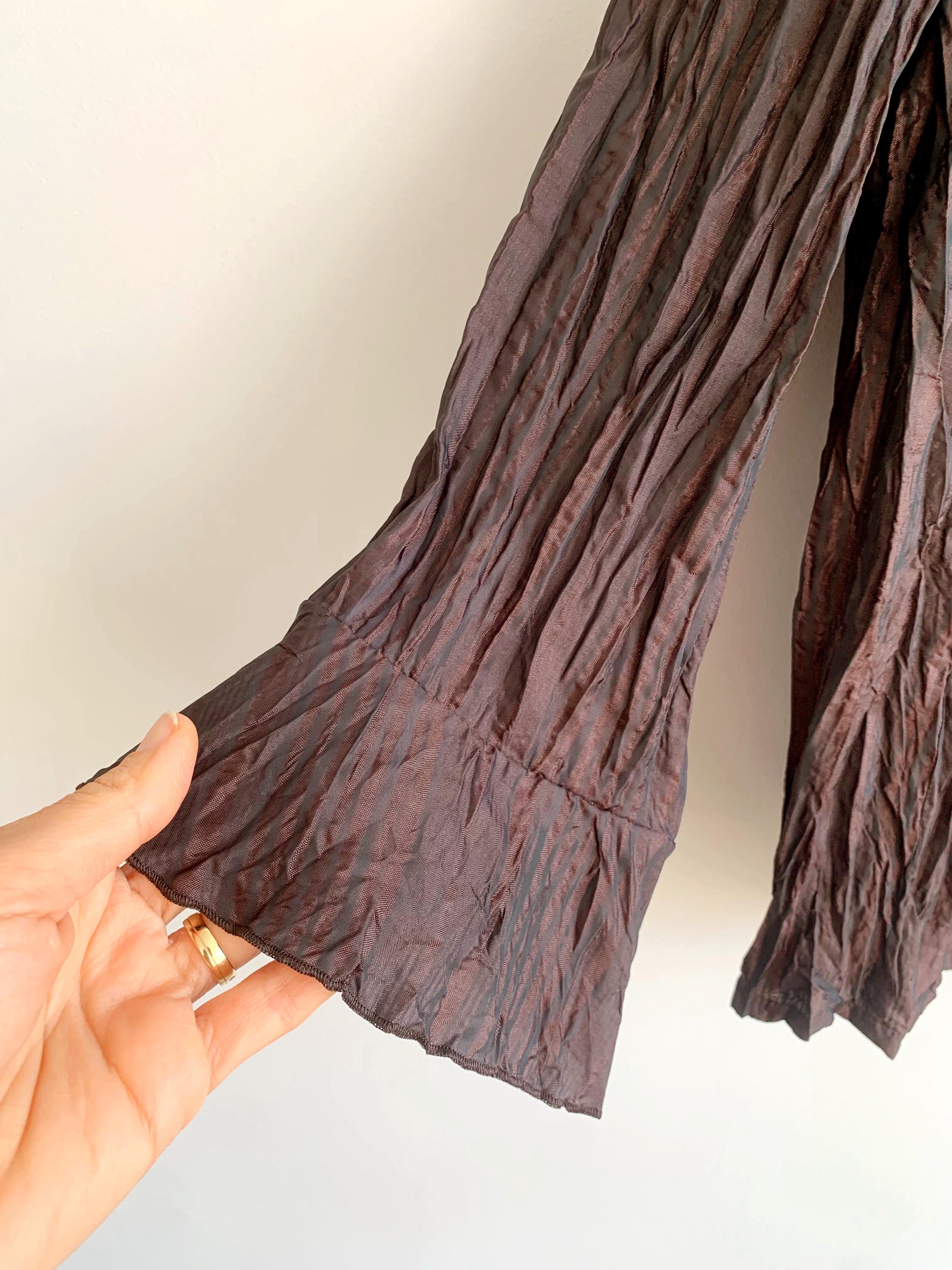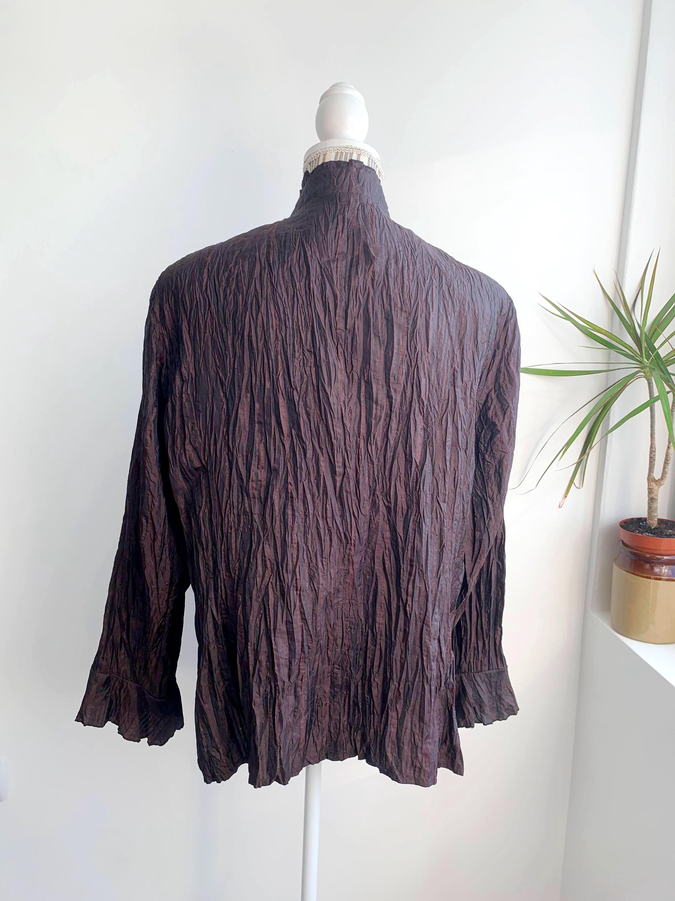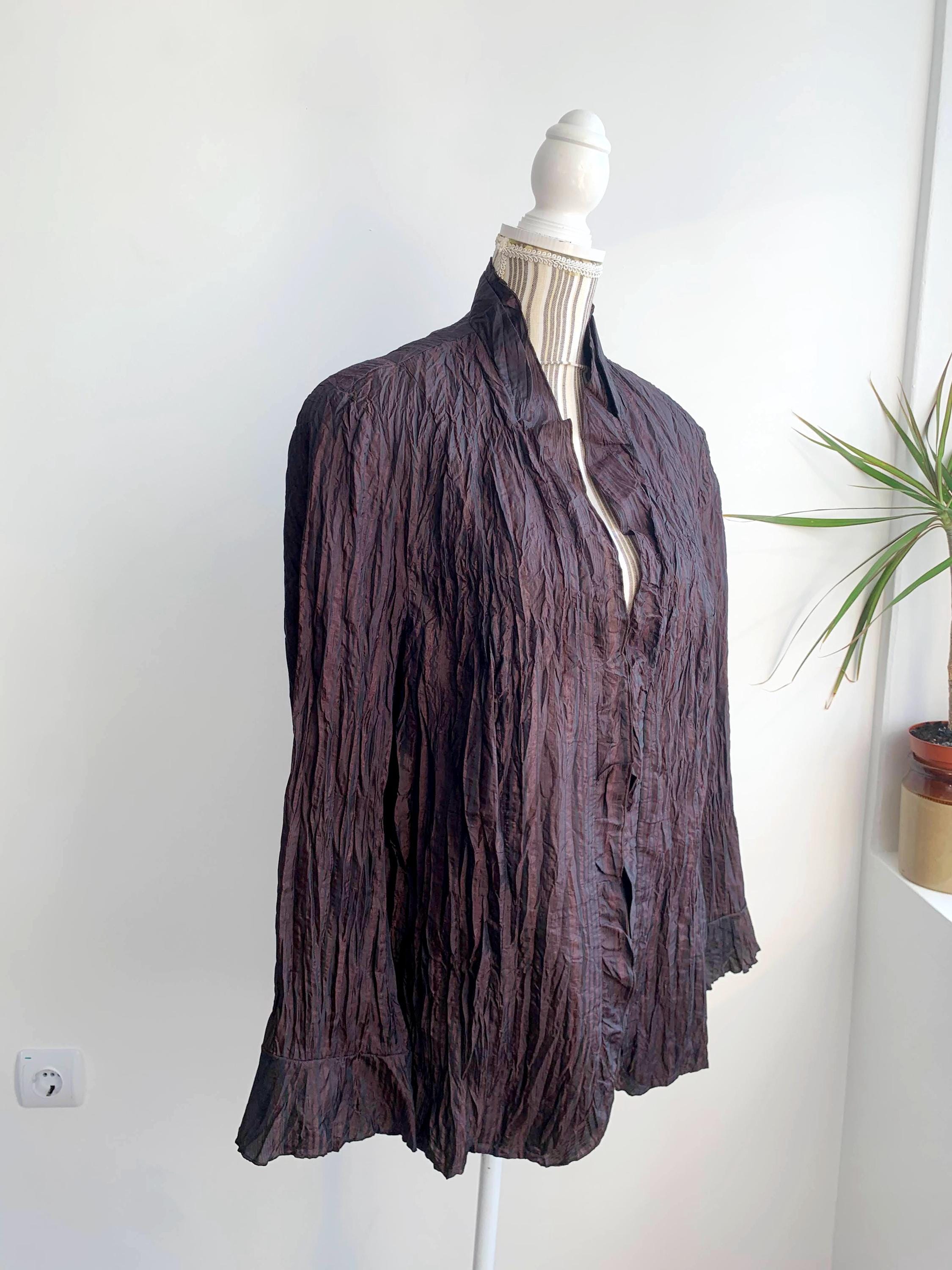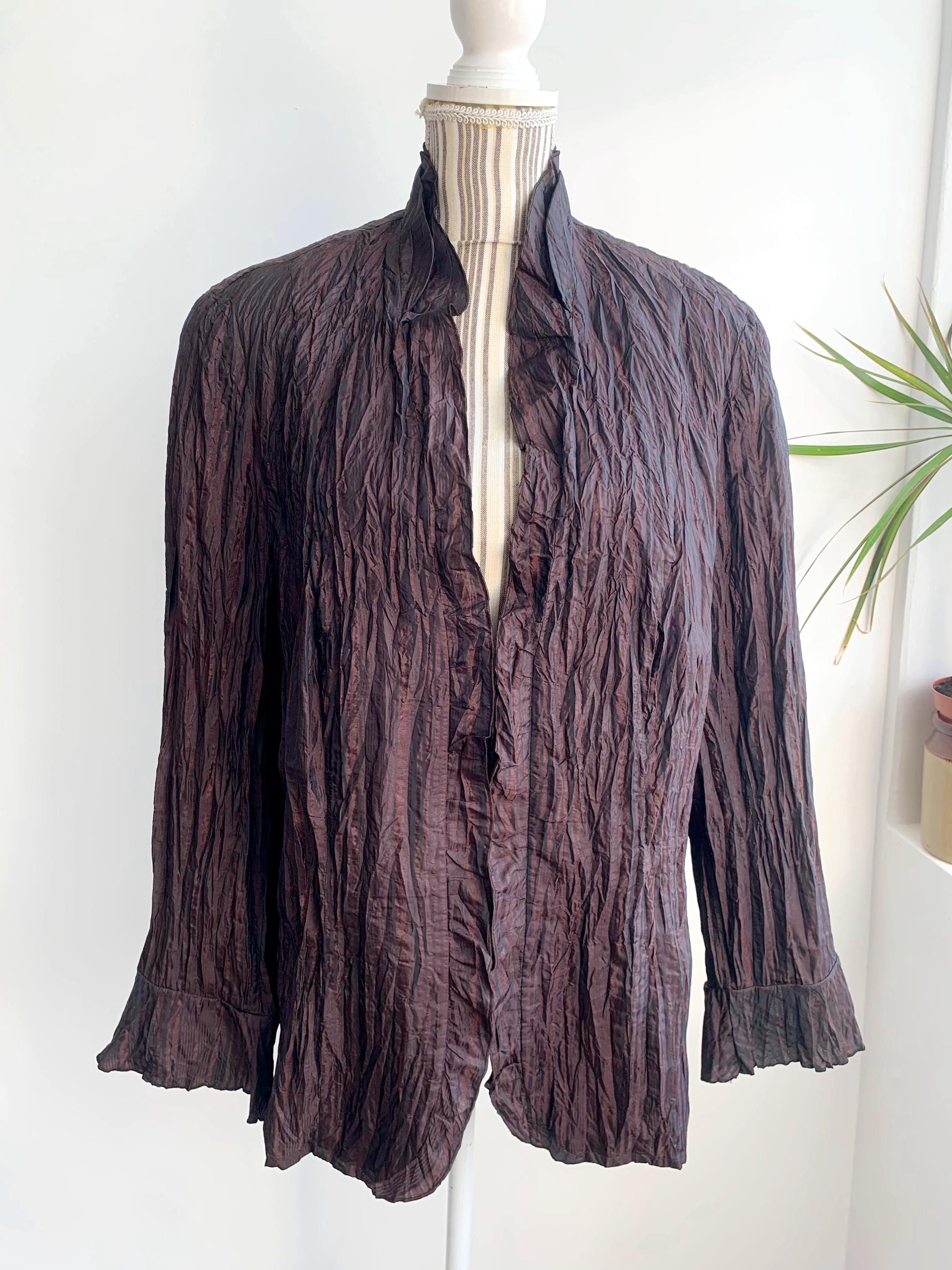 Beautiful vintage 90s Garry Weber crepe blazer jacket for women with zip up closure, bracelet flare sleeves and ruffled collar. Made of silky shiny fabric in shades of burgundy, egplant purple and copper brown. Lightweight unlined zip up blazer size XL.