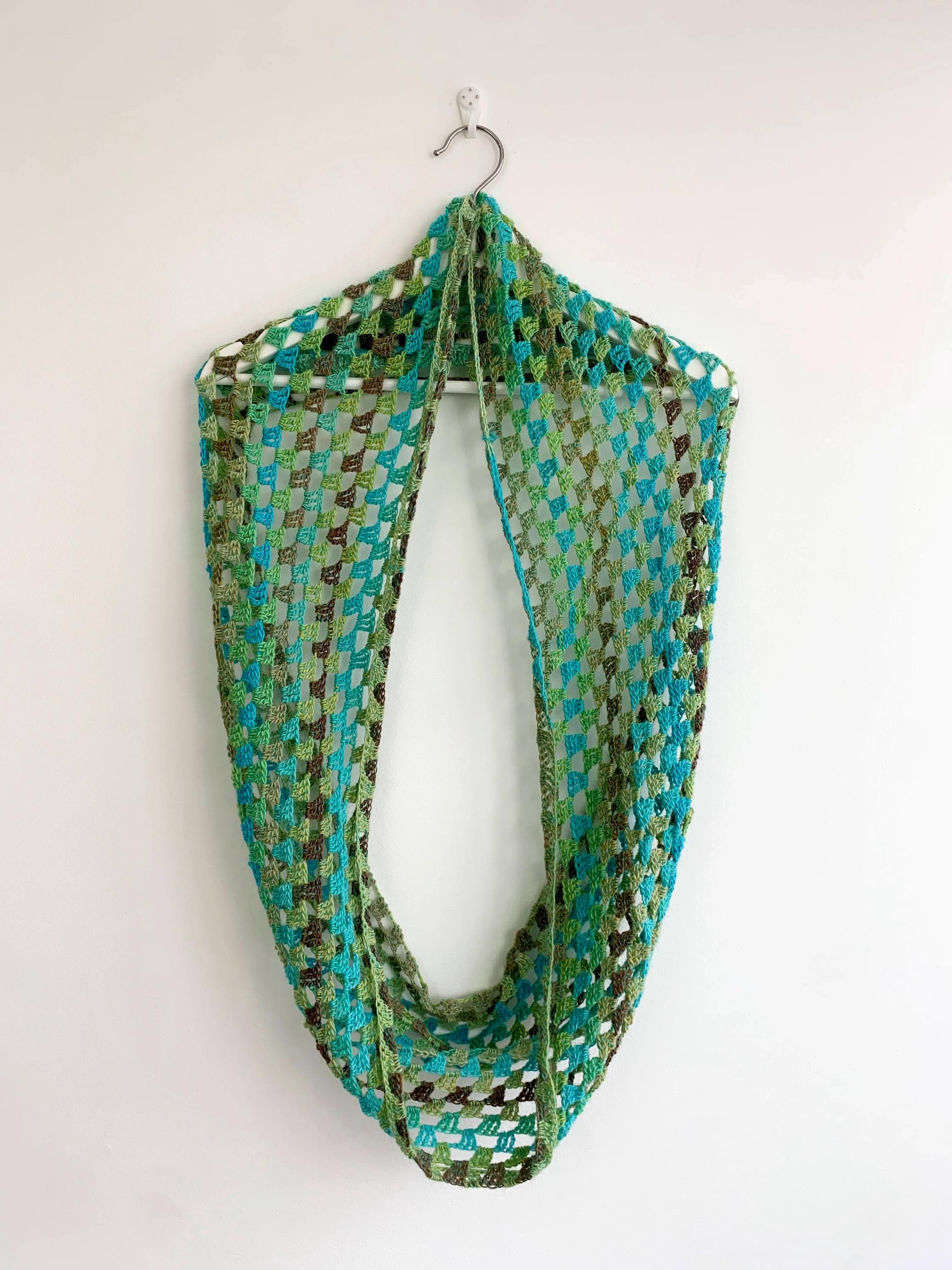 Beautiful vintage long lace crochet infinity scarf in shades of olive green, teal blue, khaki green and taupe brown with sheer mesh crochet pattern. Amazing versatile accessory that you can enjoy and wear in a number of different ways.