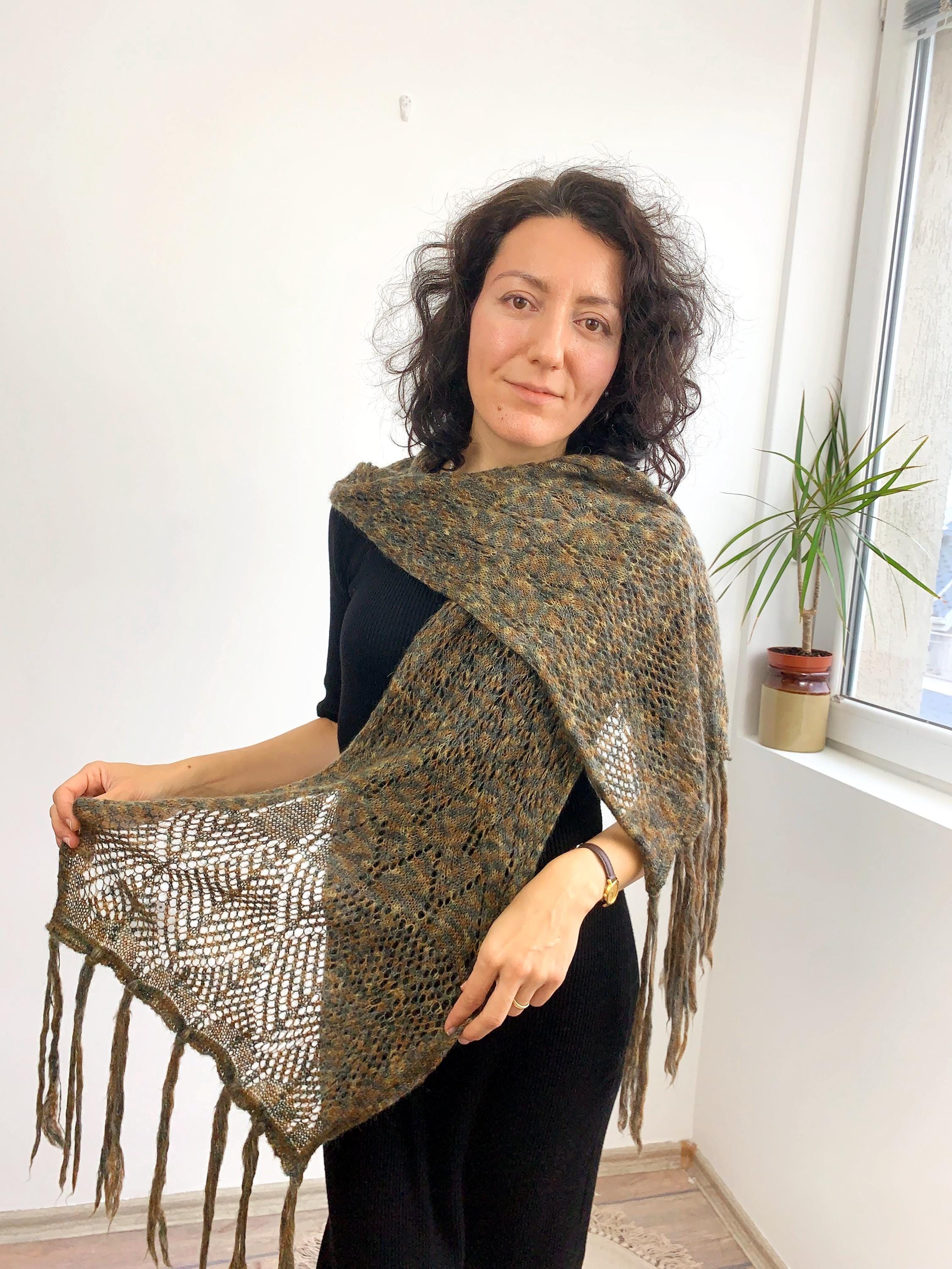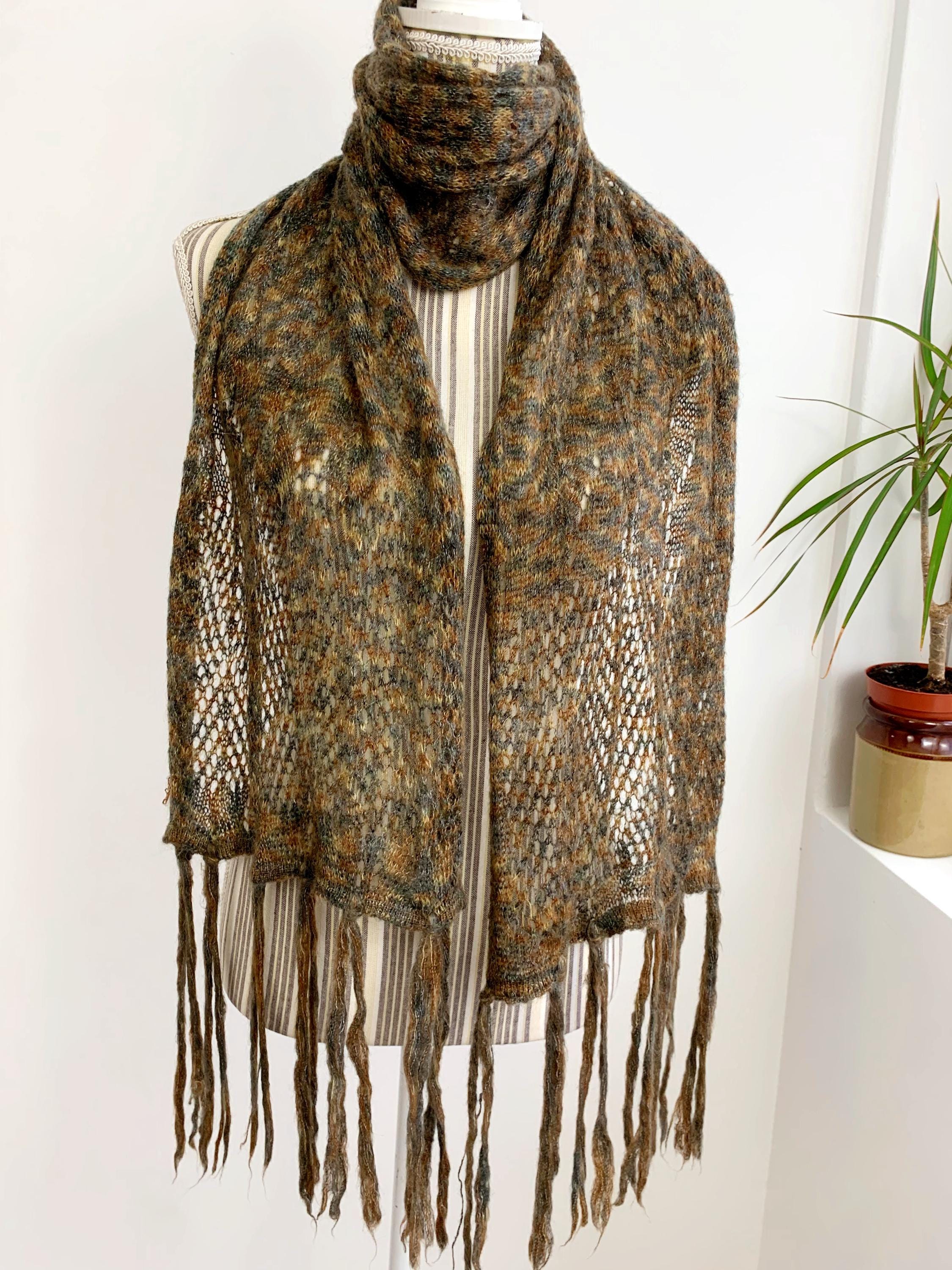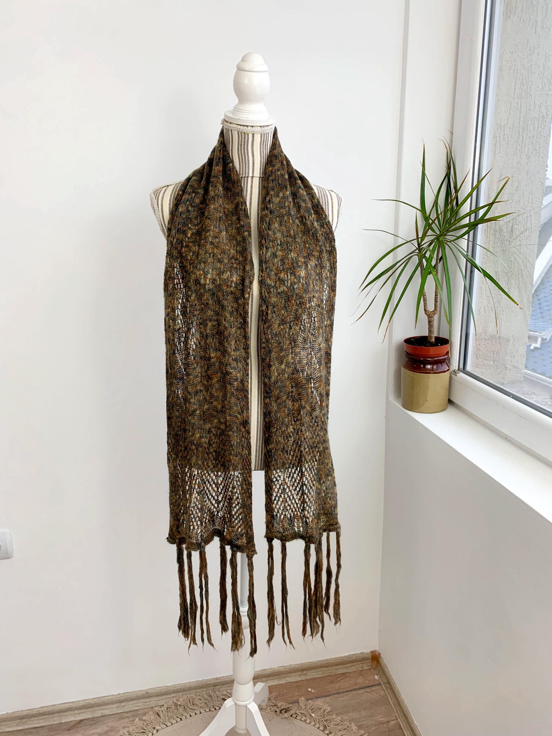 This is a vintage olive green camel brown grey ombre gradient soft mohair wool scarf with tassels. This women knitted scarf is perfect for the autumn season, it will keep you warm and cozy. Perfect gift for your mother or grandmother.