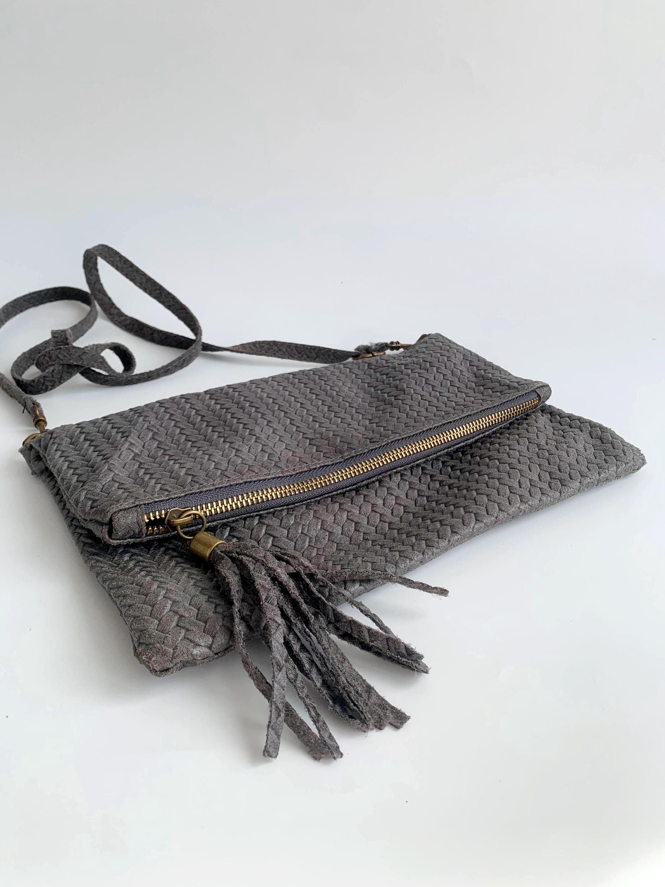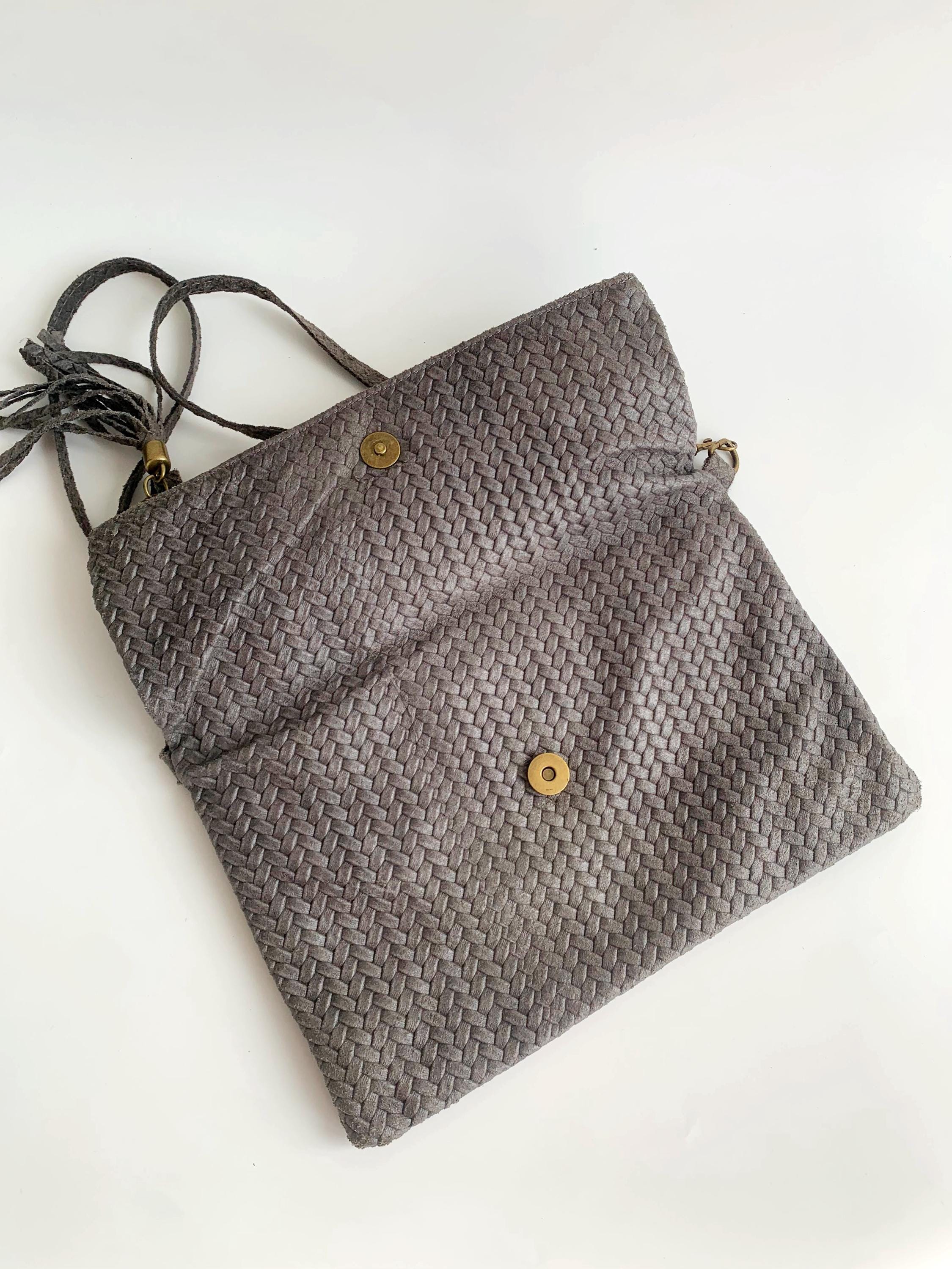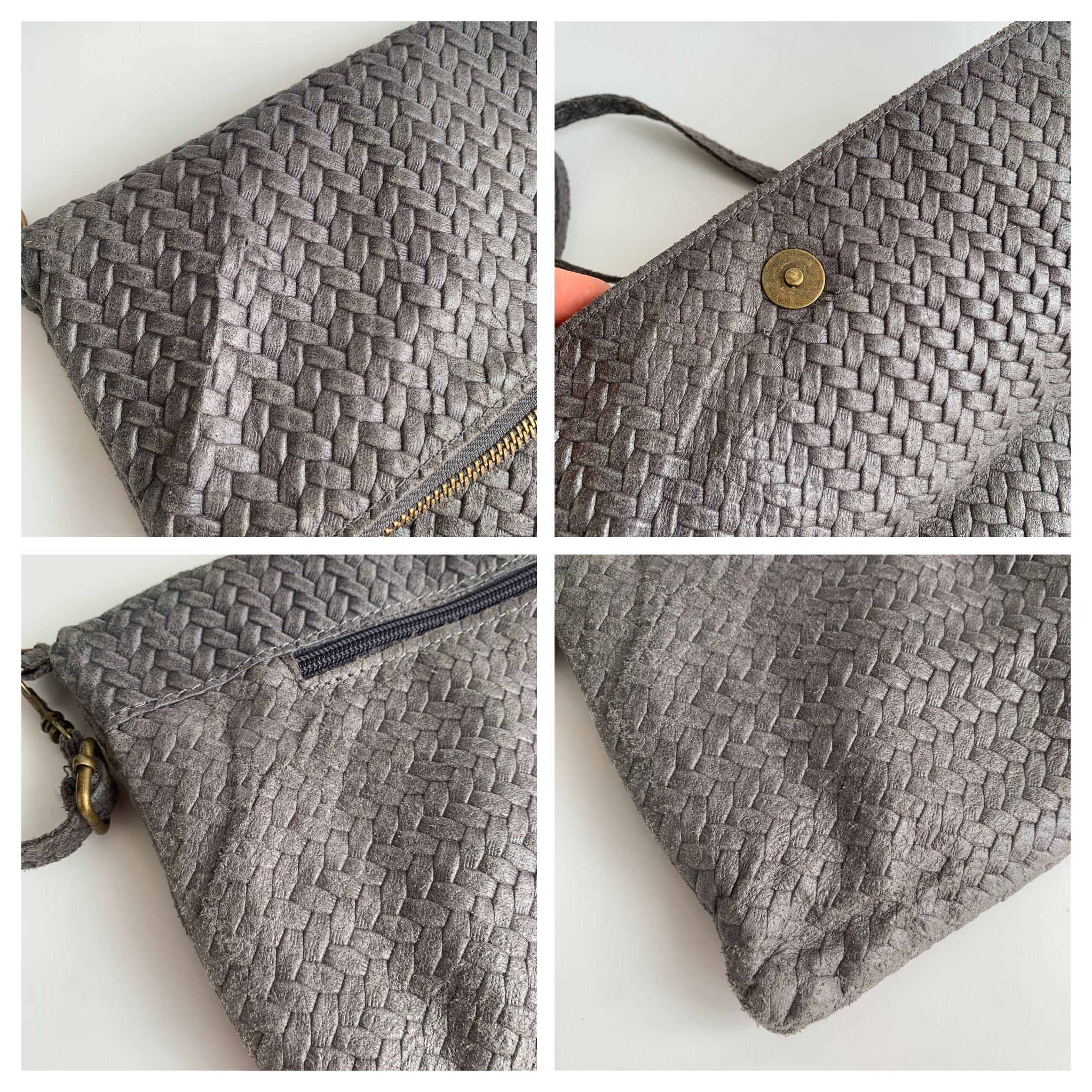 This is a vintage Y2K Italian envelope clutch purse with detachable shoulder strap. This slim clutch wallet is made of super soft genuine leather with textured braided print. It has flap over zip up and magnetic closure with one compartment and one pocket with zip closure inside. You can wear this purse as a shoulder or crossbody bag, or you can remove the strap and wear it as a clutch wallet.