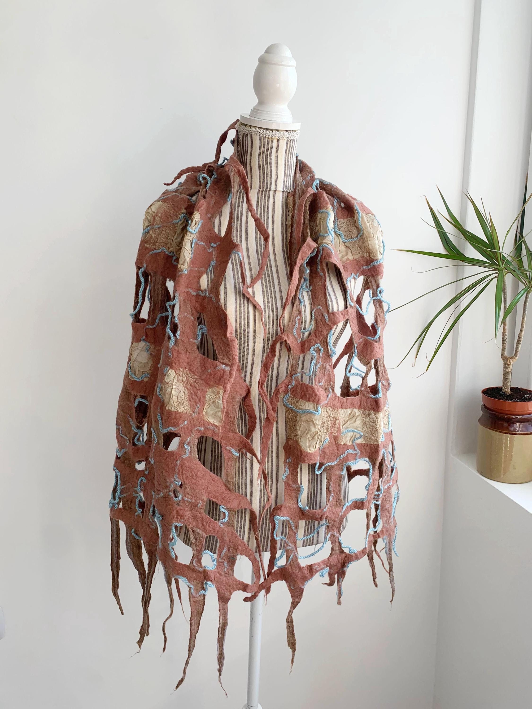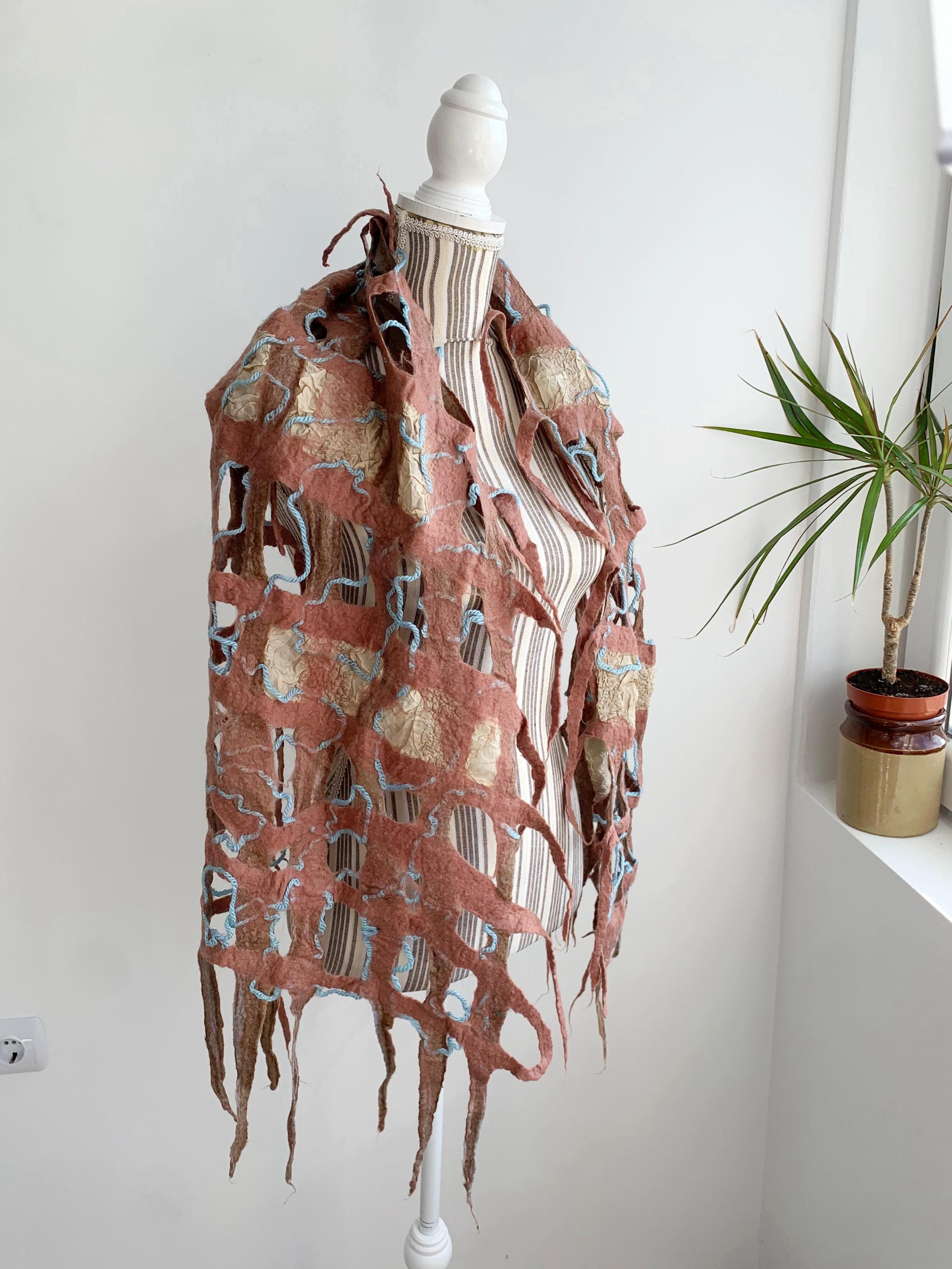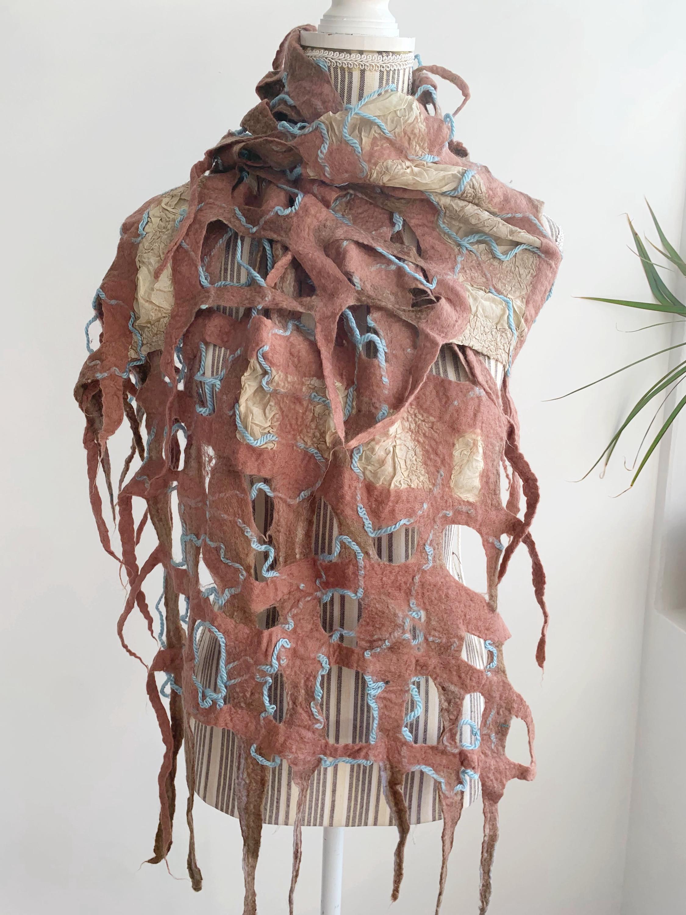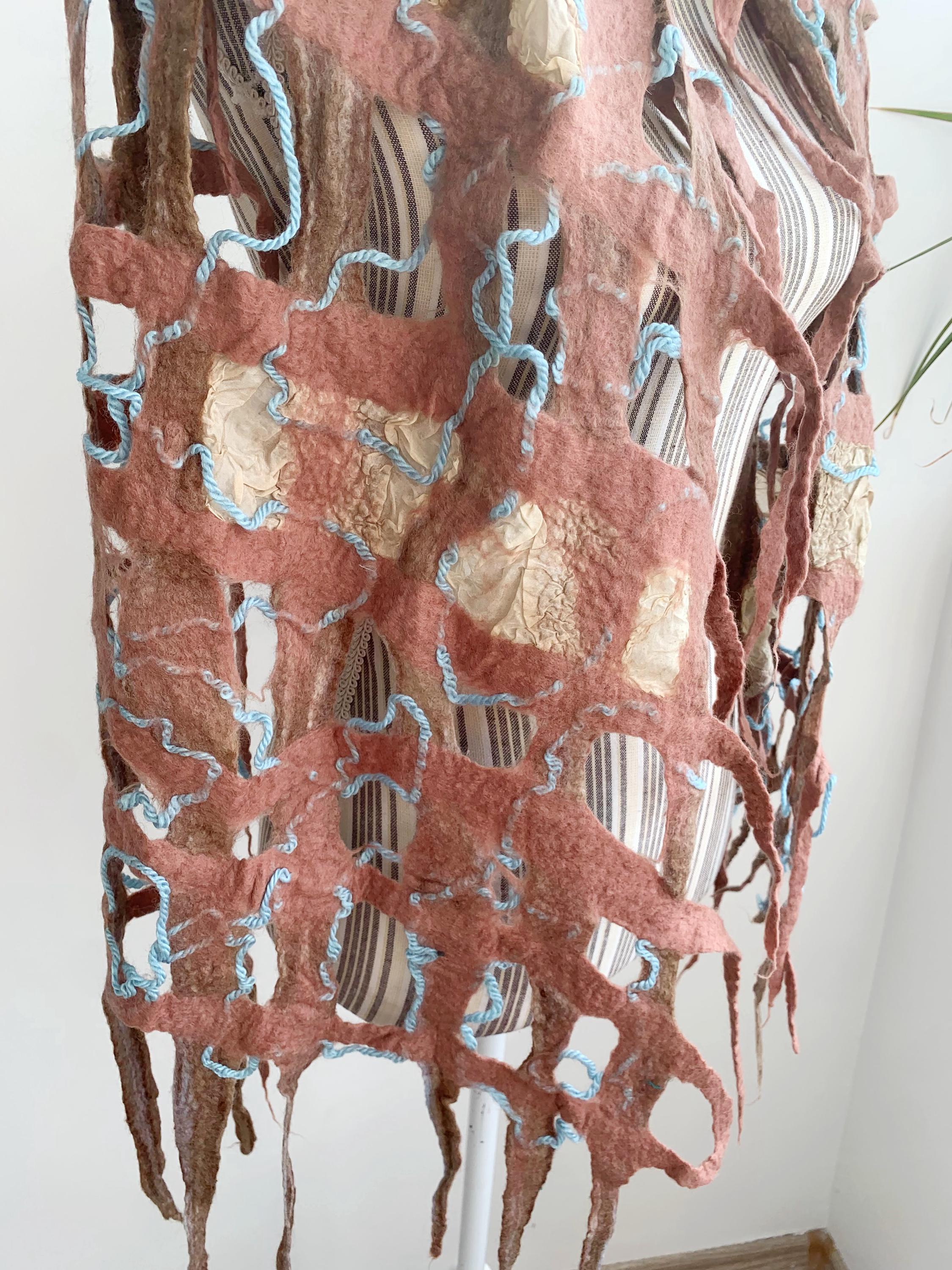 Beautiful vintage artisan felted wool and silk sheer mesh shabby fringed scarf in shades on camel cream and teal blue.