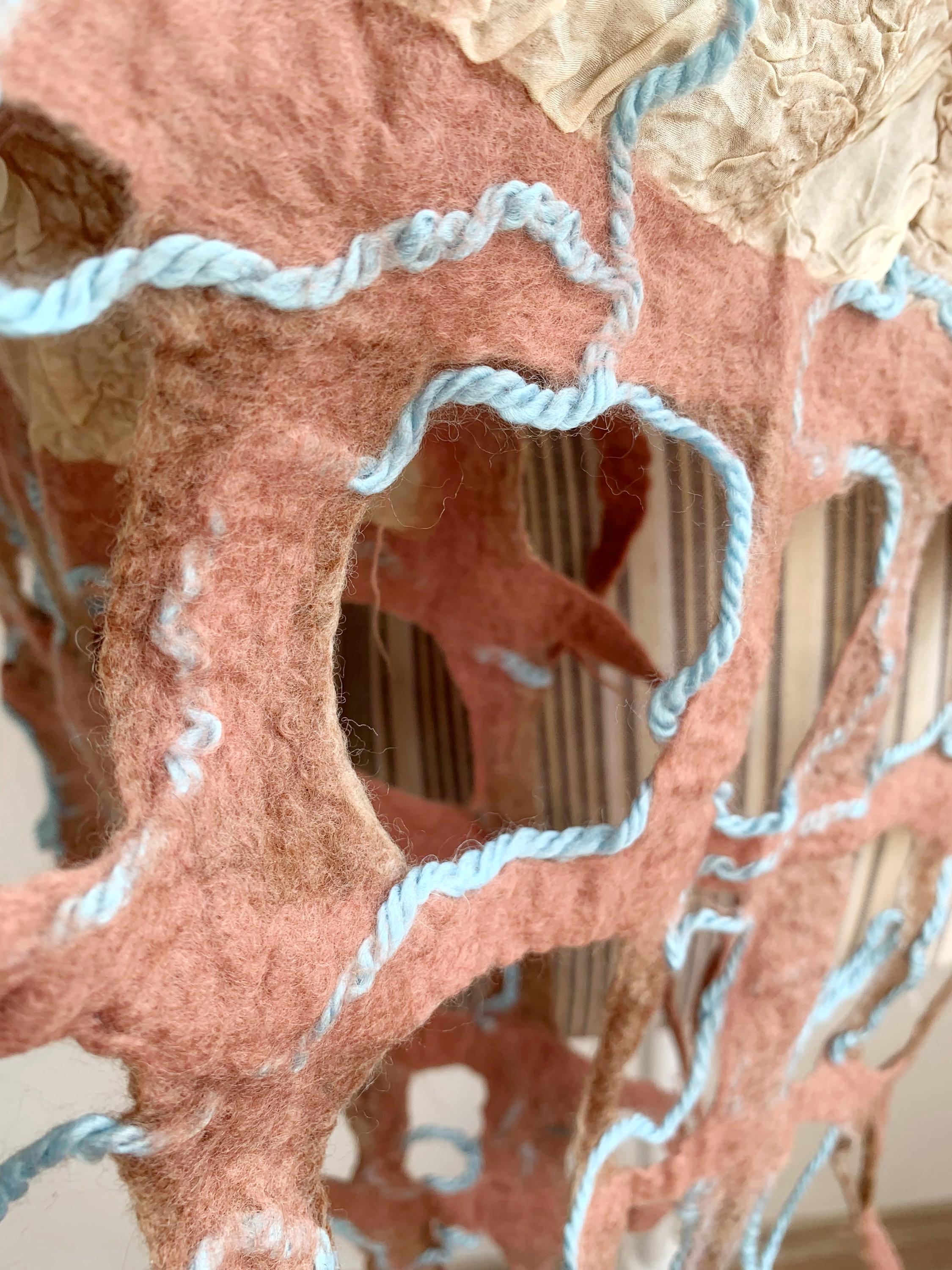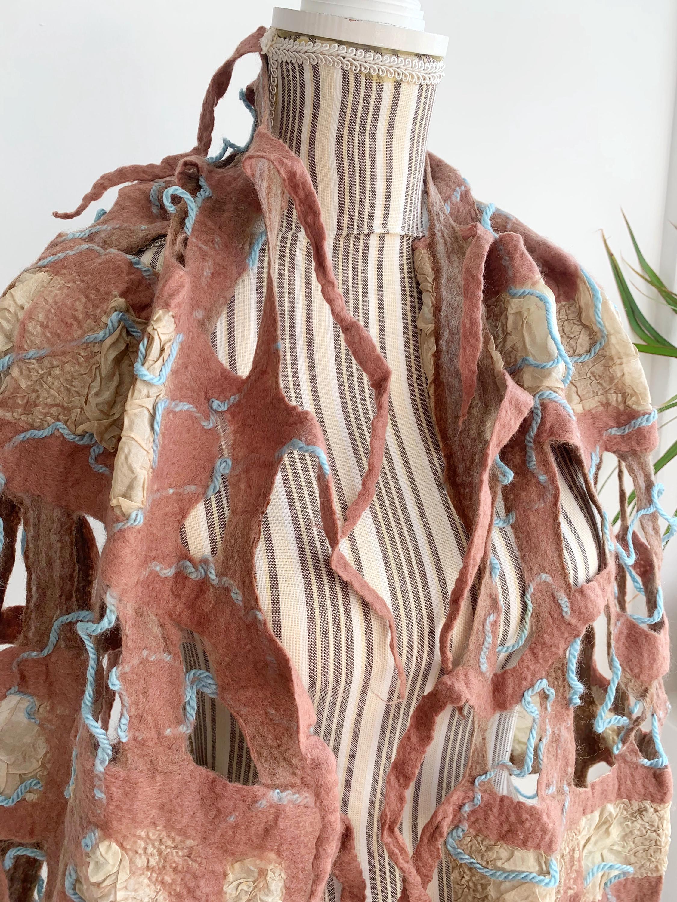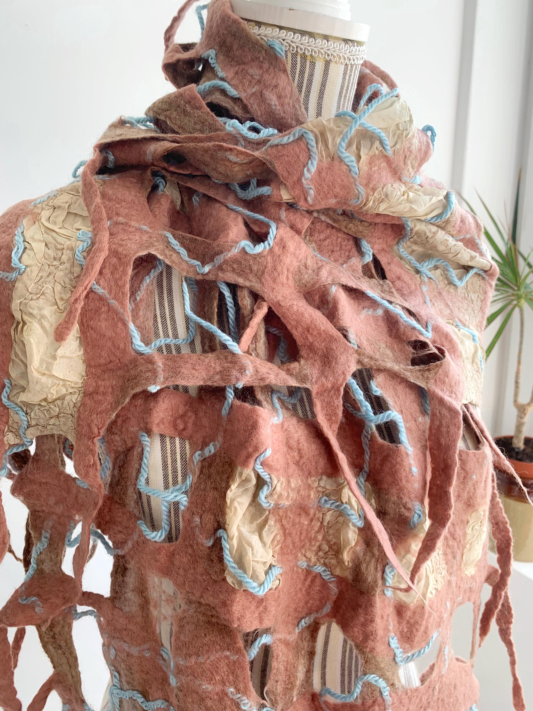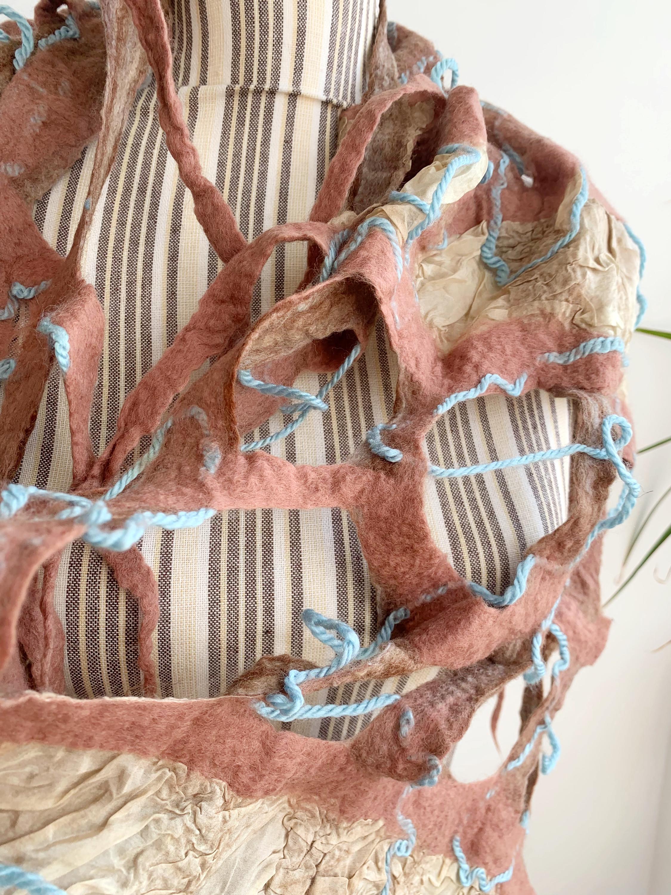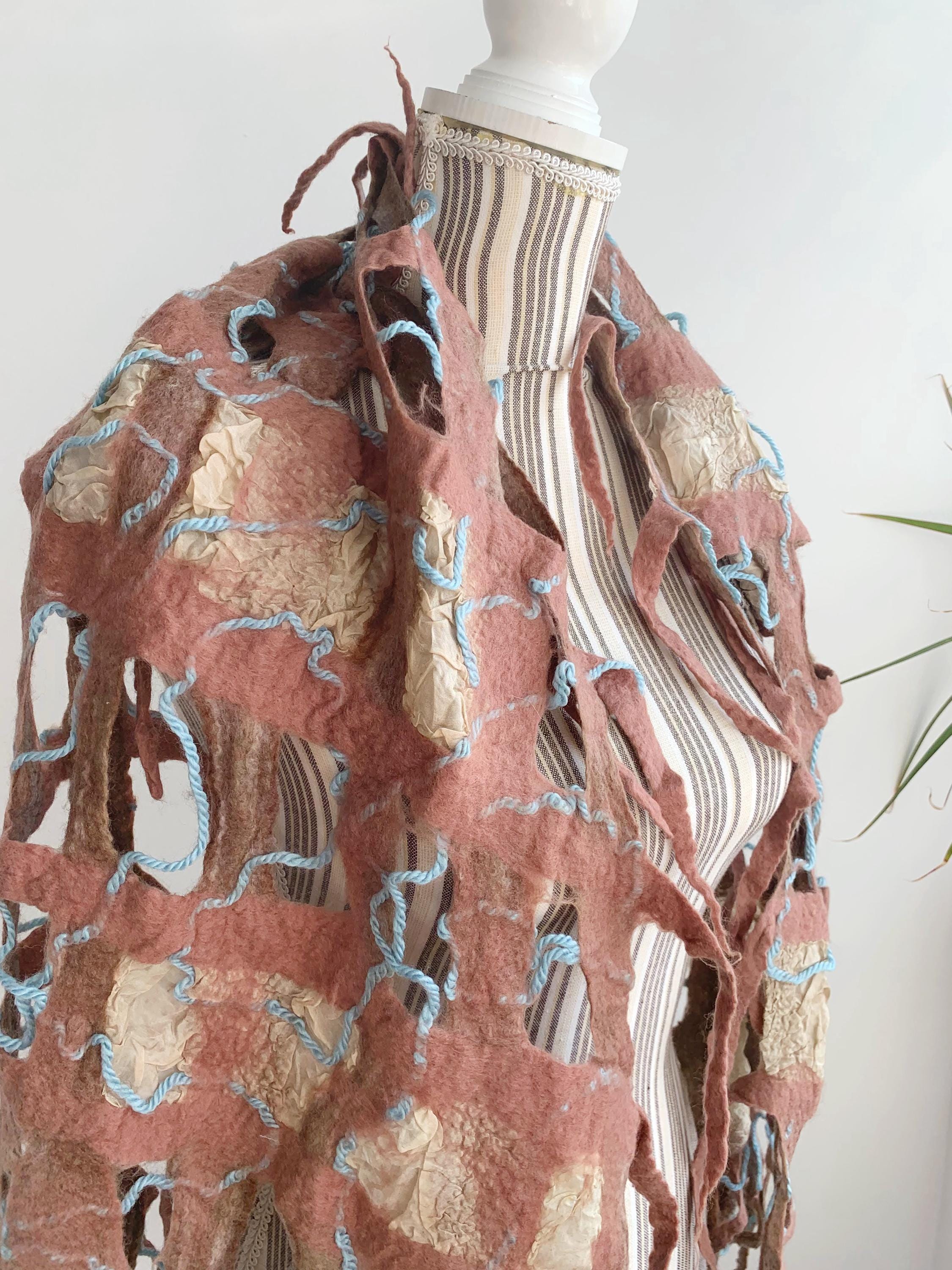 Beautiful vintage artisan felted wool and silk sheer mesh shabby fringed scarf in shades on camel cream and teal blue.