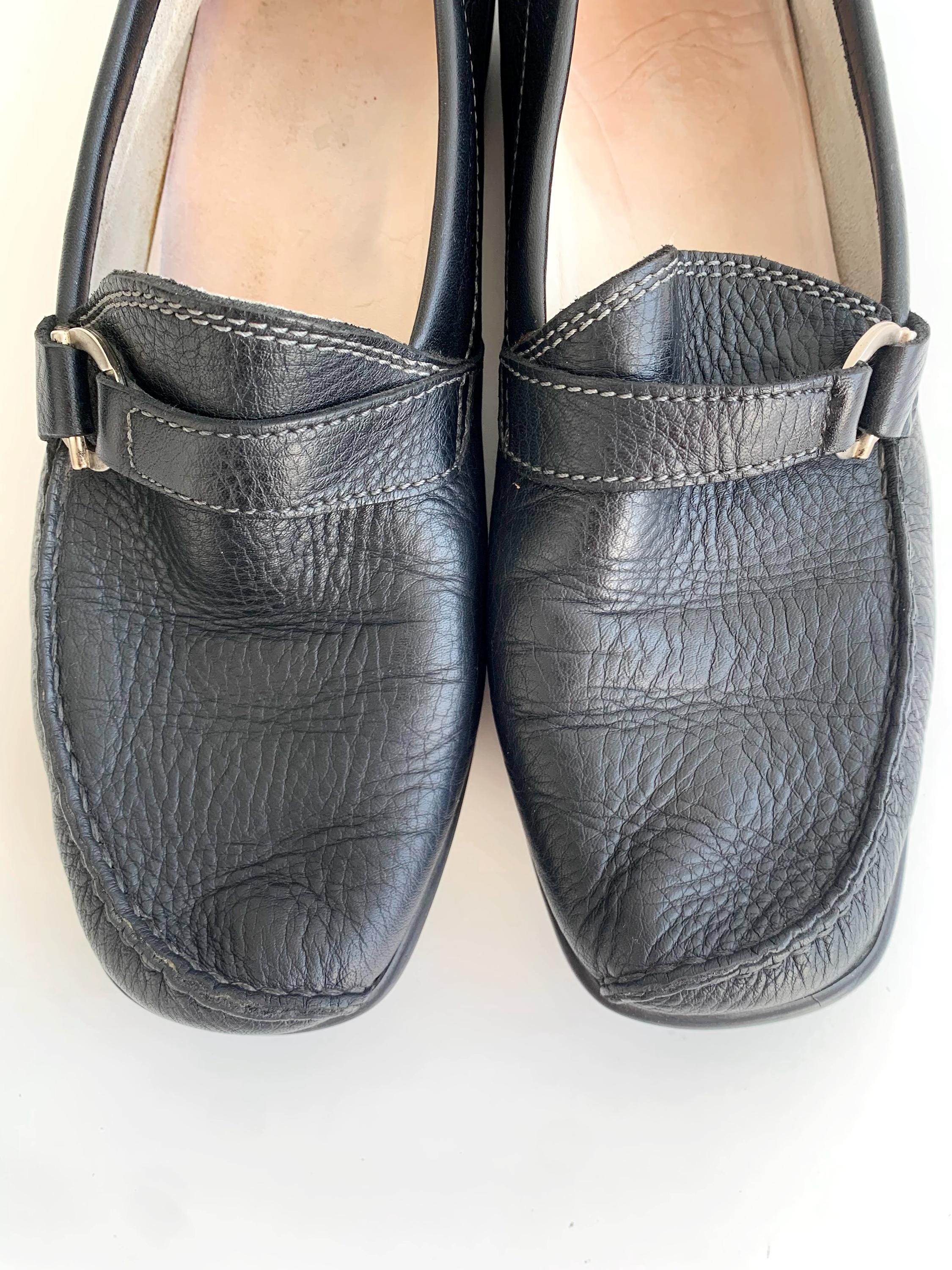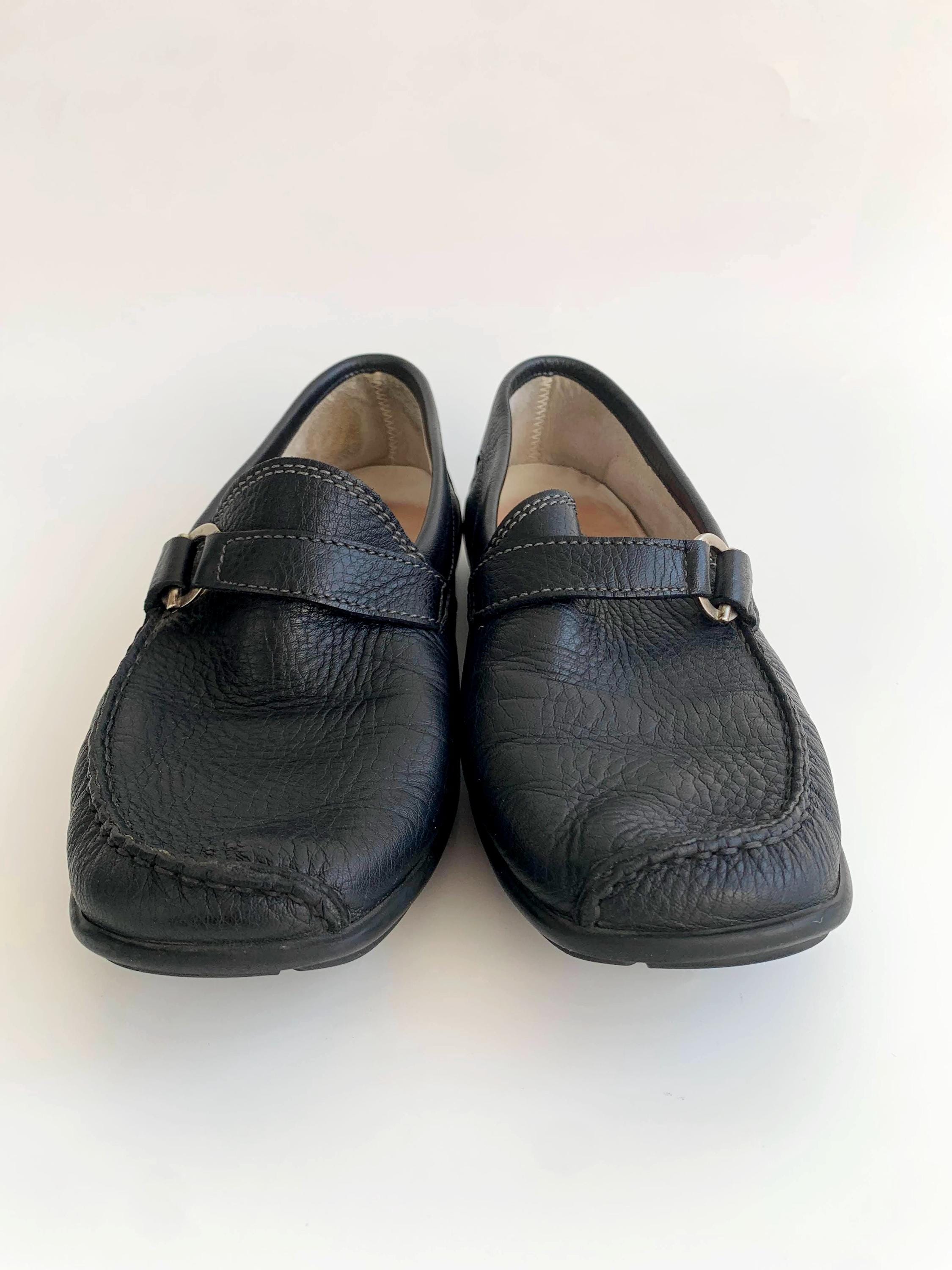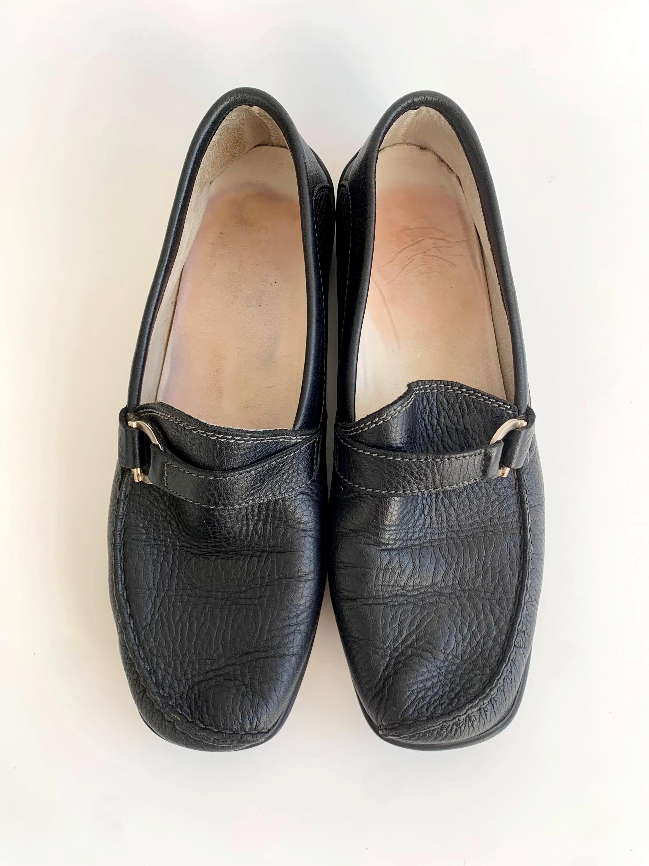 Condition: These black leather loafers were pre loved in overall in beautiful vintage condition with some fine scratches on the metal rings.