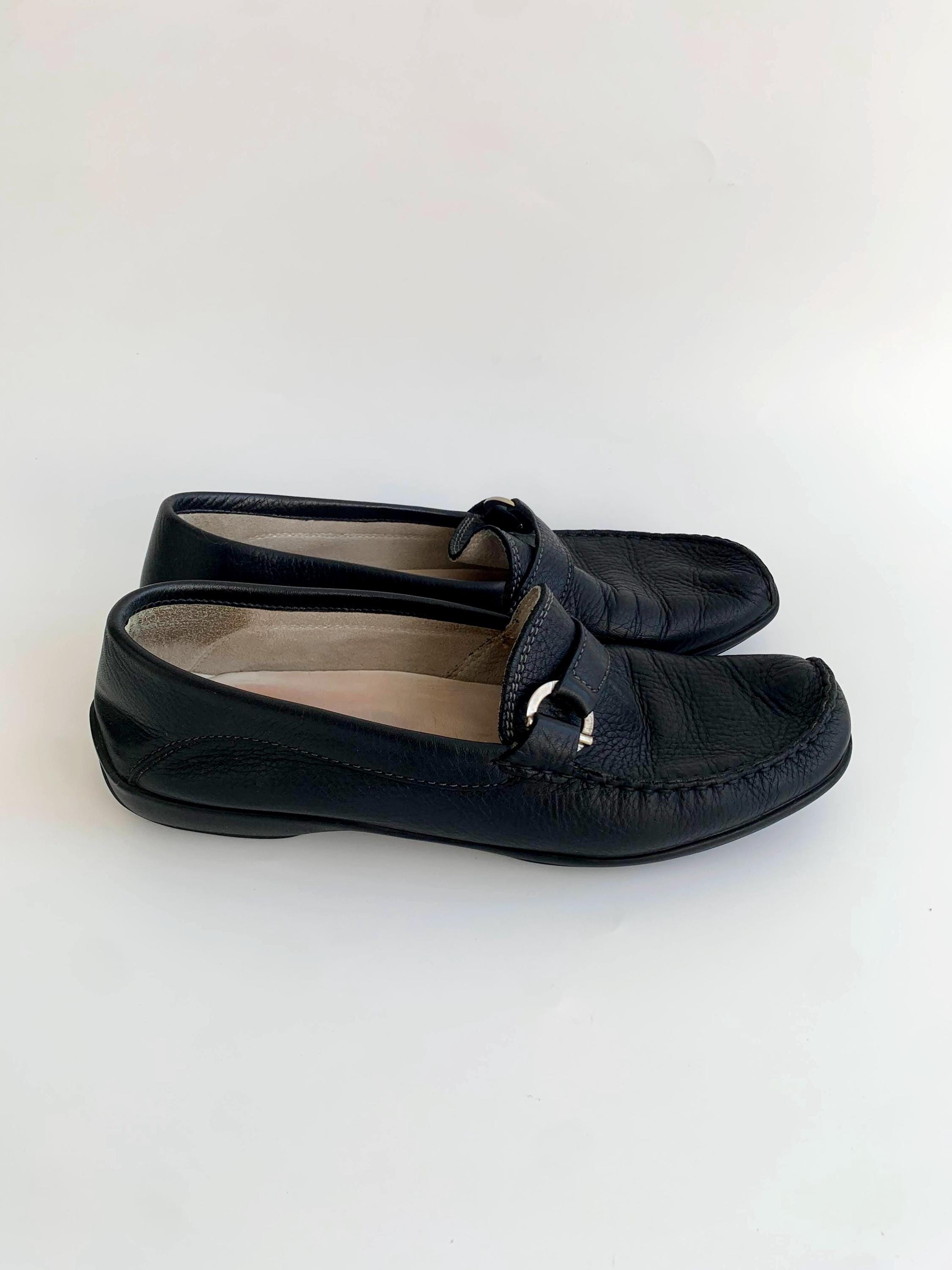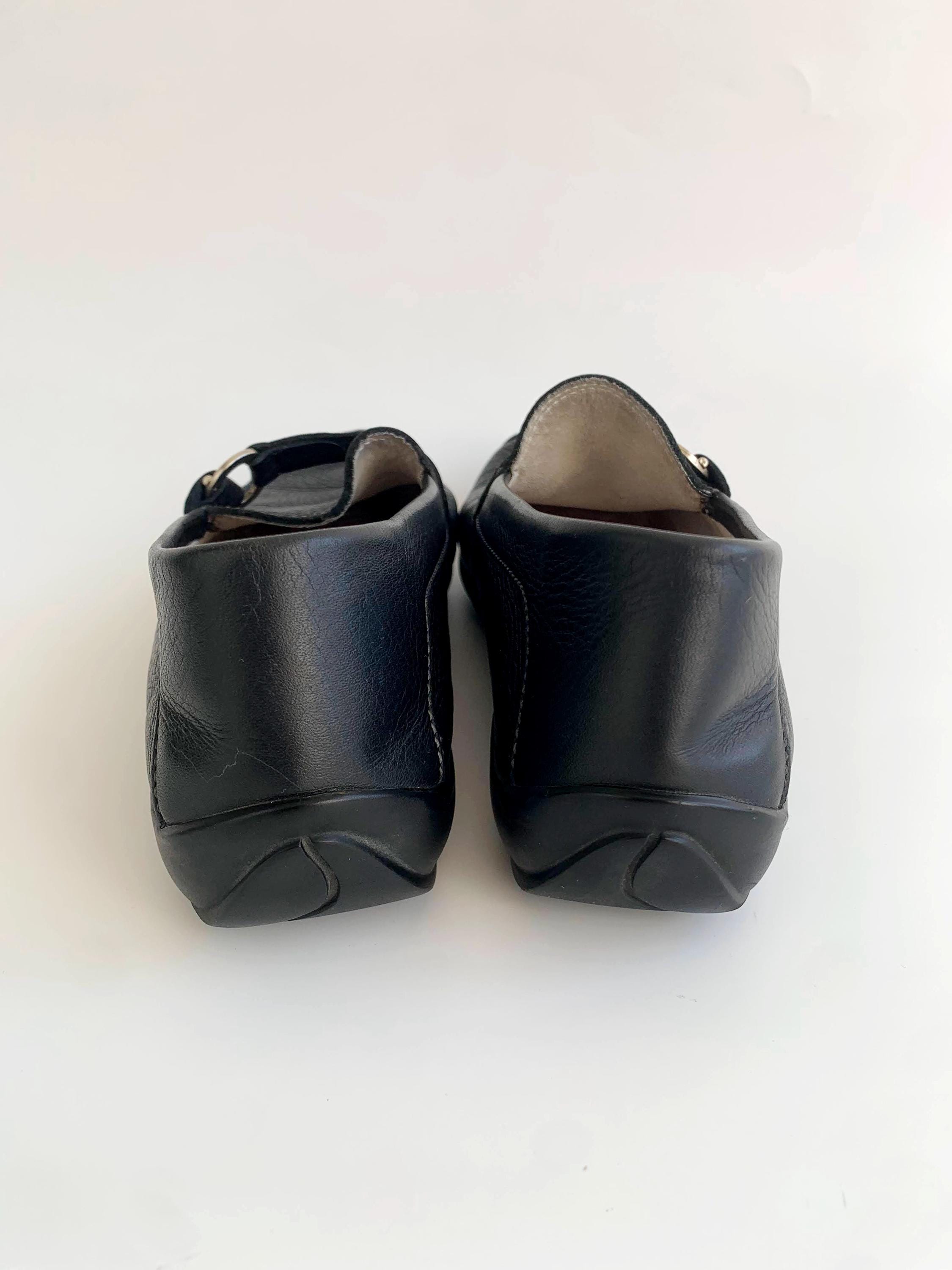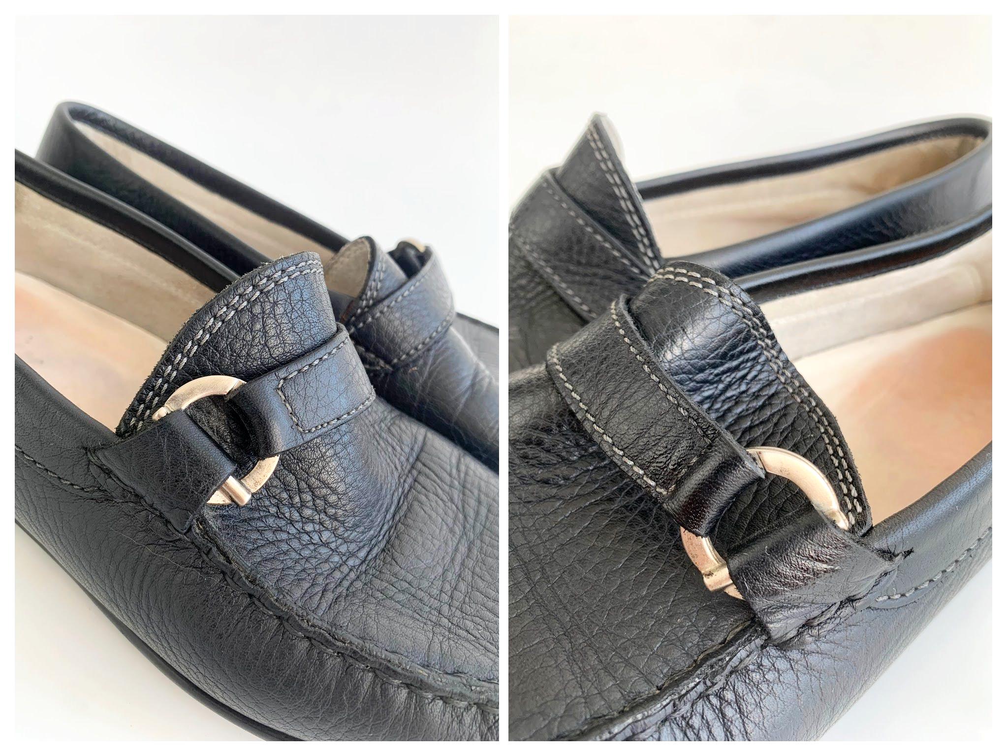 Condition: These black leather loafers were pre loved in overall in beautiful vintage condition with some fine scratches on the metal rings.