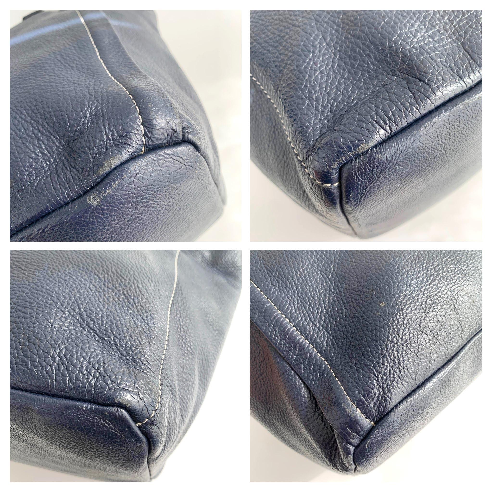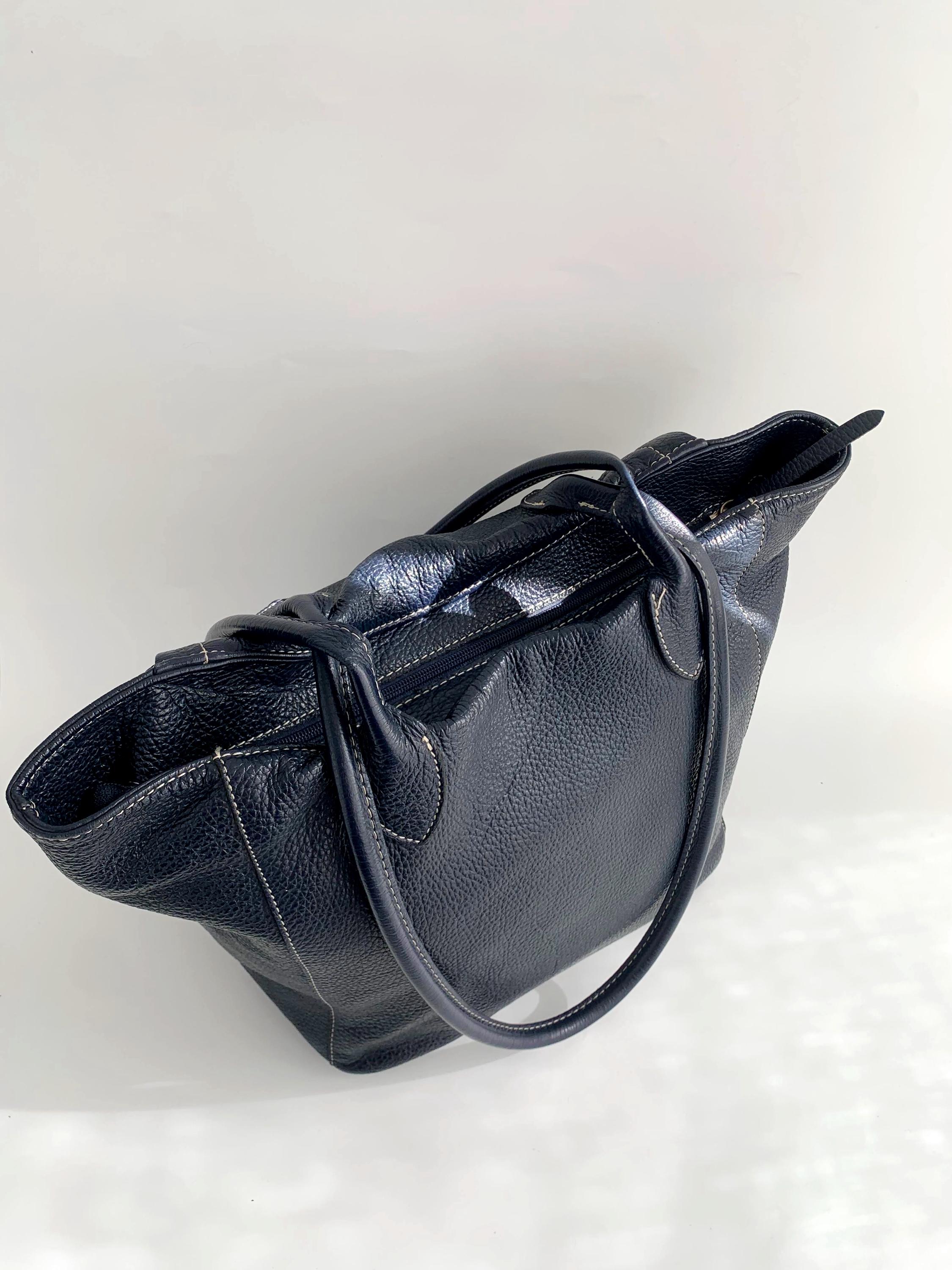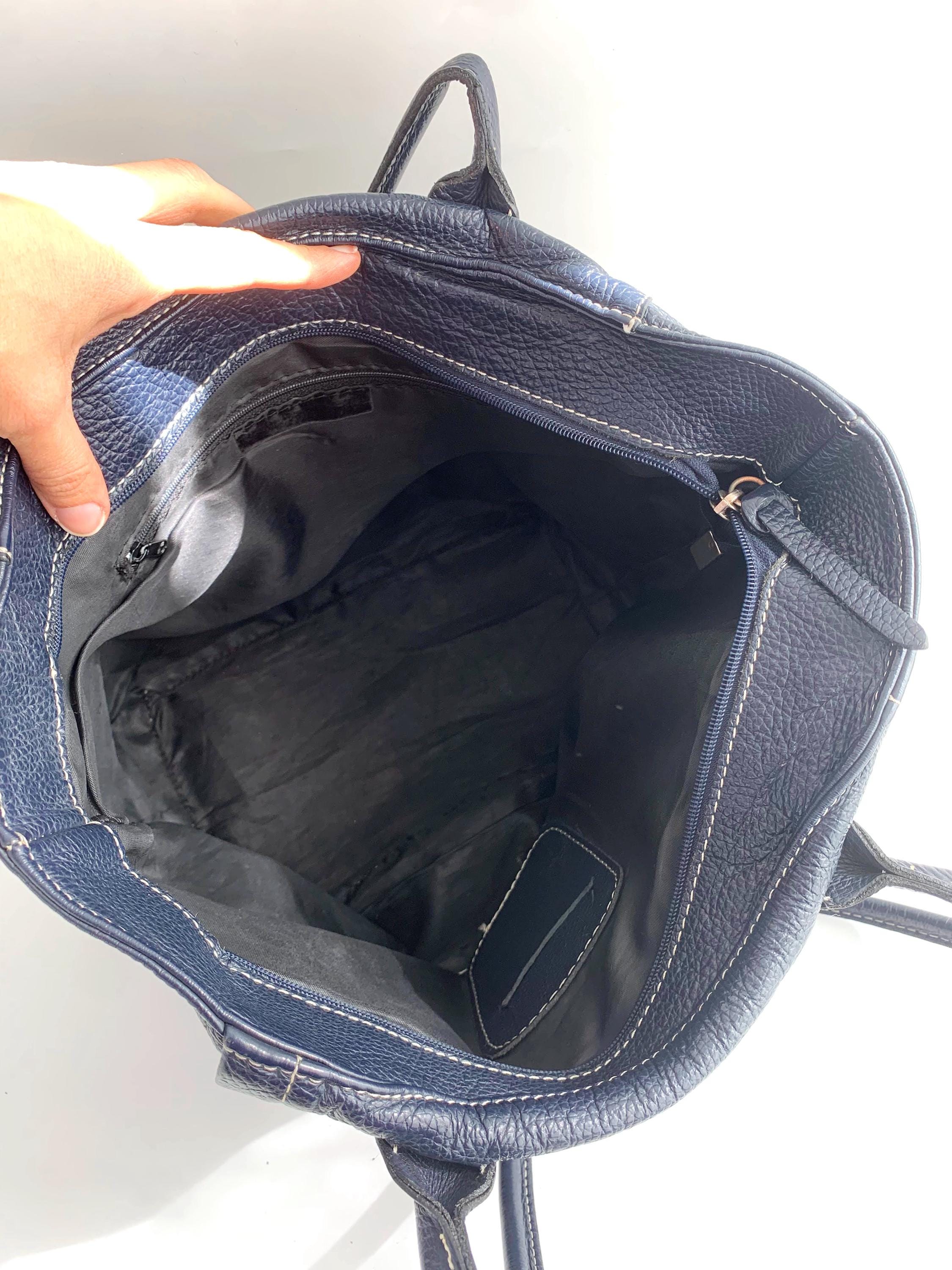 This is a beautiful vintage 90s pre-loved large capacity slouchy distressed real leather tote bag with zip closure, made of soft pebbled genuine leather in dark navy blue color. This spacious business work leather bag is perfect to wear at the office or at business meetings. Ideal travel bag which will fit in all you need for your busy day out. This big leather tote bag has cotton lining with one compartment, one small slip pocket and one zipper pocketn inside. There are two vertical zipper pockets at the front.