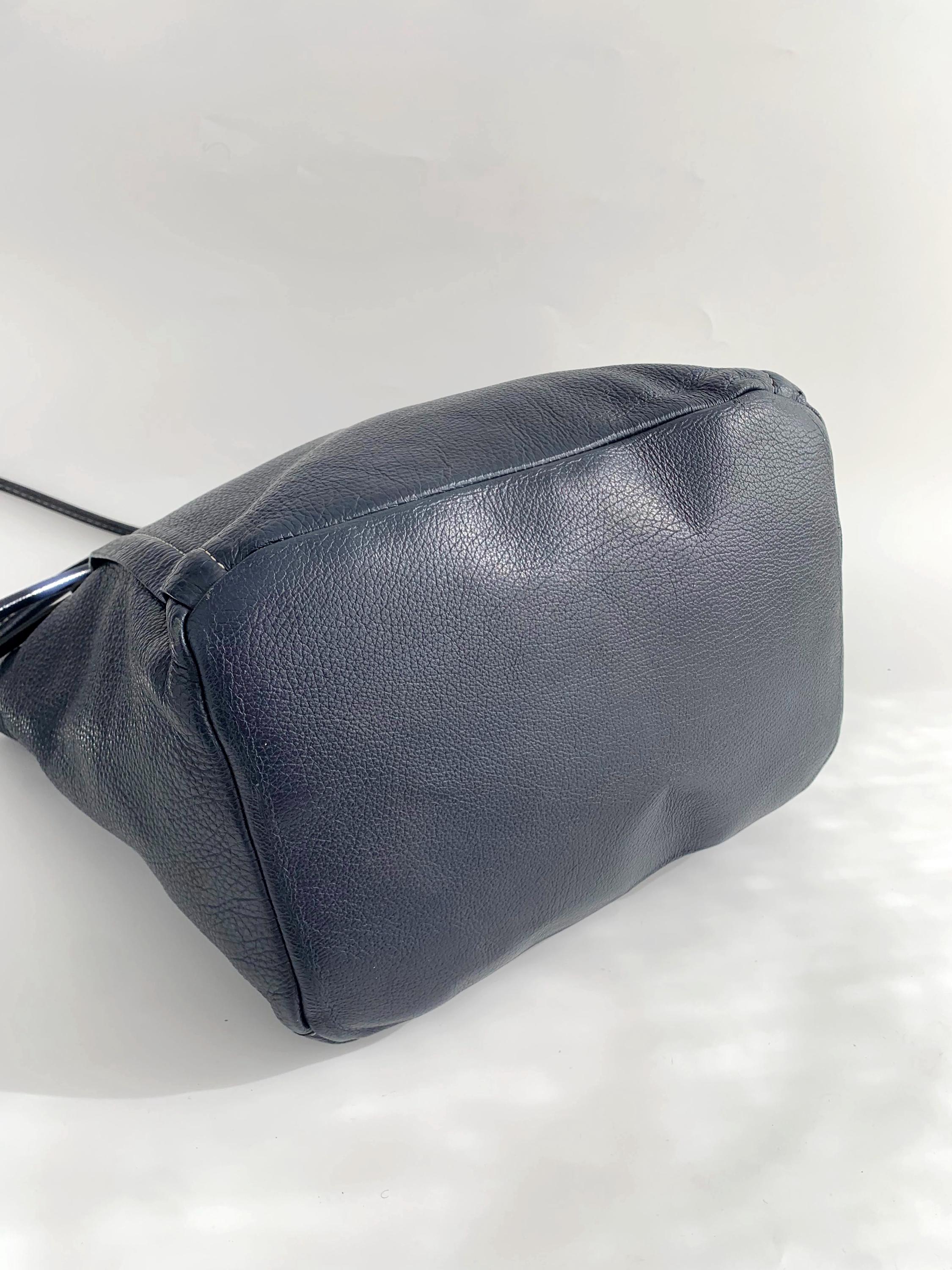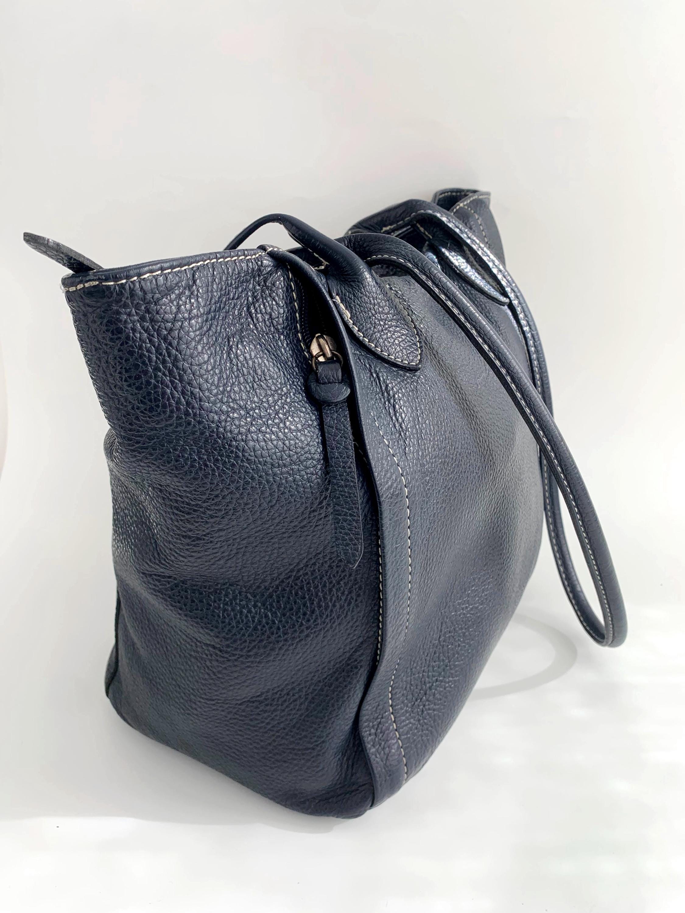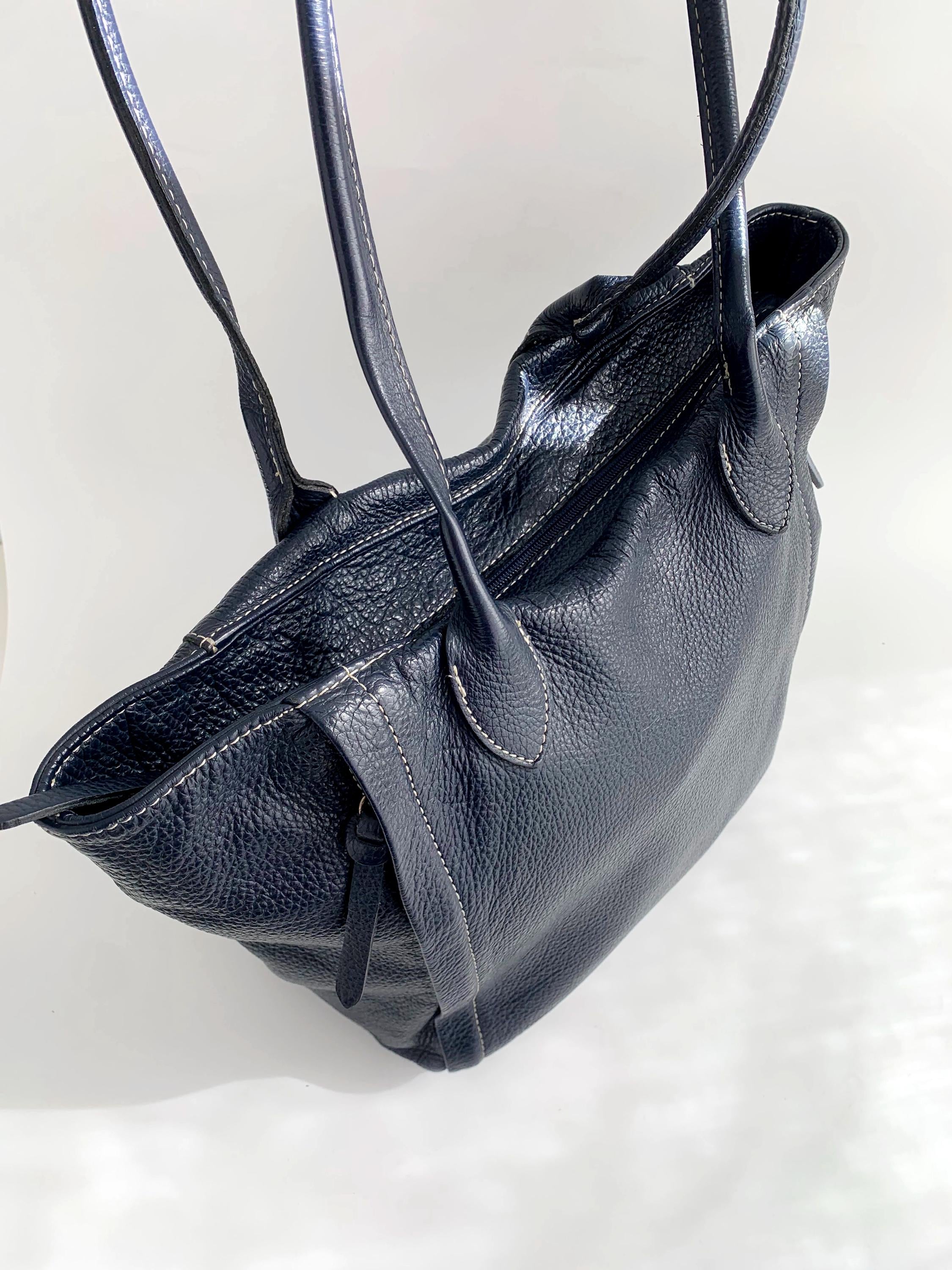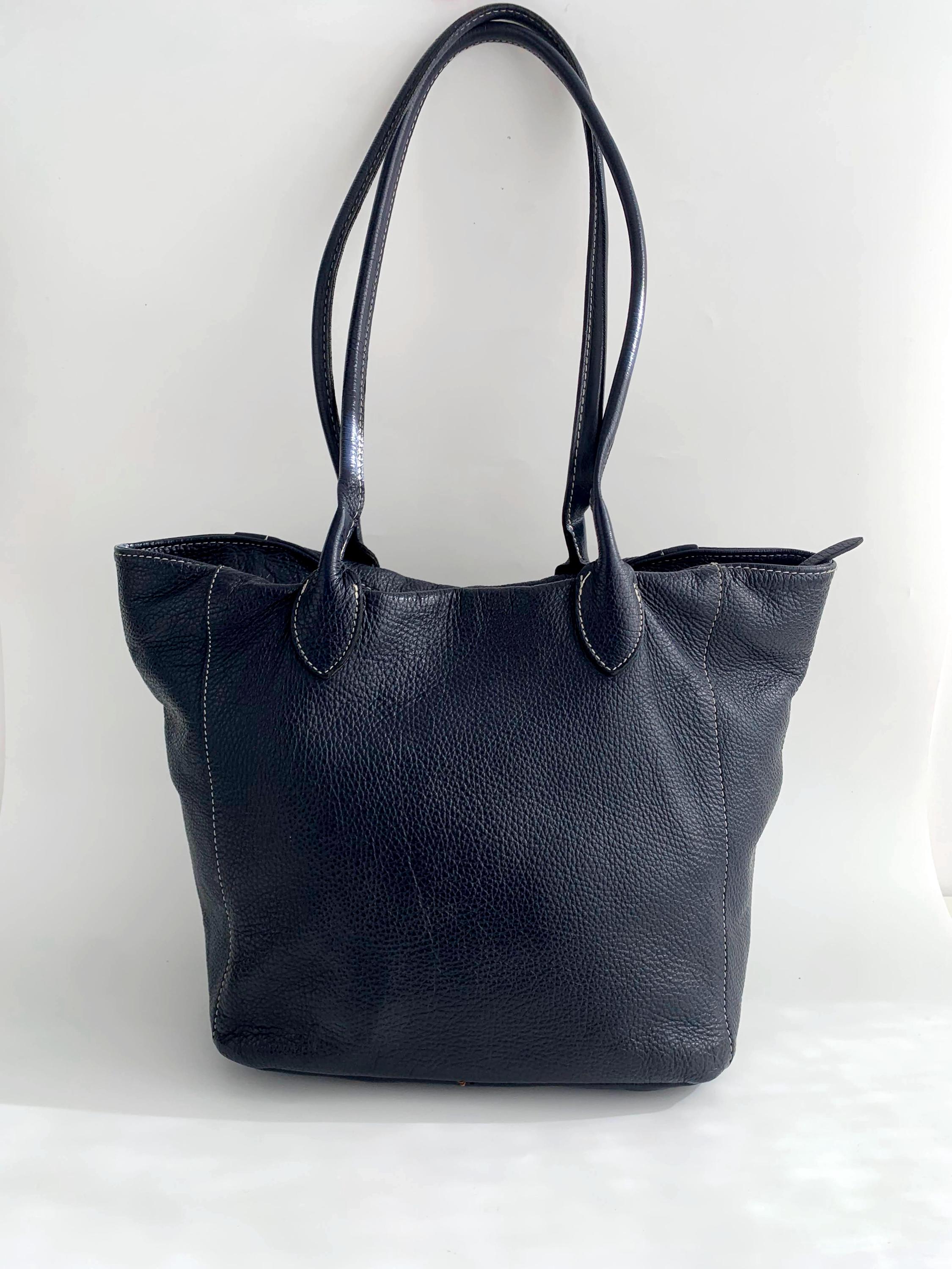 This is a beautiful vintage 90s pre-loved large capacity slouchy distressed real leather tote bag with zip closure, made of soft pebbled genuine leather in dark navy blue color. This spacious business work leather bag is perfect to wear at the office or at business meetings. Ideal travel bag which will fit in all you need for your busy day out. This big leather tote bag has cotton lining with one compartment, one small slip pocket and one zipper pocketn inside. There are two vertical zipper pockets at the front.