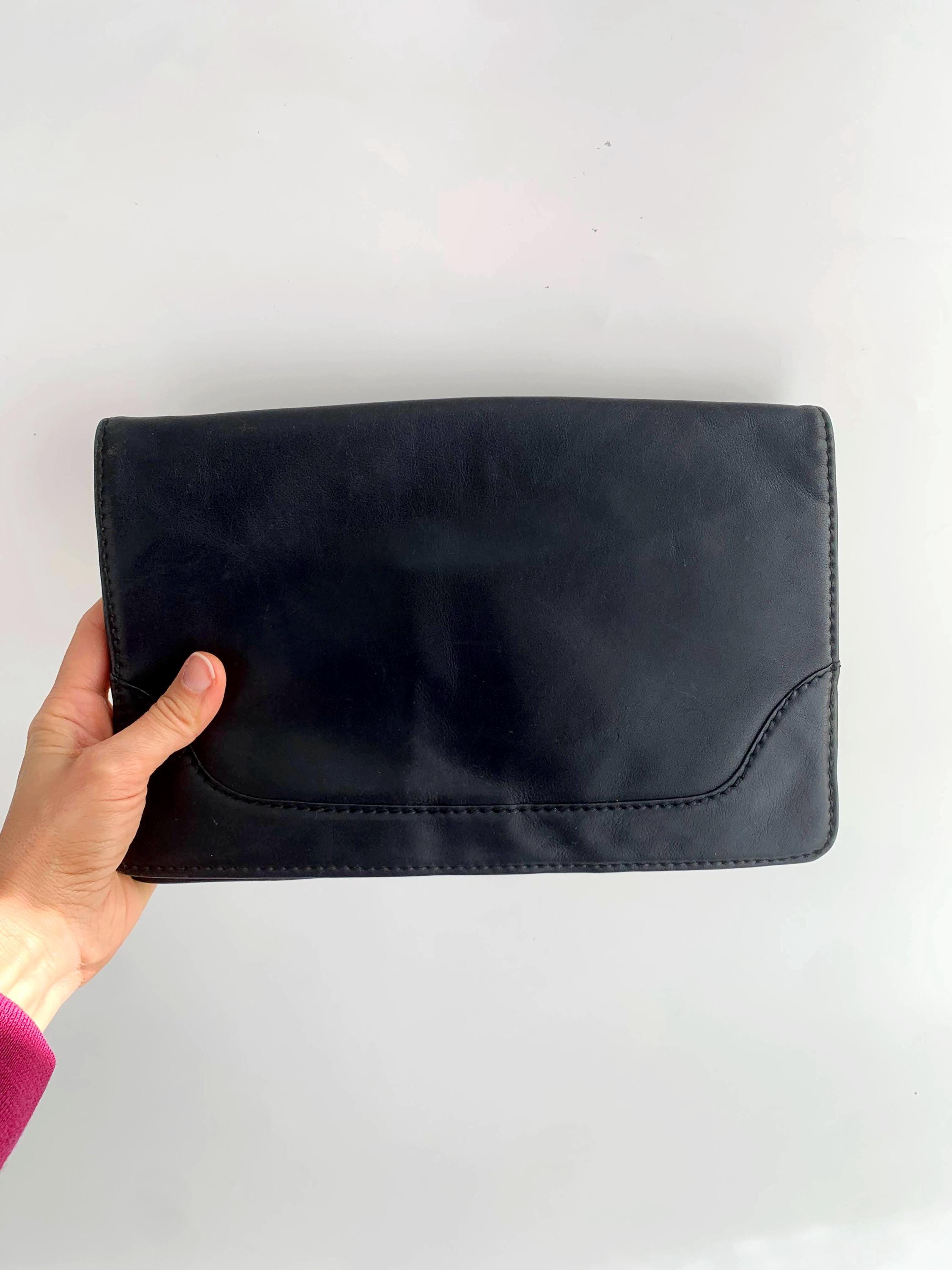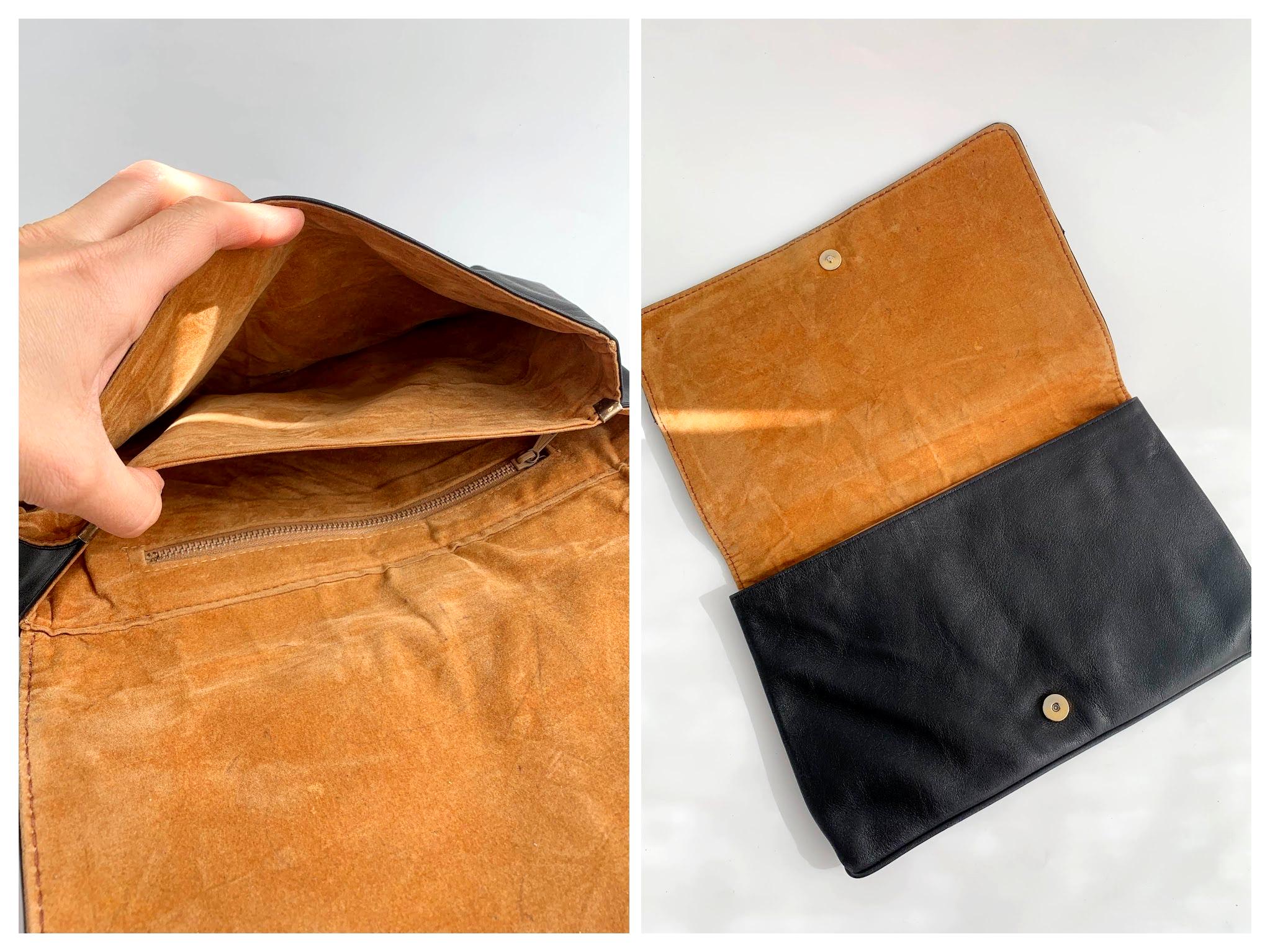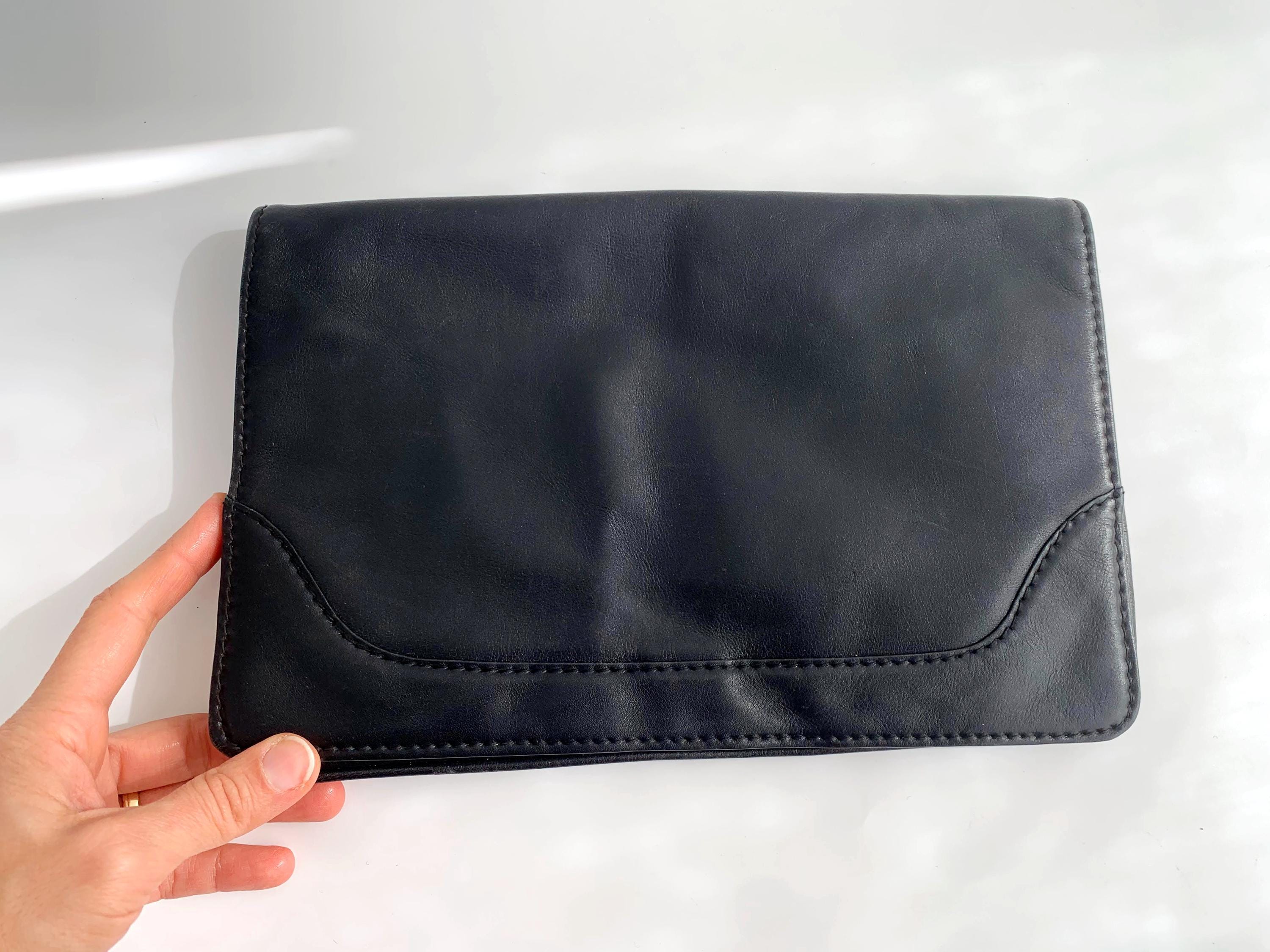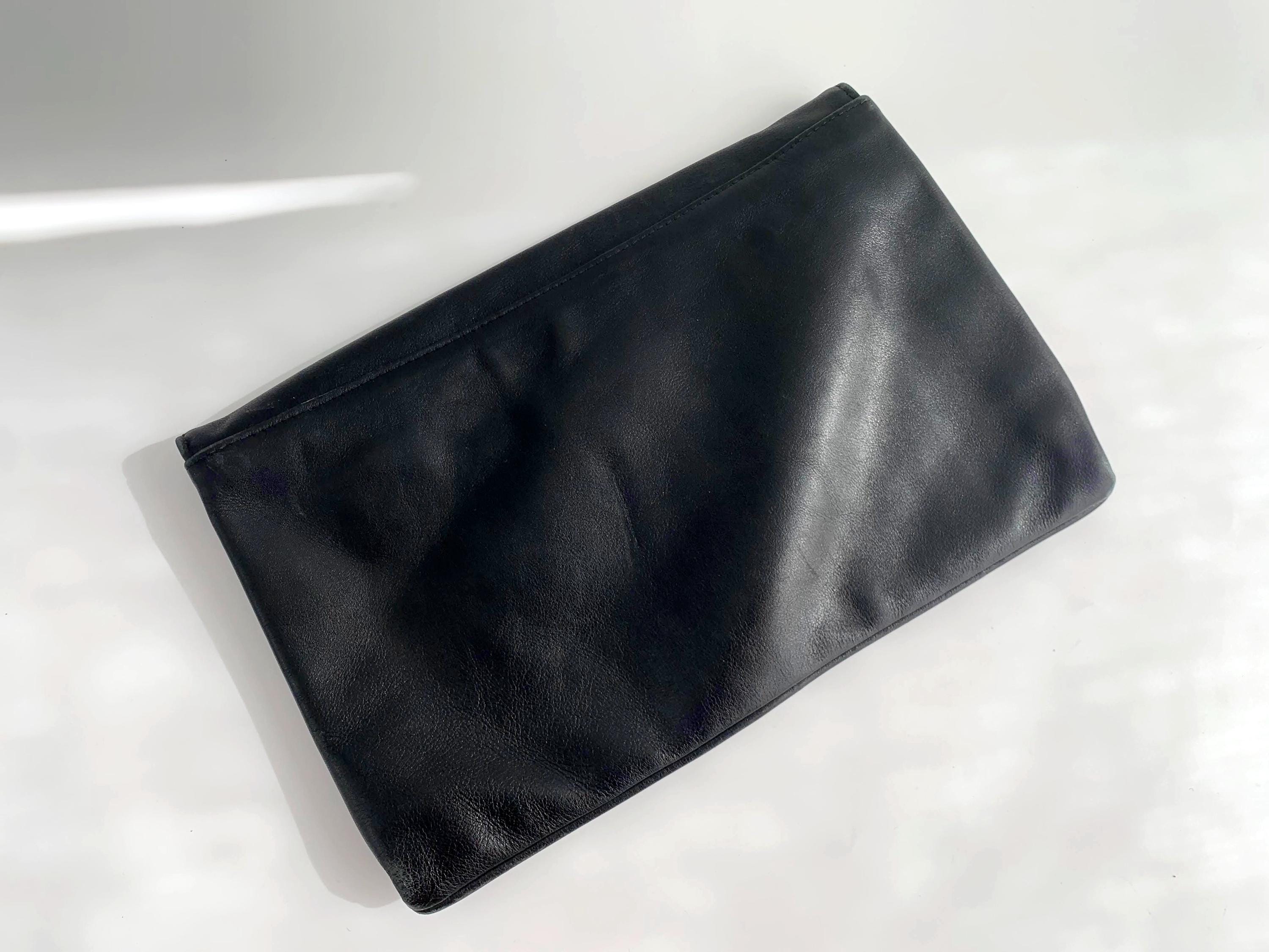 This is a classic vintage 80s pre-loved black slim envelope clutch purse made of genuine leather with magnetic closure. This retro handbag has velour fabric lining. It has two compartments and one pocket with zip closure. Beautiful minimalist clutch purse for your sustainable fashion wardrobe.