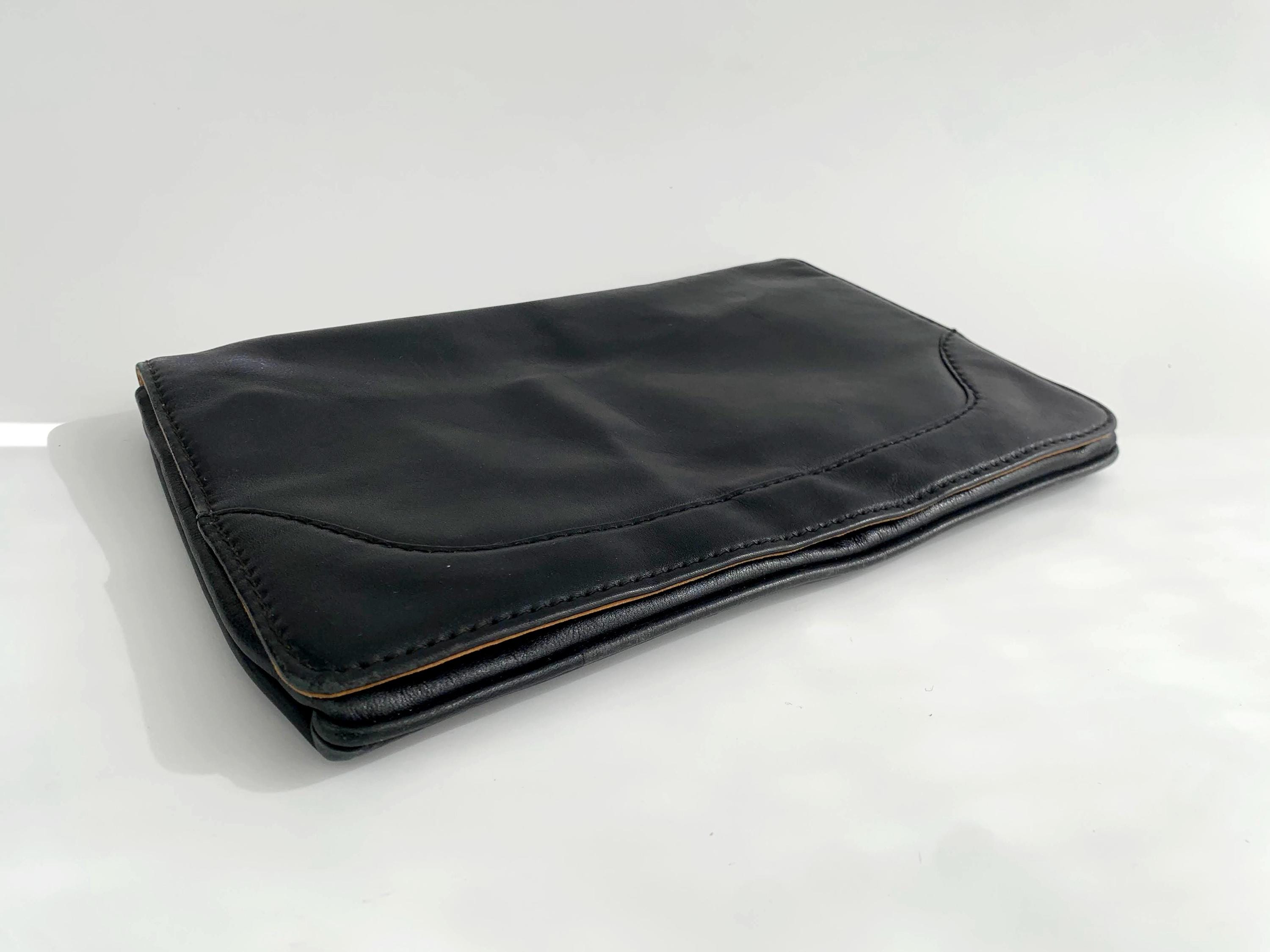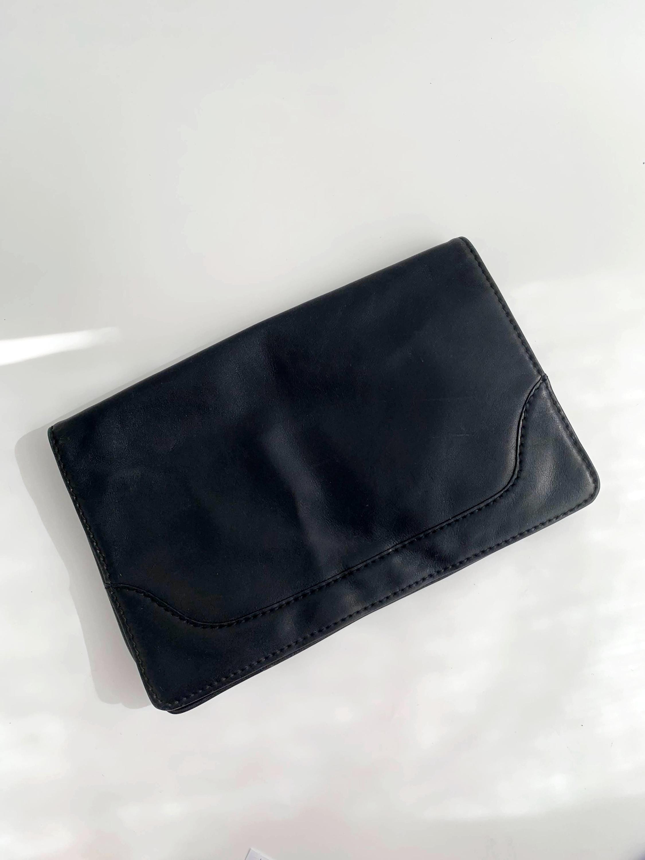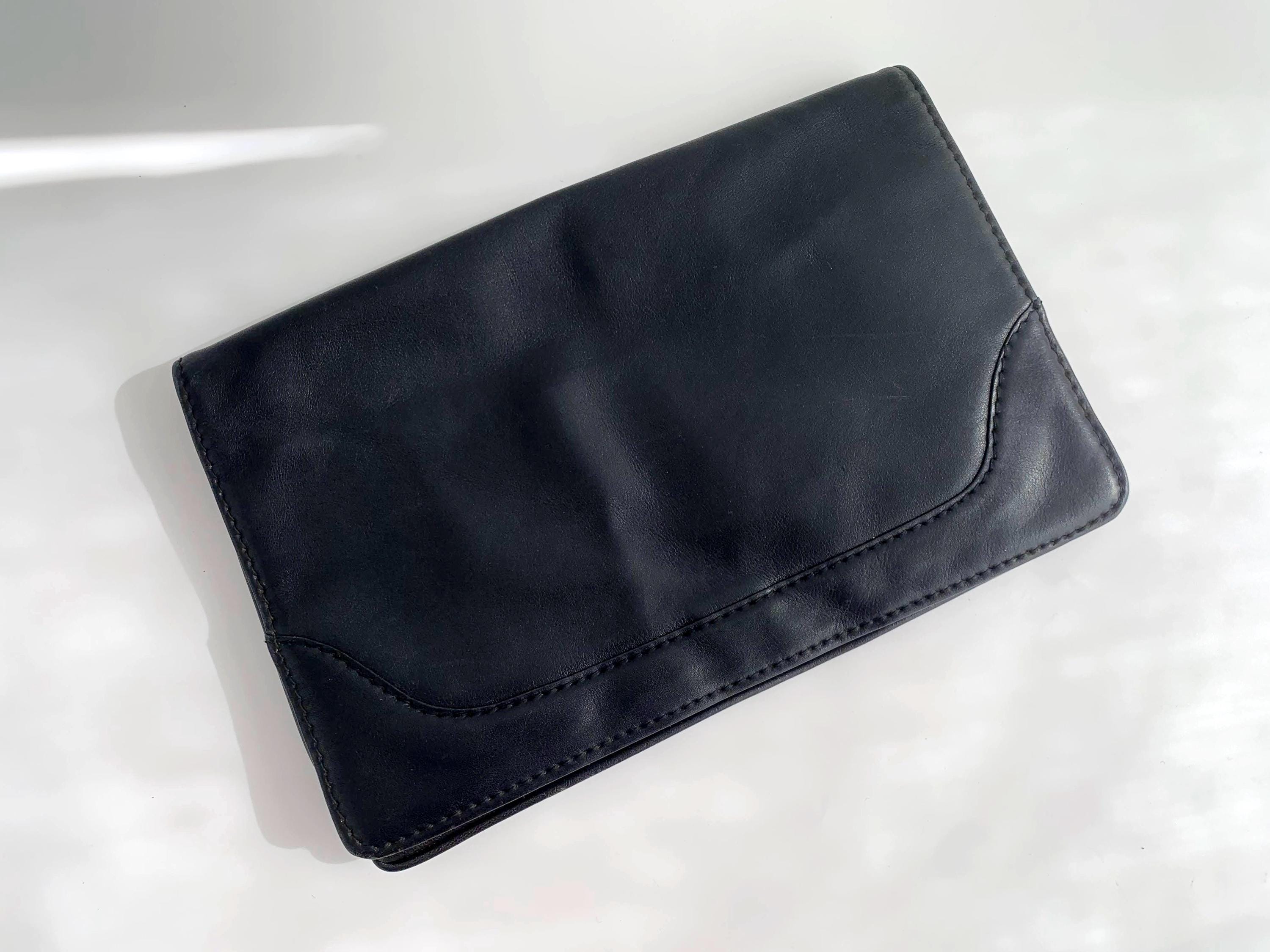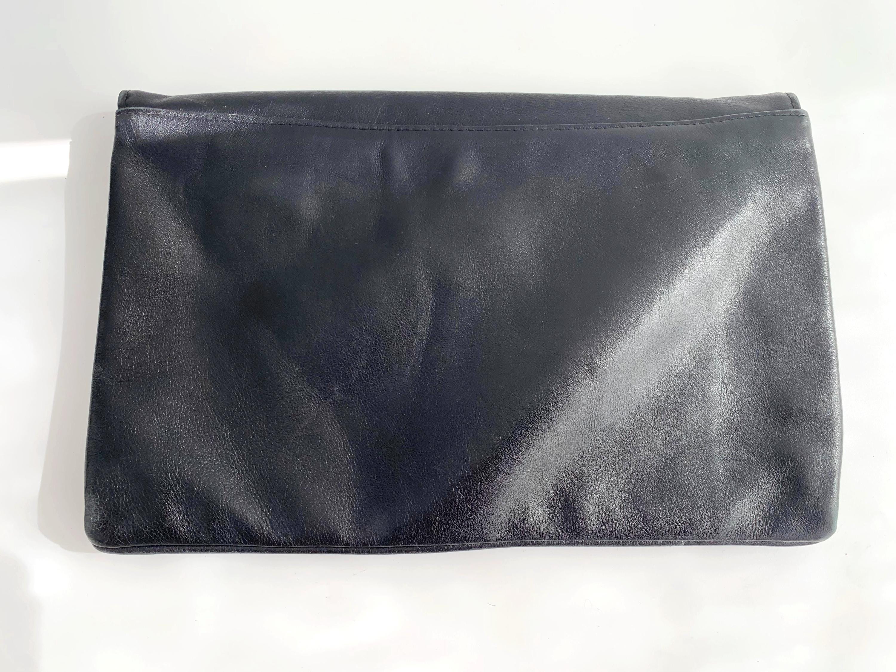 This is a classic vintage 80s pre-loved black slim envelope clutch purse made of genuine leather with magnetic closure. This retro handbag has velour fabric lining. It has two compartments and one pocket with zip closure. Beautiful minimalist clutch purse for your sustainable fashion wardrobe.