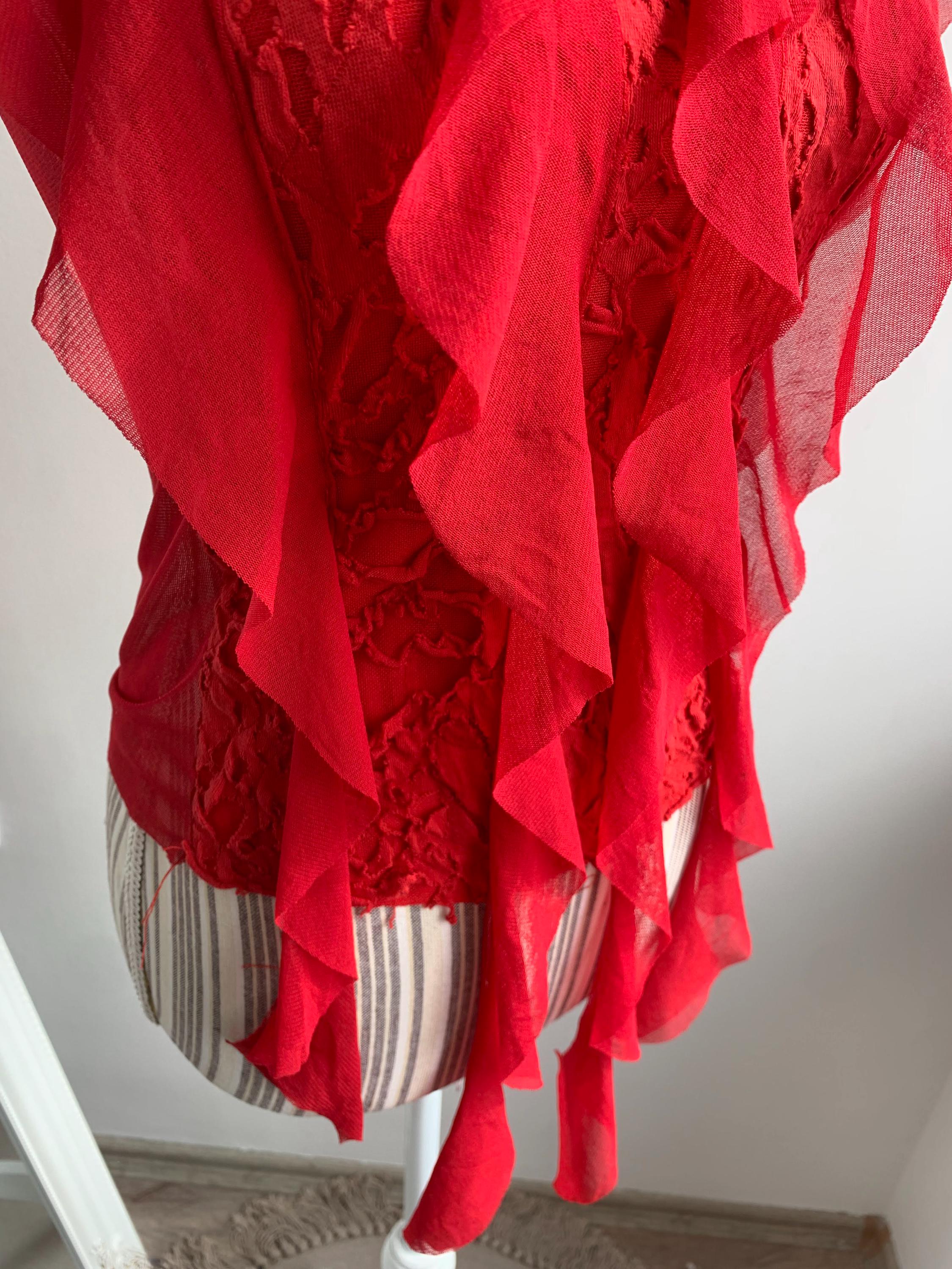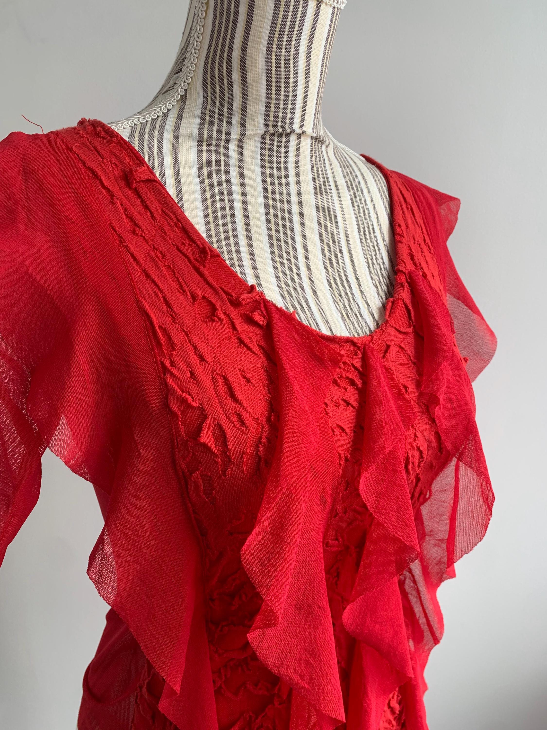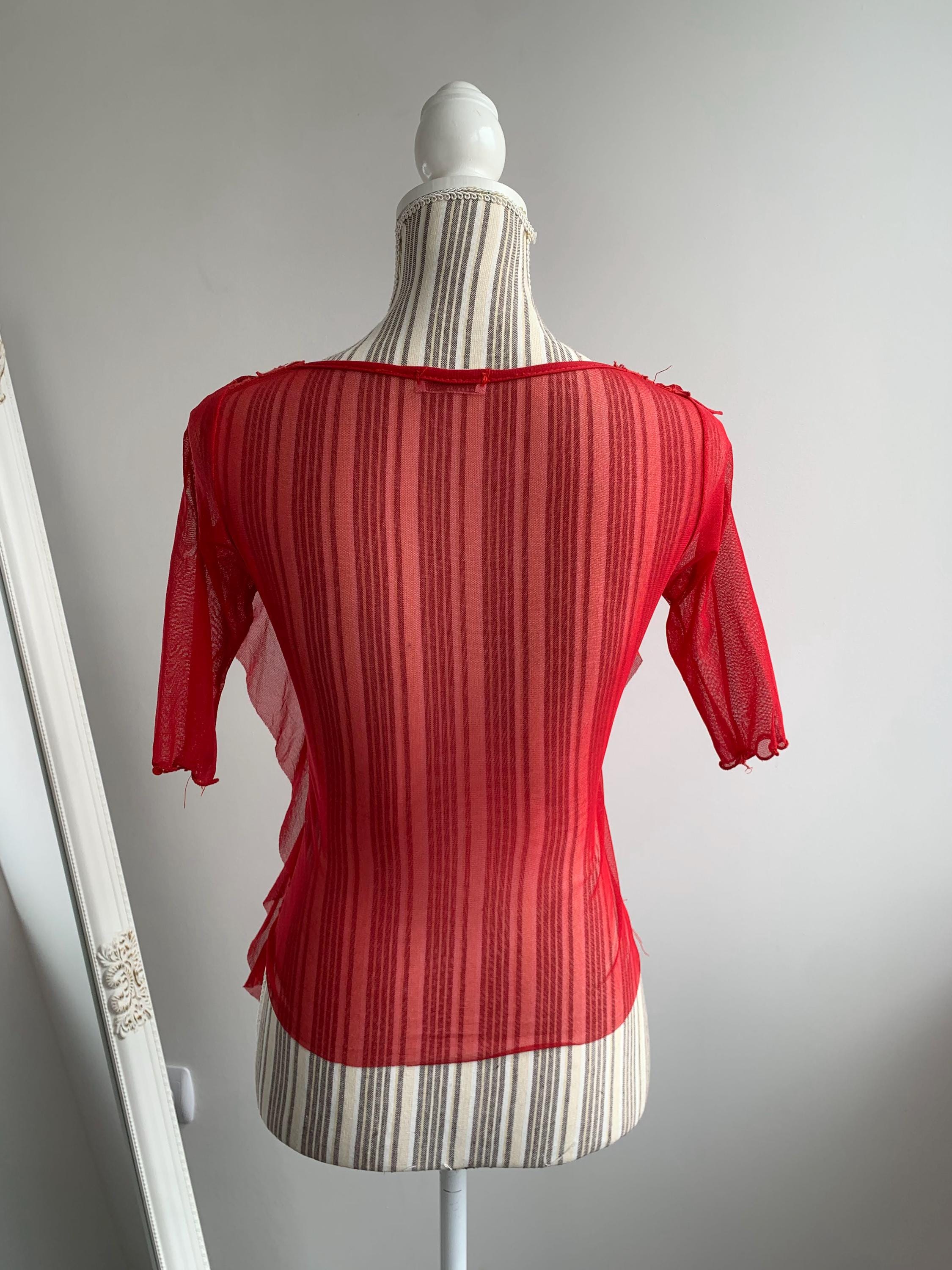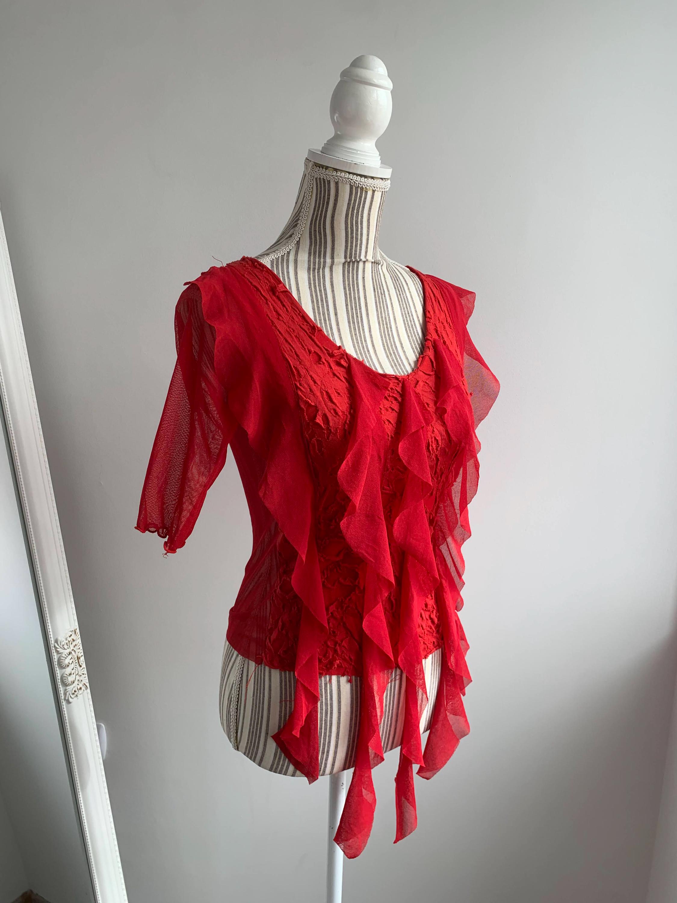 This is a lovely ruffled sheer mesh stretchy grunge top with short sleeves, sheer back and sleeves and distressed ripped front with long ruffles. This fairy grunge top is perfect for the summer. It fits like size XS/ S
