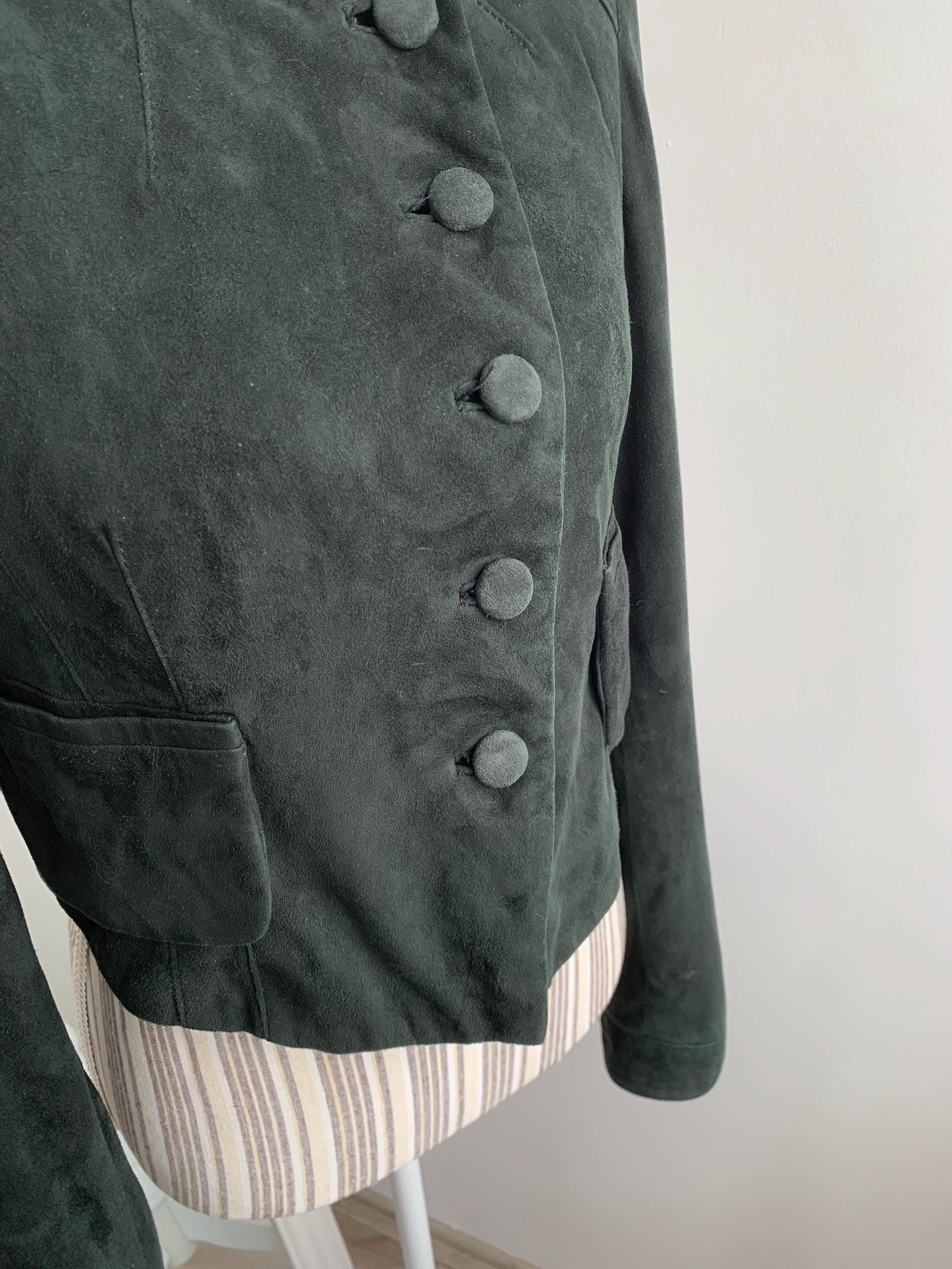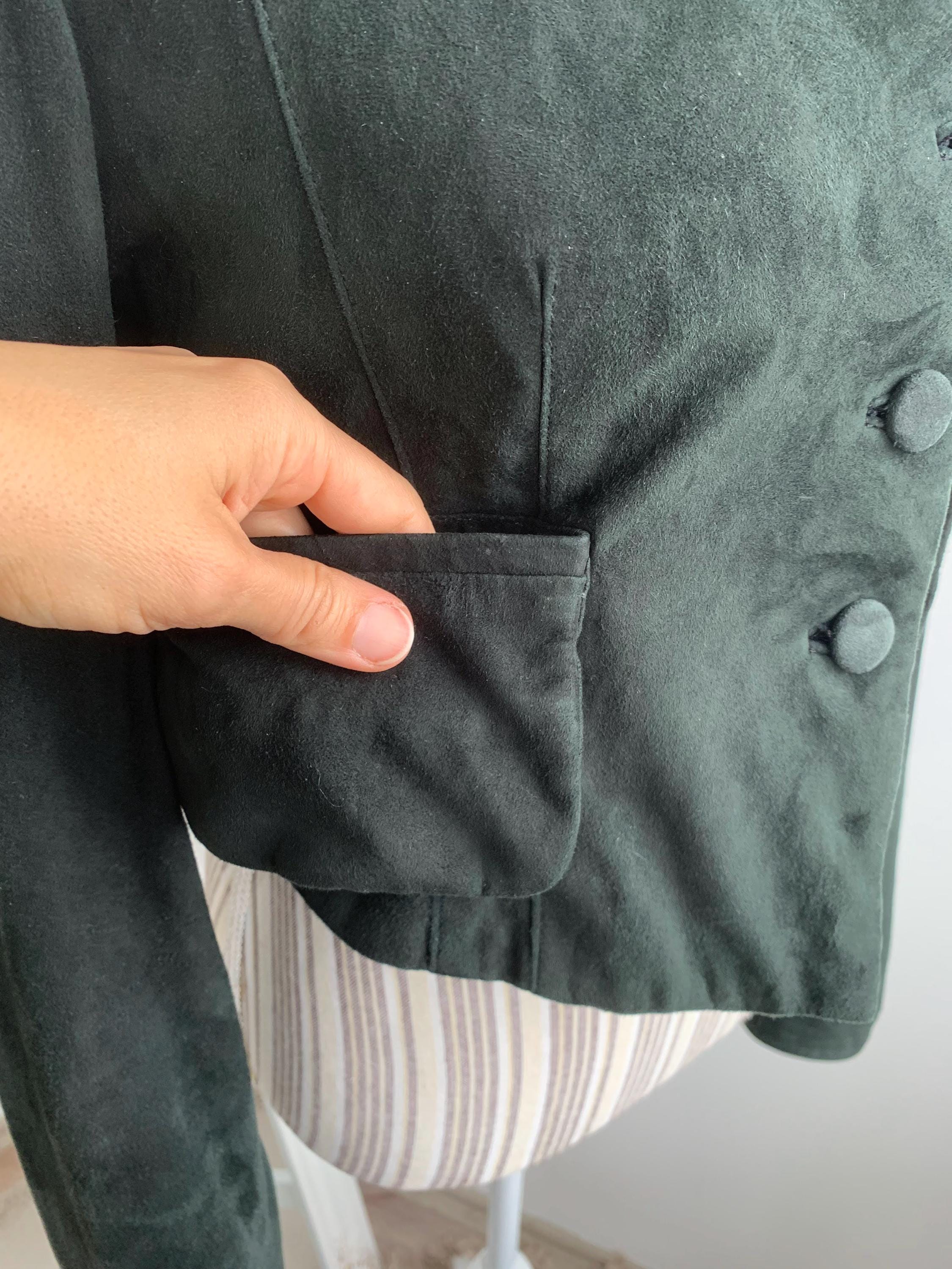 Condition: this deep green suede leather jacket was pre- loved and shows some signs of wear typical for suede leather items. The suede leather has become softer with the wear. There are some marks and scratches on the suede leather surface. Overall the jacket is in beautiful vintage condition.