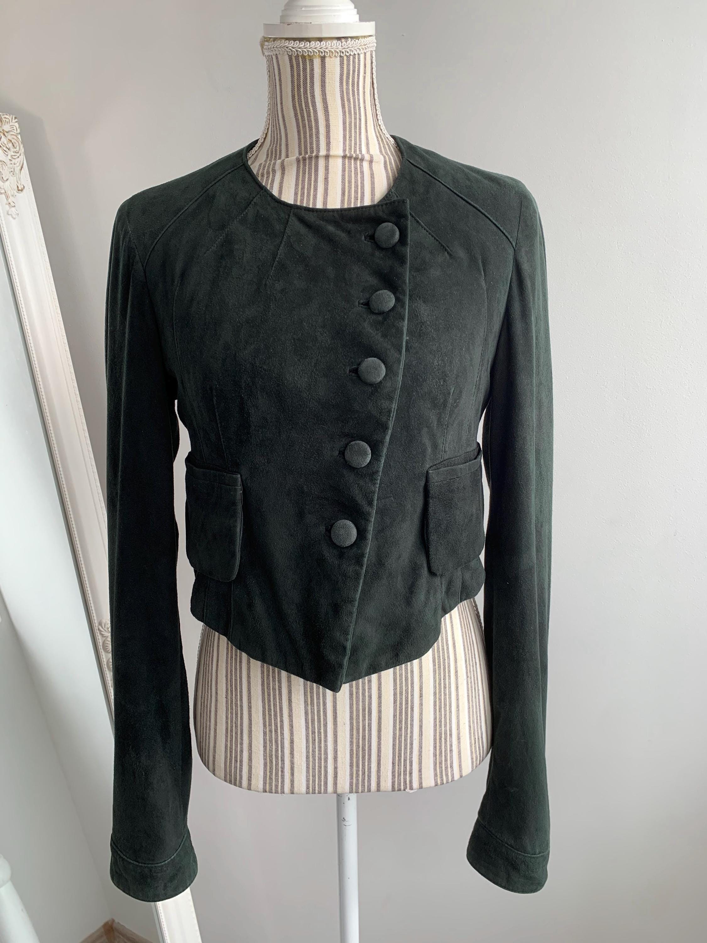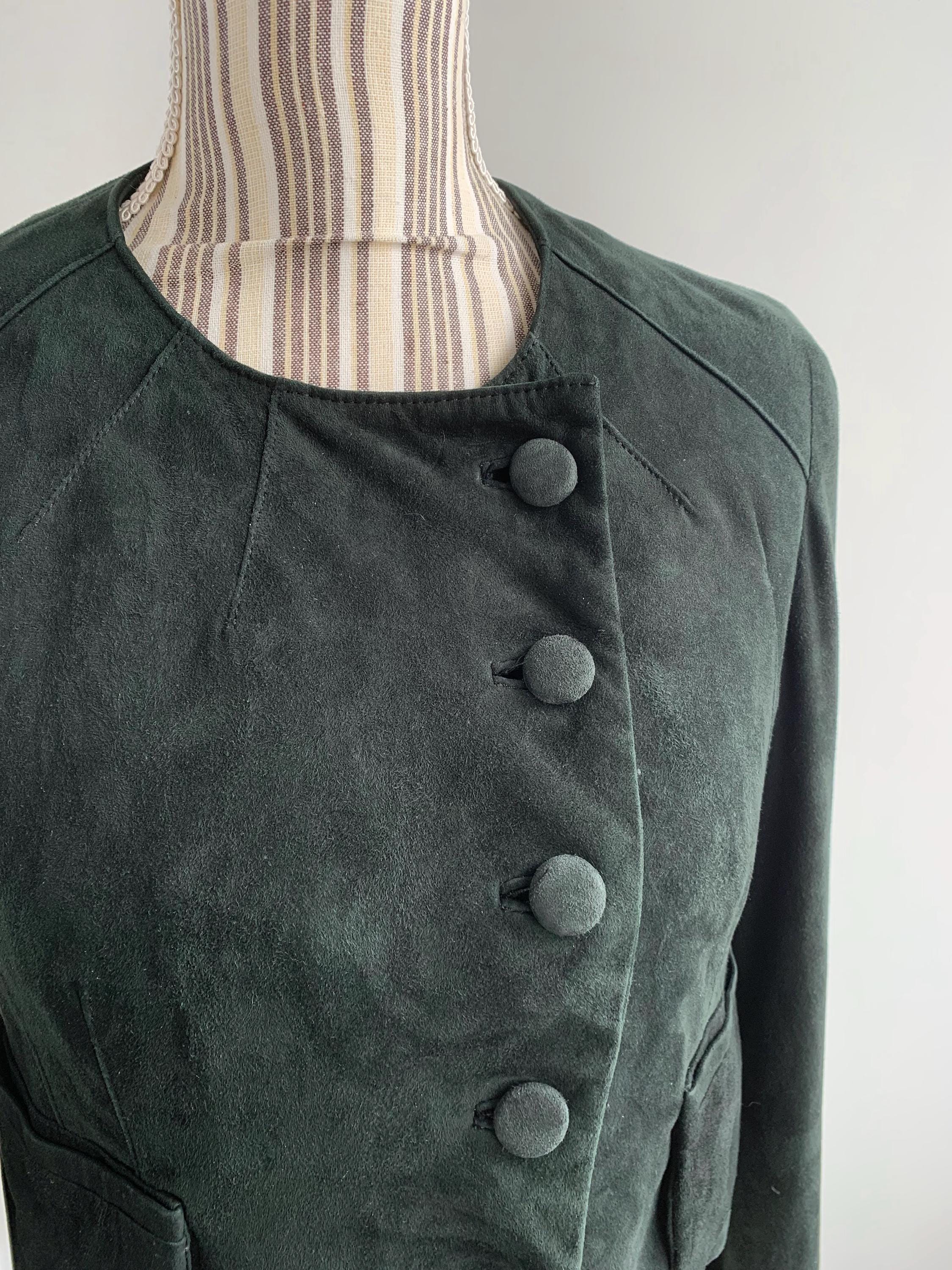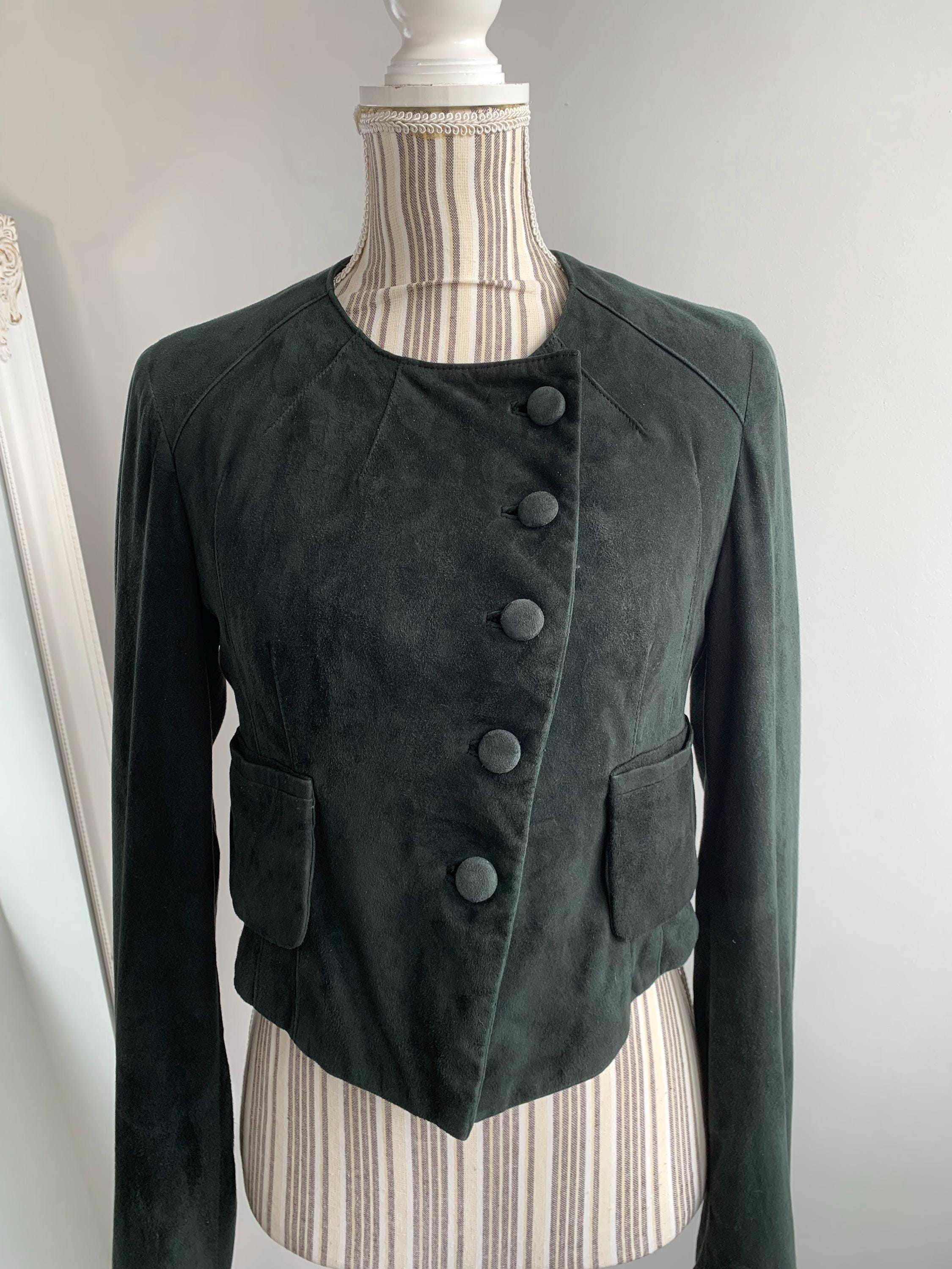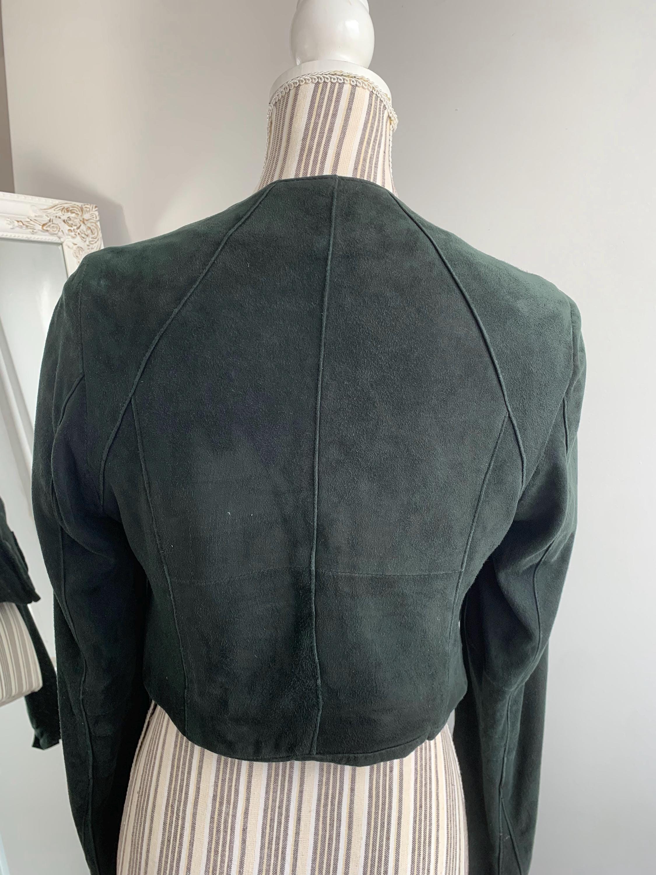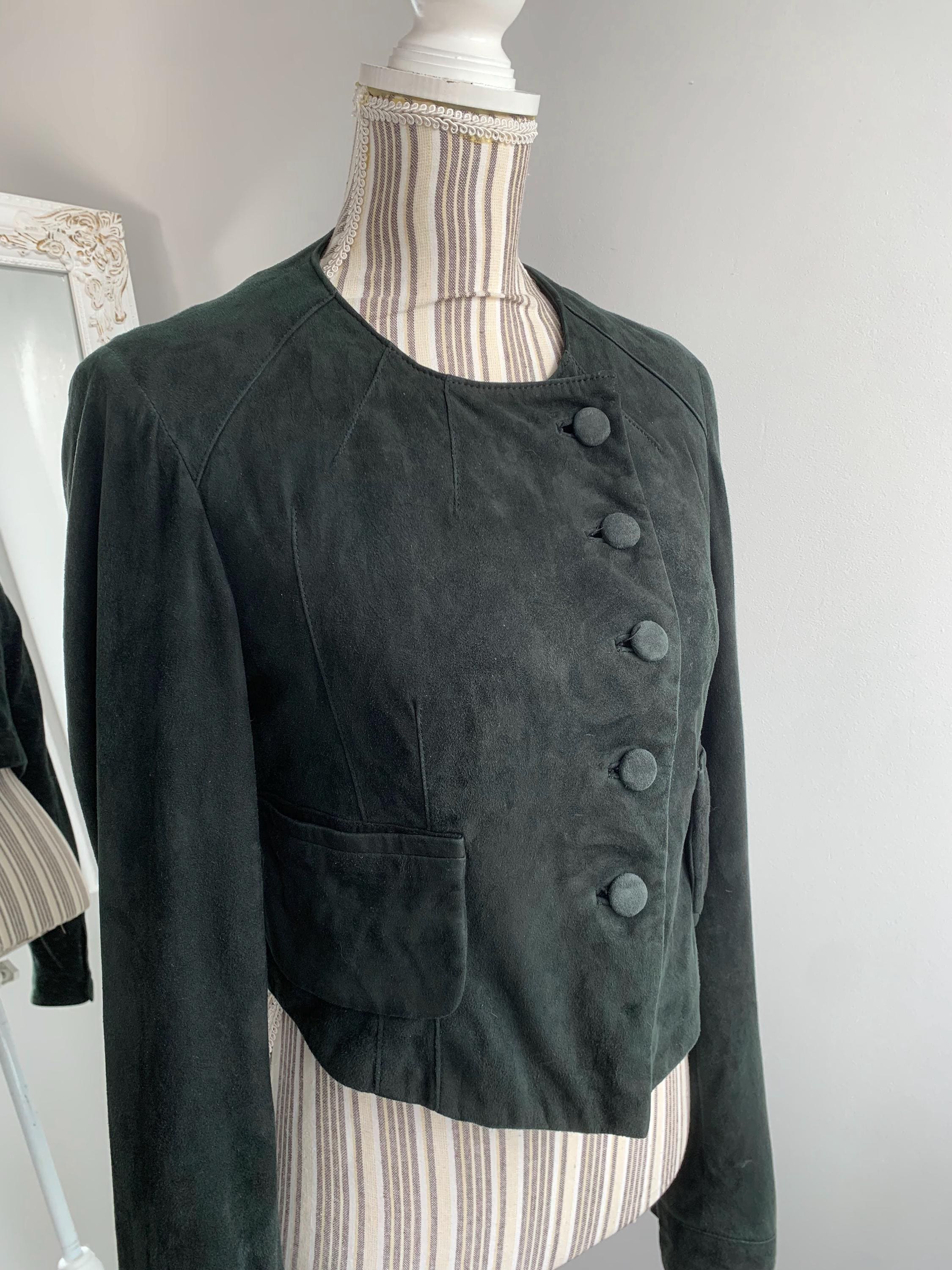 Step back into the chic style of retro fashion with this vintage Y2K deep petrol green suede cropped jacket by the brand Day Birger et Mikkelsen. Crafted from super soft genuine suede lamb leather, this women's retro coat features a flattering cropped silhouette and long sleeves, perfect for layering over your favorite outfits. The rich deep green shade adds a pop of subtle color, while the classic design ensures timeless appeal. Ideal for those who appreciate unique vintage fashion, this jacket is a standout piece for any wardrobe. Whether you're heading to a casual outing or a themed event, embrace the elegance of the past with this exquisite suede cropped jacket.
