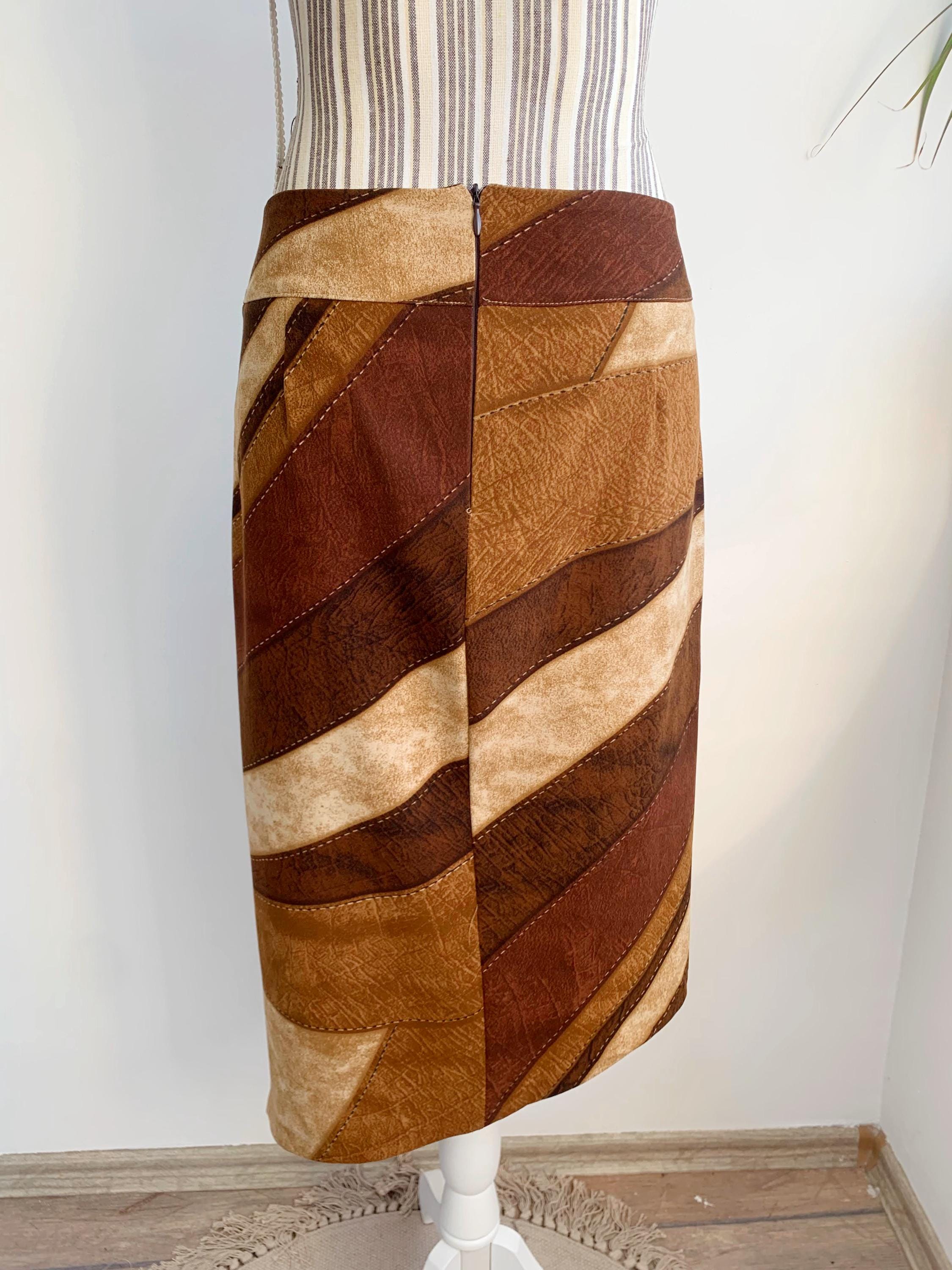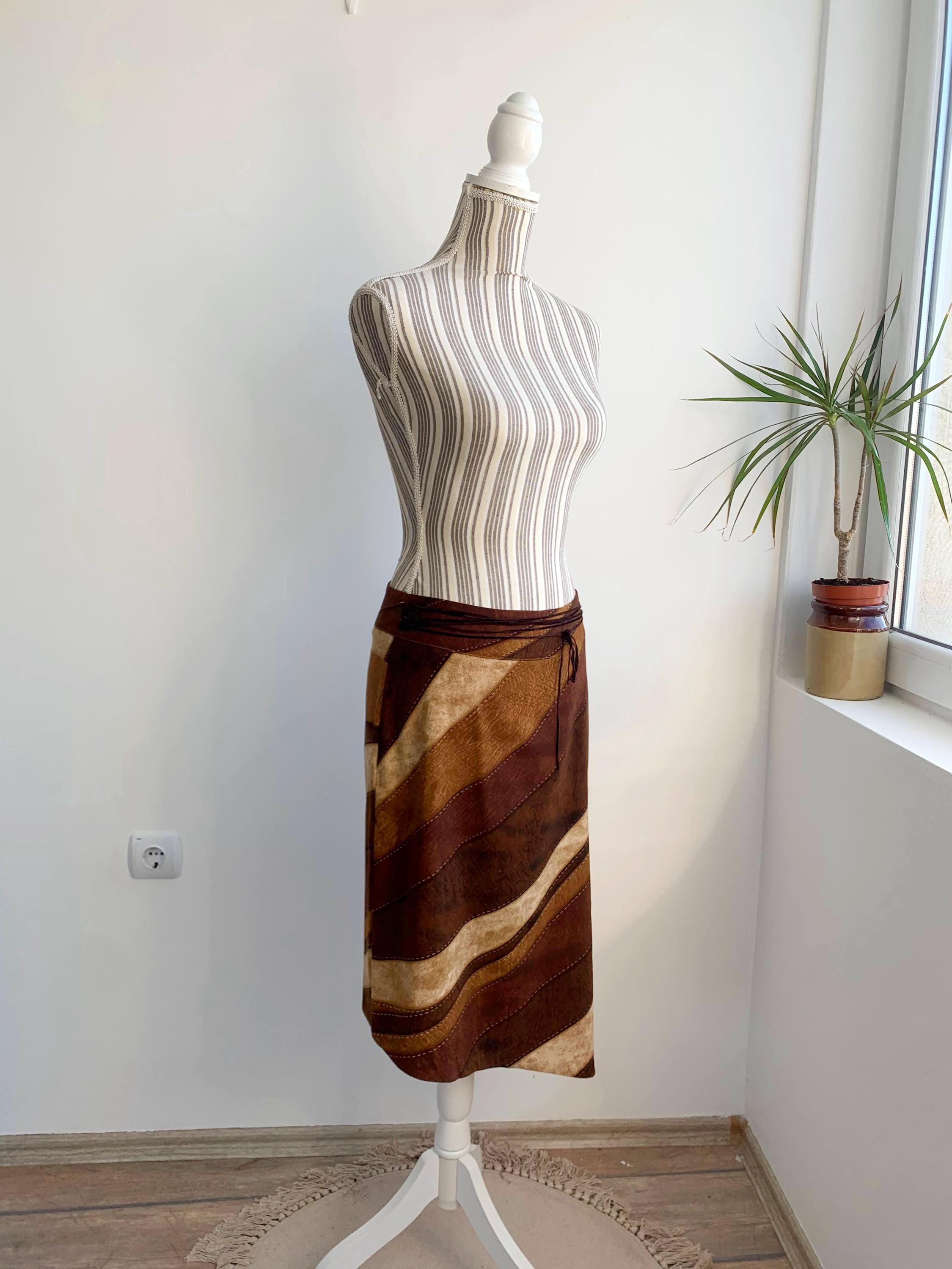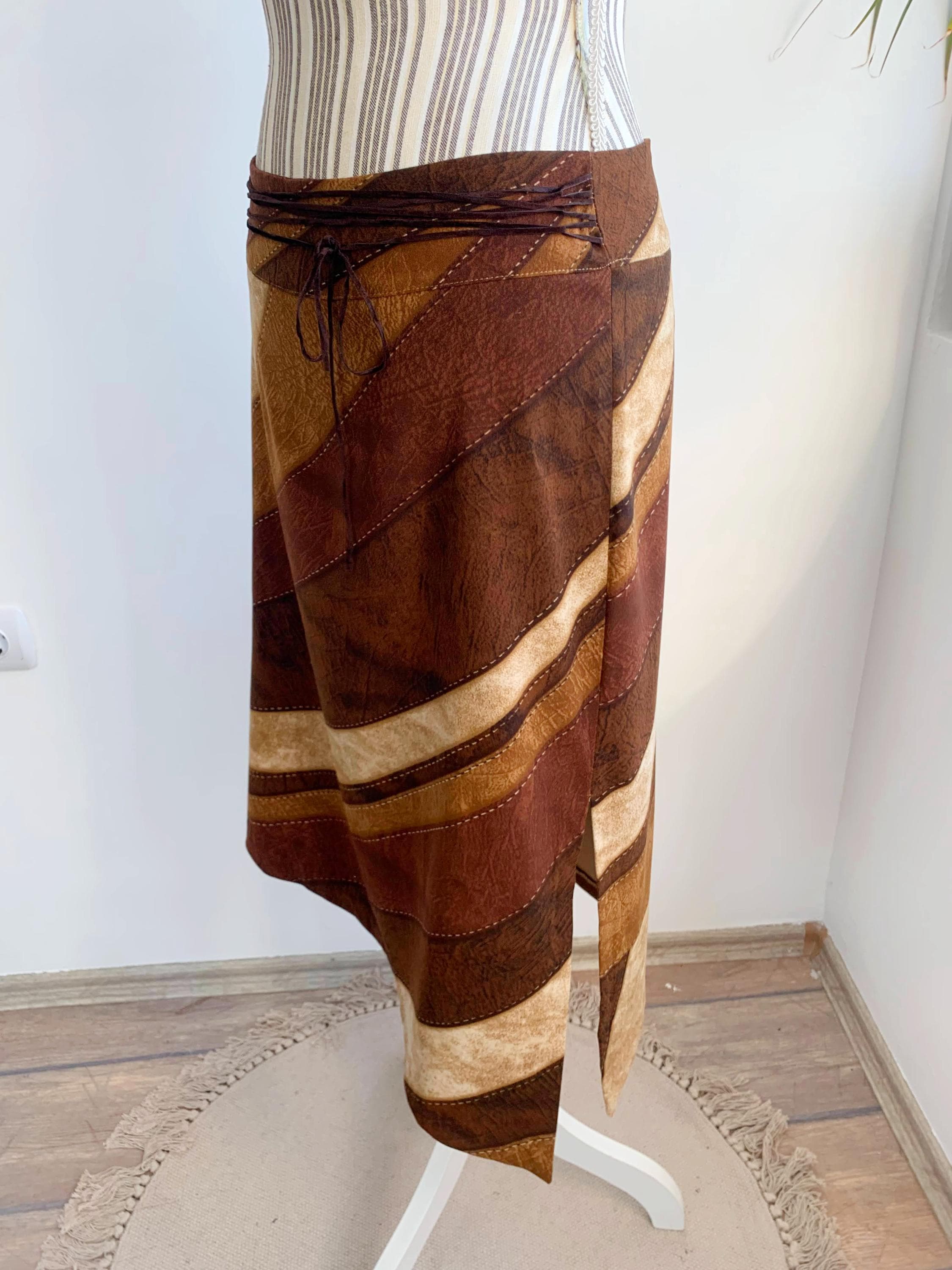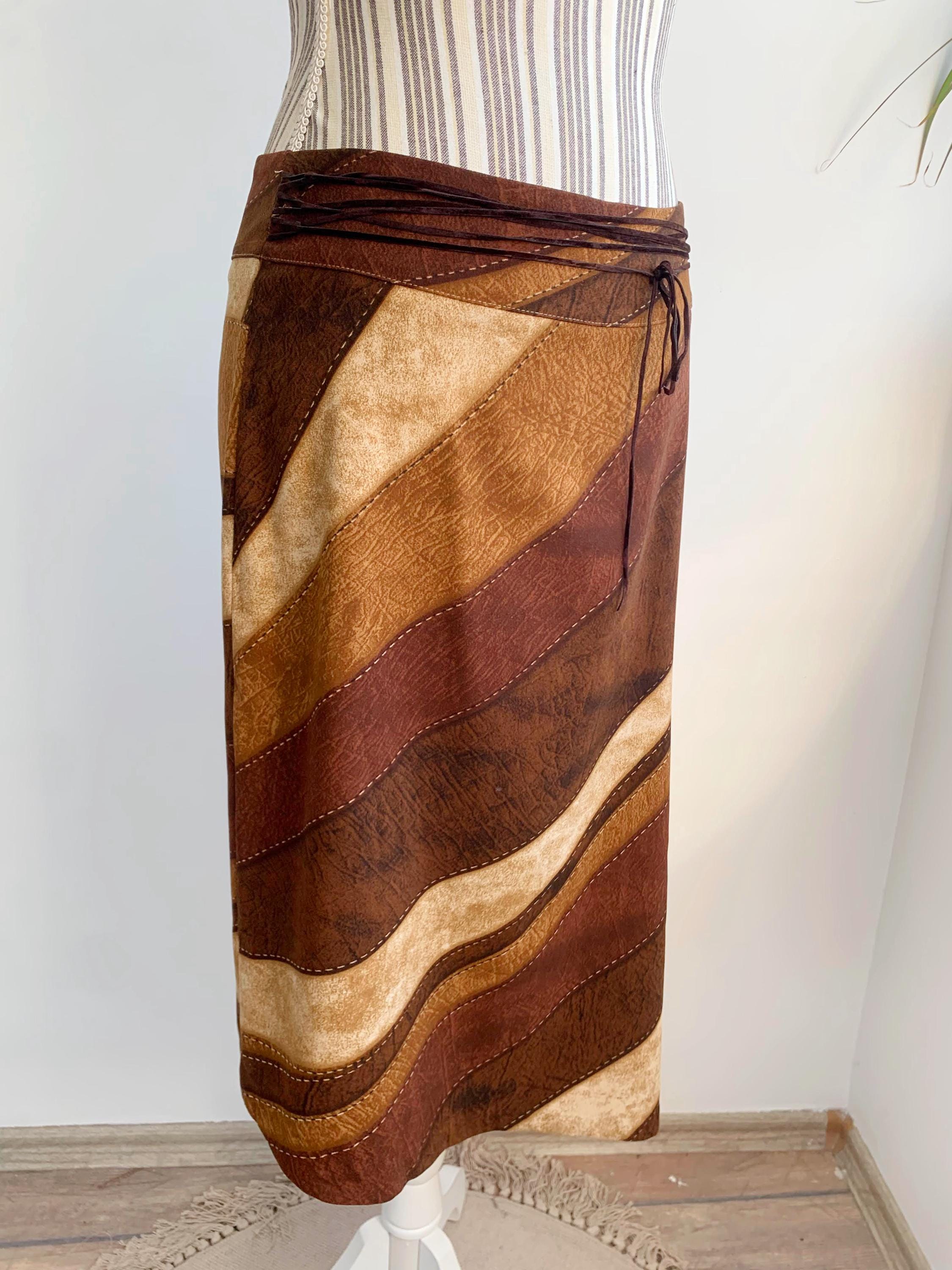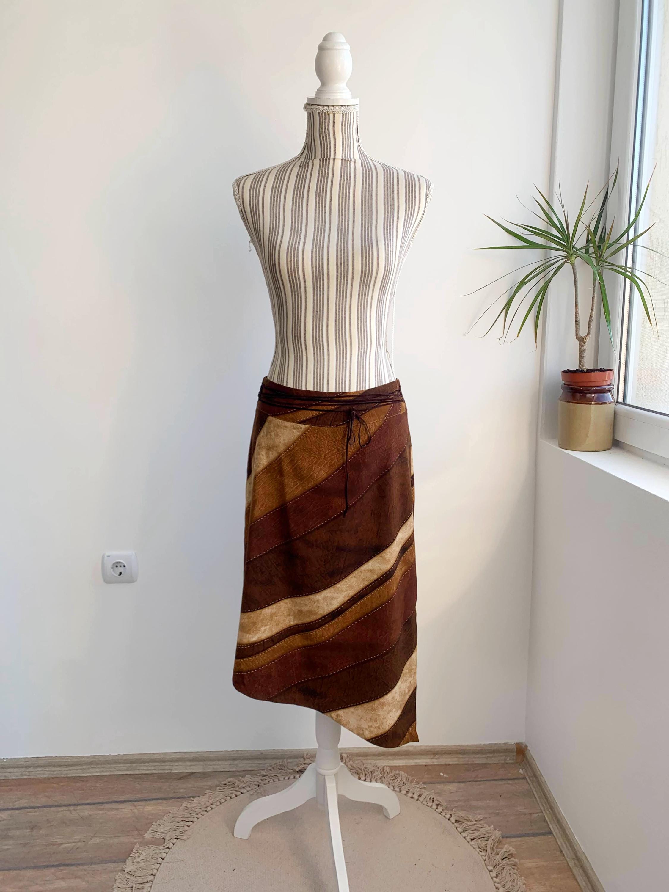 This is a vintage 90s camel beige brown stretchy asymmetrical midi skirt with side slit and suede leather lace up detailing at the front. This 90s grunge skirt is made of elastic polyester fabric with back zip closure. This boho hippie grunge skirt is made of beautiful patchwork print fabric made of 97% polyester and 3% spandex. Thie boho grunge skirt has suede leather lace at the front. The size marked is 44 Italy, which fits like M. Please check the measurements below.