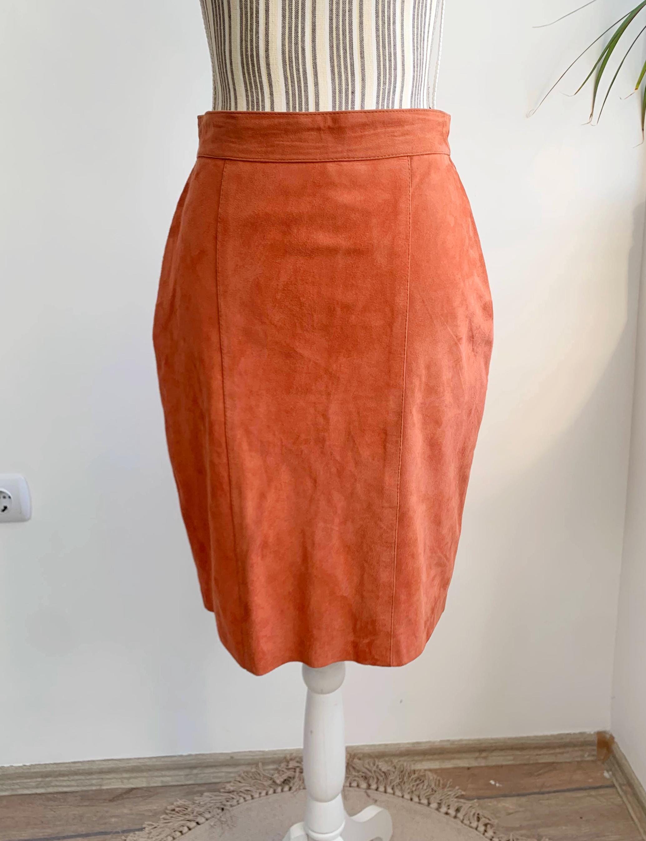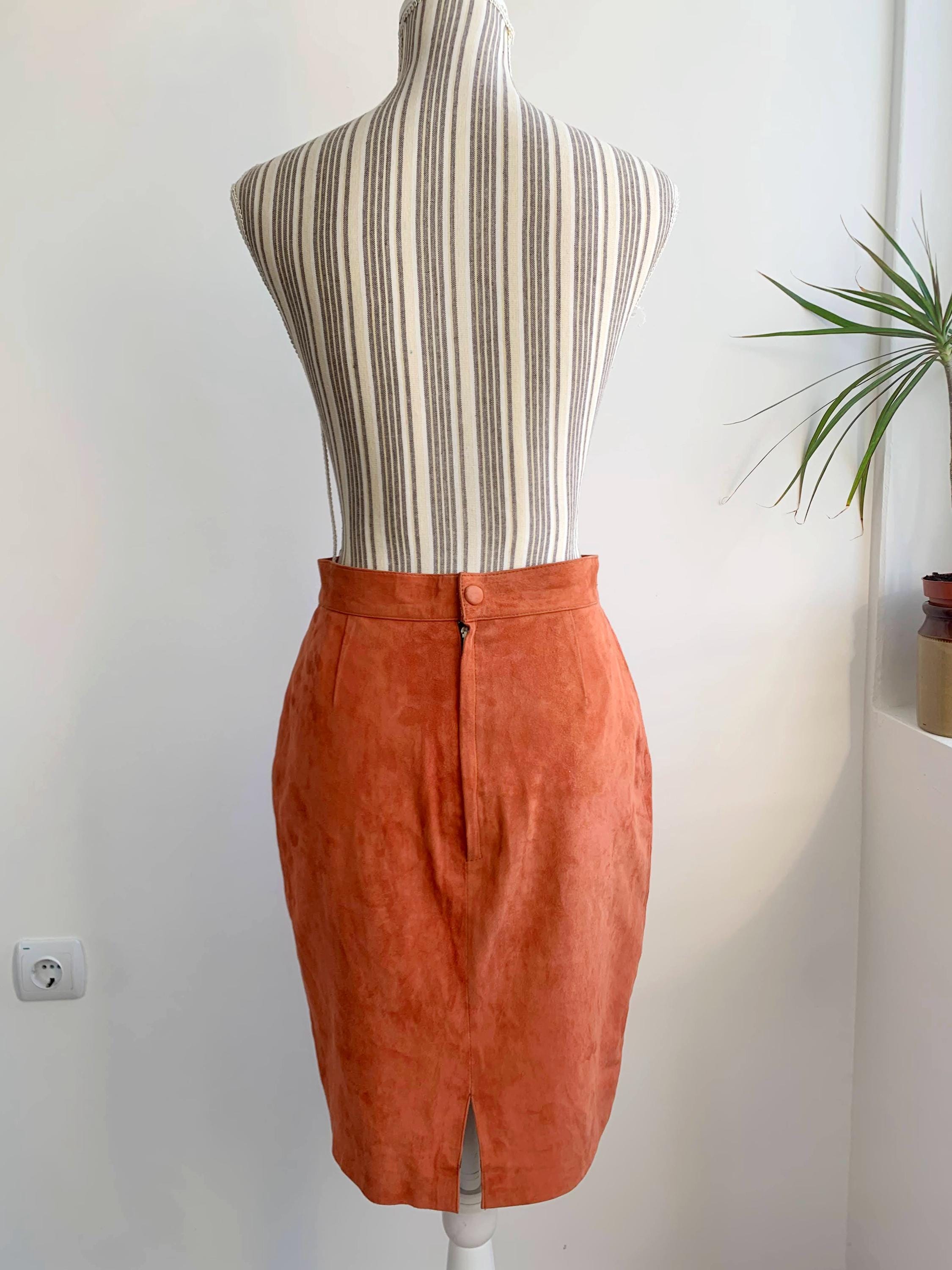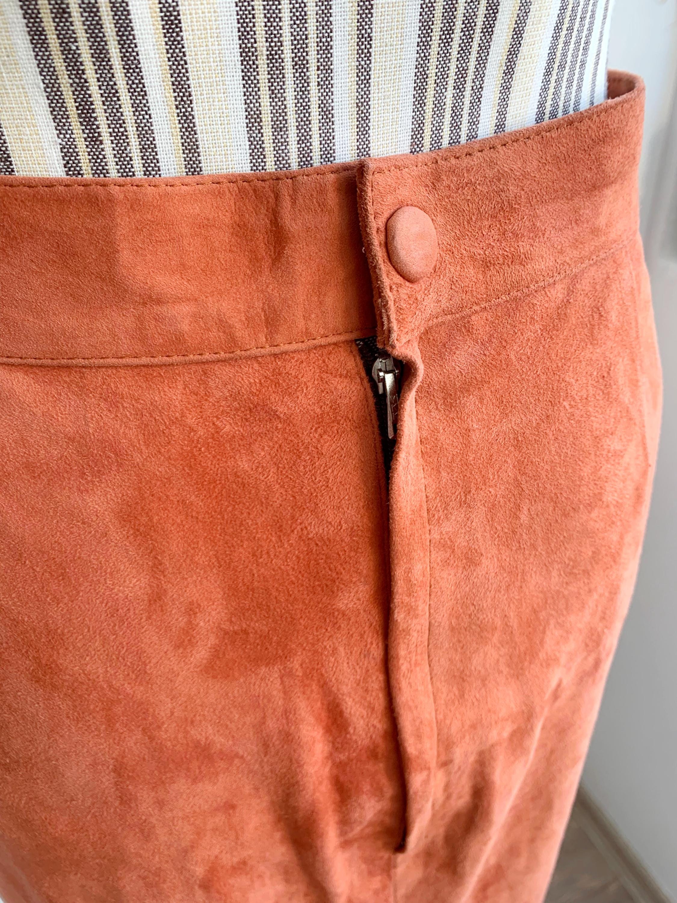 This is a vintage 90s super soft real suede leather pencil skirt for women size S. This soft suede mini skirt is in gorgeous salmon orange color. This sexy fitted above the knee skirt is made of super soft genuine suede leather with polyester lining. This 90s grunge leather skirt has back zip and snap button closure. There is no tag or label, no brand or size is marked, it fits like S.