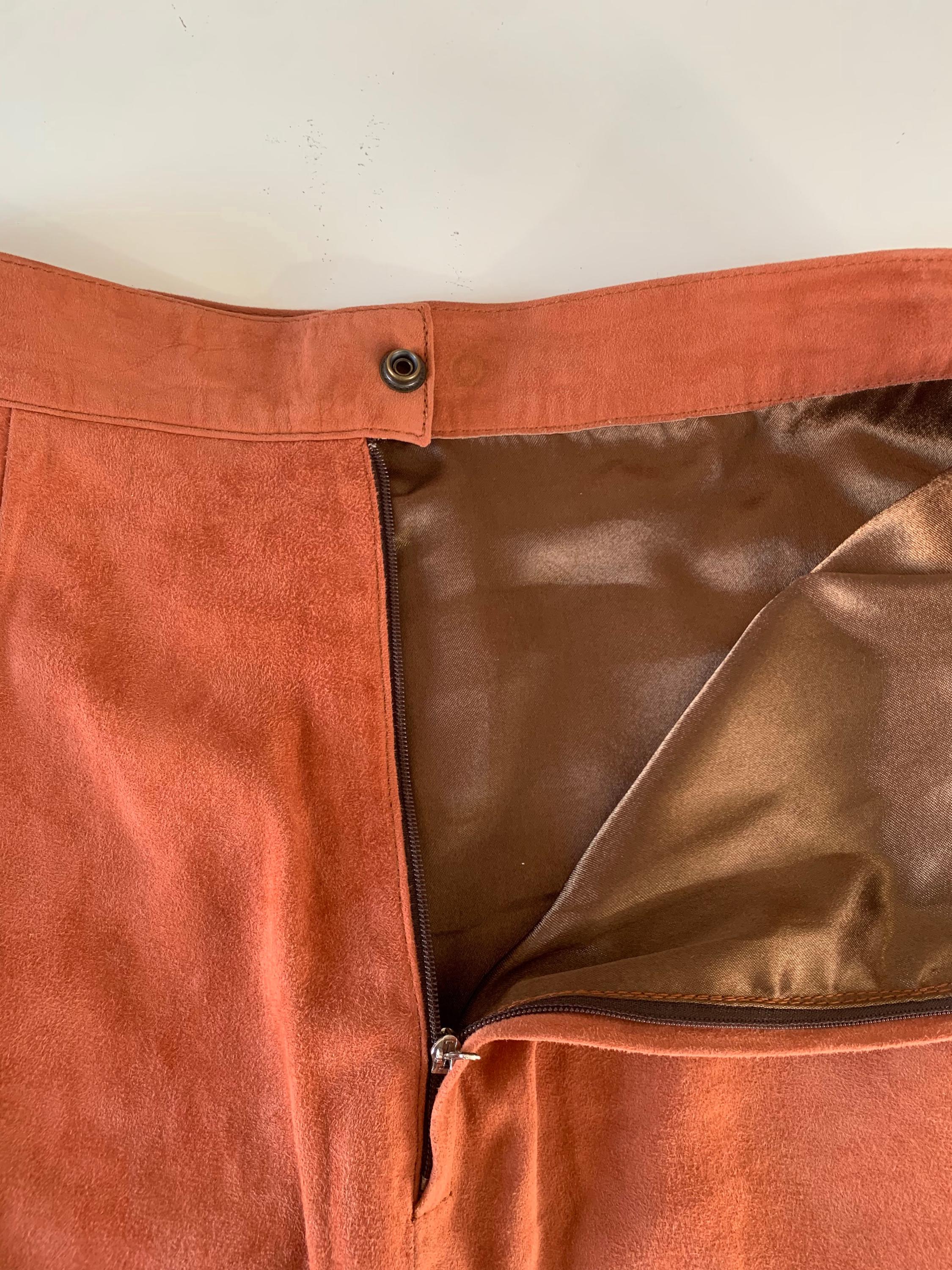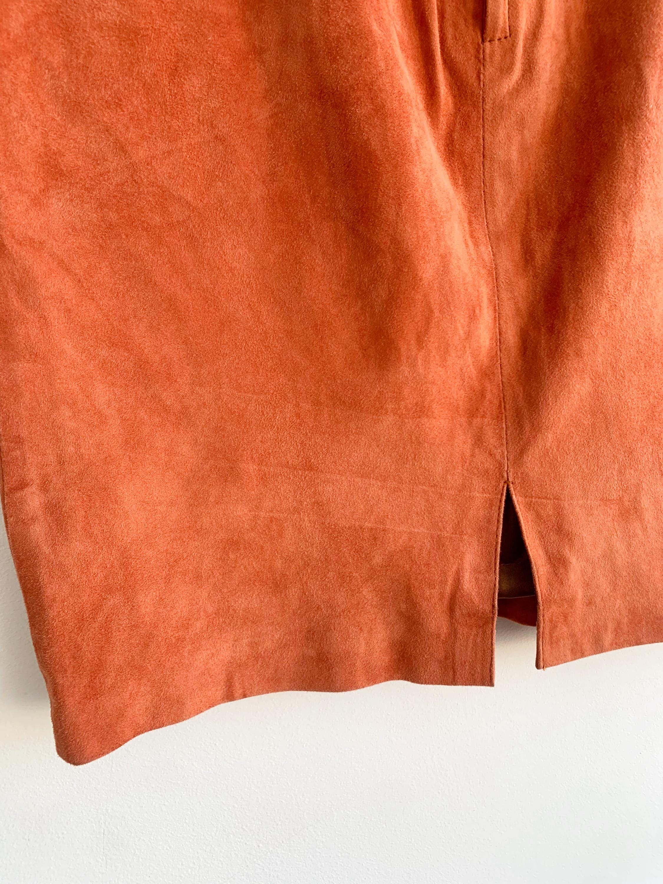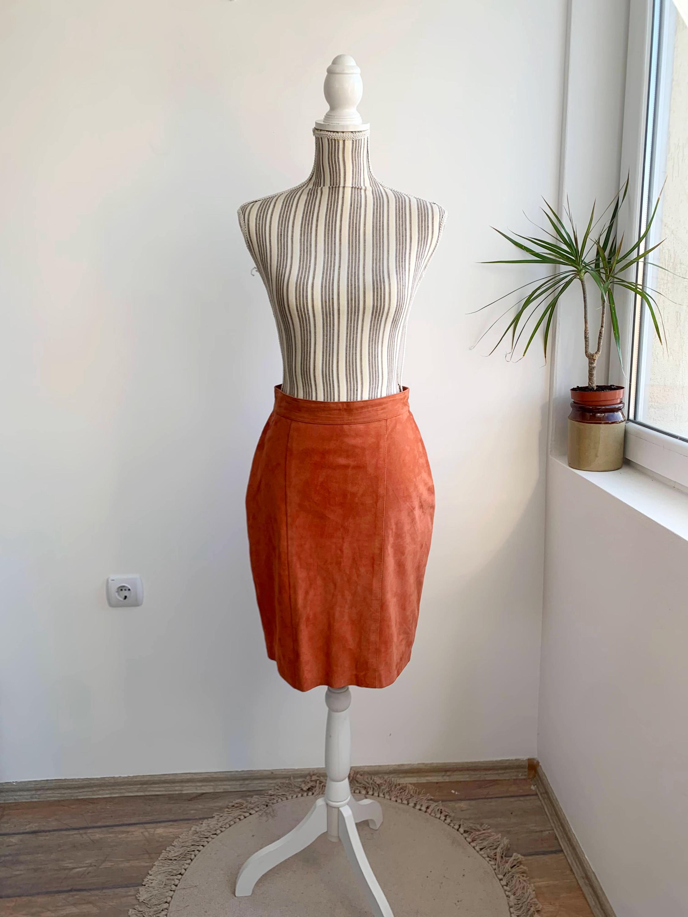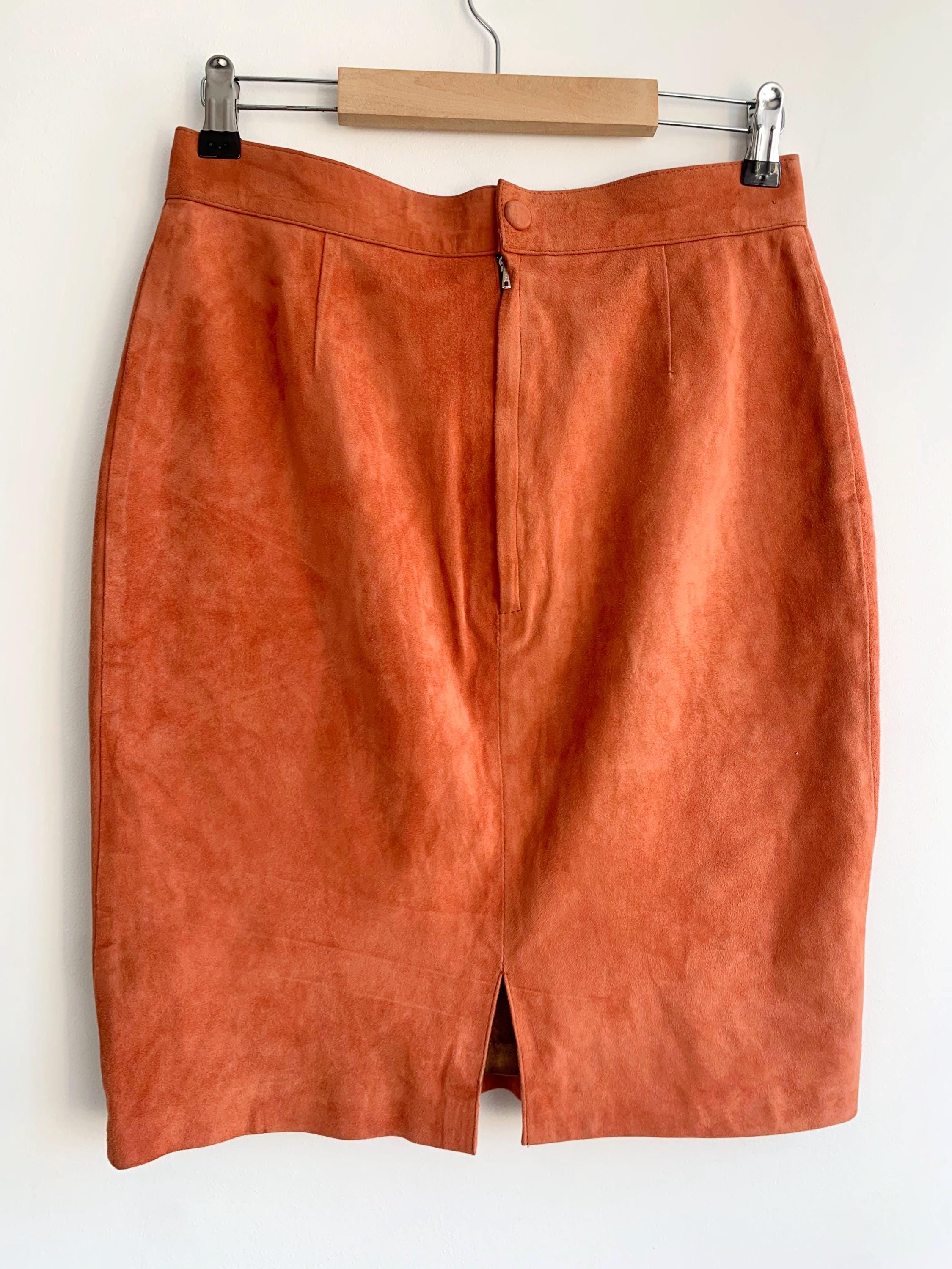 This is a vintage 90s super soft real suede leather pencil skirt for women size S. This soft suede mini skirt is in gorgeous salmon orange color. This sexy fitted above the knee skirt is made of super soft genuine suede leather with polyester lining. This 90s grunge leather skirt has back zip and snap button closure. There is no tag or label, no brand or size is marked, it fits like S.
