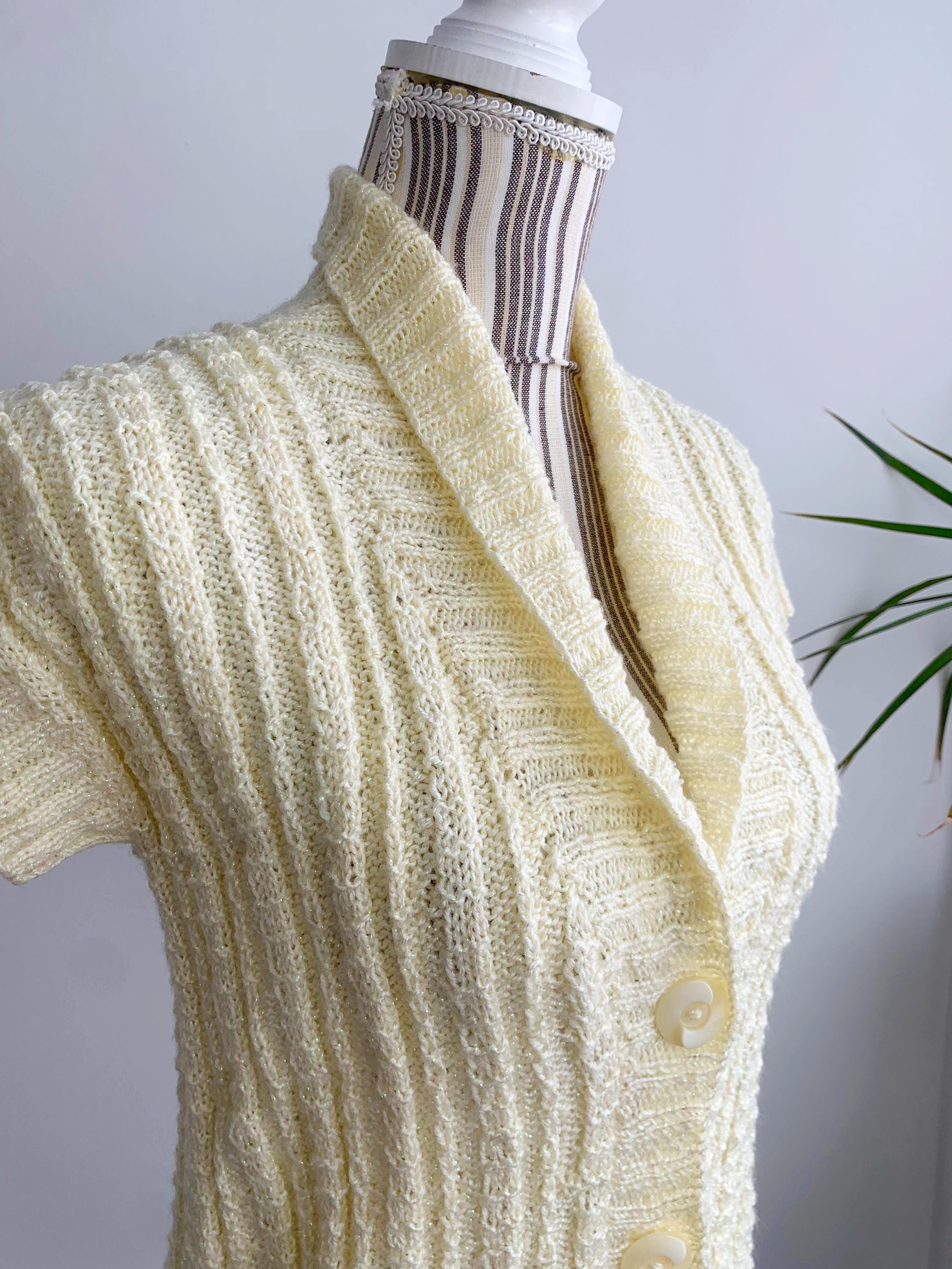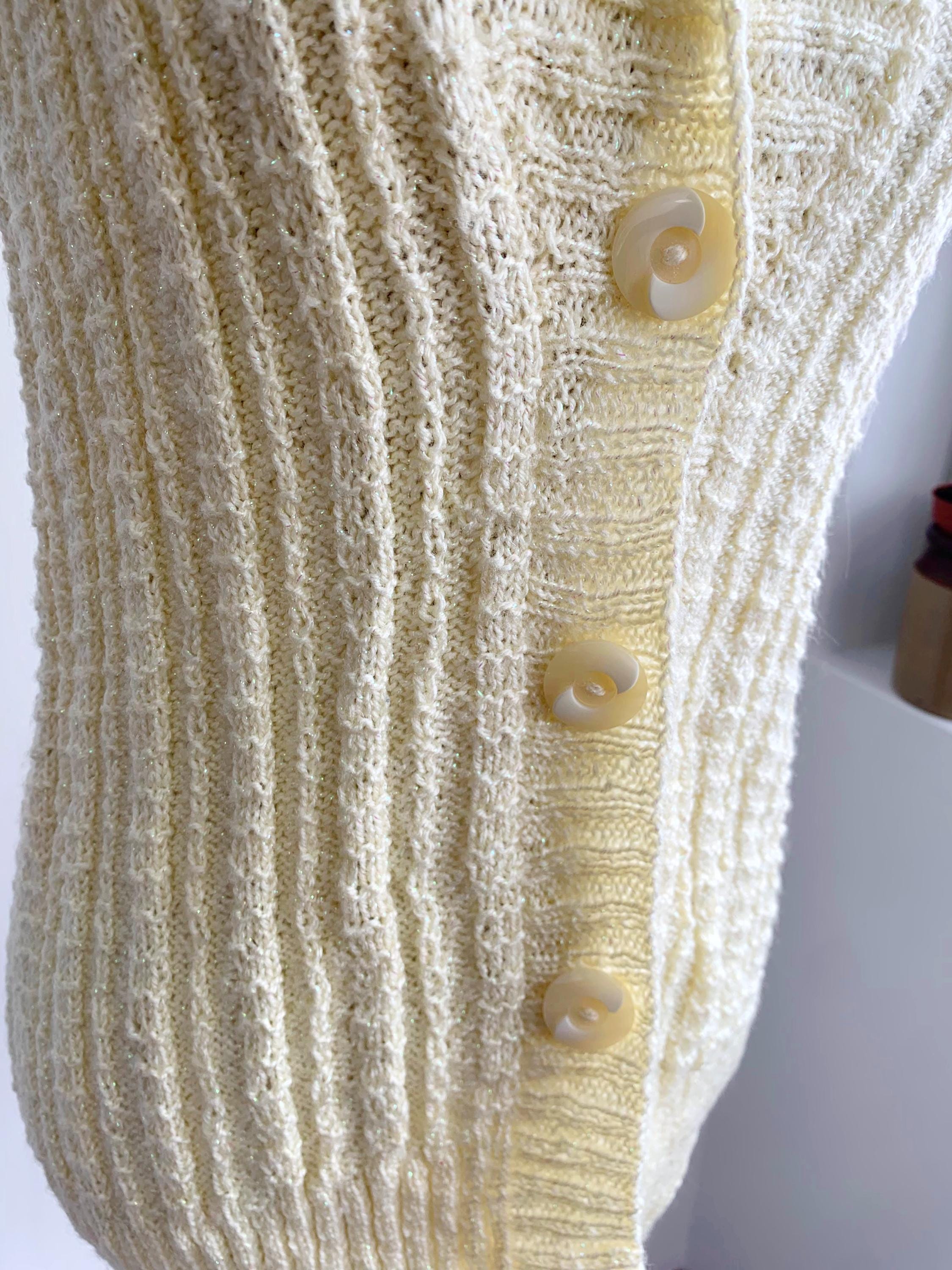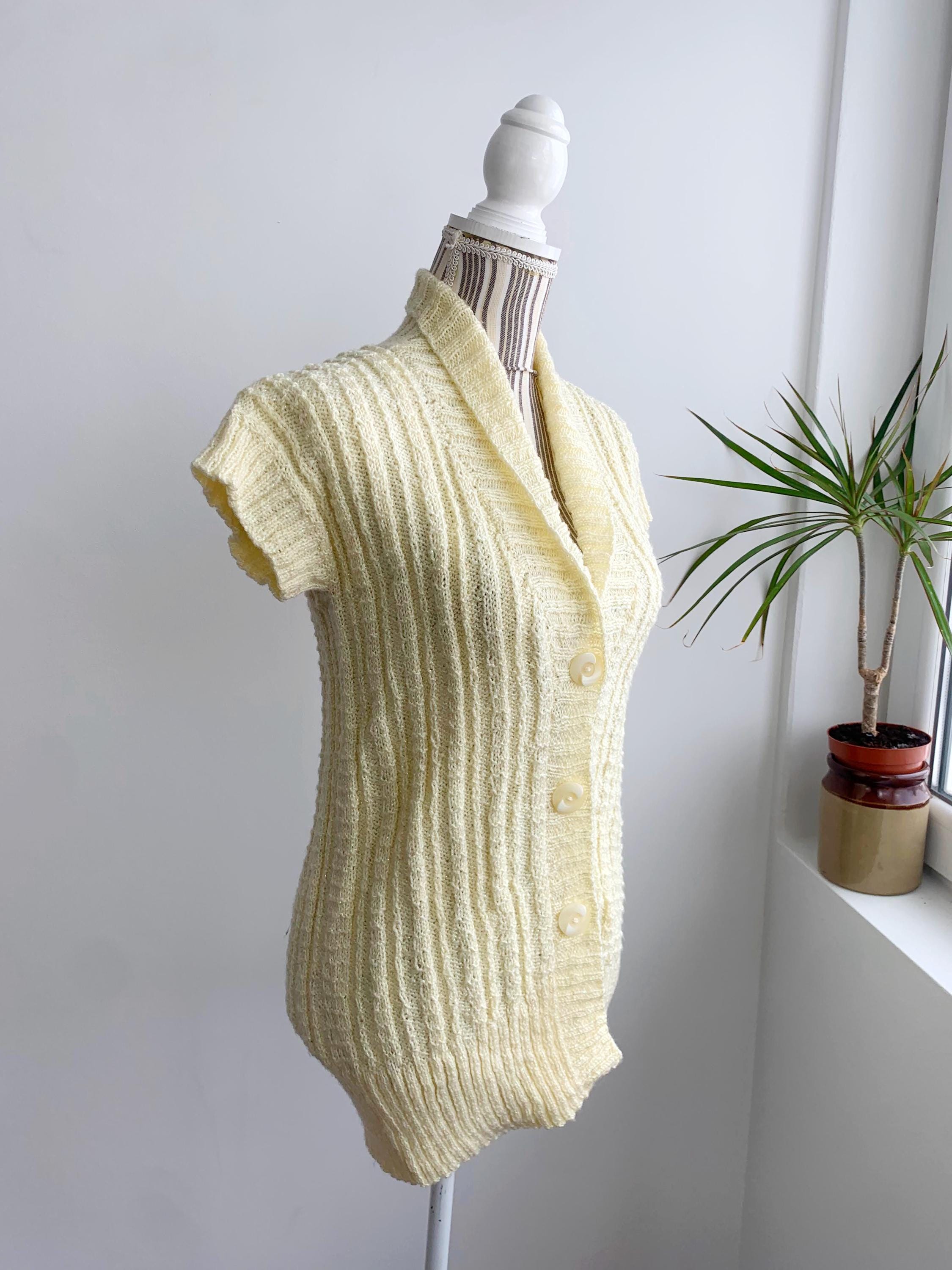 This is a beautiful vintage 90s handmade knitted sweater vest in pale yellow color with metallic glitter lame and cute buttons. This 70s style wool knit boho vest is made of warm acrylic wool yarn which has a nice stretch. This granny wool cardigan will go amazing with anything you put on. Adorable retro vest that will add a pop of 70s style boho chic look to your outfits. It has button front closure with matching color buttons, V shaped neckline with collar and short sleeves. This short sleeve cardigan was handmade. It has no tag or label to show the materials or the size. It fits like S/M. Please check the measurements below.