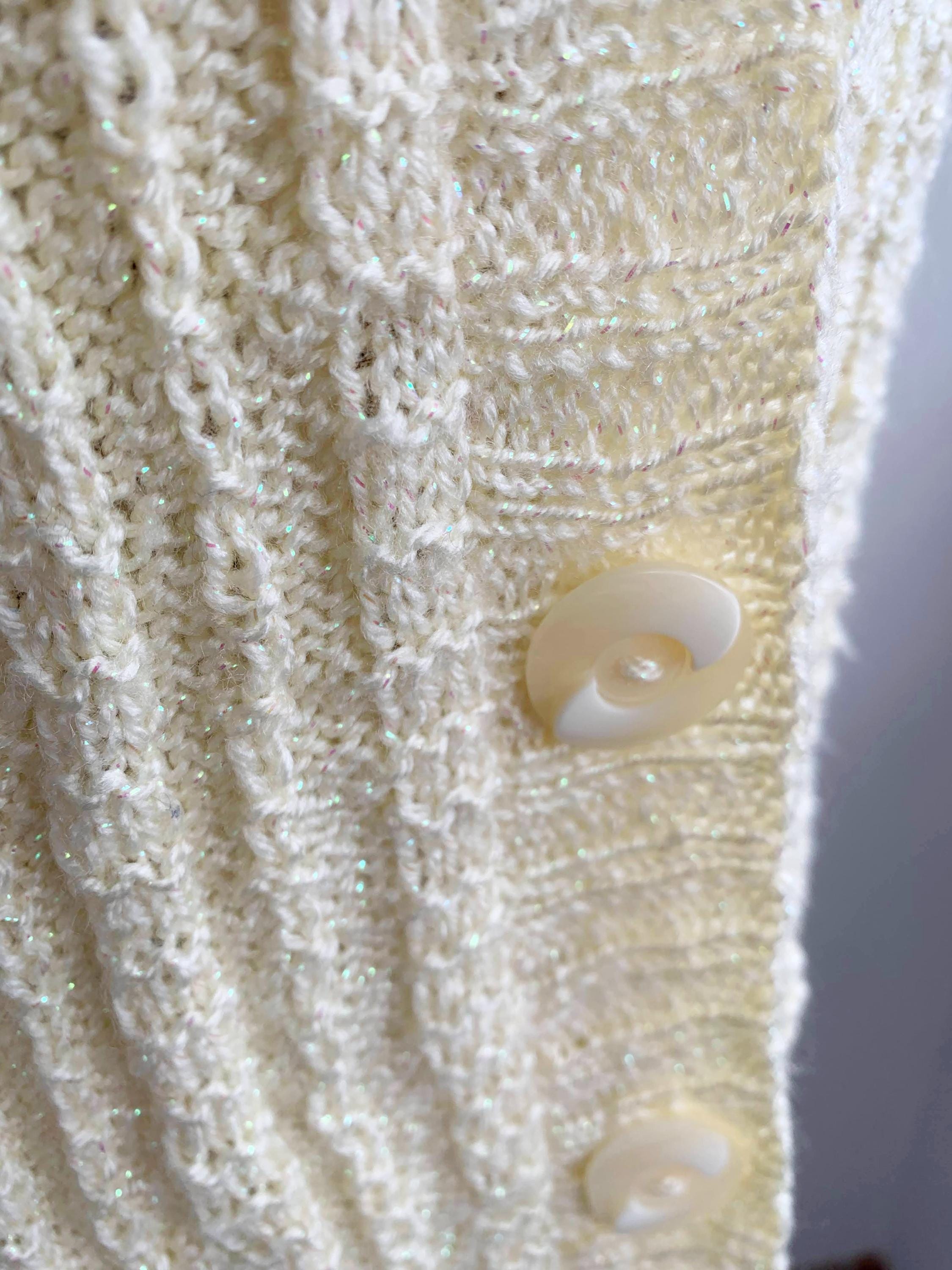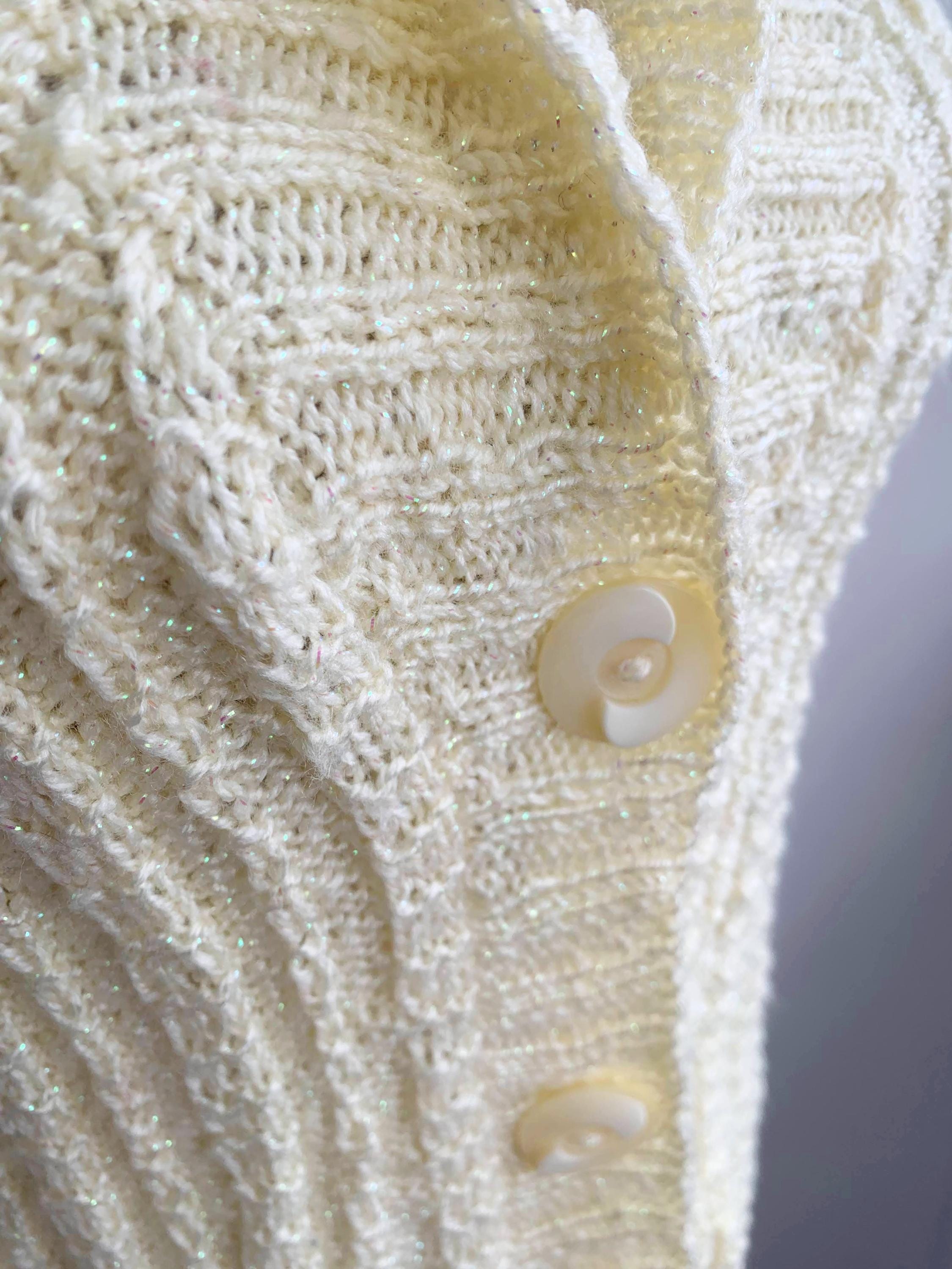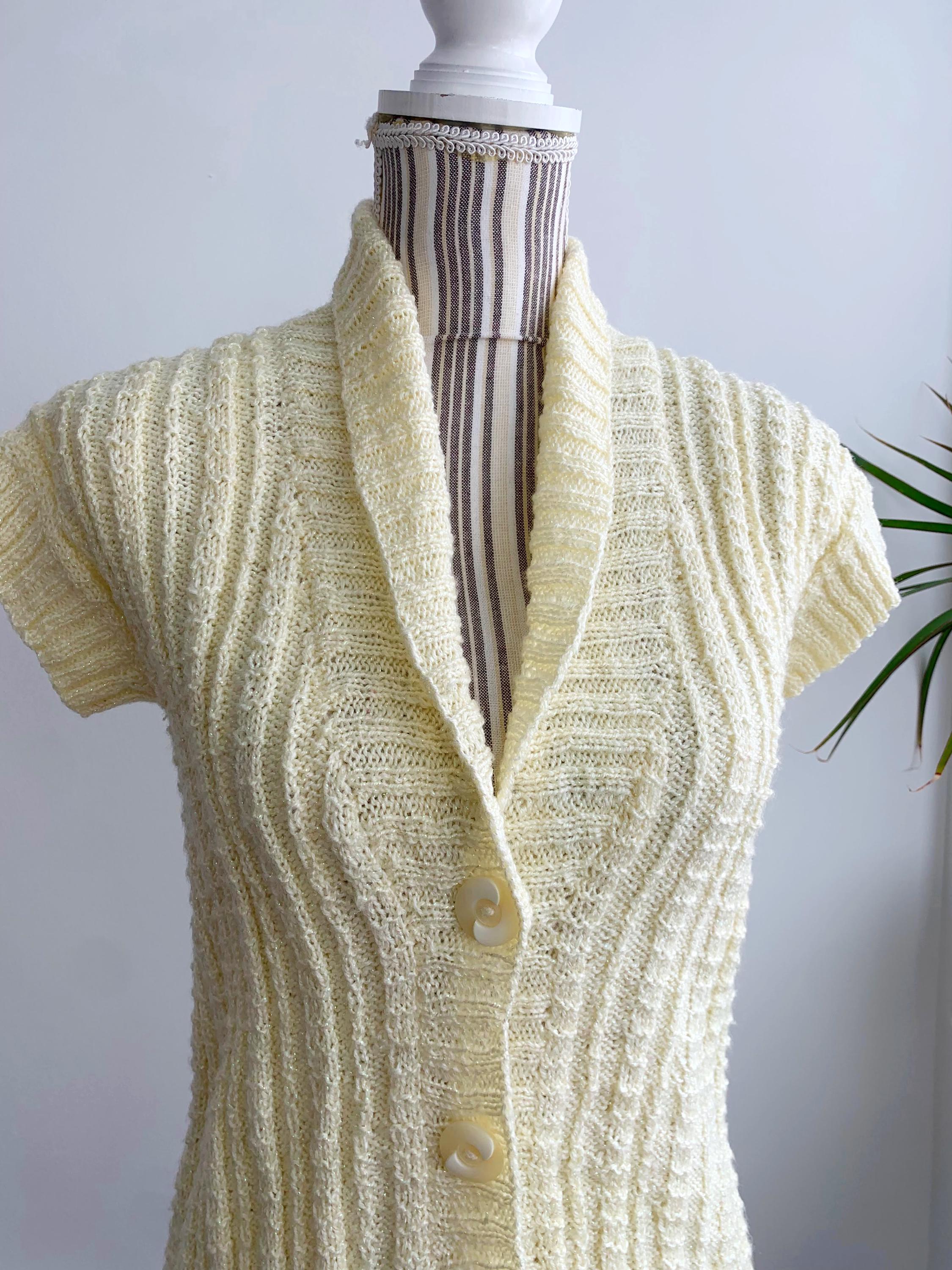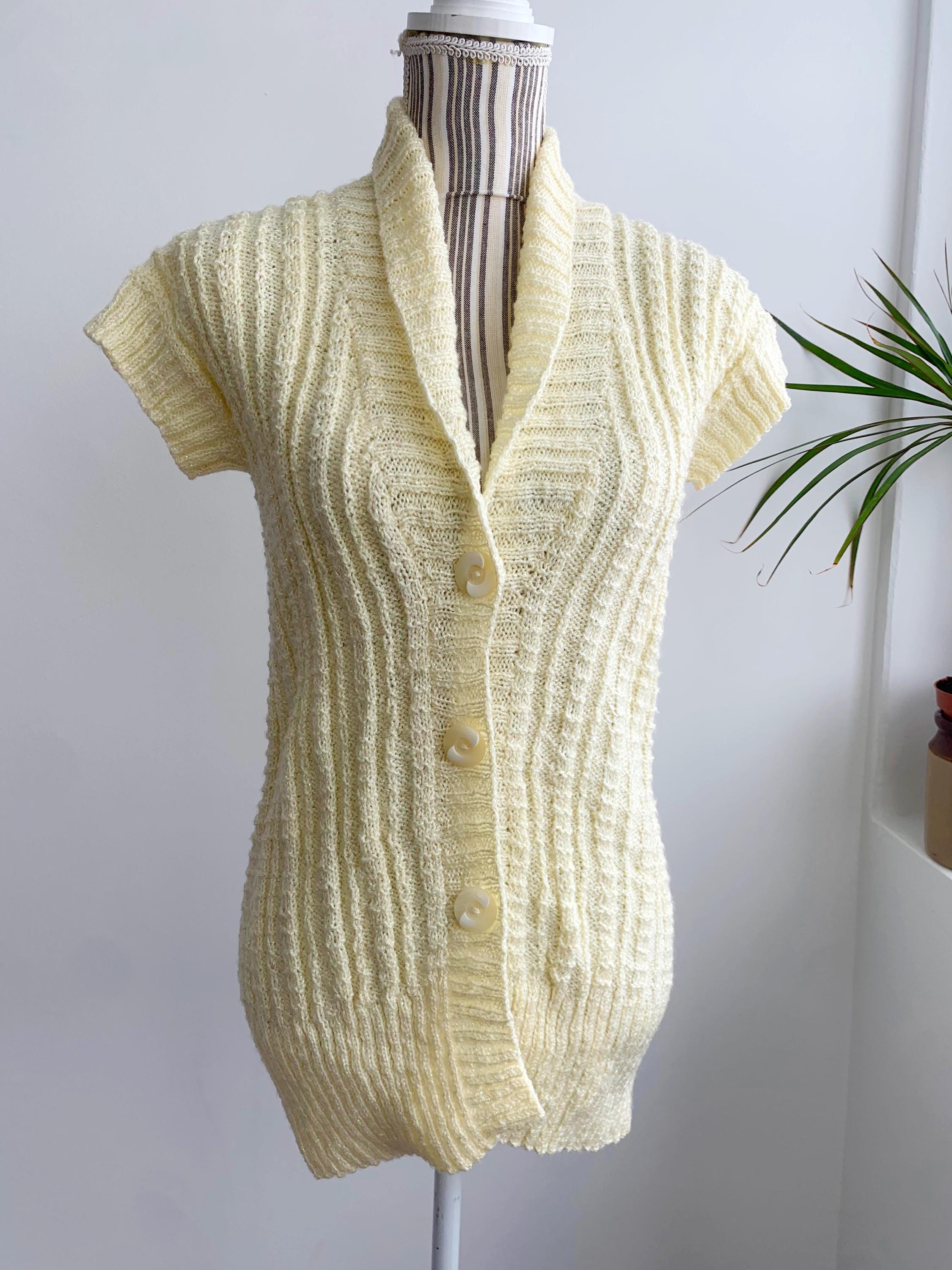 This is a beautiful vintage 90s handmade knitted sweater vest in pale yellow color with metallic glitter lame and cute buttons. This 70s style wool knit boho vest is made of warm acrylic wool yarn which has a nice stretch. This granny wool cardigan will go amazing with anything you put on. Adorable retro vest that will add a pop of 70s style boho chic look to your outfits. It has button front closure with matching color buttons, V shaped neckline with collar and short sleeves. This short sleeve cardigan was handmade. It has no tag or label to show the materials or the size. It fits like S/M. Please check the measurements below.