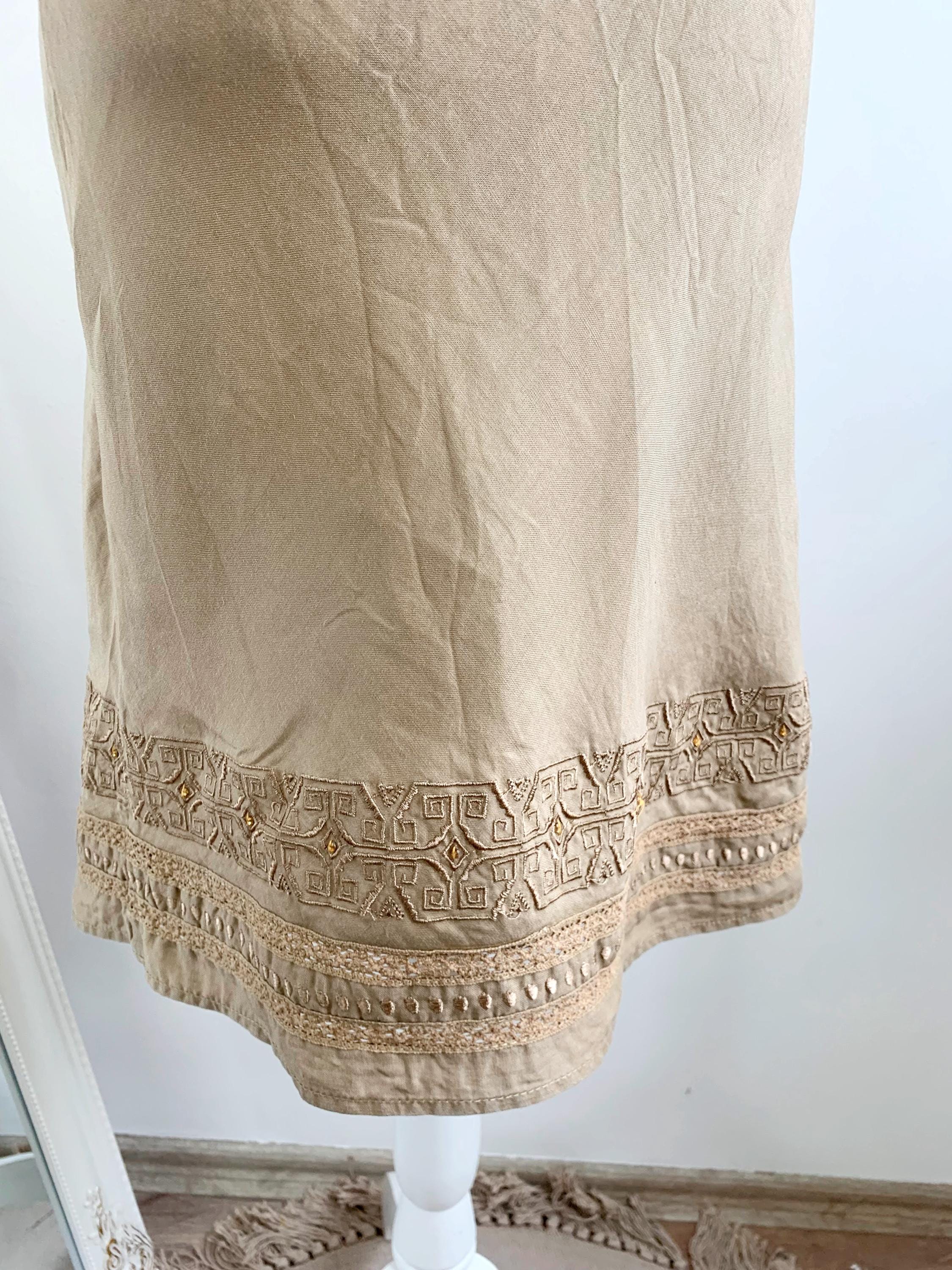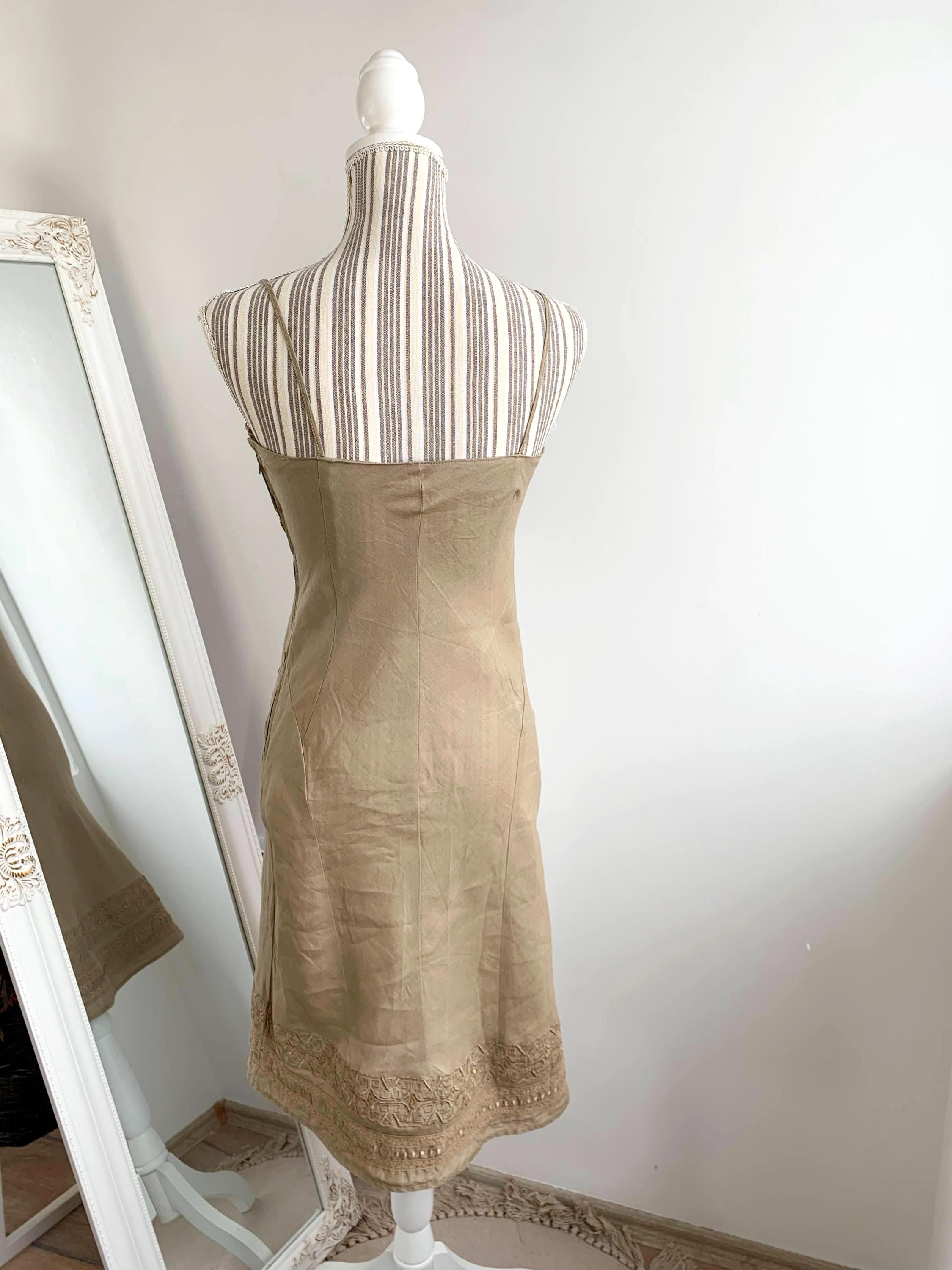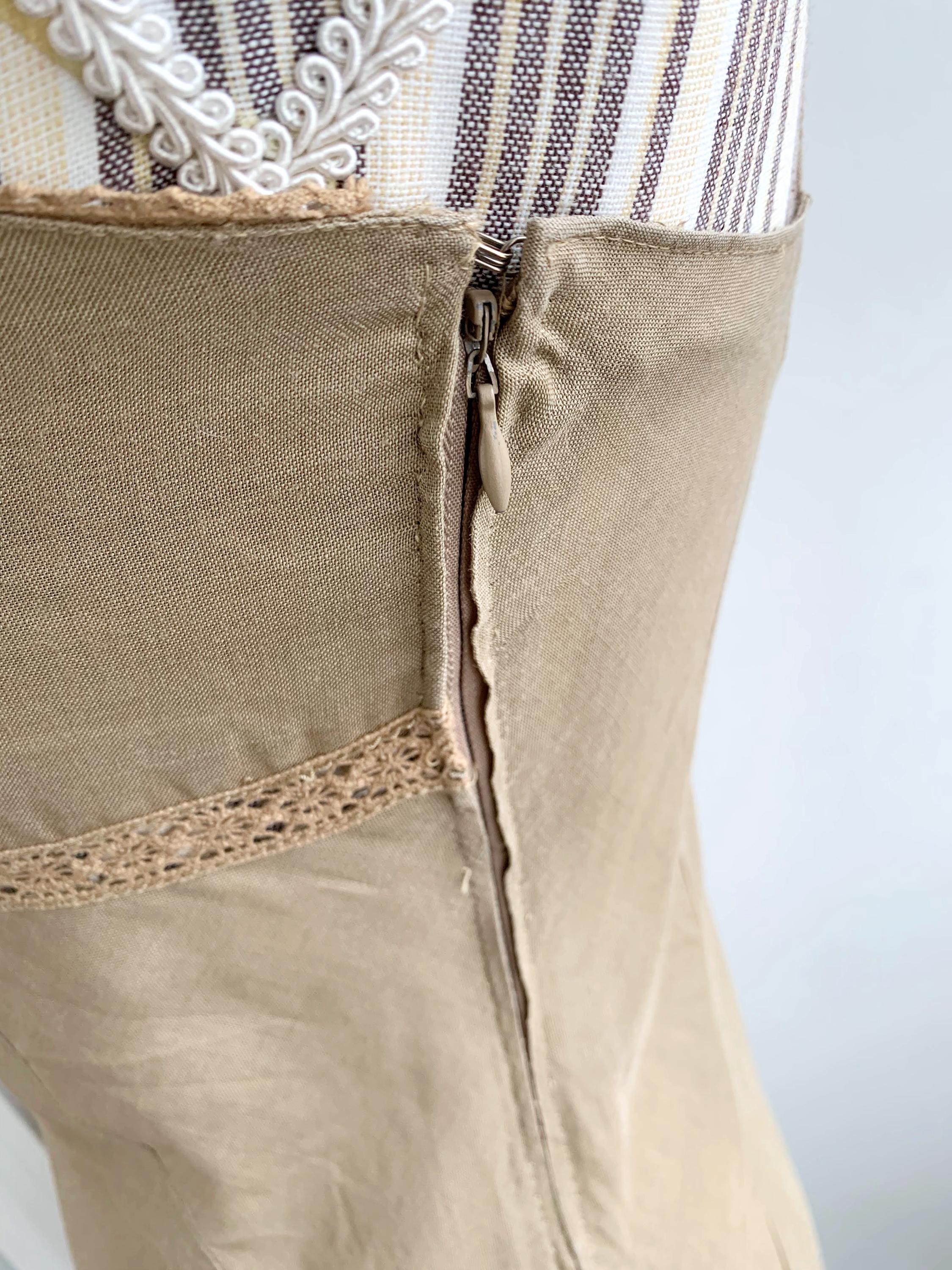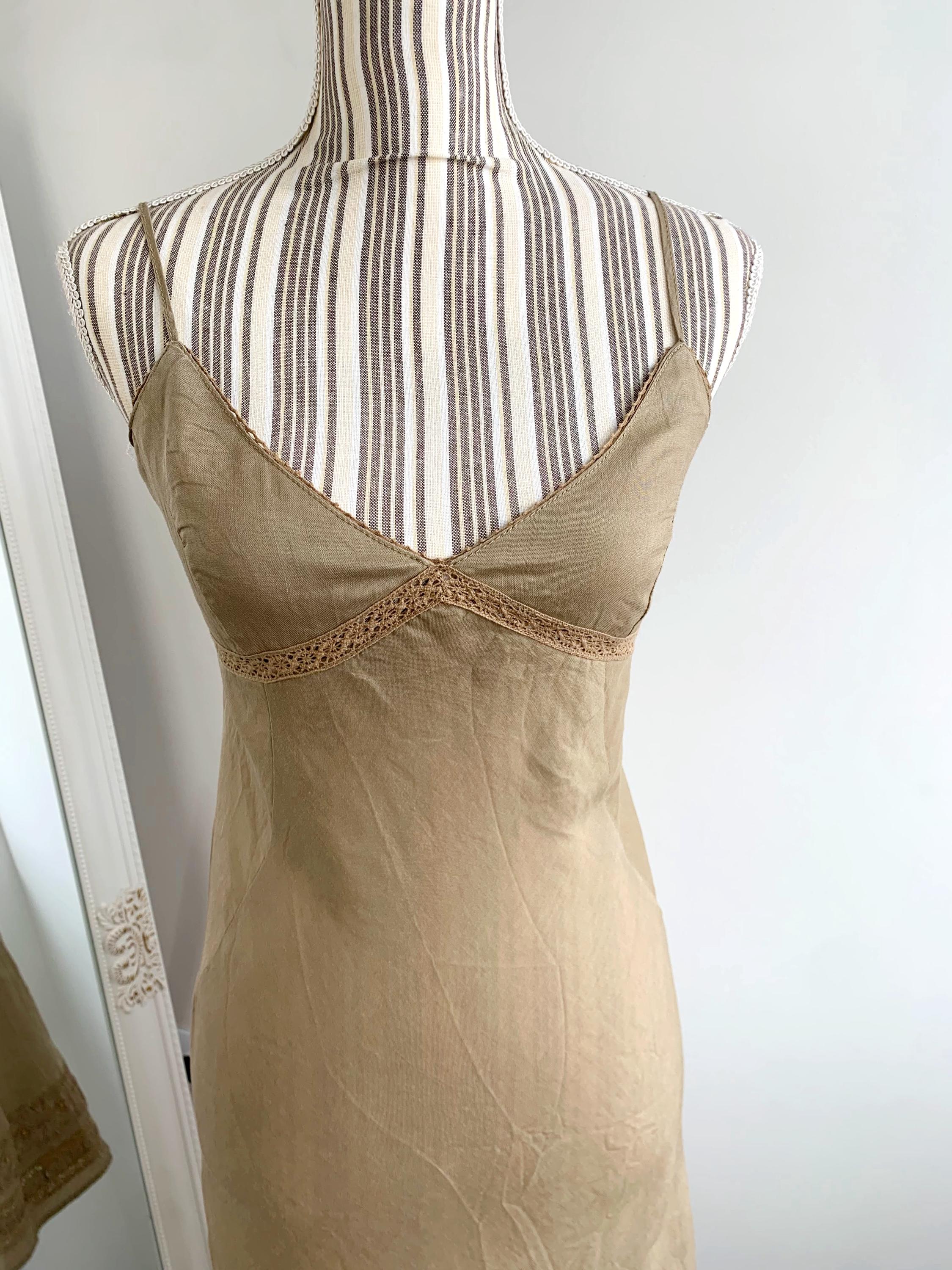 This is a vintage 90s cute and simple nude beige summer grunge dress made of 100% natural ramie fabric with spaghetti straps and side zip up closure. This simple summer day dress is size S, it fits like size XS and has no stretch. Please check the measurements below.