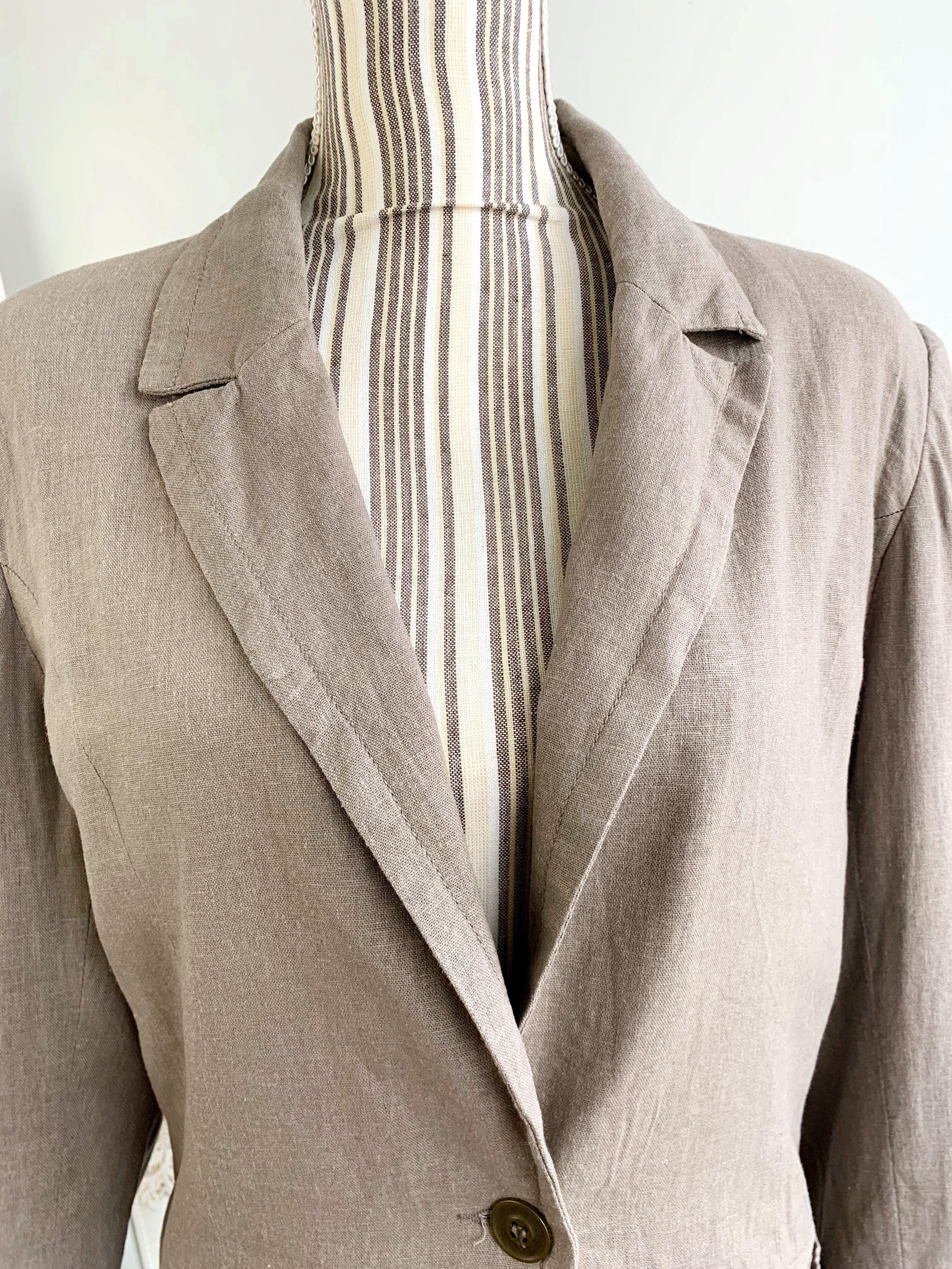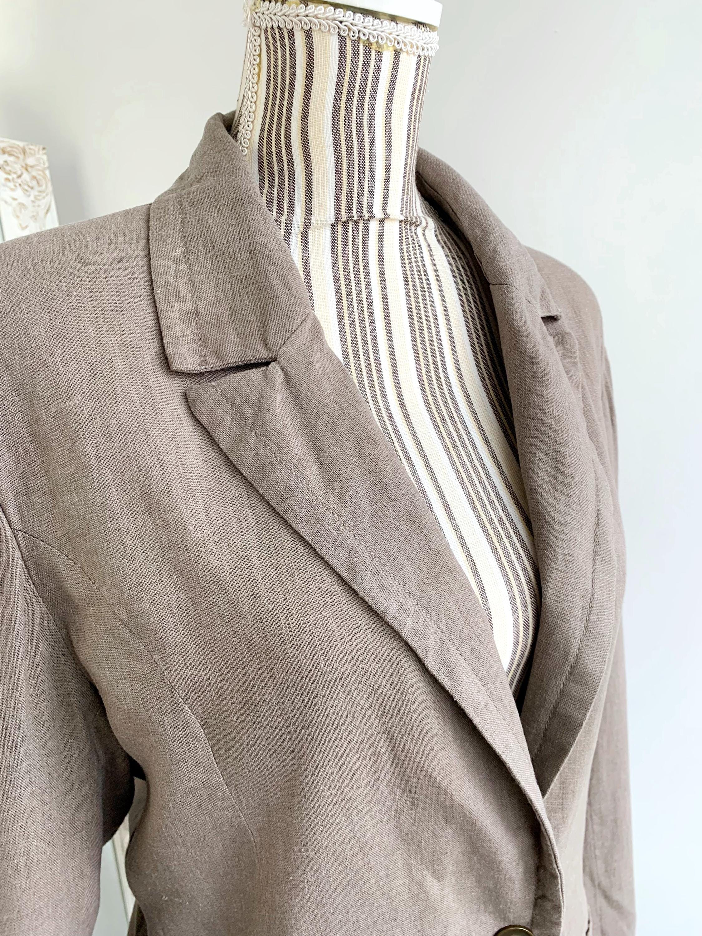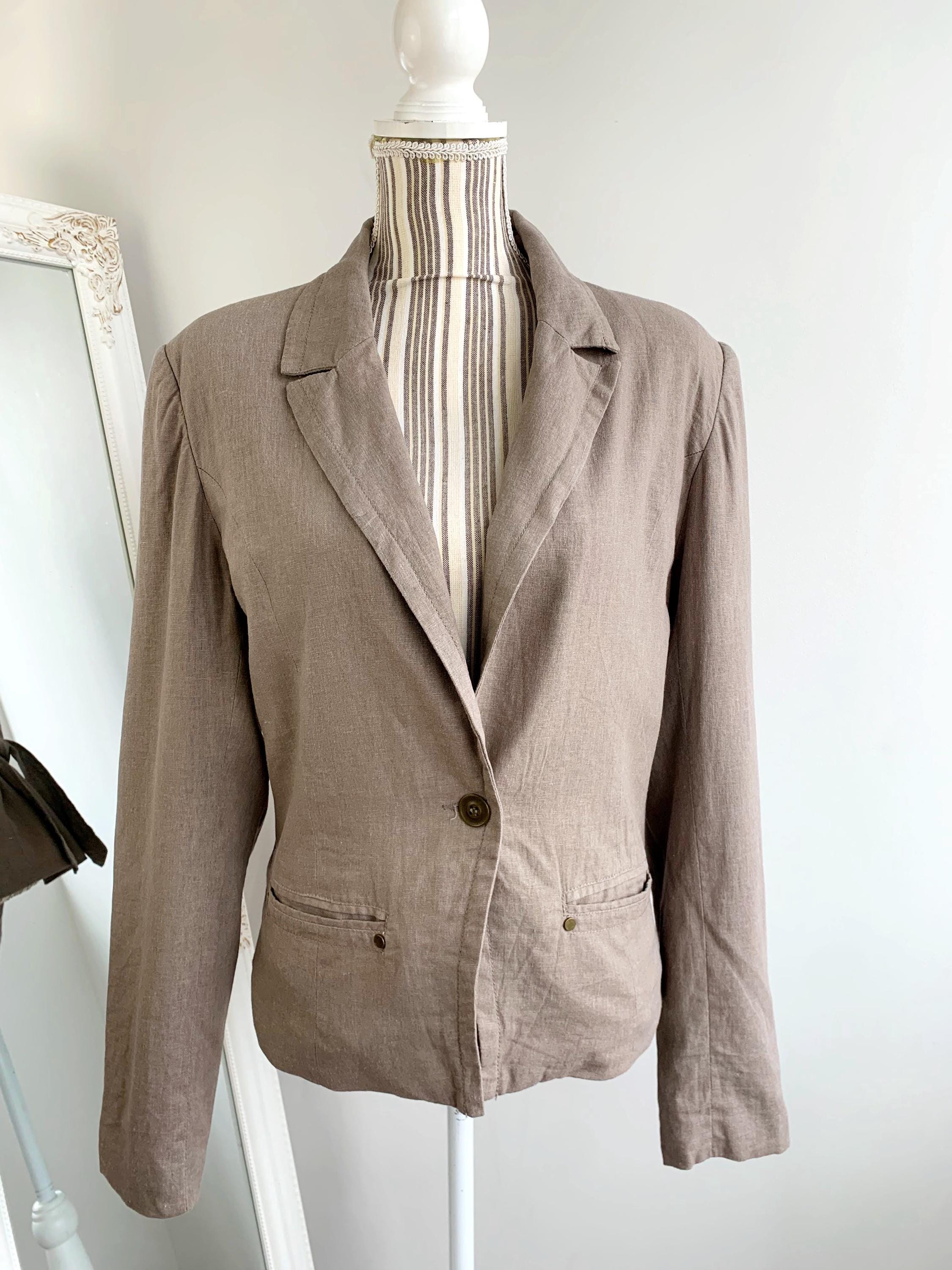 This is a beautiful vintage Y2K linen blazer for women with long sleeves, single button closure with deep v neck and tie back. This loose fit officewear linen coat is made of linen blend fabric, which consists of 55% linen and 45% viscose with 100% cotton lining. This spring linen coat is in oatmeal taupe color. It has two side pockets. Sustainable piece of linen clothing that you can enjoy. This linen blazer is by the brand Fransa, the size marked is 44 which fits like size L/ XL. Please check the measurements below