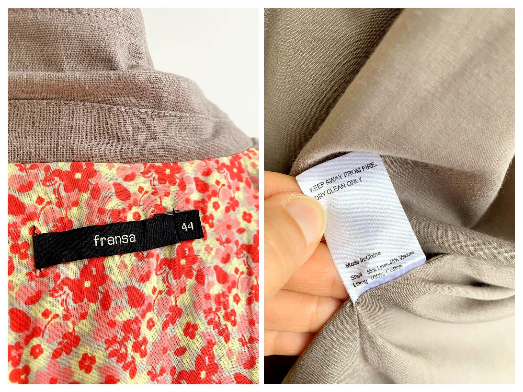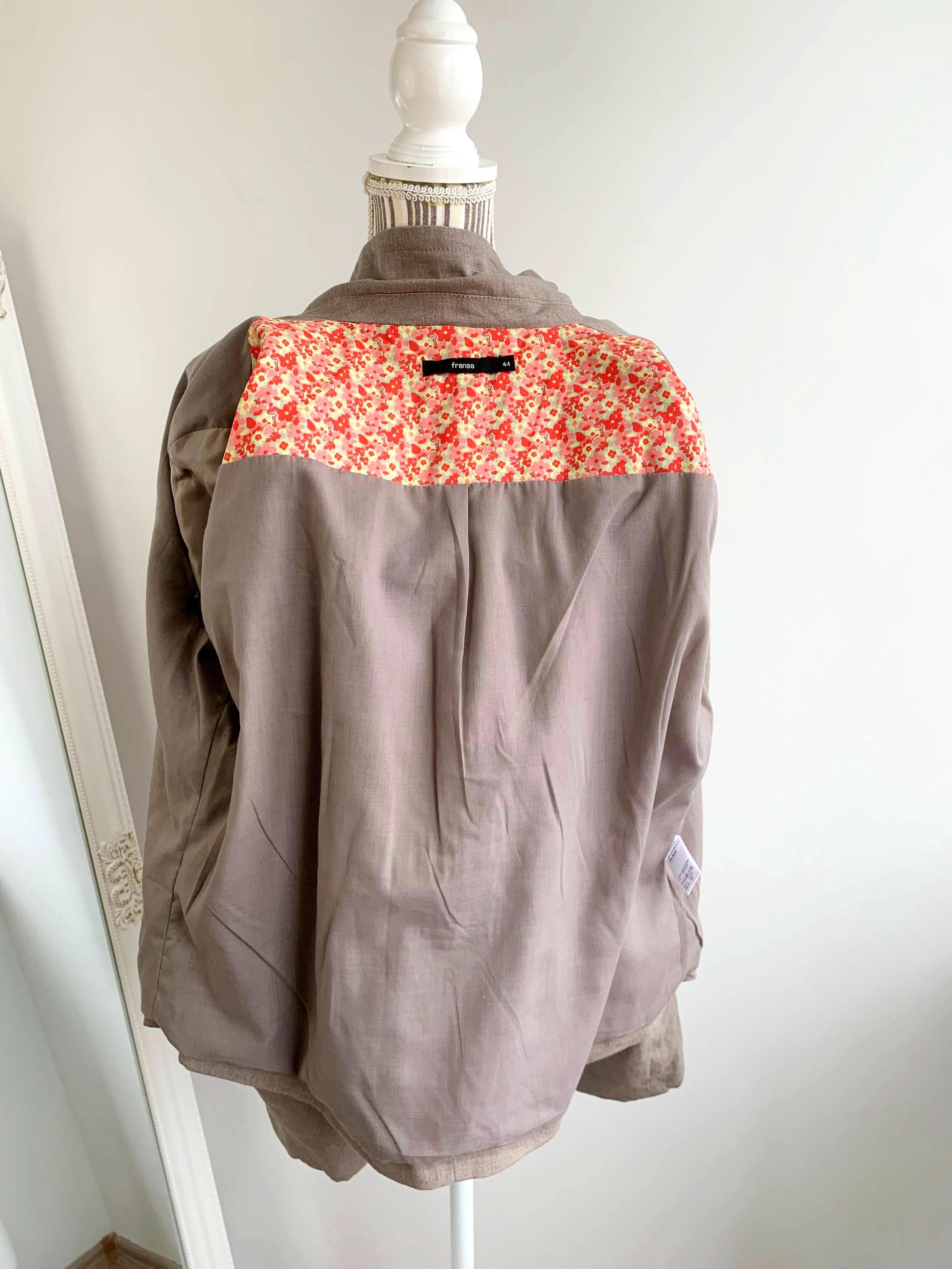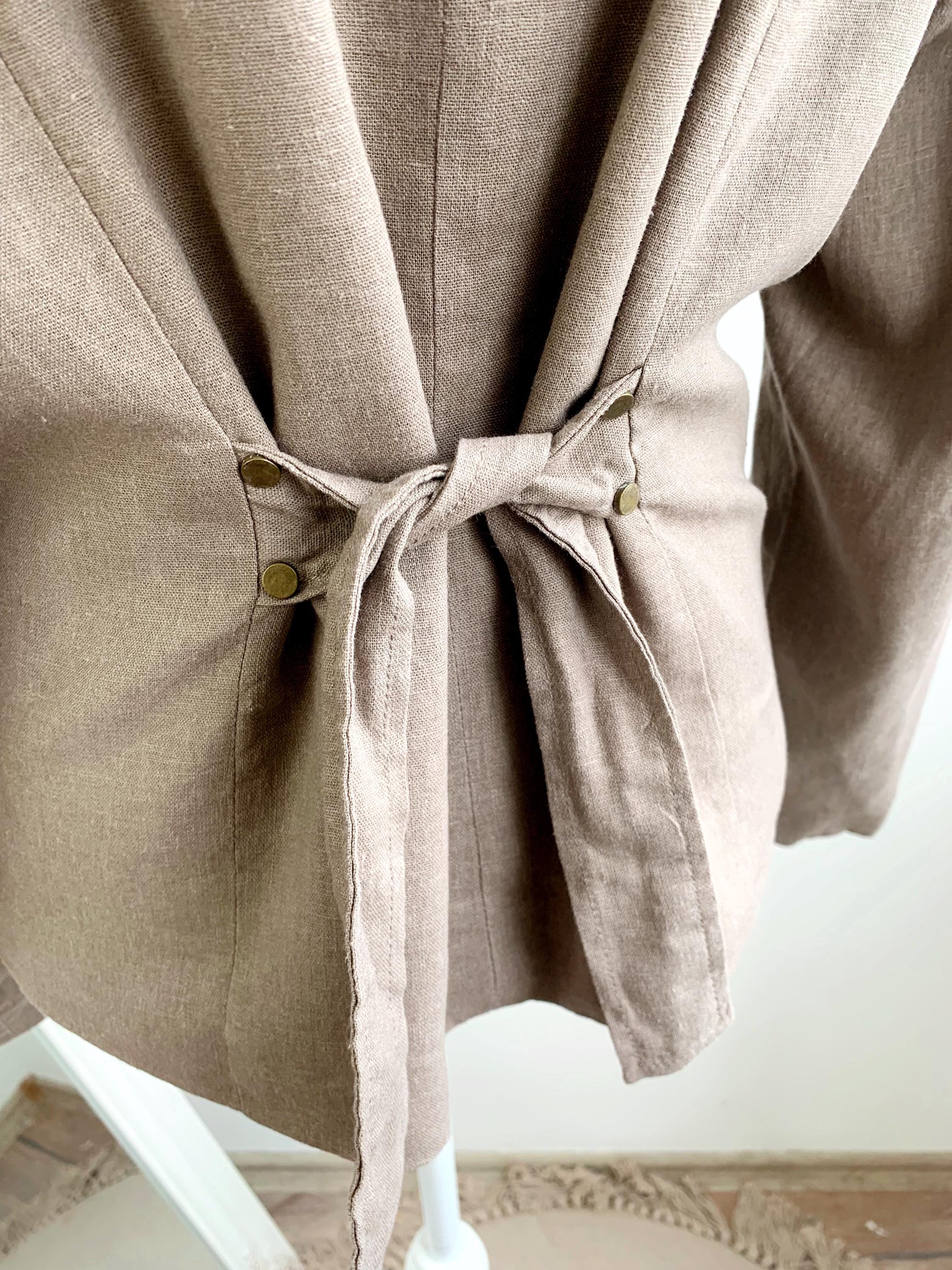 This is a beautiful vintage Y2K linen blazer for women with long sleeves, single button closure with deep v neck and tie back. This loose fit officewear linen coat is made of linen blend fabric, which consists of 55% linen and 45% viscose with 100% cotton lining. This spring linen coat is in oatmeal taupe color. It has two side pockets. Sustainable piece of linen clothing that you can enjoy. This linen blazer is by the brand Fransa, the size marked is 44 which fits like size L/ XL. Please check the measurements below