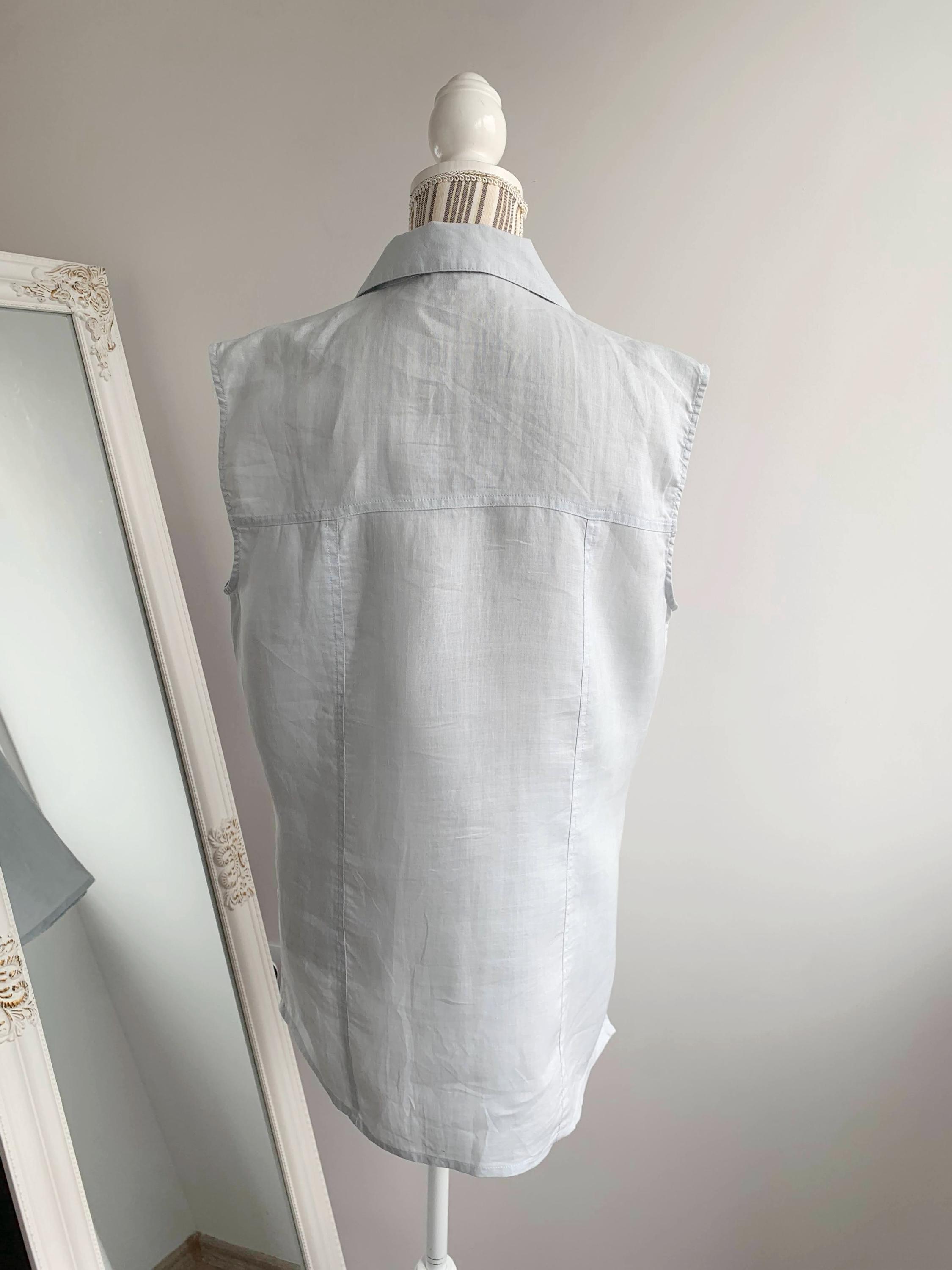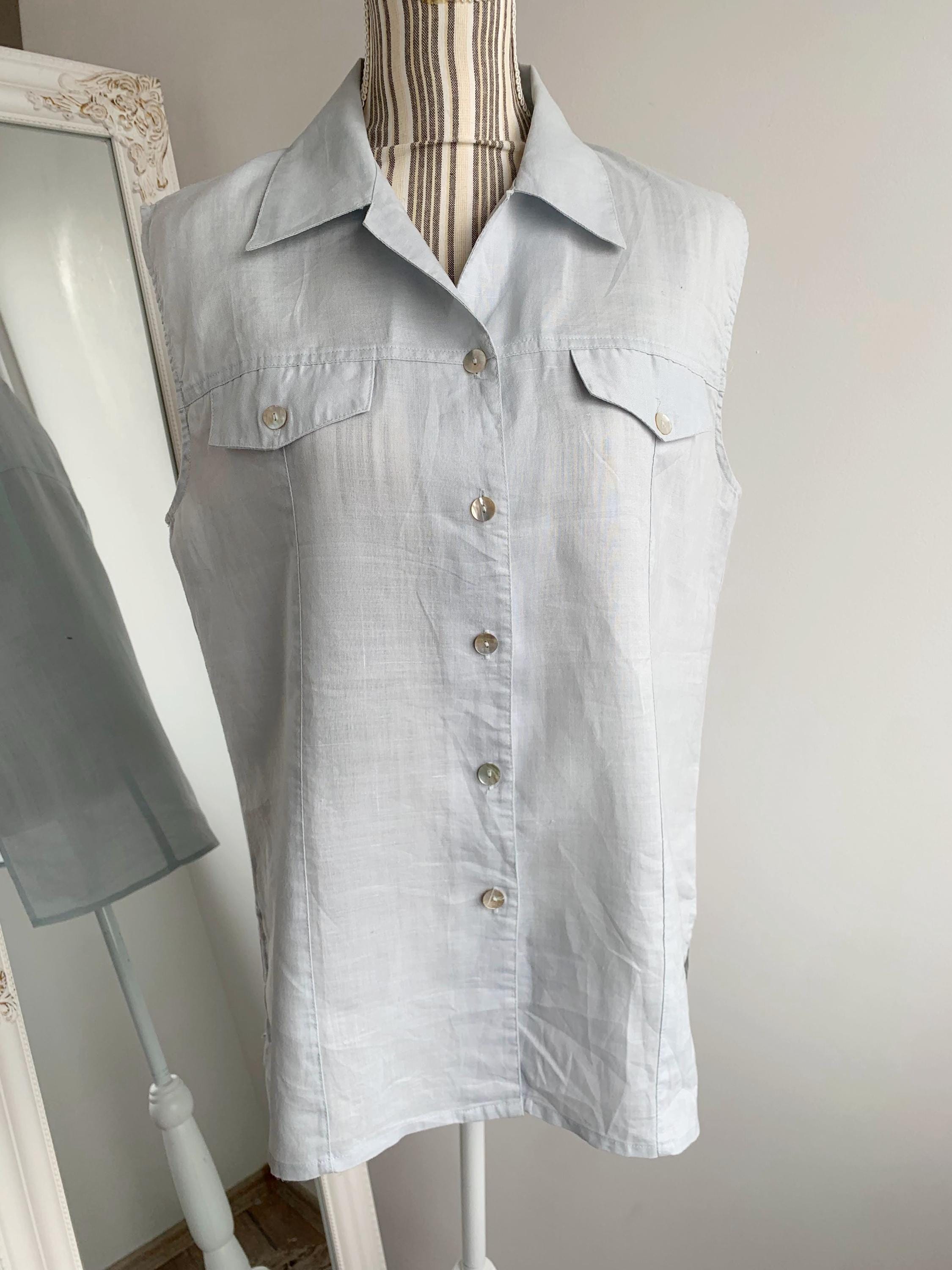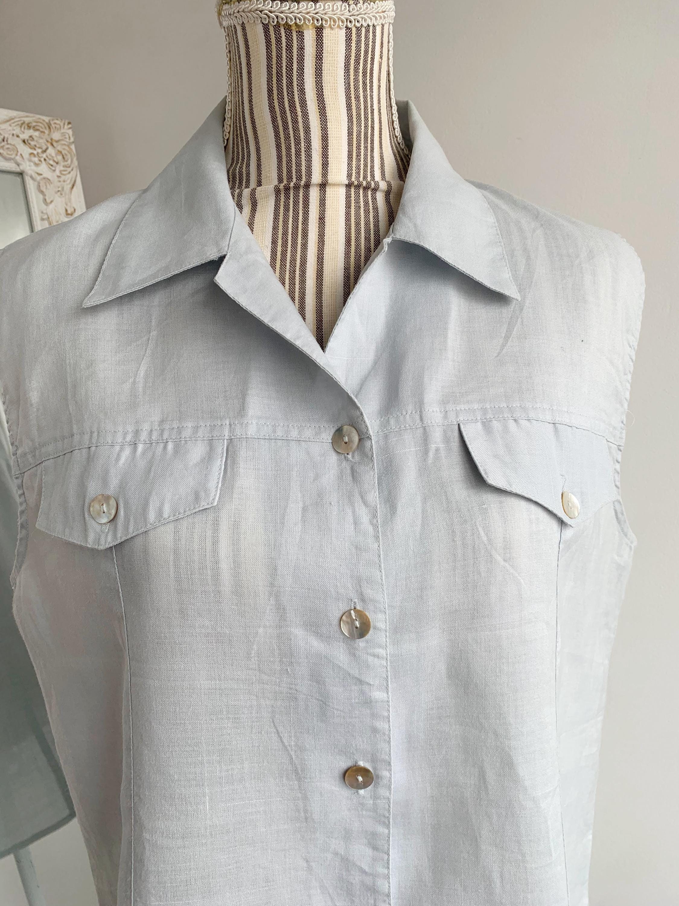This is a vintage 90s pure linen collared button front sleeveless shirt with imitation chest pockets and button front closure with mother of pearl buttons. This loose fit pure linen top is made of 100% natural linen fabric. This relaxed linen vest has a free boxy silhouette. Perfect sustainable piece of vintage linen clothing for your summer wardrobe.