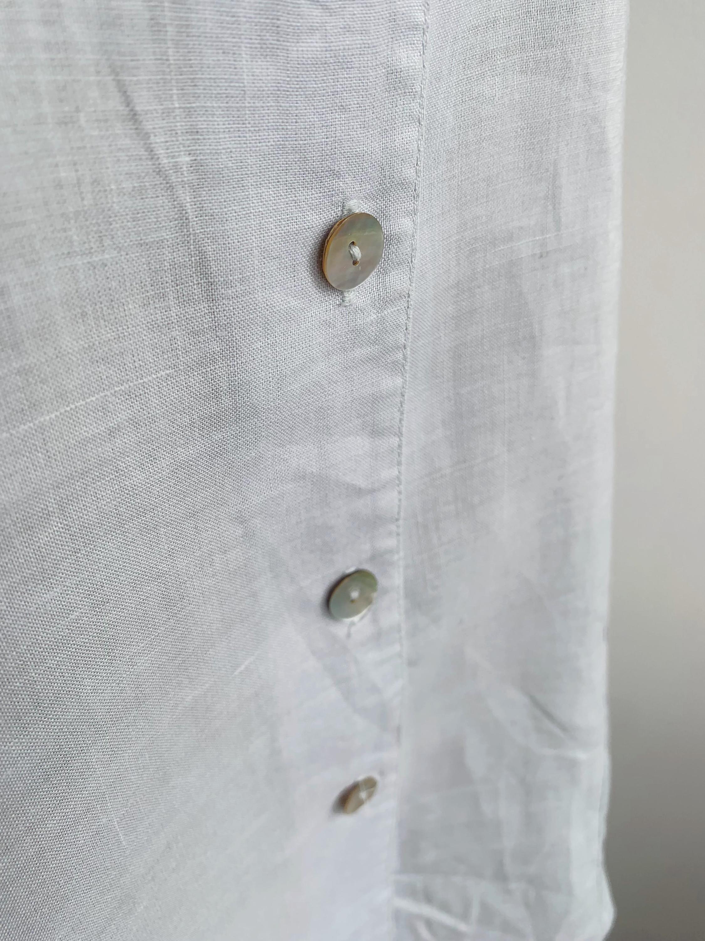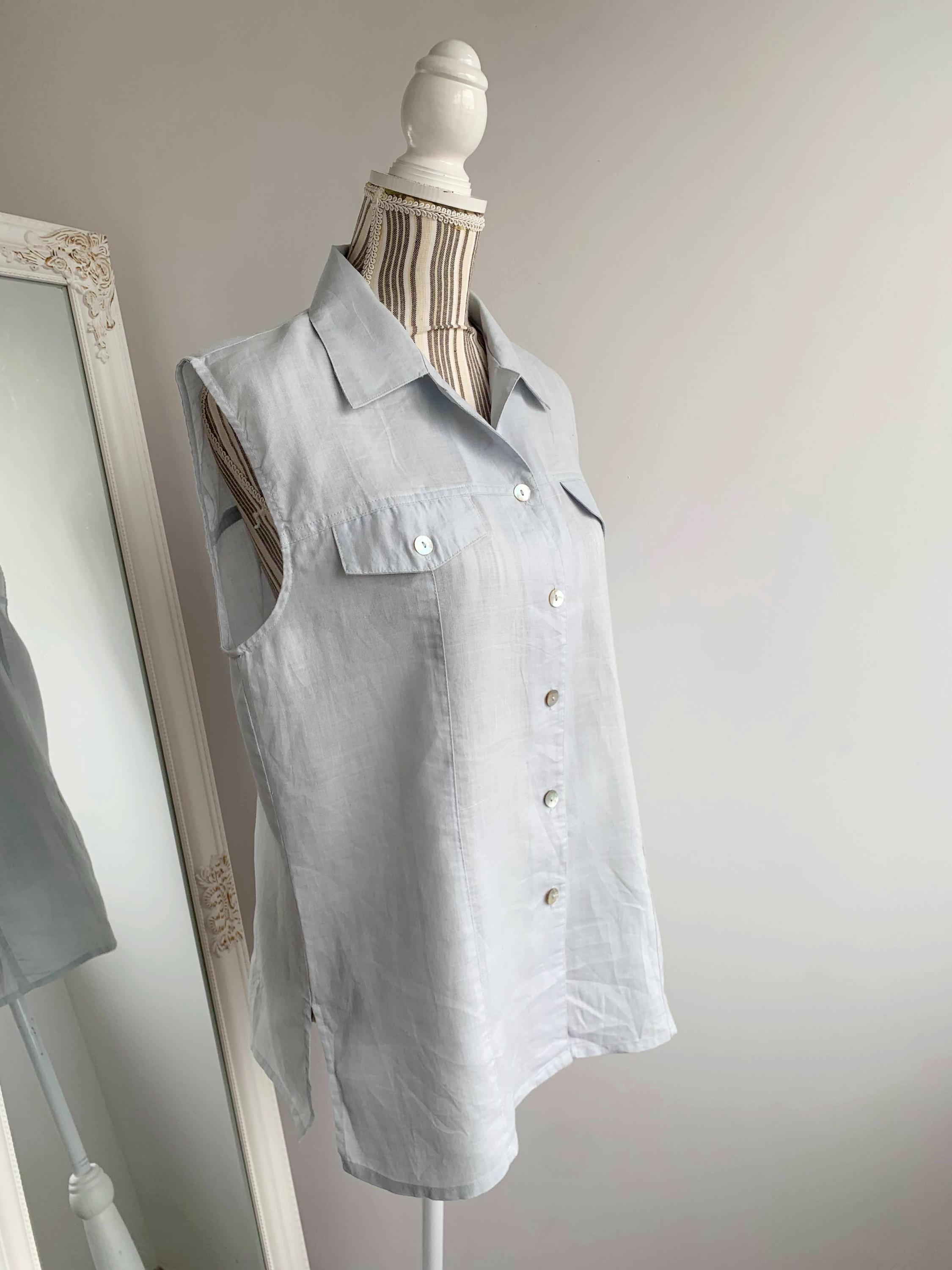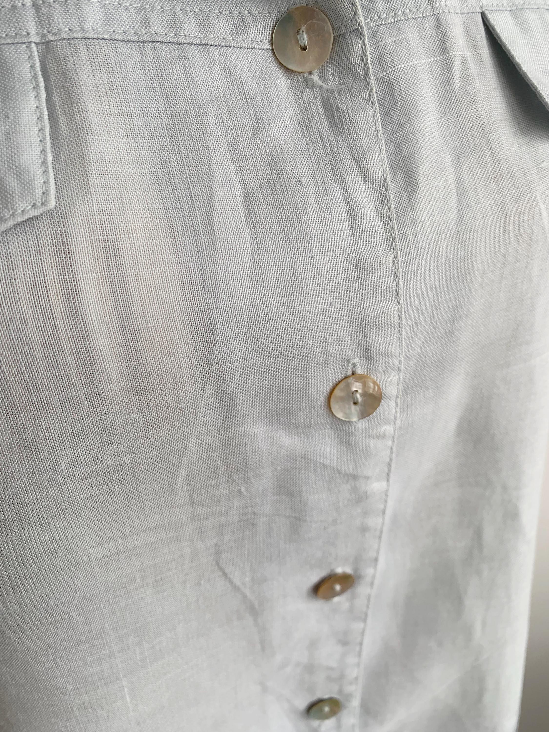 This is a vintage 90s pure linen collared button front sleeveless shirt with imitation chest pockets and button front closure with mother of pearl buttons. This loose fit pure linen top is made of 100% natural linen fabric. This relaxed linen vest has a free boxy silhouette. Perfect sustainable piece of vintage linen clothing for your summer wardrobe.