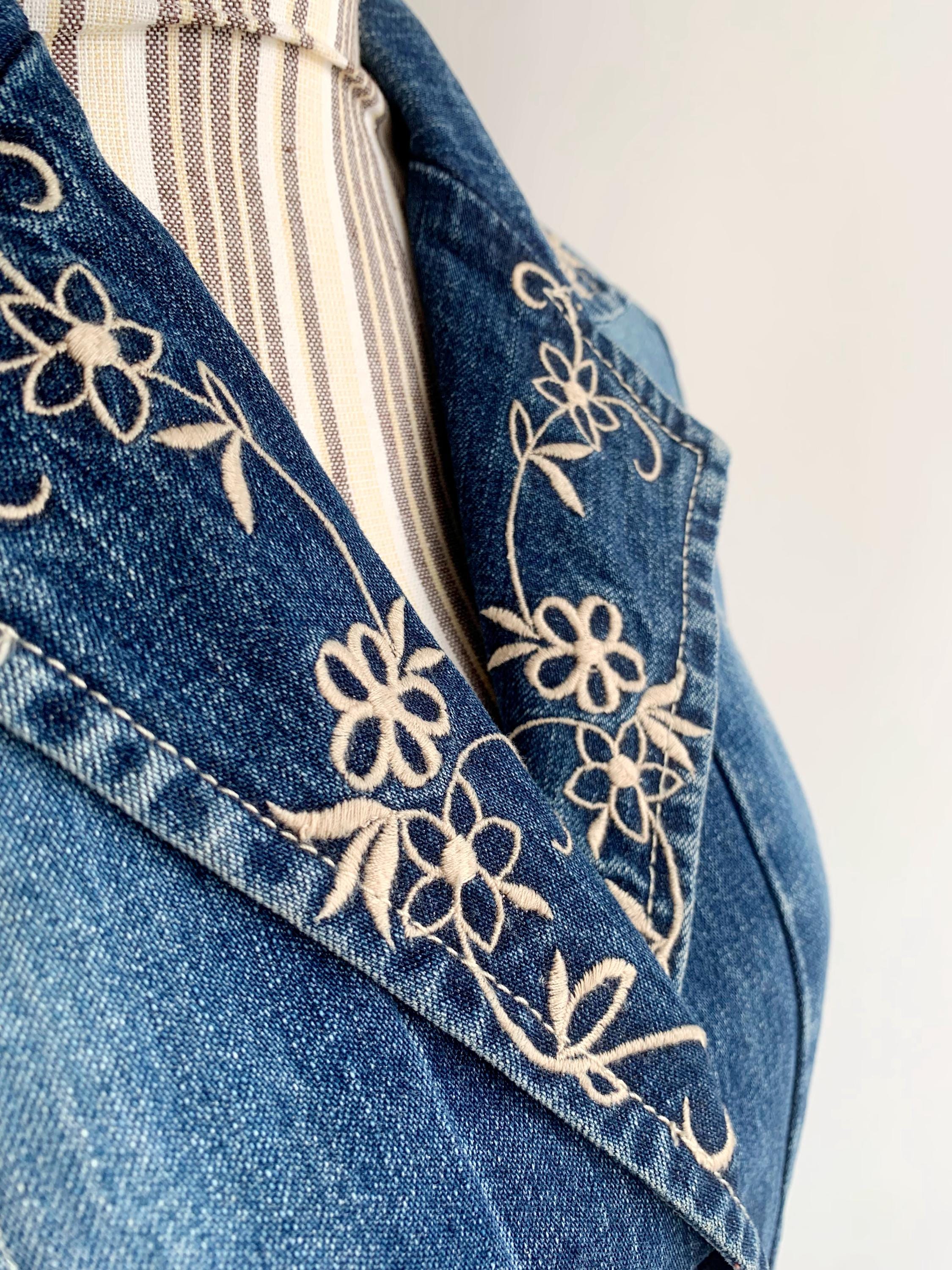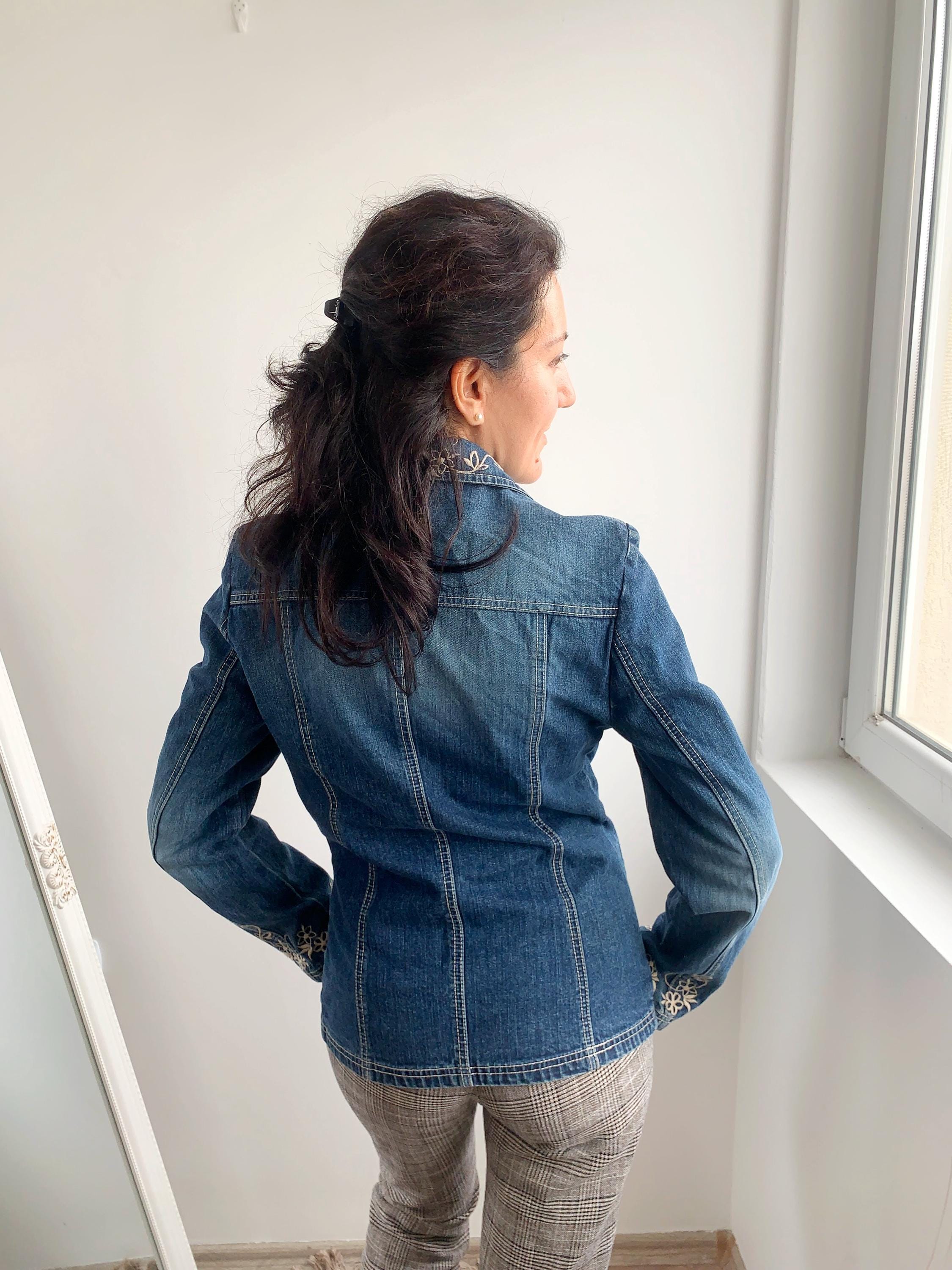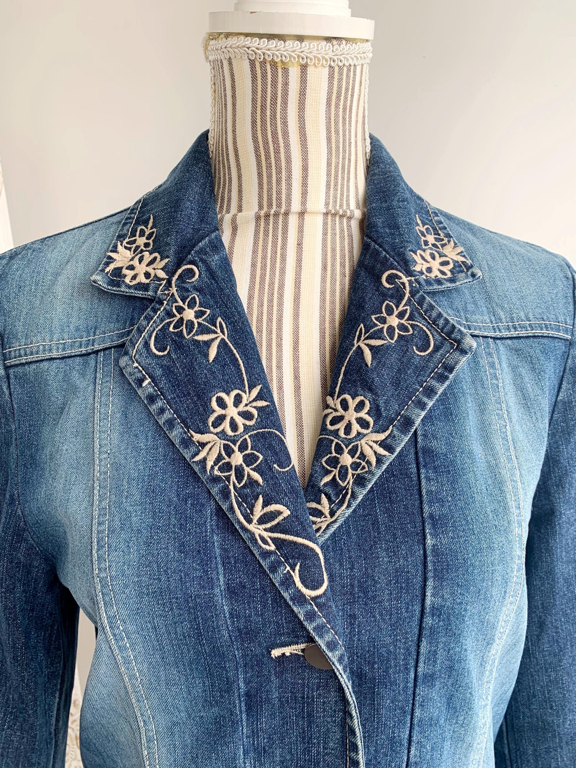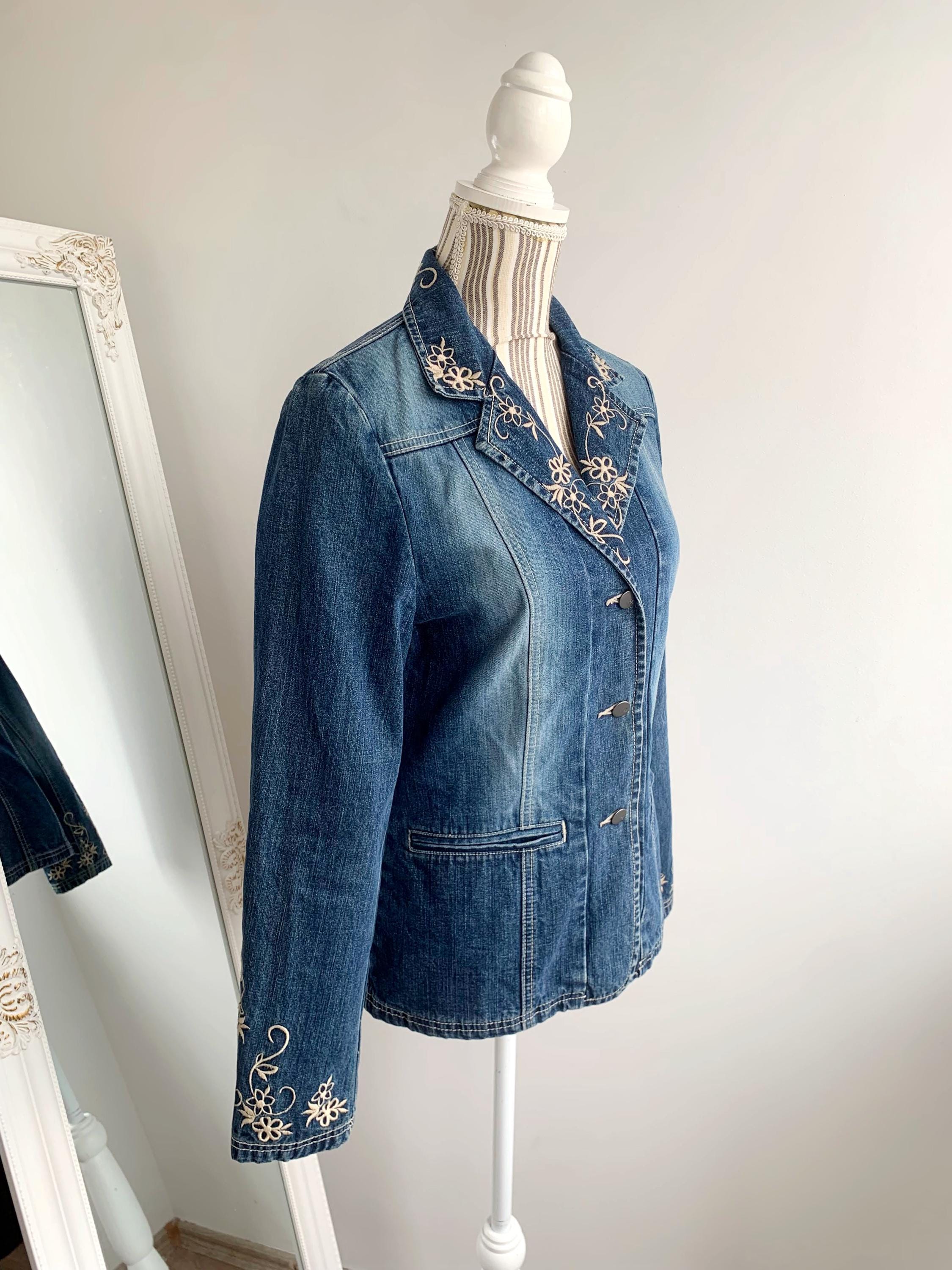 This is a beautiful vintage 90s embroidered denim blazer for women with long sleeves and button front closure size S. This western style blue jeans jacket has a fitted silhouette. It is made of 100% cotton denim fabric. This ladies cowboy western coat fits like size S. I am modelling the blazer and I wear size S / EUR 36 / US 6 / UK 10 / AUS 10 please check the measurements below.