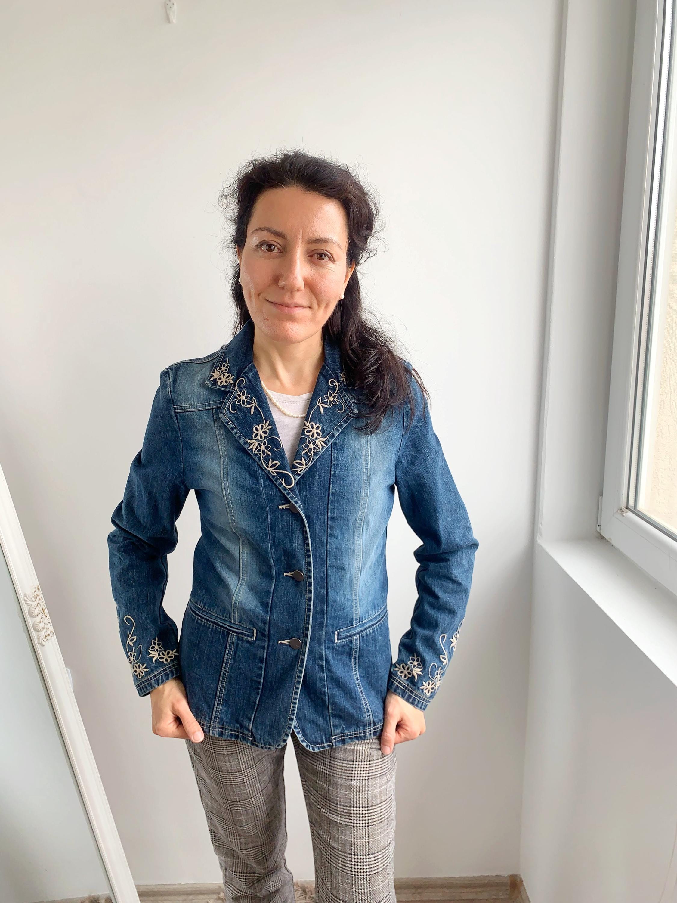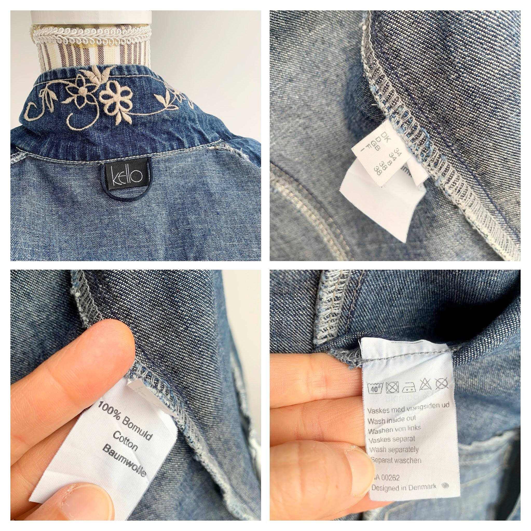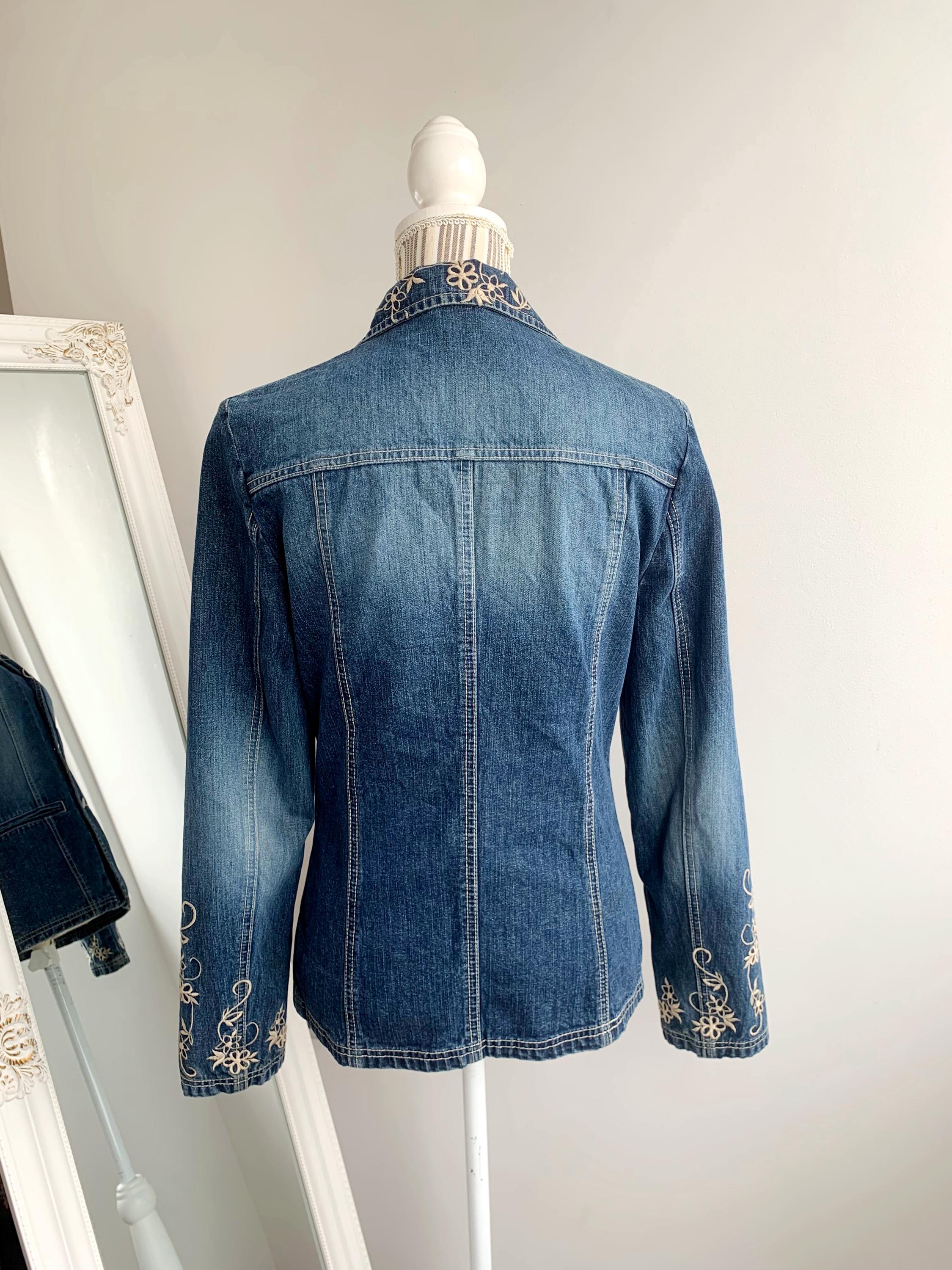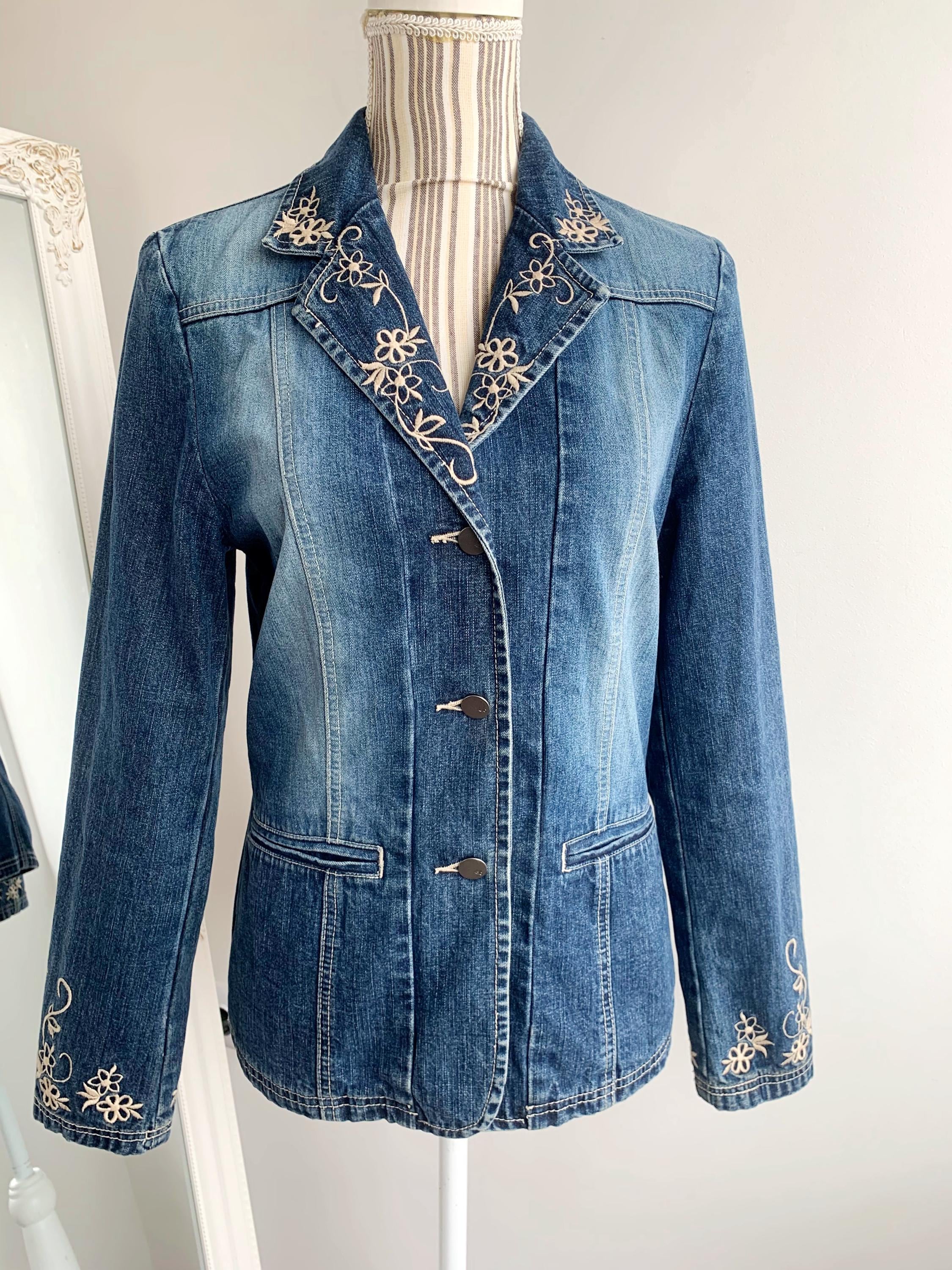 This is a beautiful vintage 90s embroidered denim blazer for women with long sleeves and button front closure size S. This western style blue jeans jacket has a fitted silhouette. It is made of 100% cotton denim fabric. This ladies cowboy western coat fits like size S. I am modelling the blazer and I wear size S / EUR 36 / US 6 / UK 10 / AUS 10 please check the measurements below.
