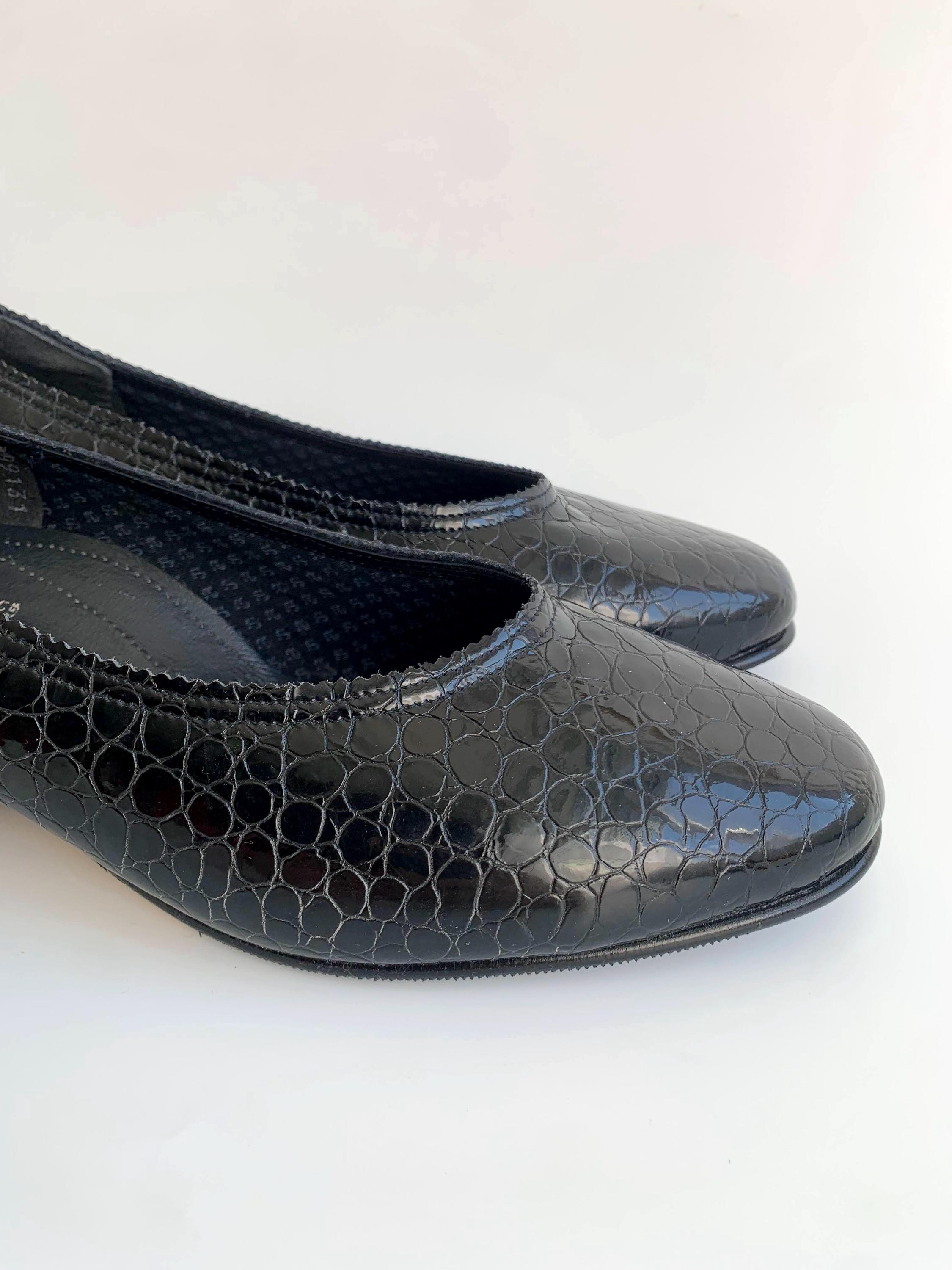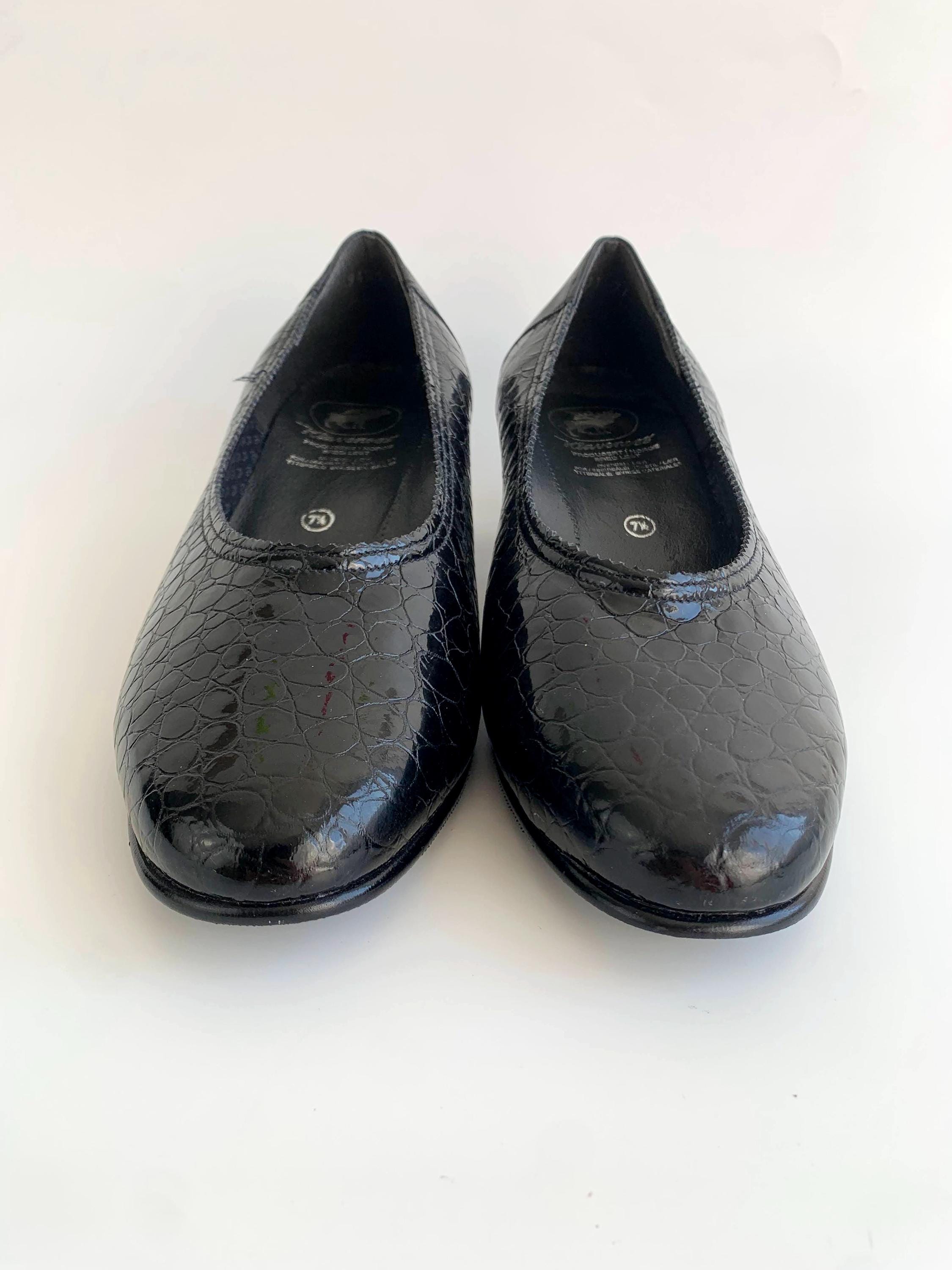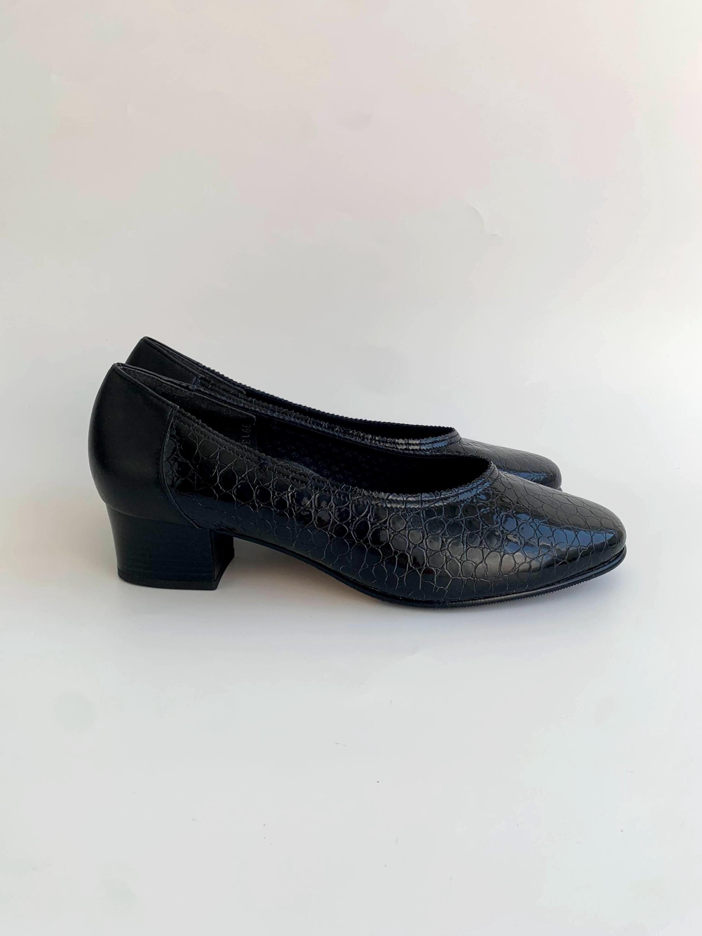 These are vintage 90s classic elegant black patent leather loafers for women with medium hight heels and mock crock pattern. These leather slip on shoes have chunky square heels and round toes. These classic office block heel loafers are made of genuine leather leather interior and rubber soles. They are super comfortable to walk in and your feet won't get tired at all. The size marked on these leather slip ons is UK 7 1/2, which fits like US 9 1/2 or EUR 41. Please check the measurements below.