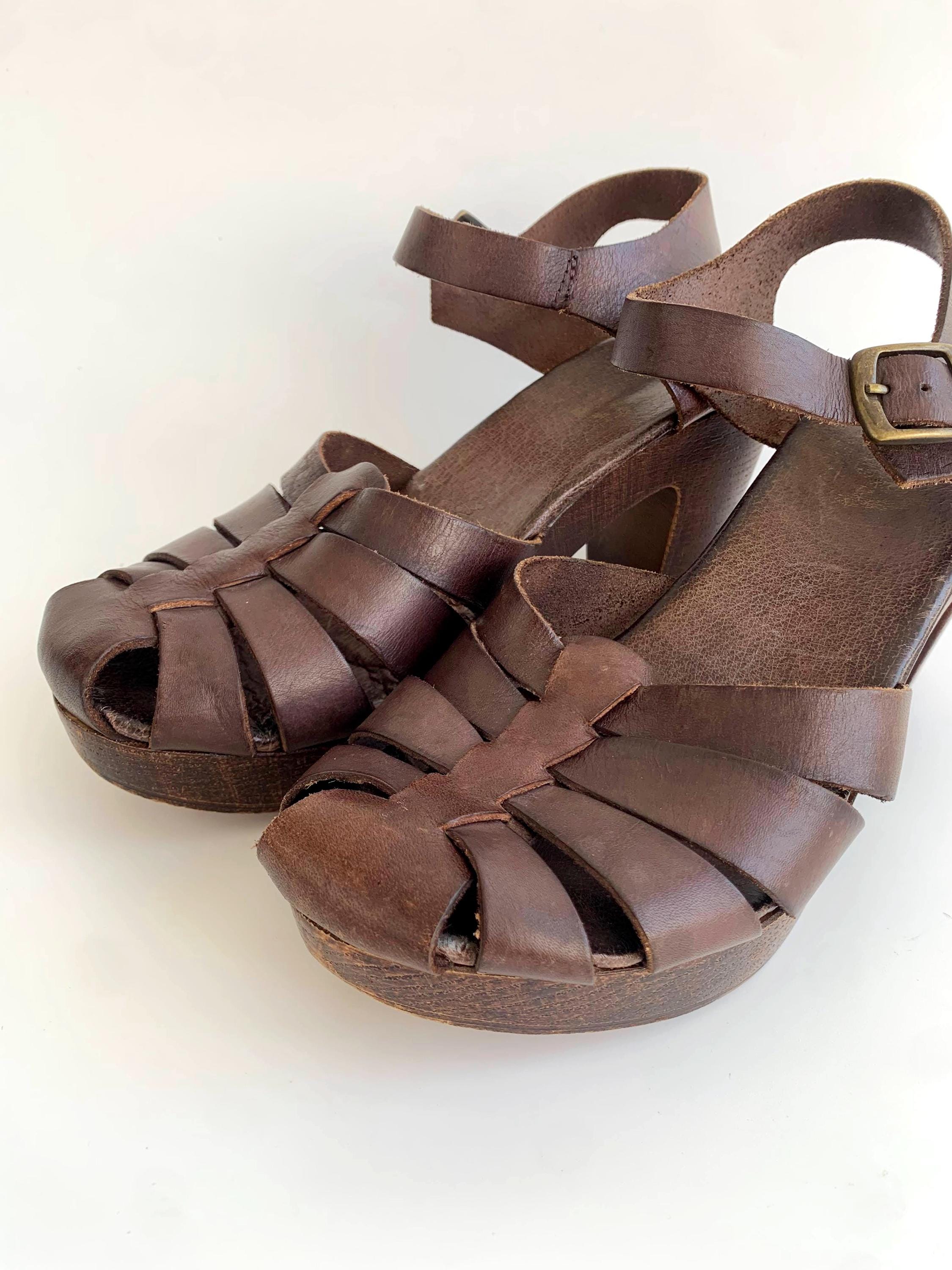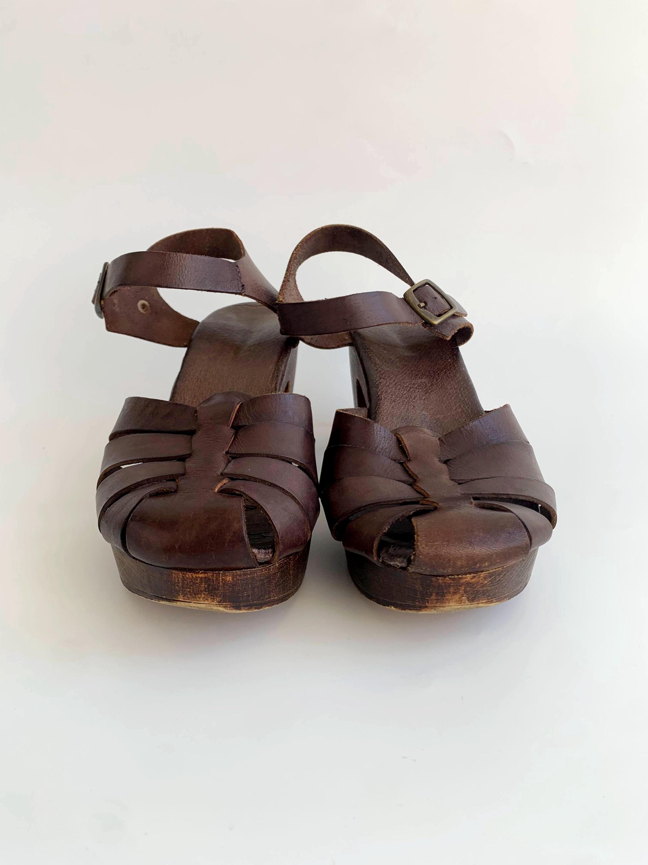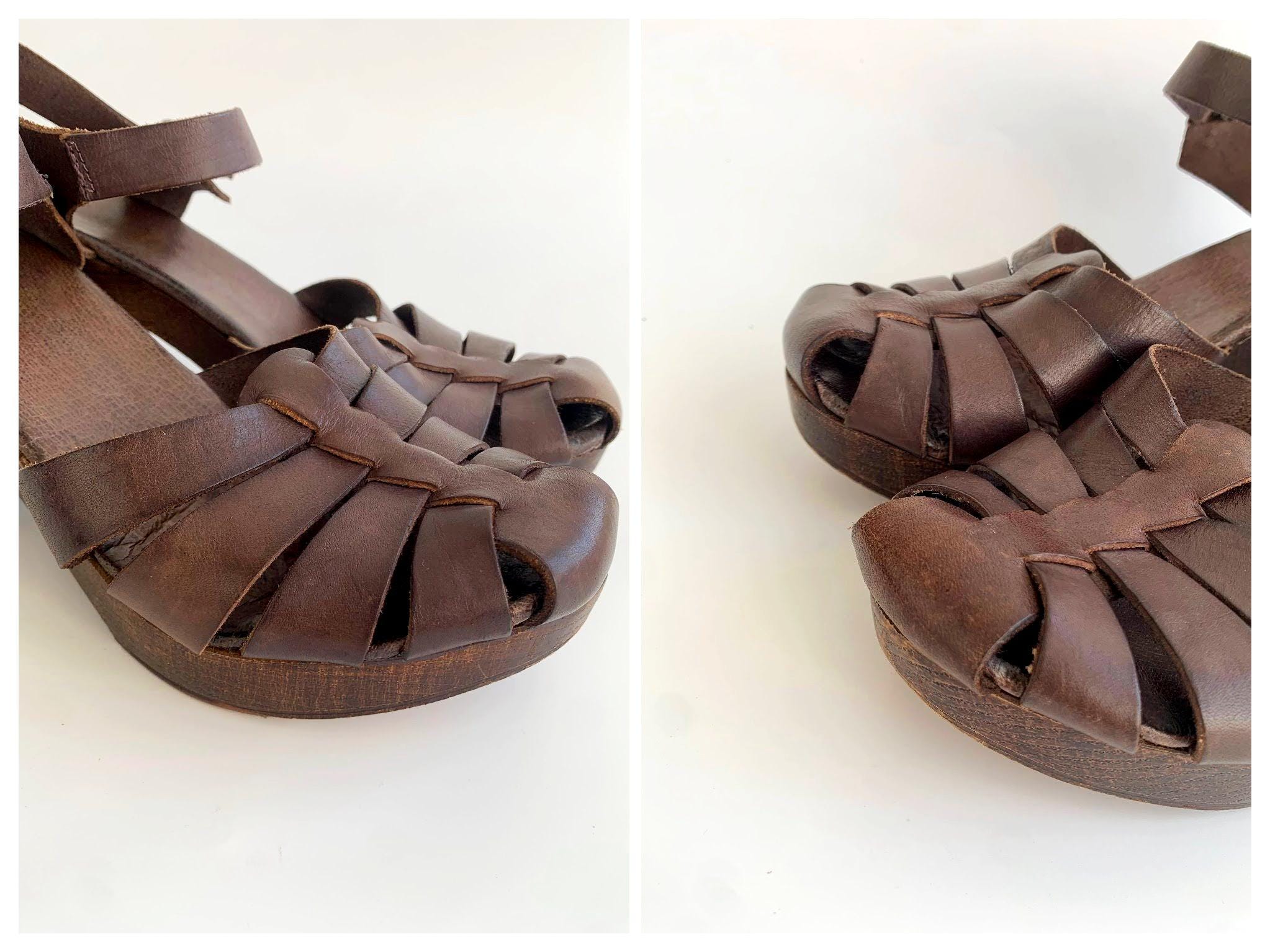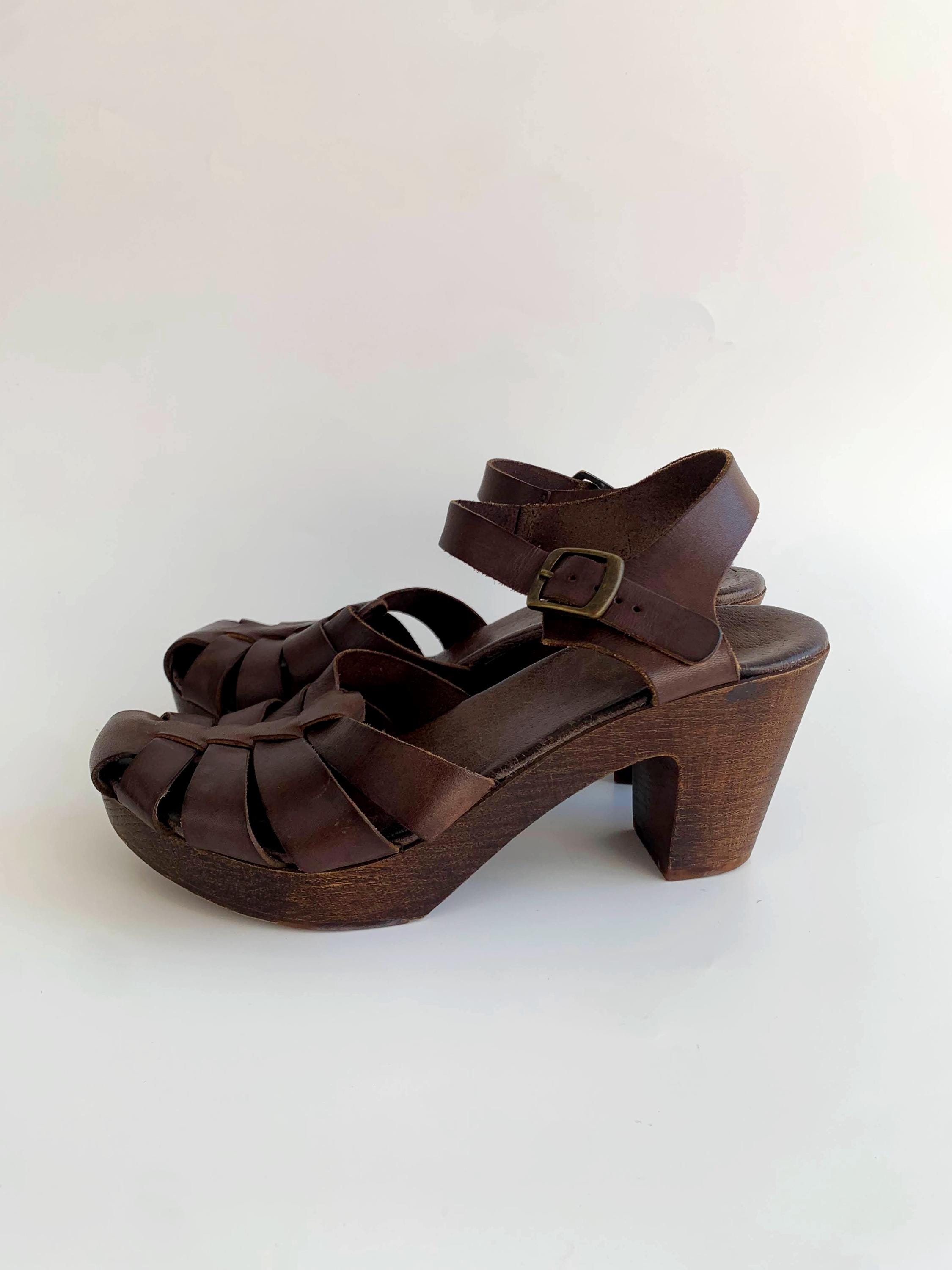 These are pre-loved vintage 70s chunky chocolate brown strappy leather clogs for women with wooden sole and genuine leather upper part. These summer closed toe clog sandals were made in Italy. These leather high heel sandals are size EUR 38, which fits like UK 5 US 7.5. Please check the measurements below.