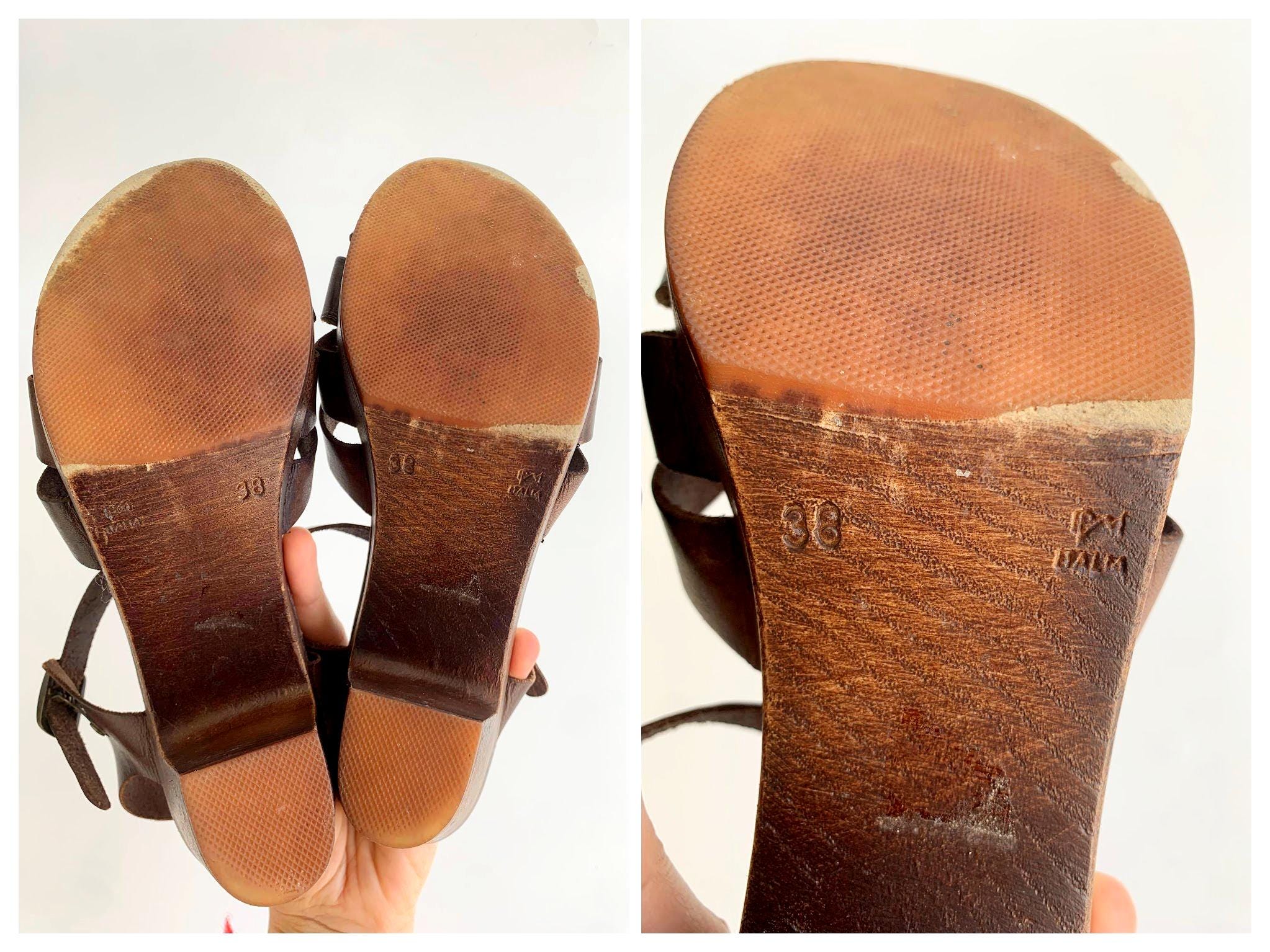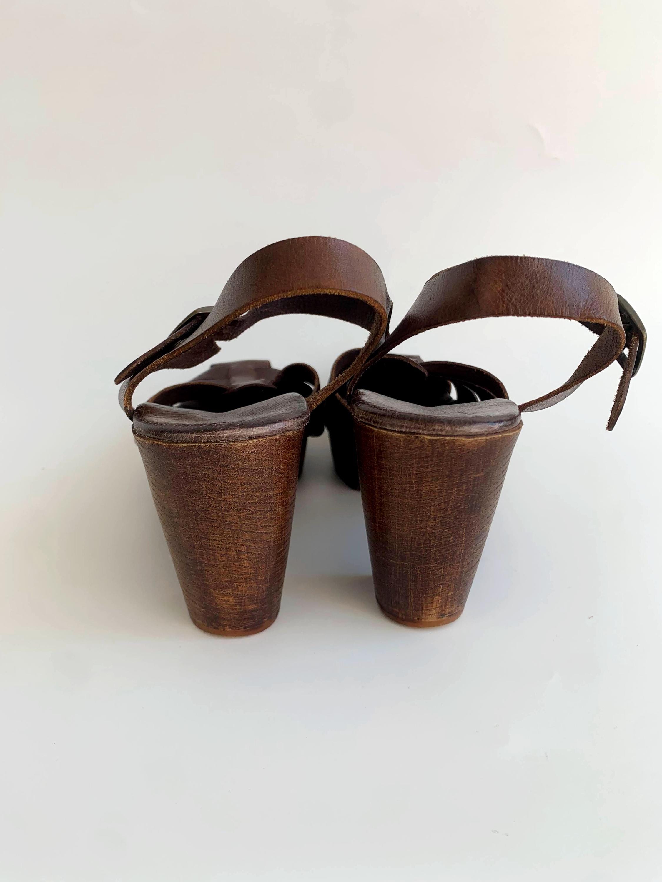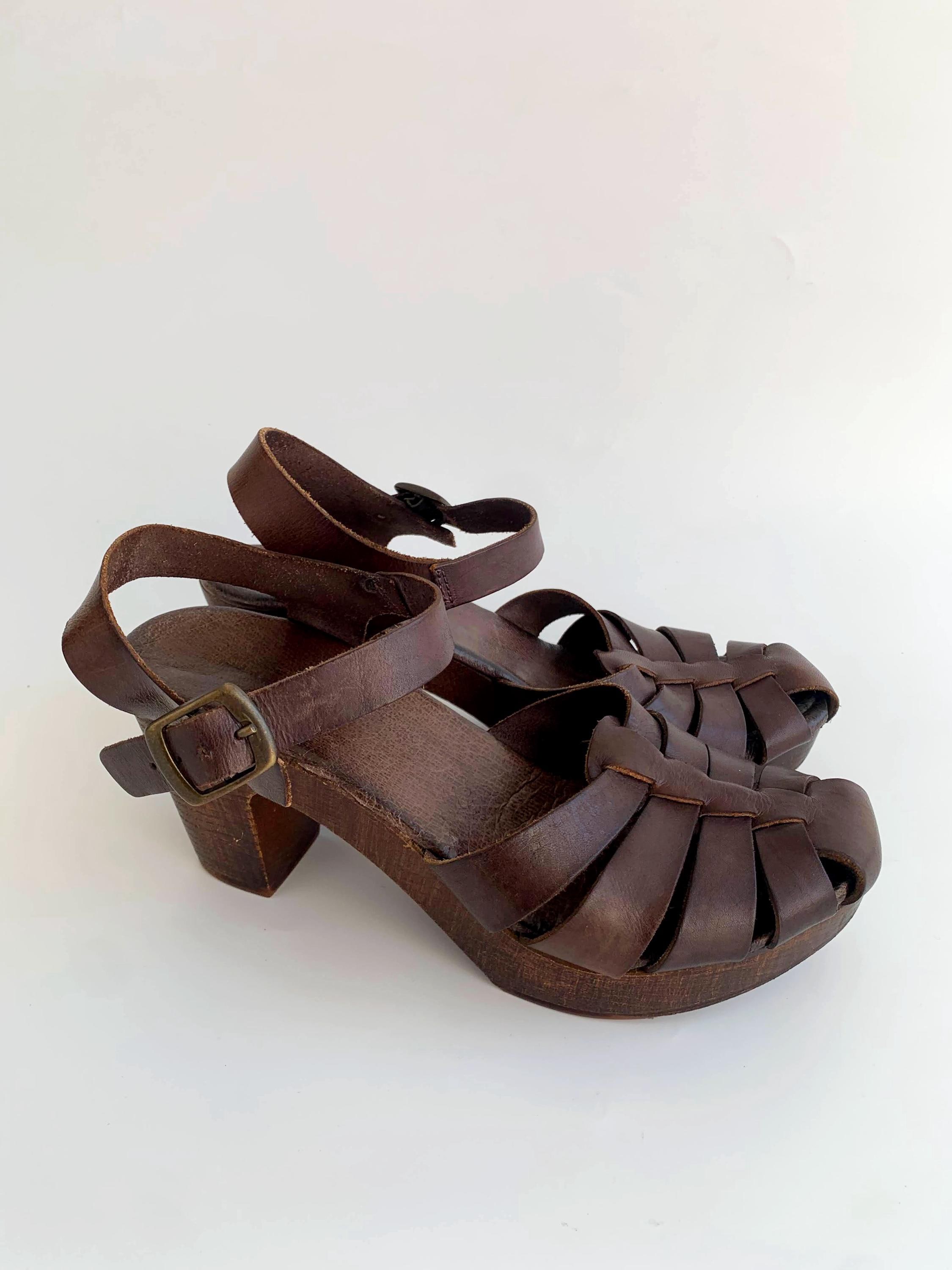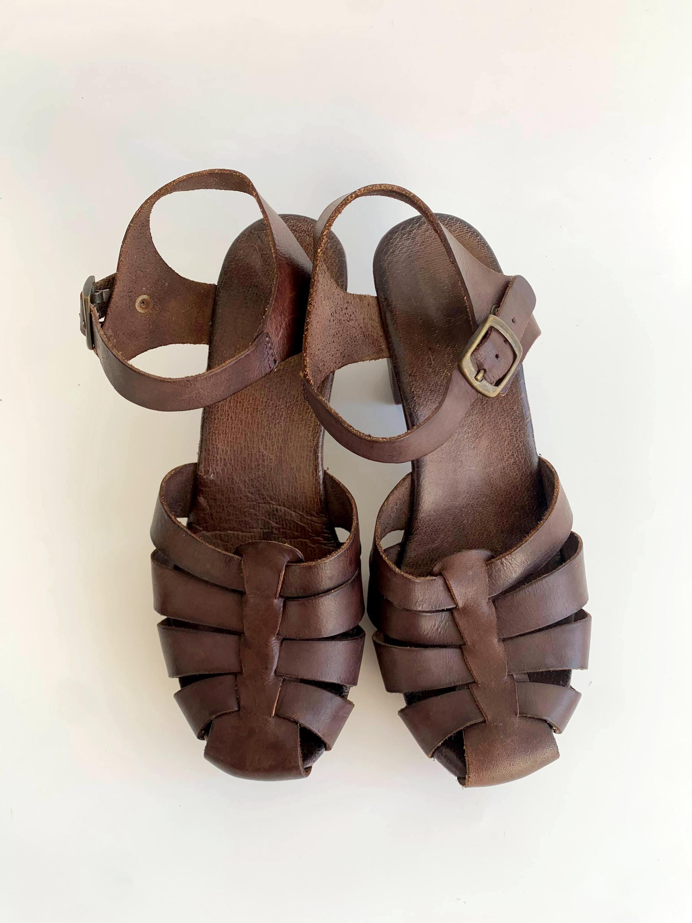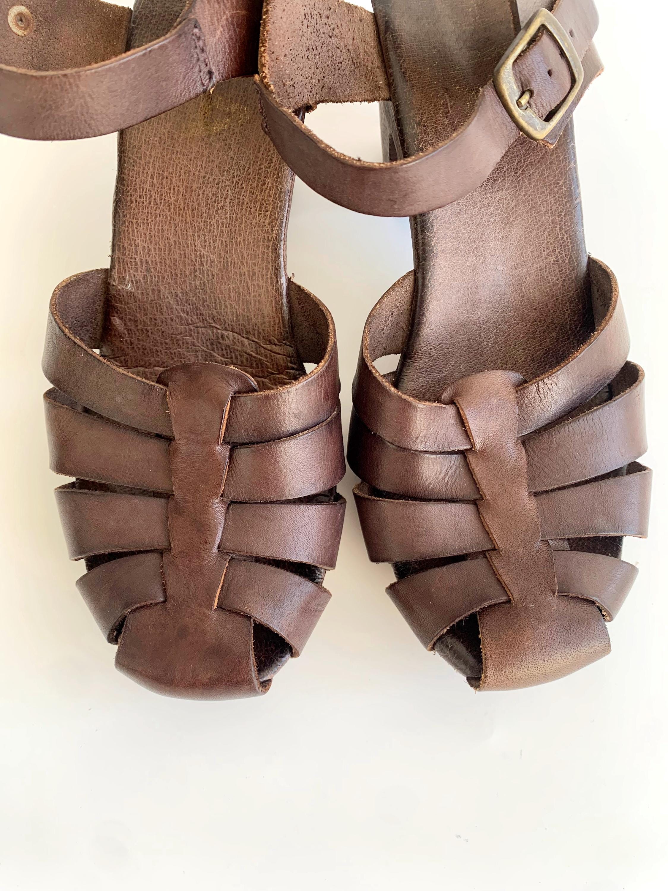 These are pre-loved vintage 70s chunky chocolate brown strappy leather clogs for women with wooden sole and genuine leather upper part. These summer closed toe clog sandals were made in Italy. These leather high heel sandals are size EUR 38, which fits like UK 5 US 7.5. Please check the measurements below.