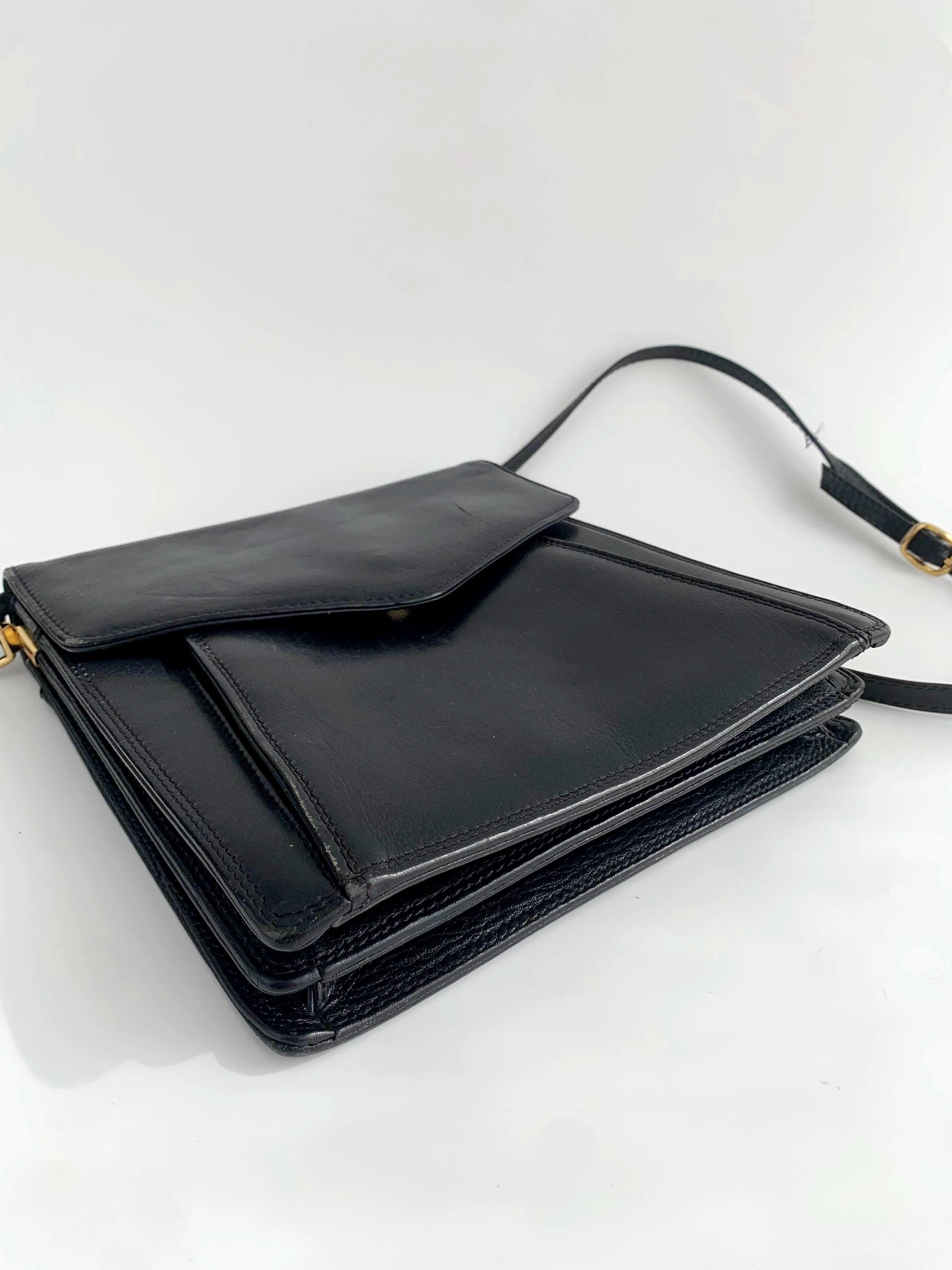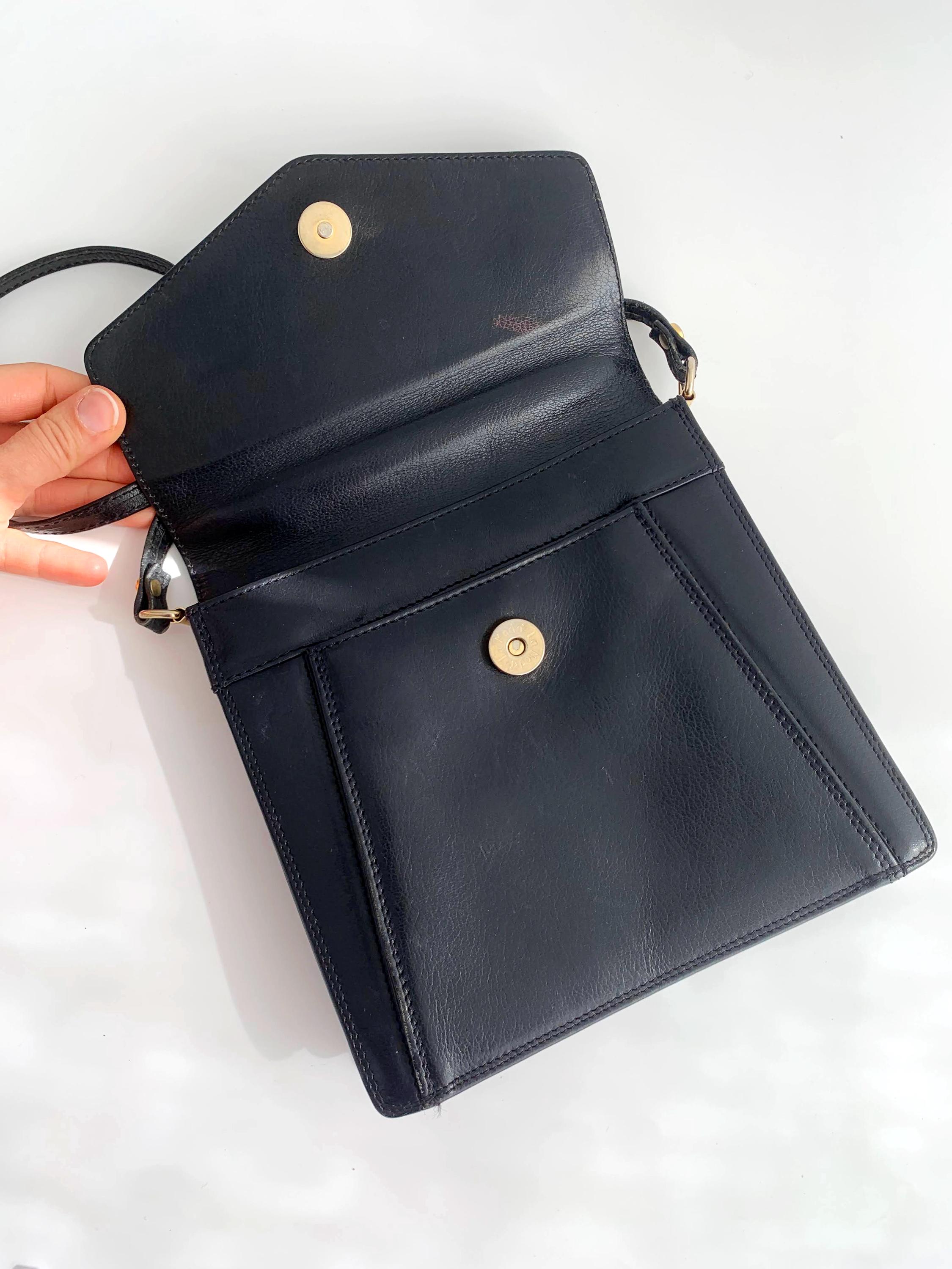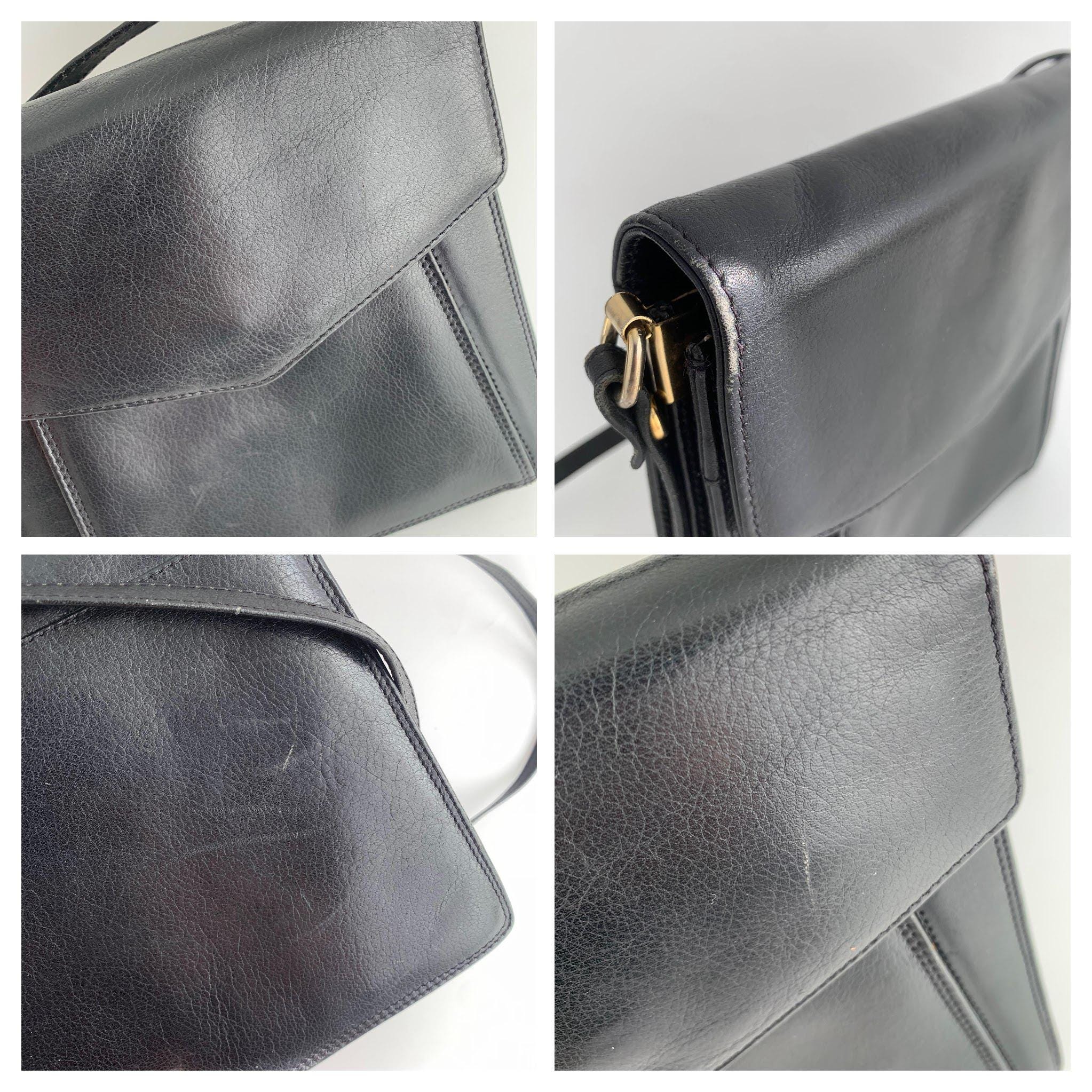 Condition: this black leather shoulder bag was pre-loved and shows some signs of wear - there are some scratches on the leather surface and some fading of the genuine leather around the edges, shown in the close up photos.