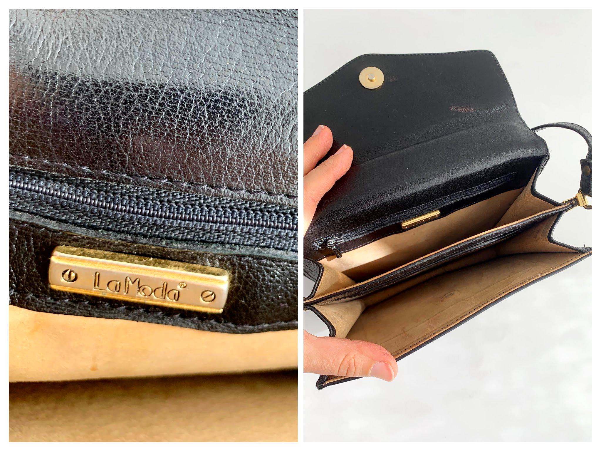 This is a vintage 90s pre-loved mini shoulder purse for women, made of sturdy structured well worn genuine leather in black color. This mini shoulder purse has a short slim shoulder strap. This leather shoulder purse is by the brand LaModa. It has magnetic closure, two compartments and a small zipper pocket inside. This mini satchel bag has real suede leather lining.