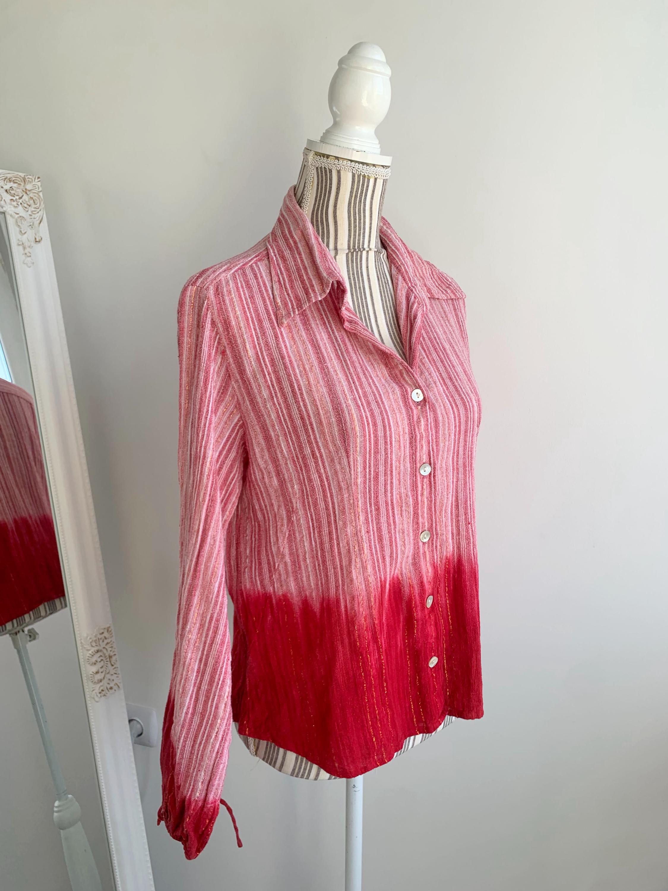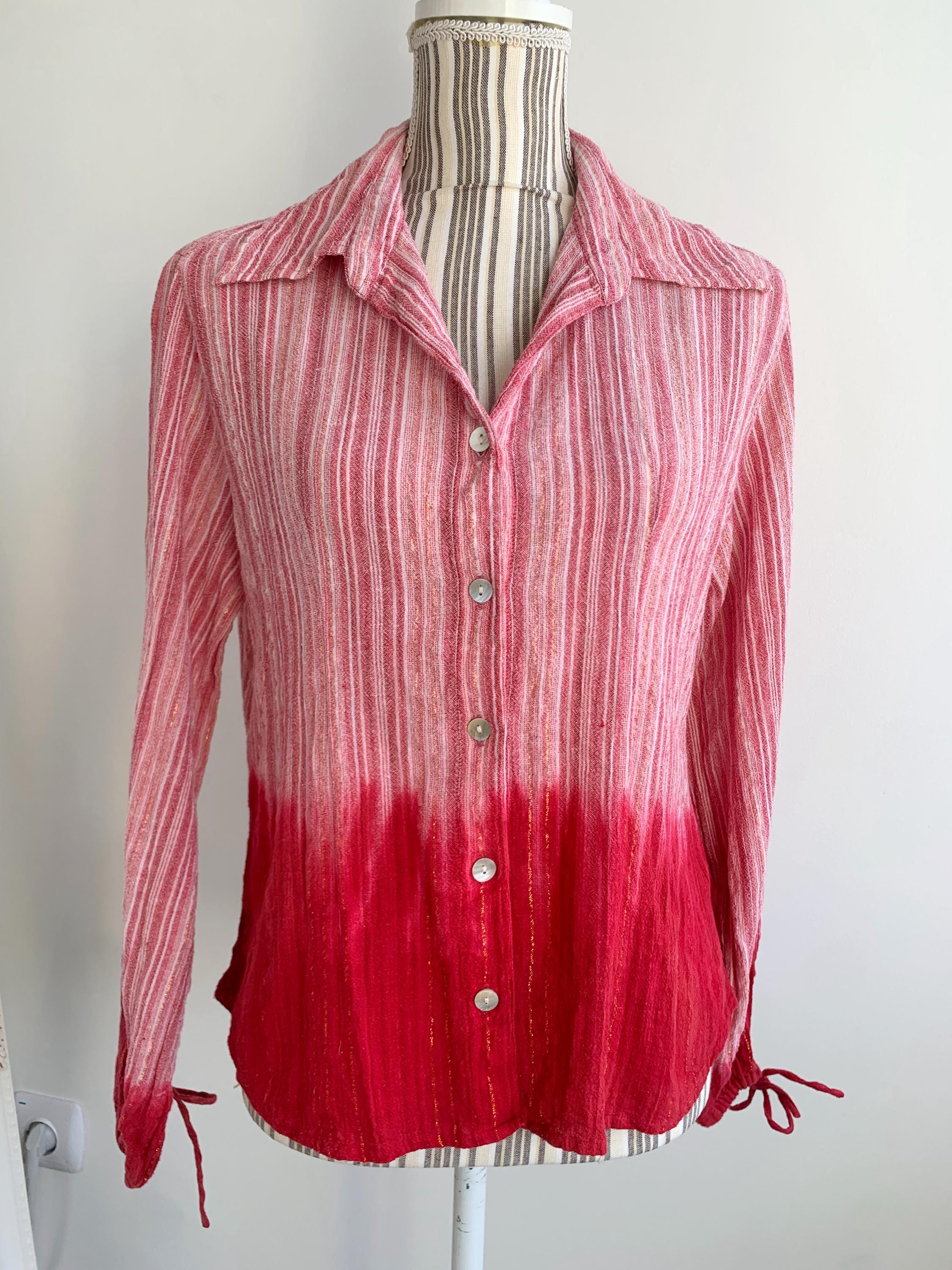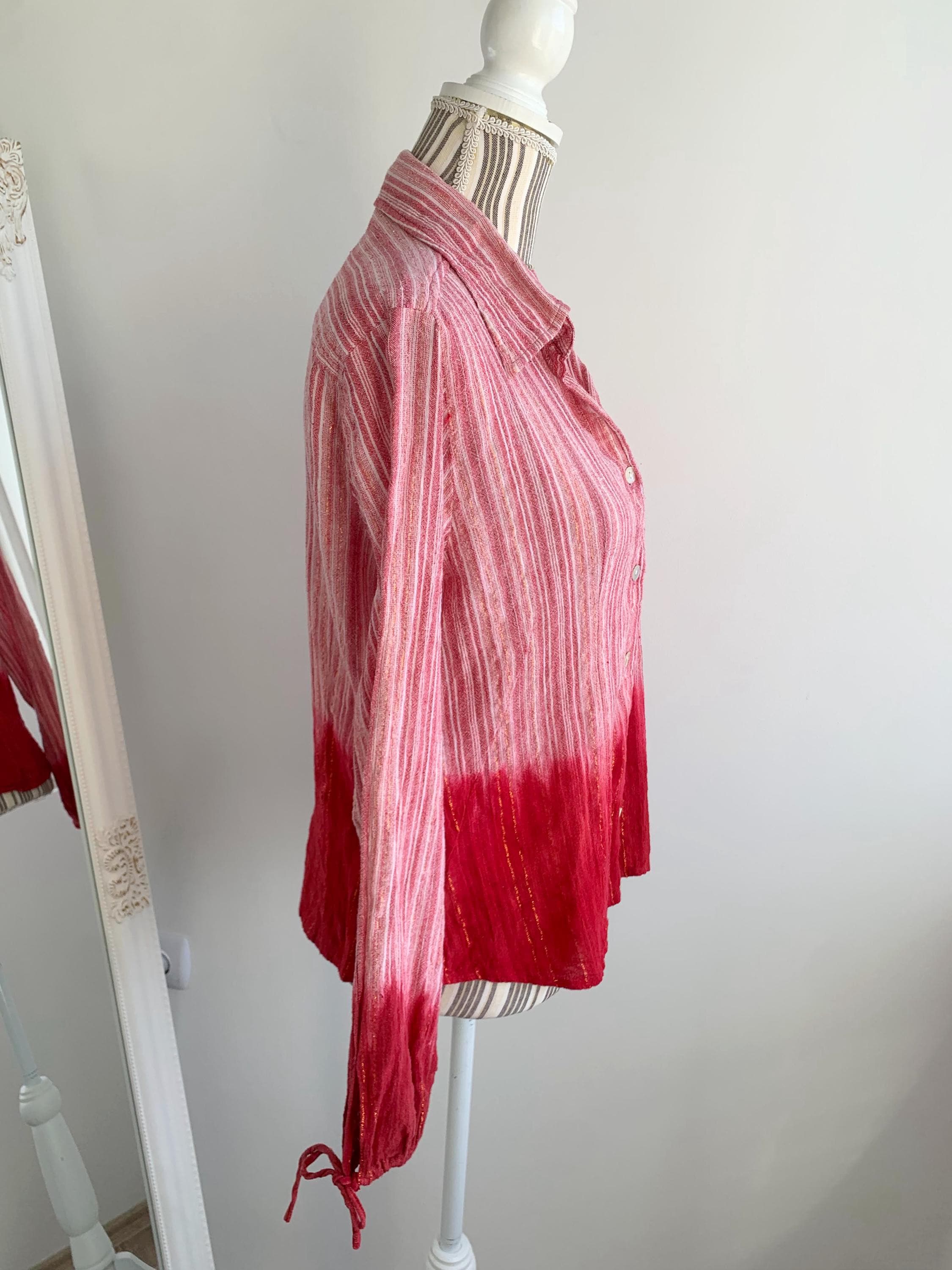 This is a vintage Y2K tie dye striped cotton gauze shirt with long sleeves and button front closure. This breathable summer shirt can be worn as a dress shirt or as an overshirt. It is made of 100% cotton crepe fabric which feels awesome on the skin. It has long tie up sleeves and mother of pearl buttons. The cotton gauze fabric is is shades of rose pink, gold and red. The size marked is L. Please check the measurements below.