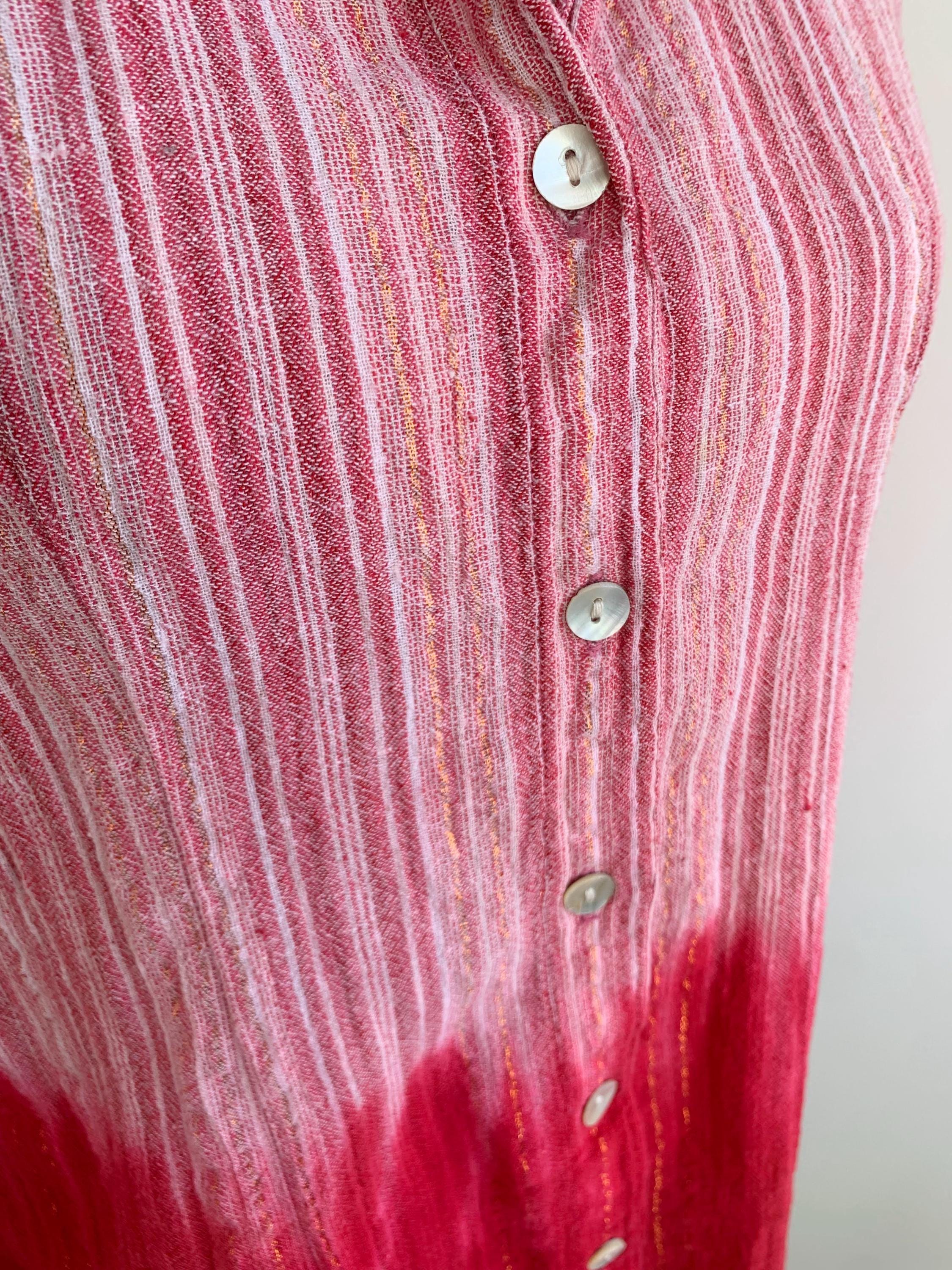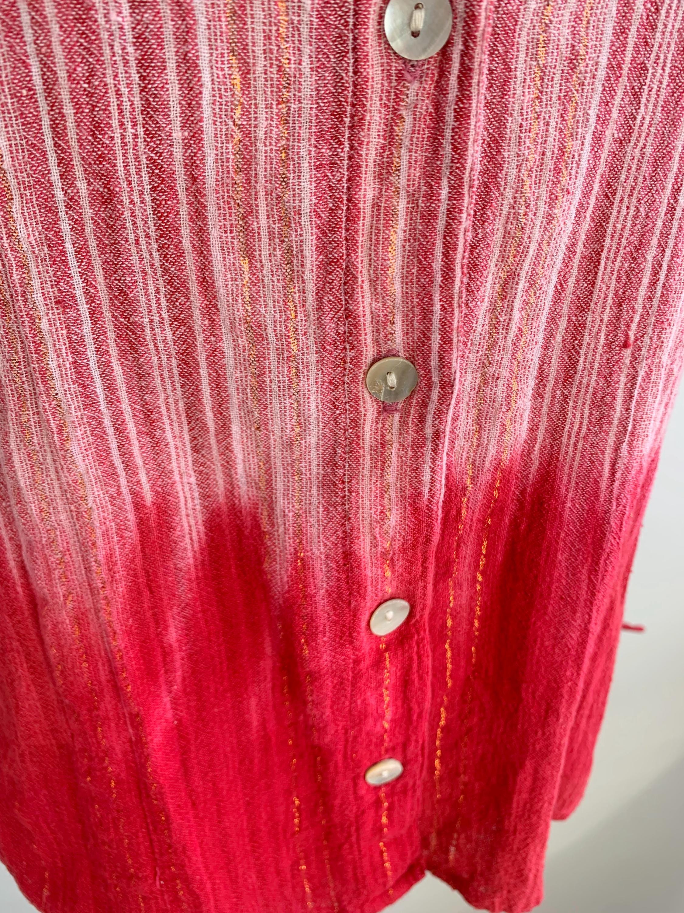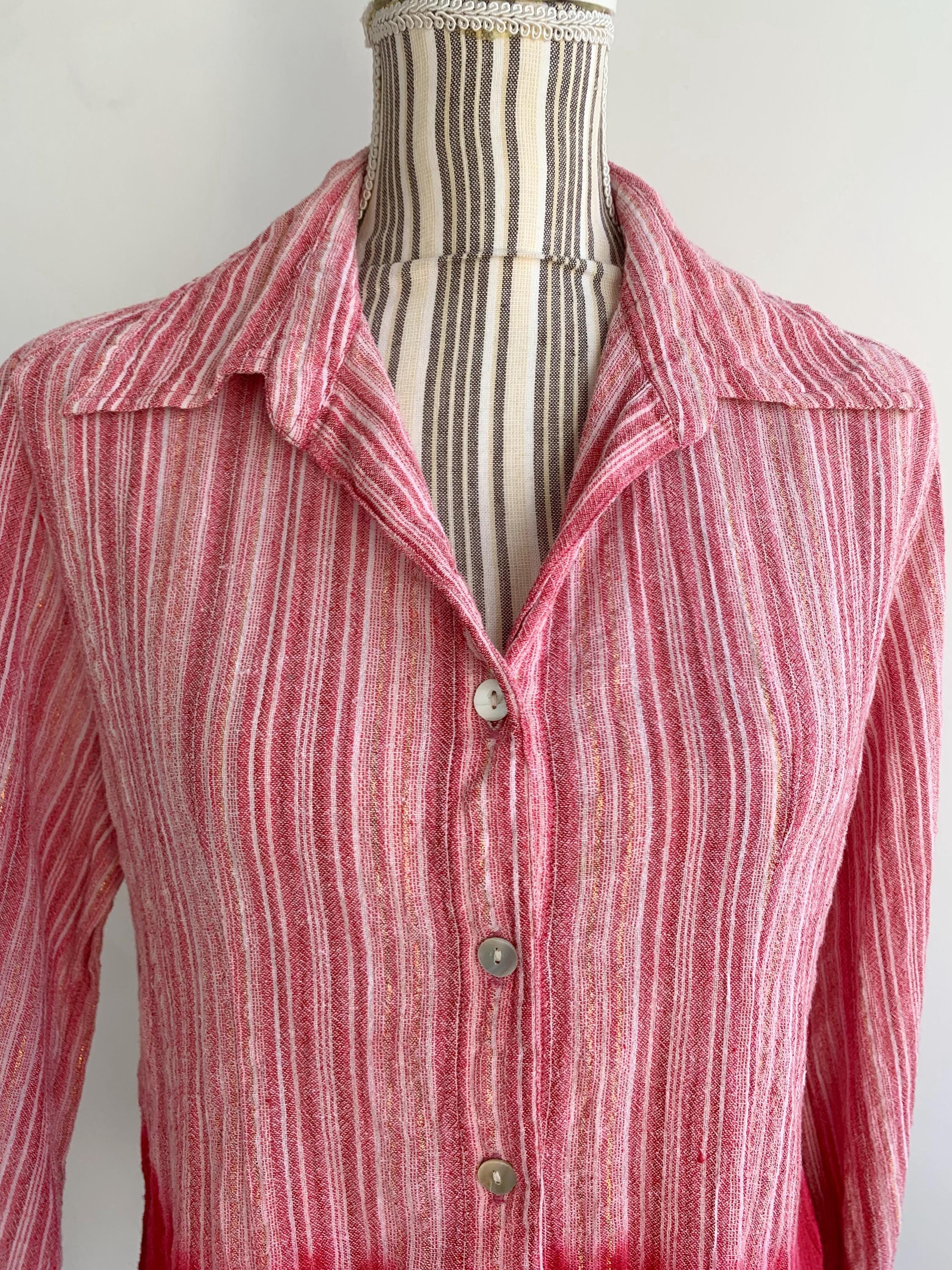 This is a vintage Y2K tie dye striped cotton gauze shirt with long sleeves and button front closure. This breathable summer shirt can be worn as a dress shirt or as an overshirt. It is made of 100% cotton crepe fabric which feels awesome on the skin. It has long tie up sleeves and mother of pearl buttons. The cotton gauze fabric is is shades of rose pink, gold and red. The size marked is L. Please check the measurements below.