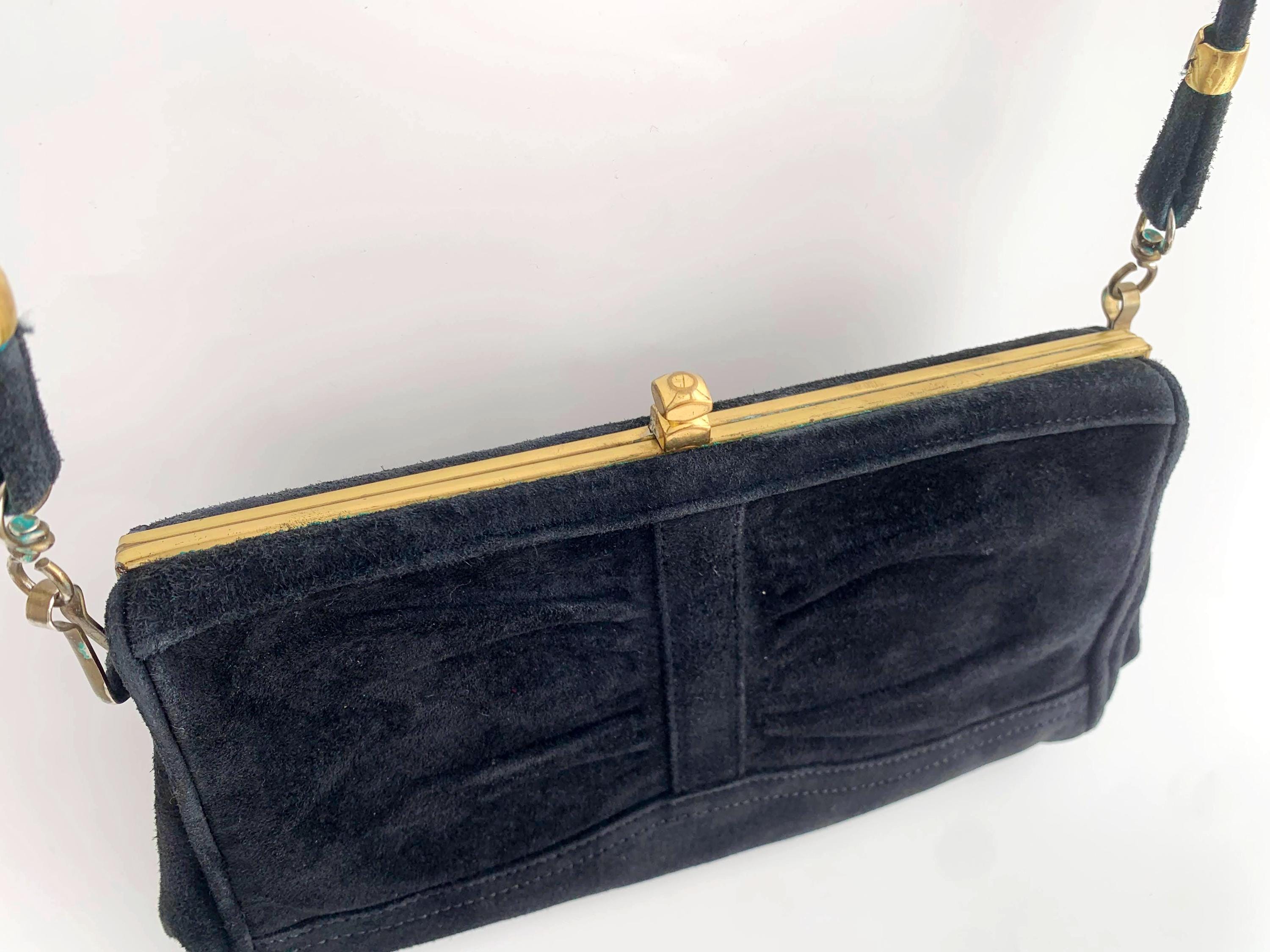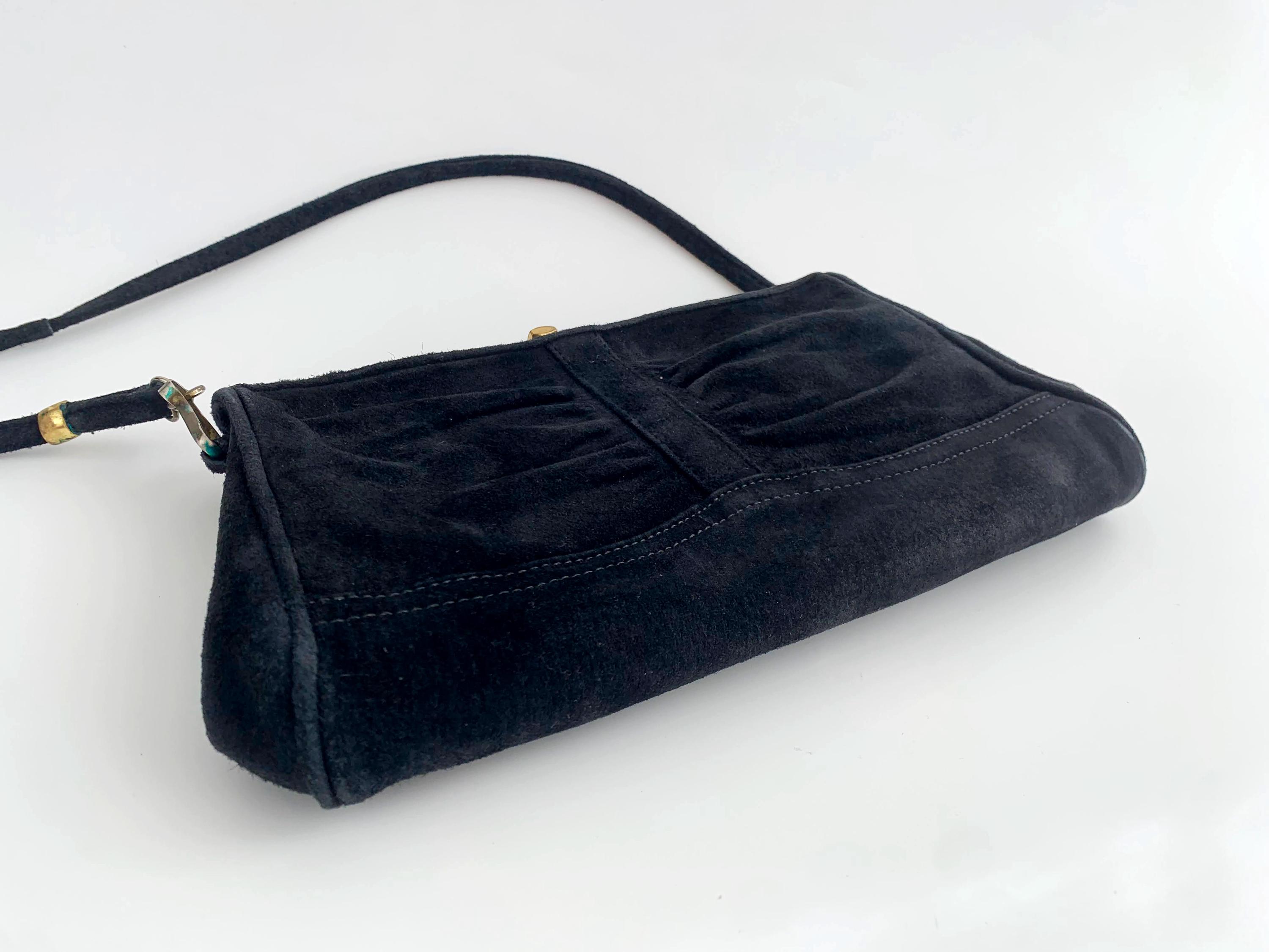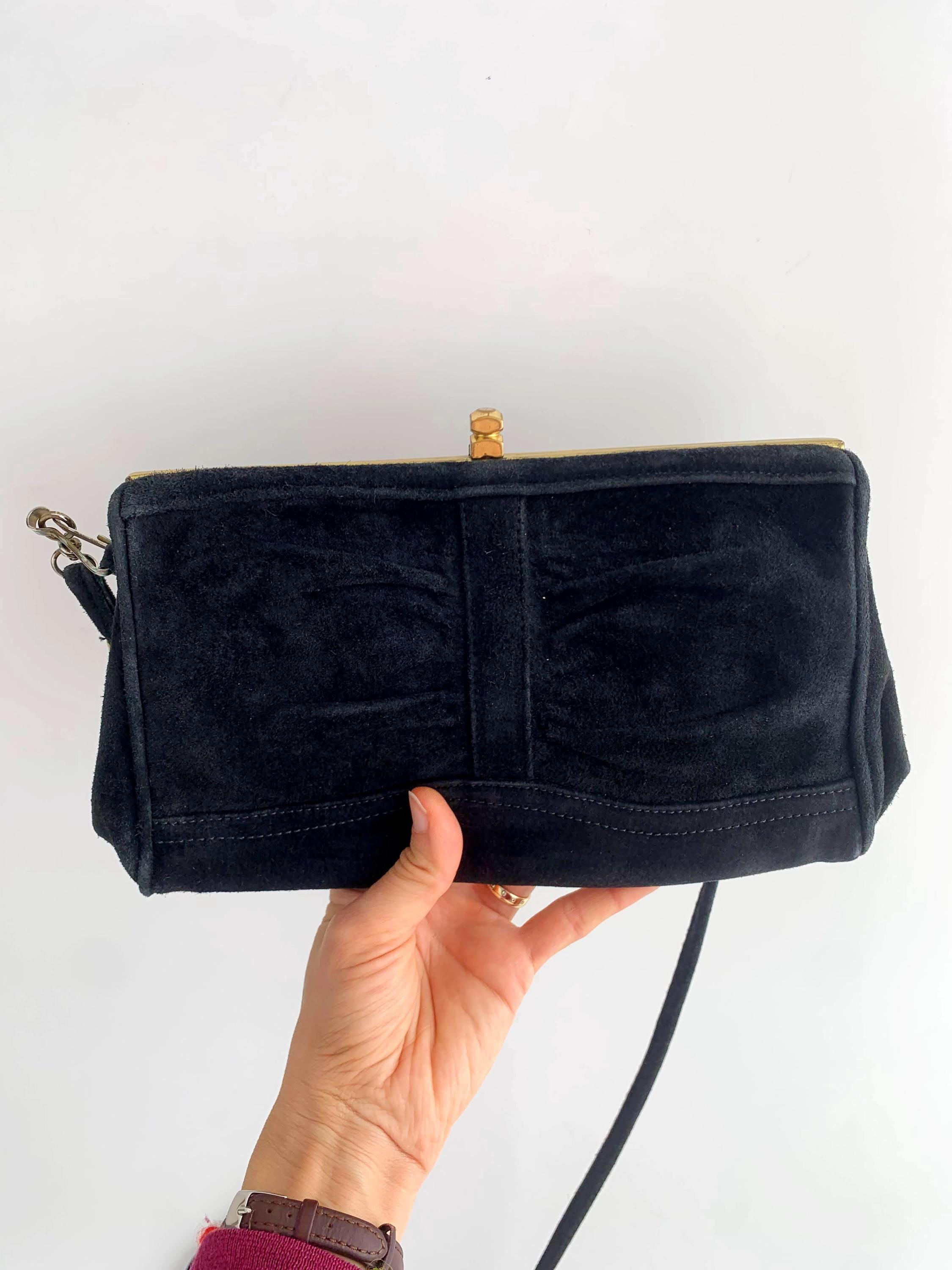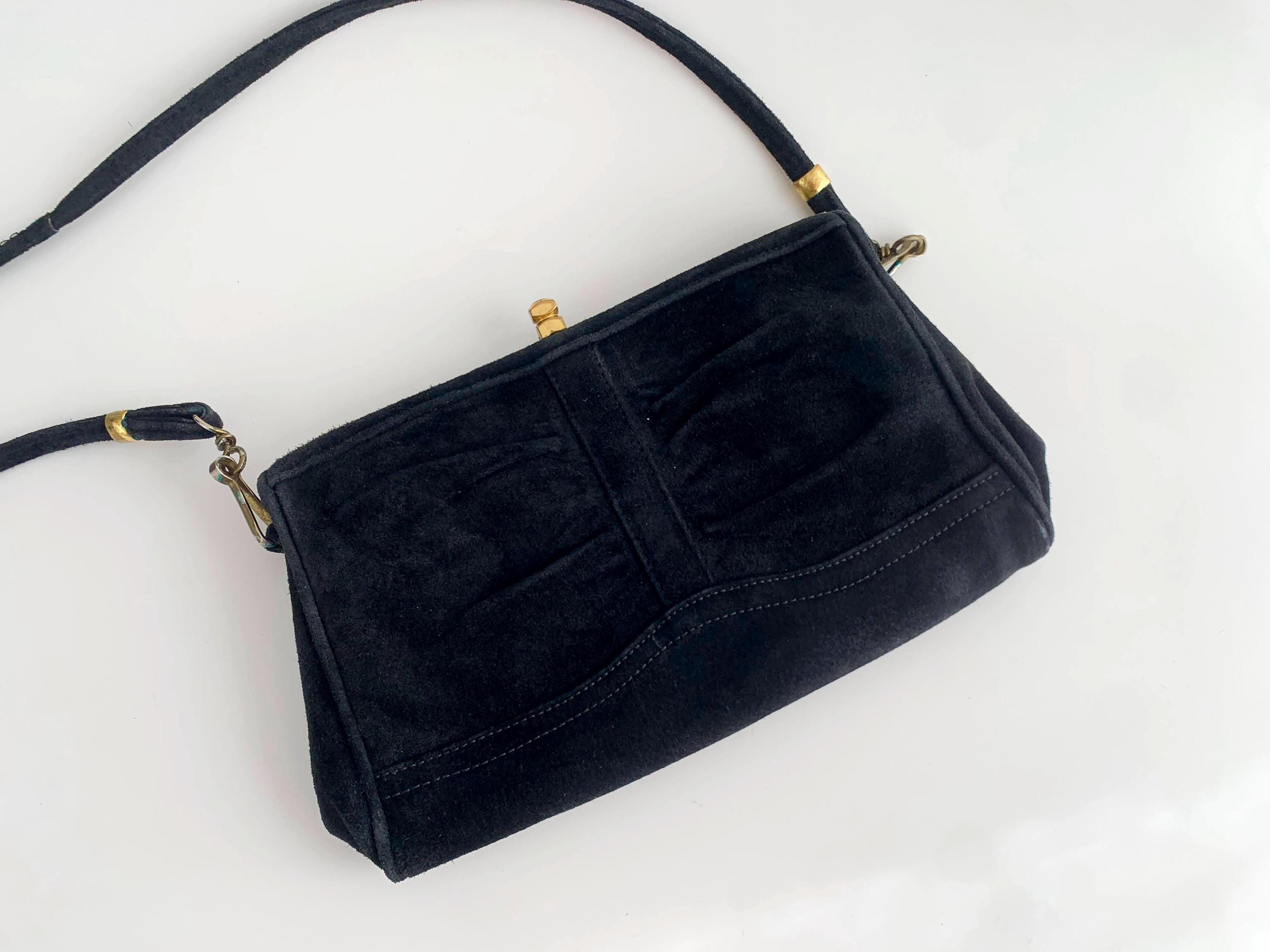 This is a vintage 80s black real suede leather clutch purse with detachable shoulder strap and gold metal frame with kiss lock closure. This simple slim suede leather handbag dates back to to the 80s. Super cute vintage handbag that you can enjoy as an evening handbag.
