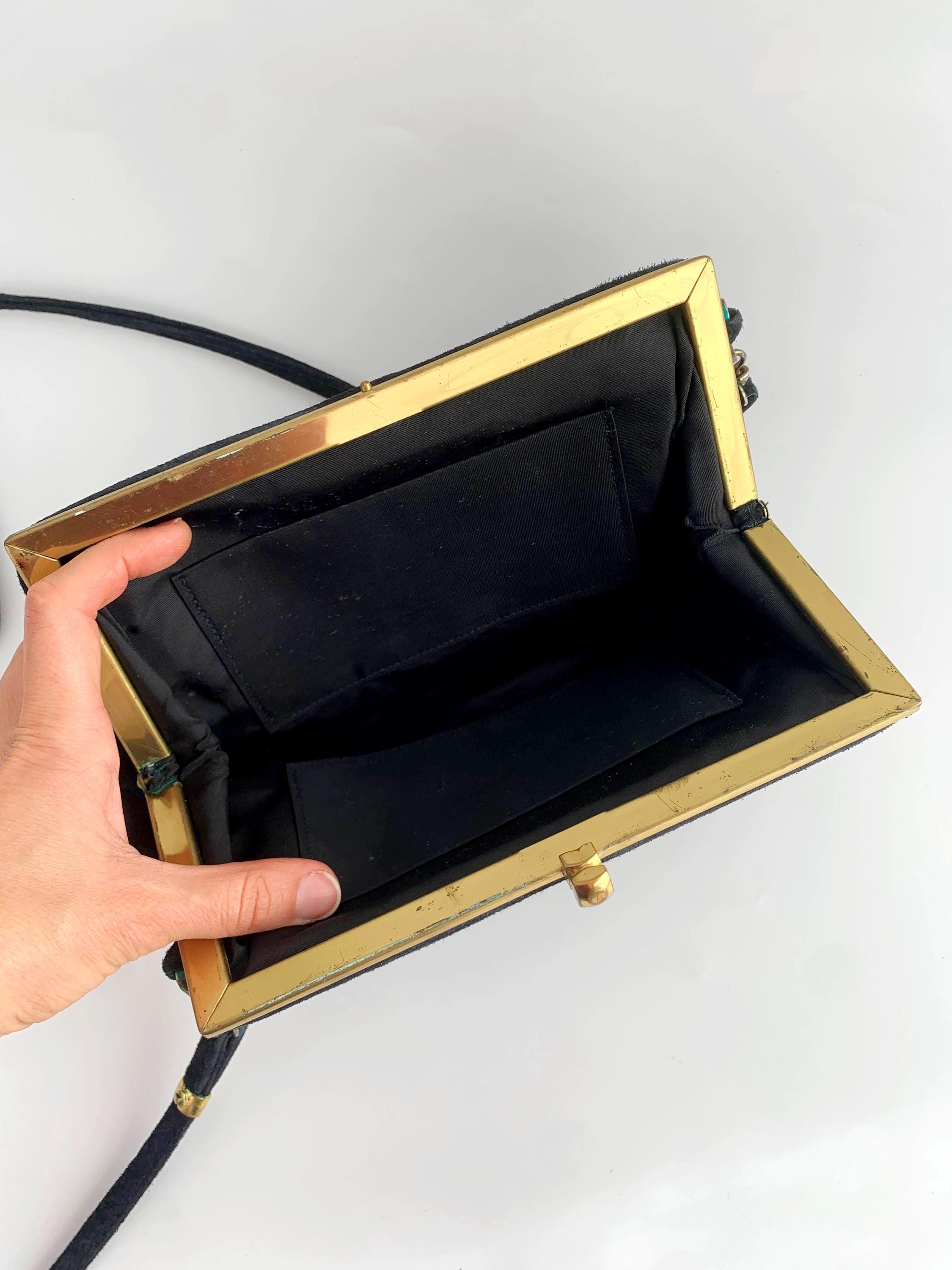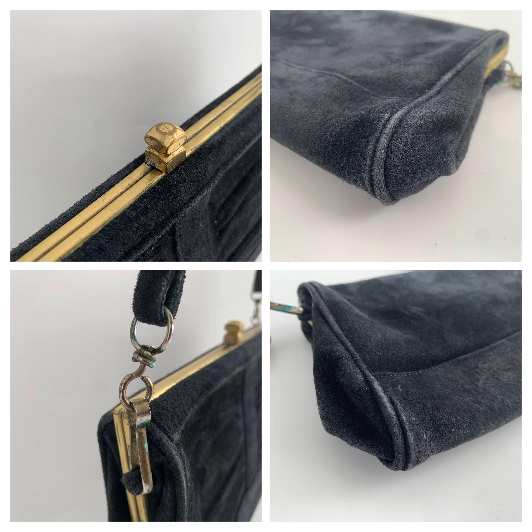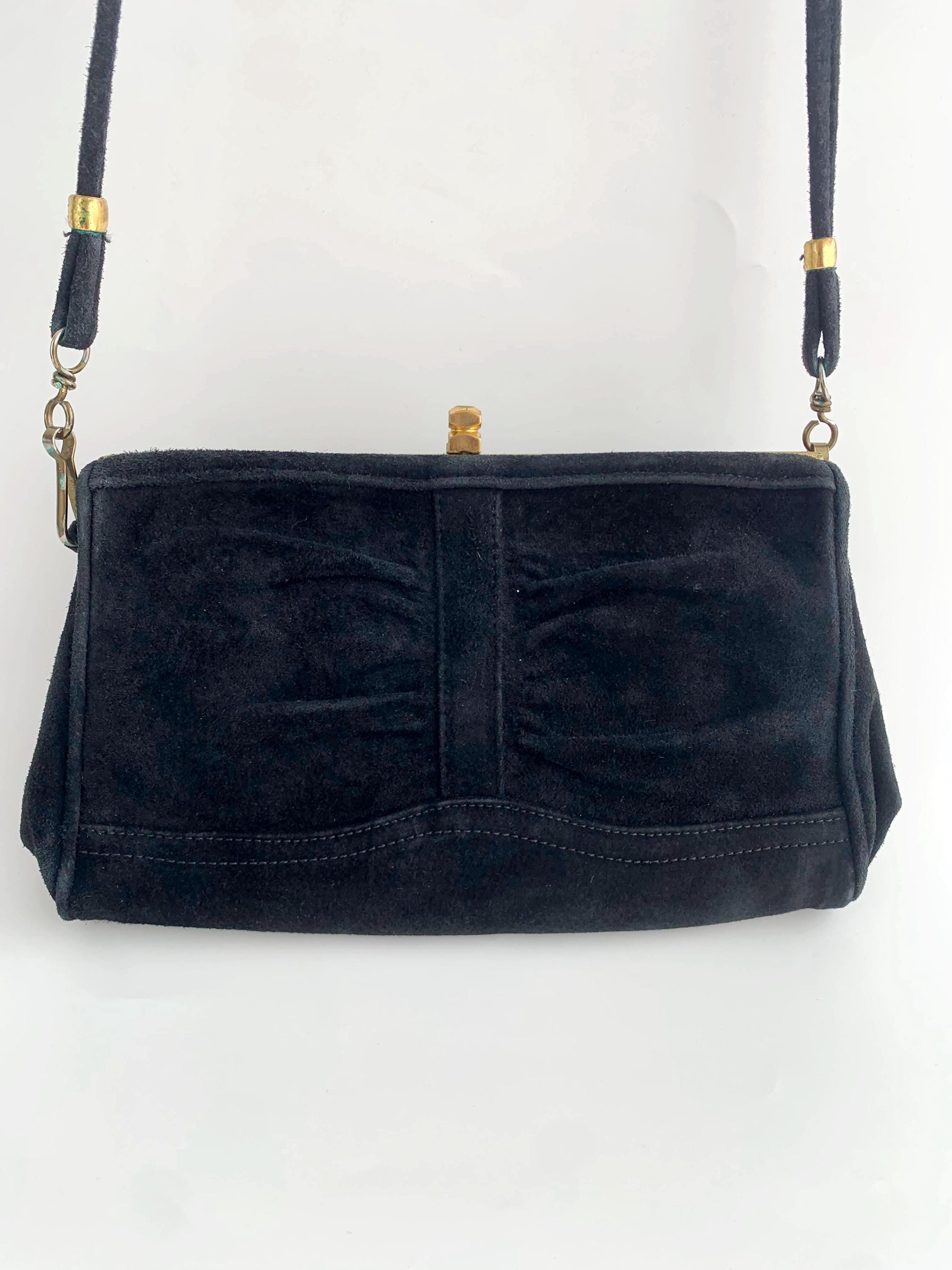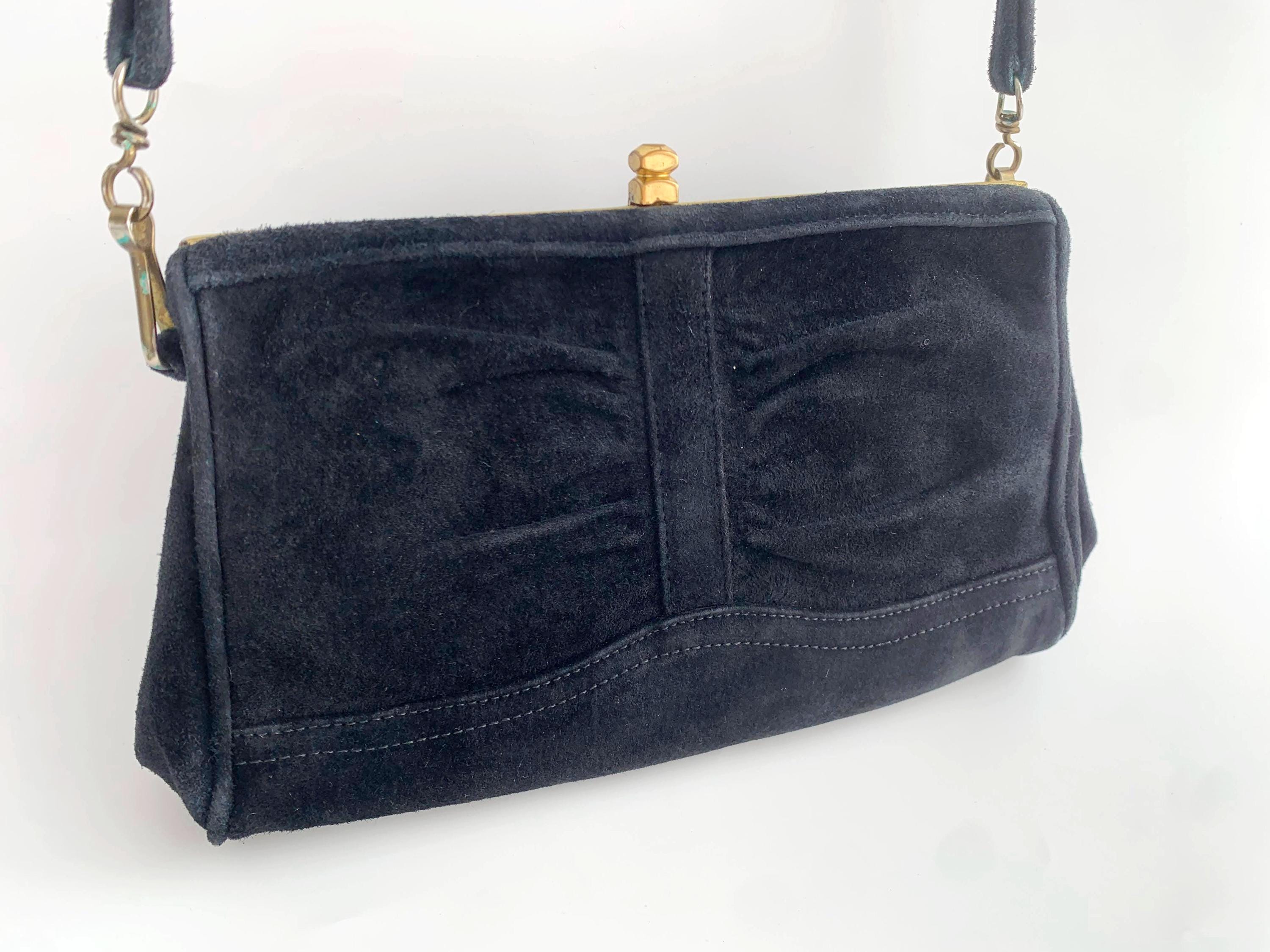 This is a vintage 80s black real suede leather clutch purse with detachable shoulder strap and gold metal frame with kiss lock closure. This simple slim suede leather handbag dates back to to the 80s. Super cute vintage handbag that you can enjoy as an evening handbag.