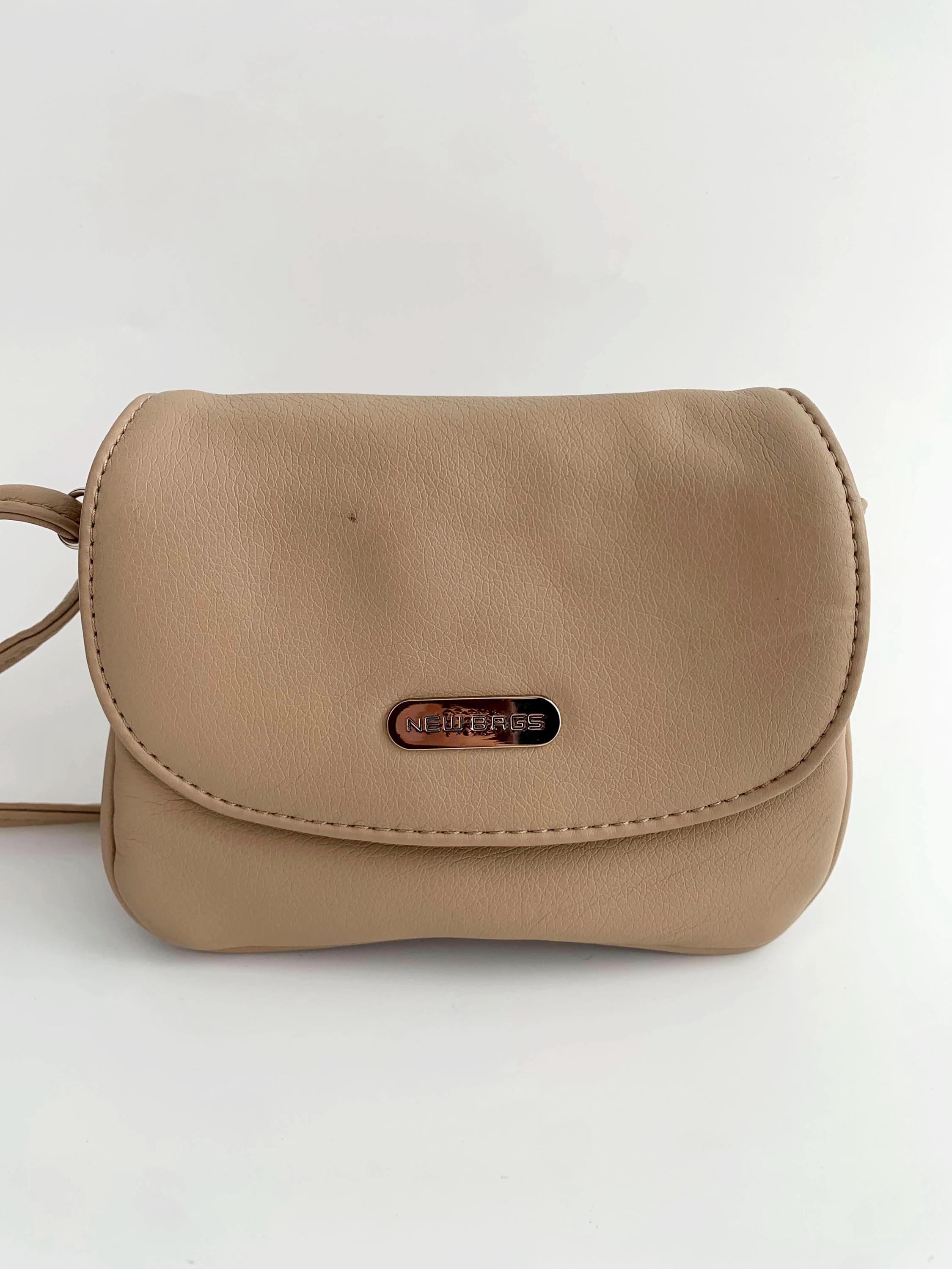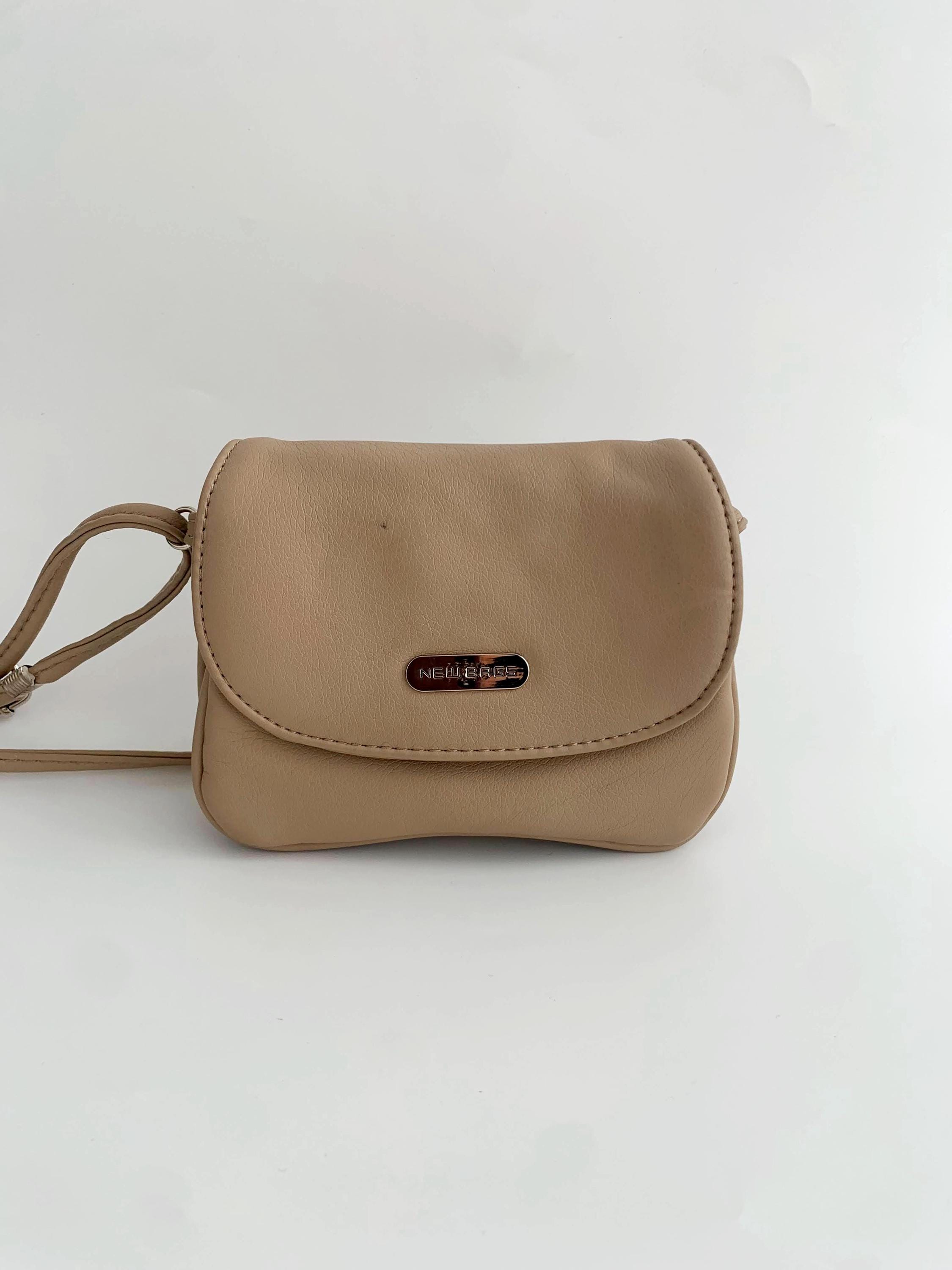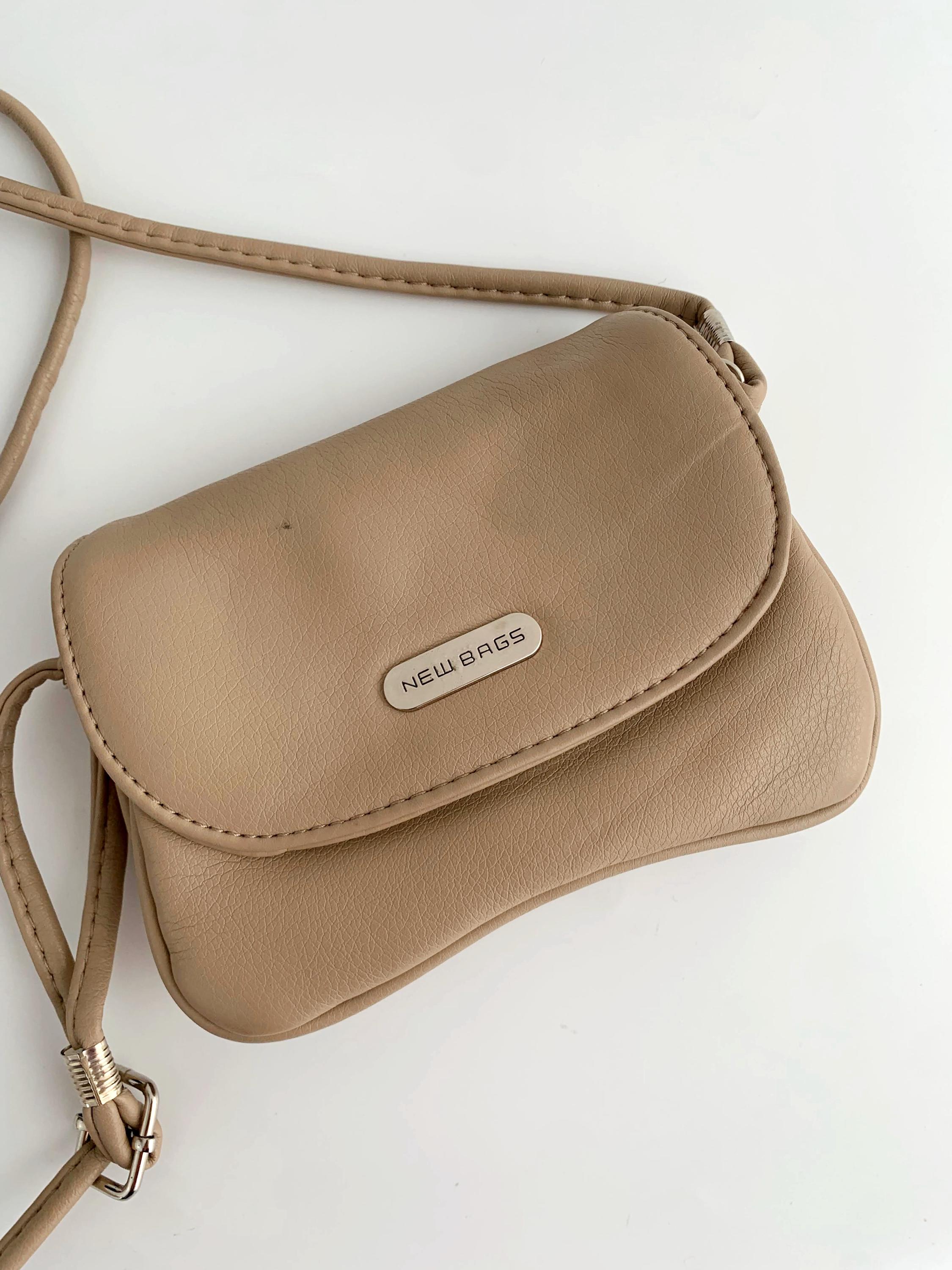 This is a vintage tan beige faux leather mini satchel purse made of super soft vegan leather with flap over magnetic closure and long adjustable strap which allows you to wear it as a shoulder or crossbody bag. This mini satchel purse has three compartments, lined in synthetic fabric