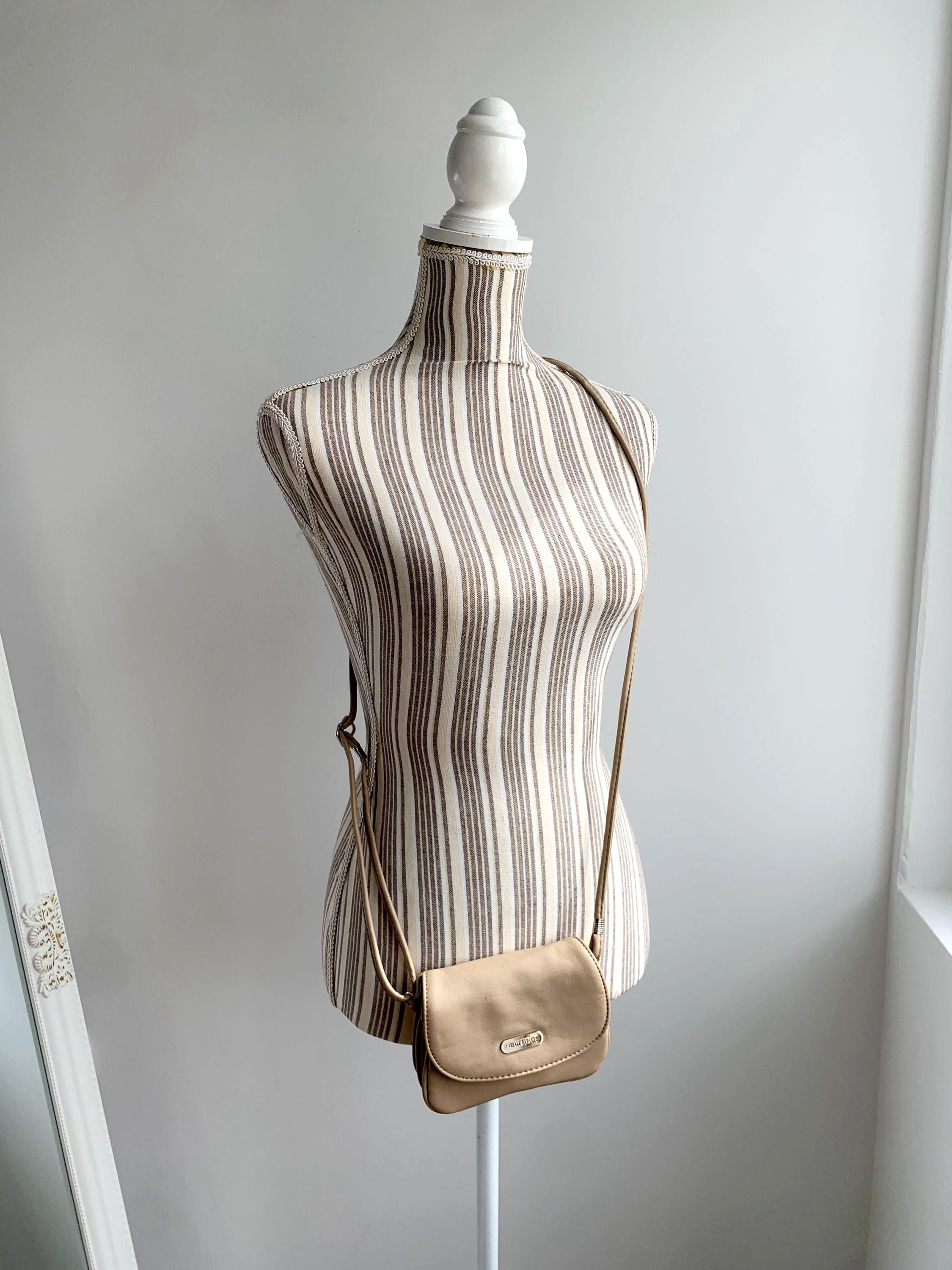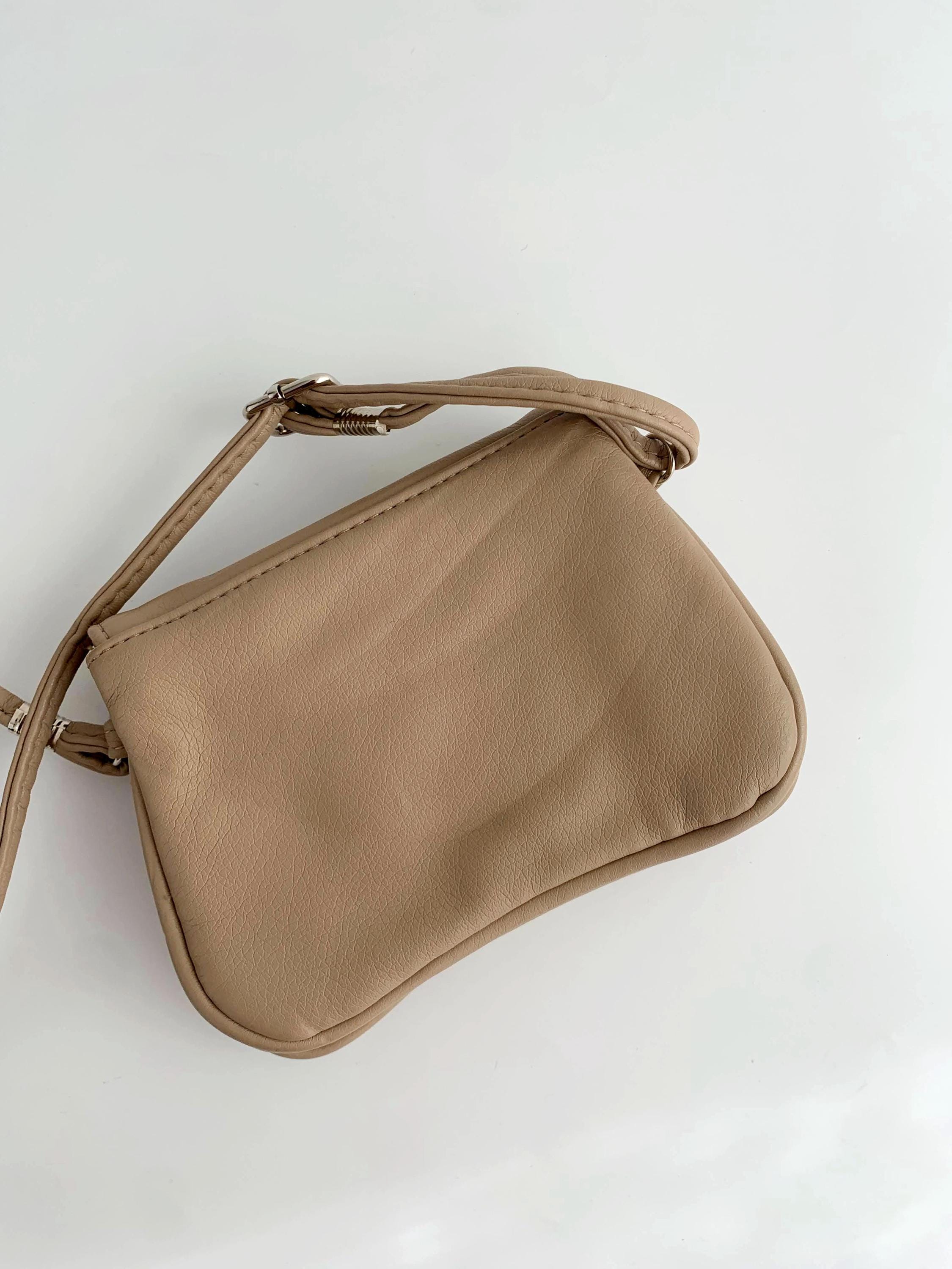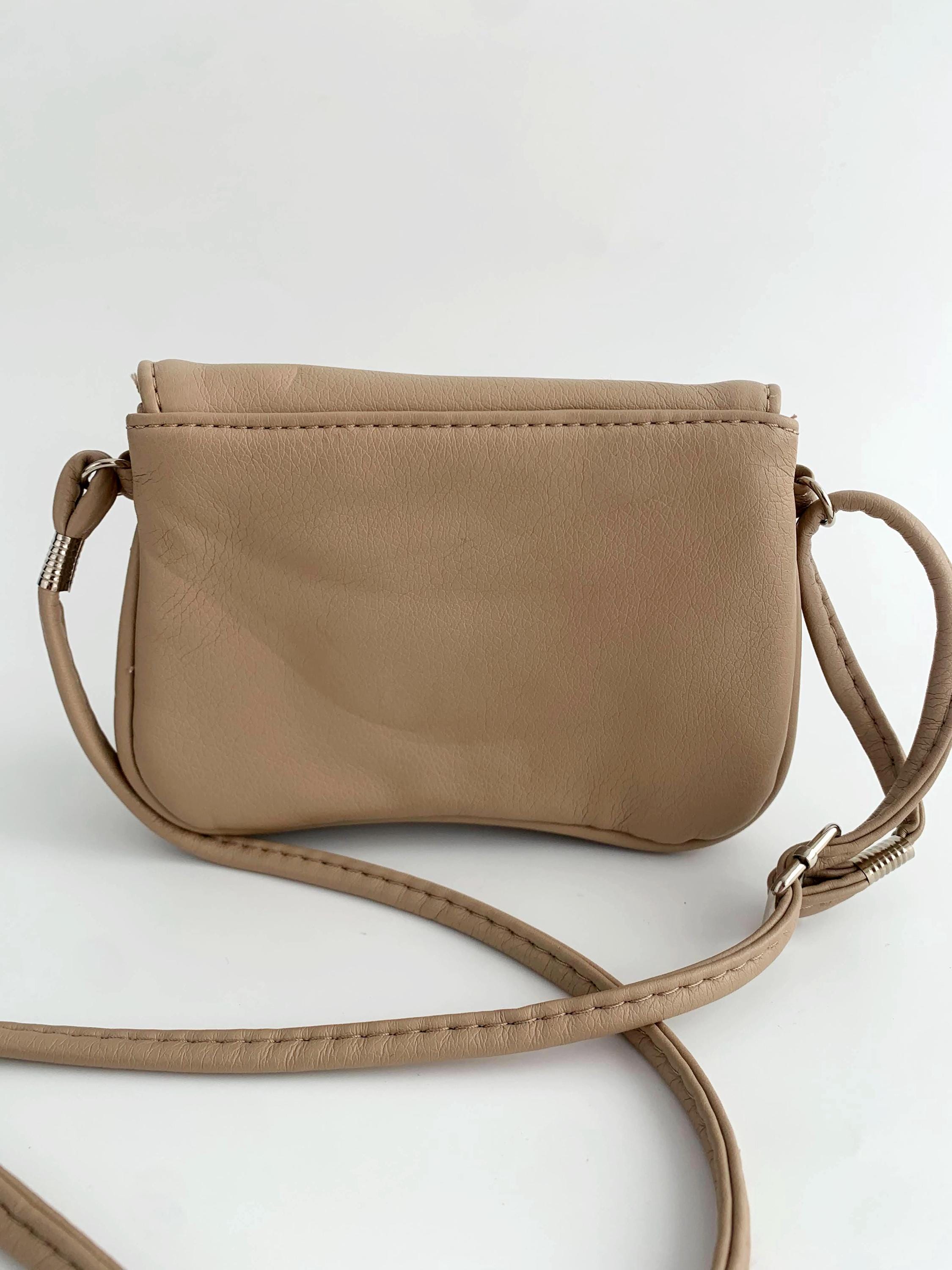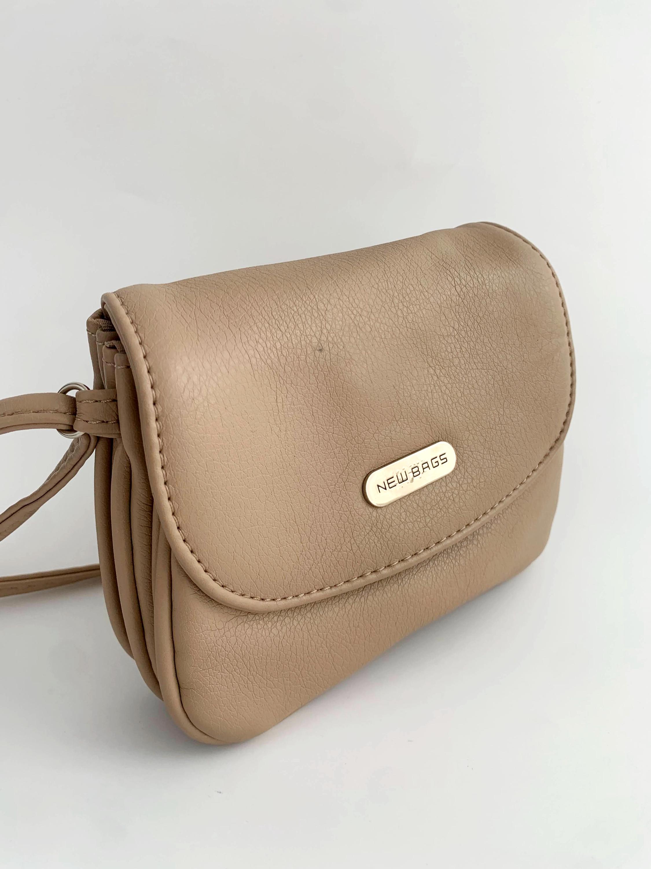 This is a vintage tan beige faux leather mini satchel purse made of super soft vegan leather with flap over magnetic closure and long adjustable strap which allows you to wear it as a shoulder or crossbody bag. This mini satchel purse has three compartments, lined in synthetic fabric