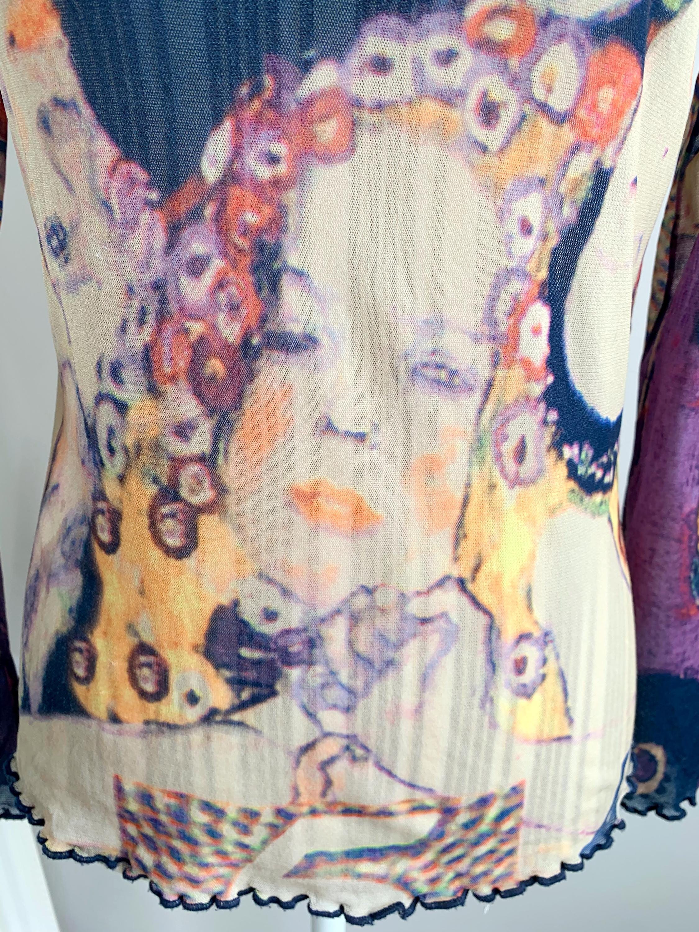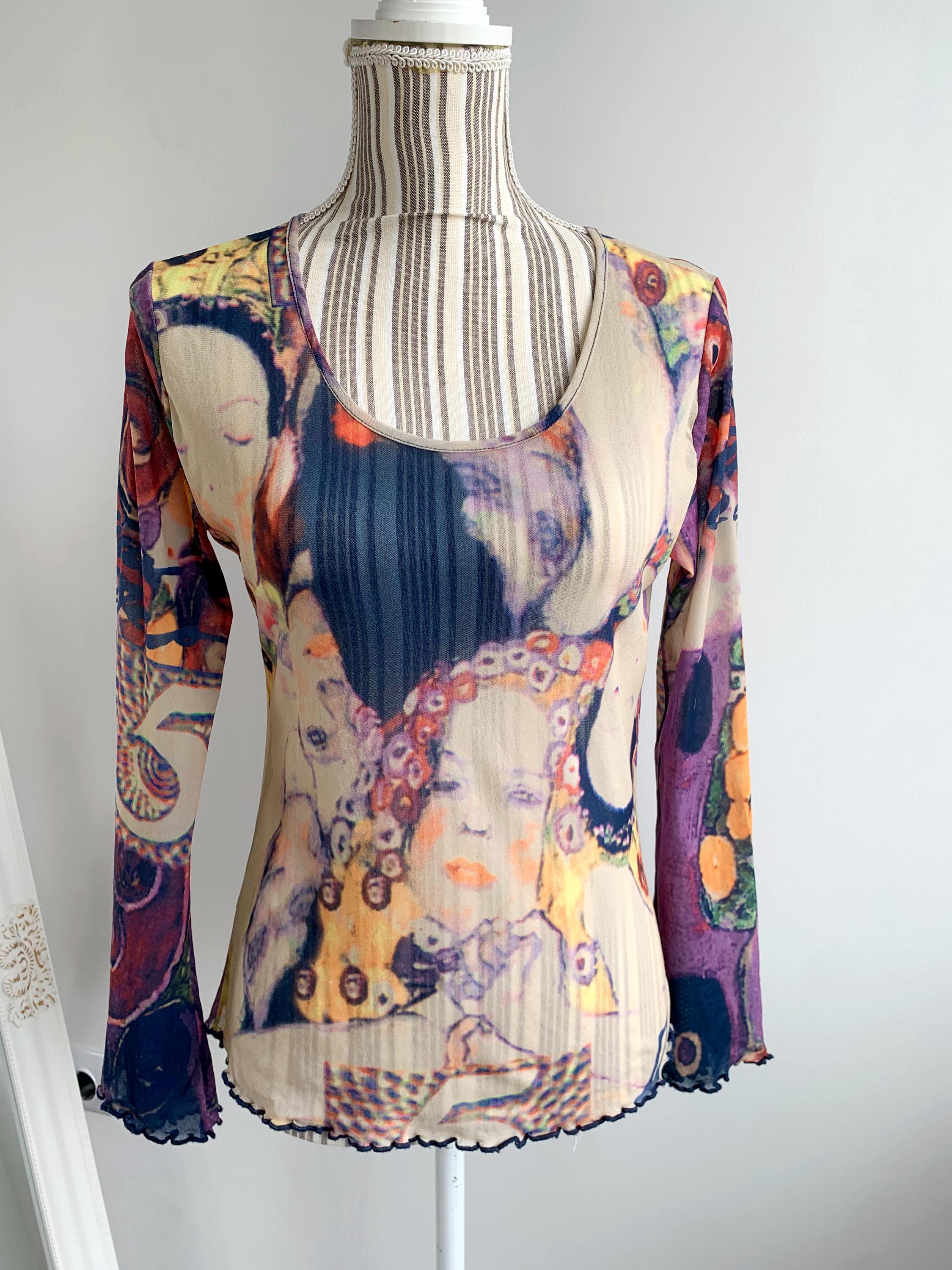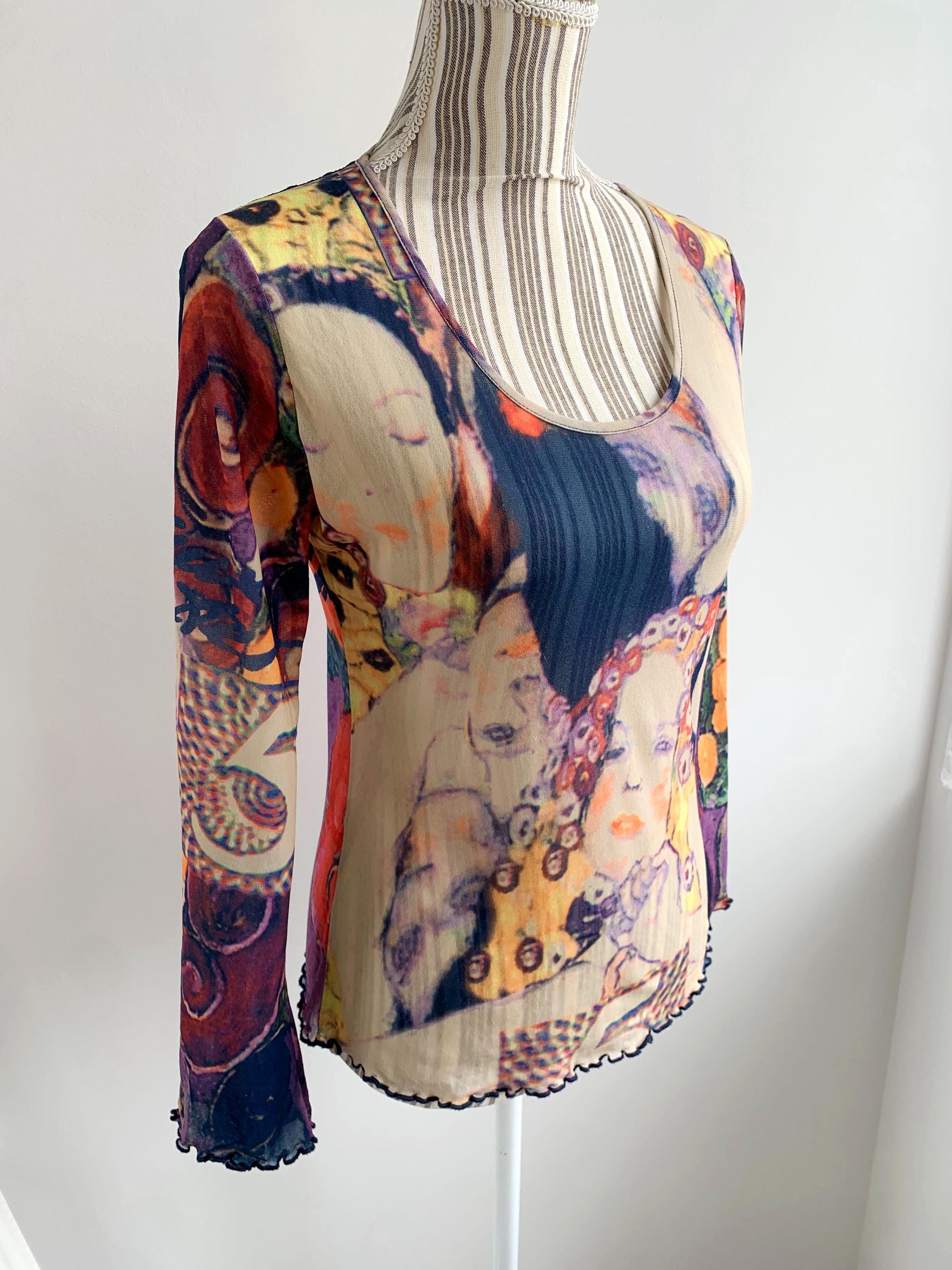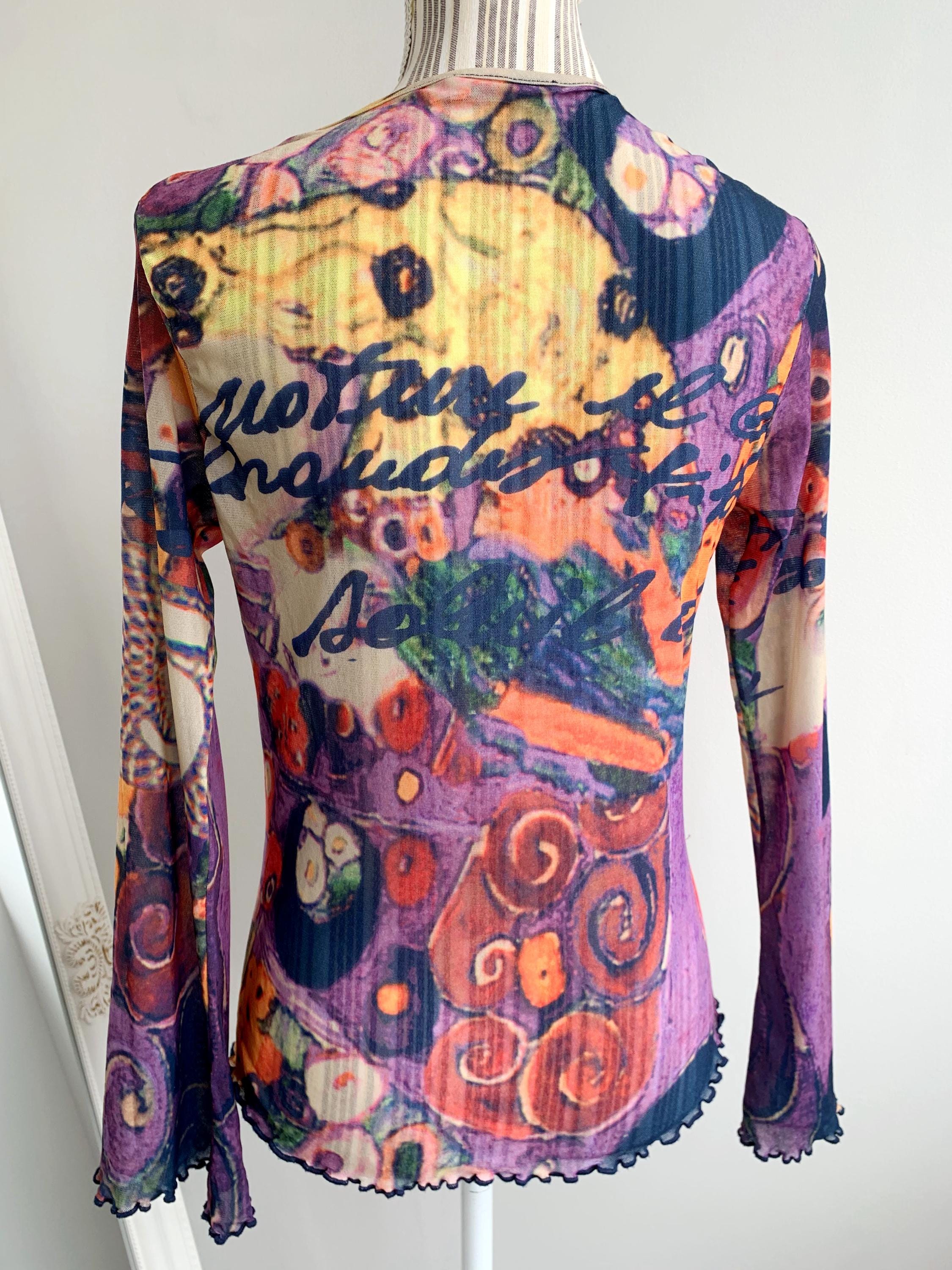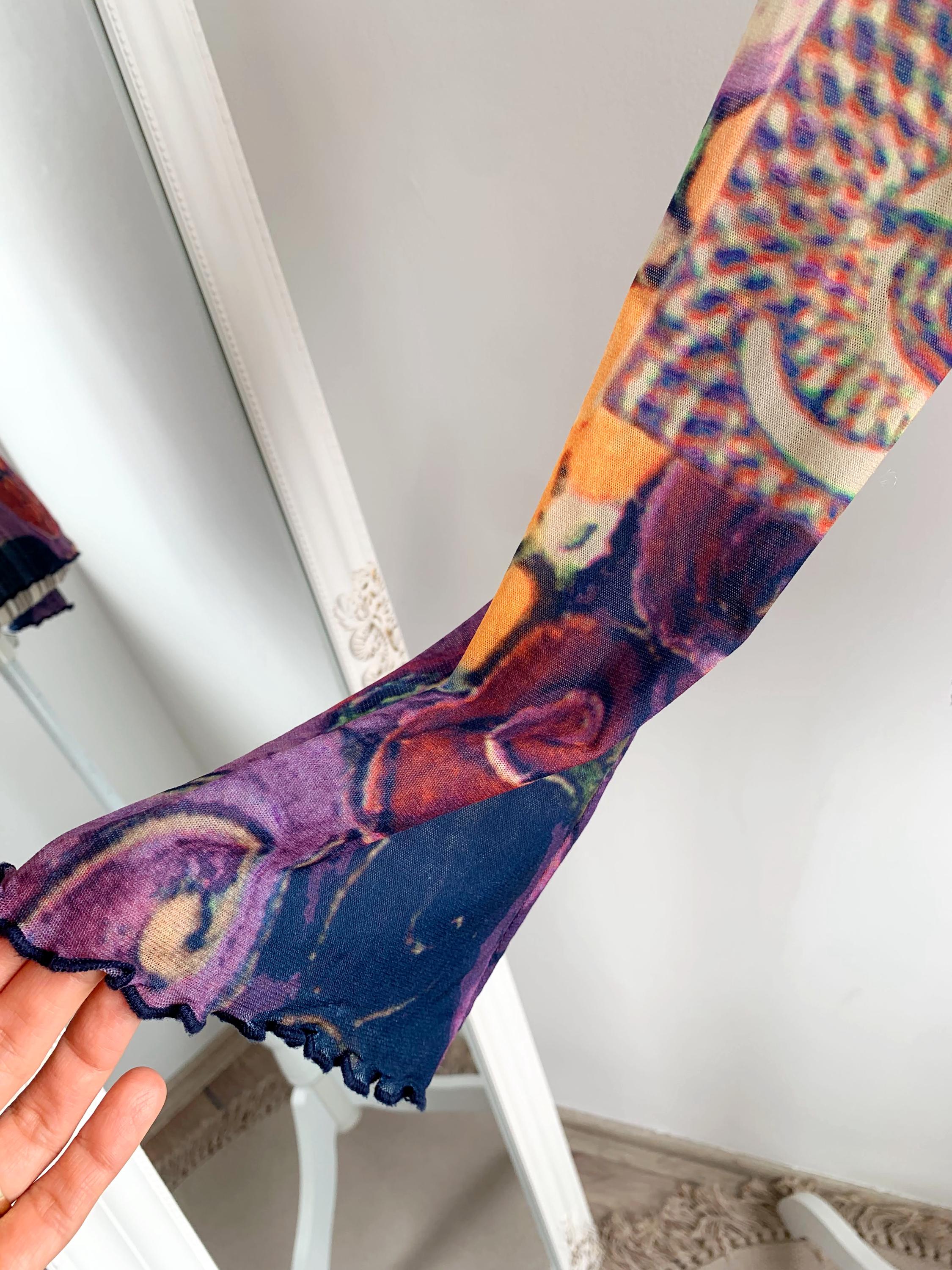 This is a lovely vintage Y2K sheer top size 42, which fits like M or L. This tulle top for women is made of stretchy mesh fabric with abstract portrait print in shades of nude beige, yellow, orange, green, purple and pink. It is made of lightweight stretchy polyester fabric which beautifully embraces your body. This mesh top can be worn as a beach cover up or as a sexy shirt with a cami or bra underneath. This see through top has long slightly flared sleeves at the bottom. This mesh lace top is size 42, which fits like size M or L. It has quite a bit of stretch. Please check the measurements below.