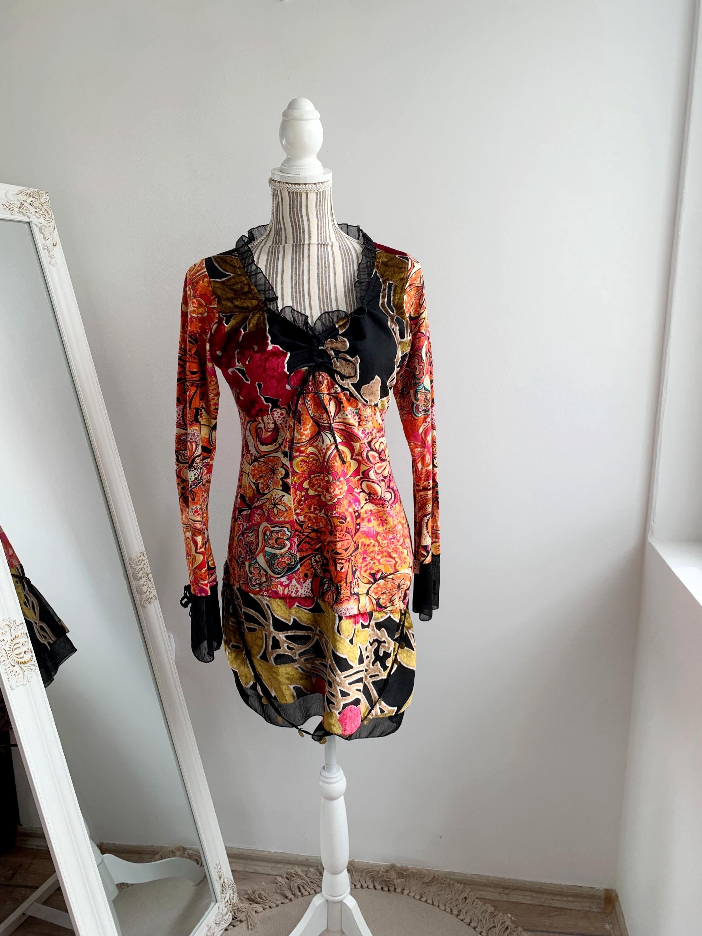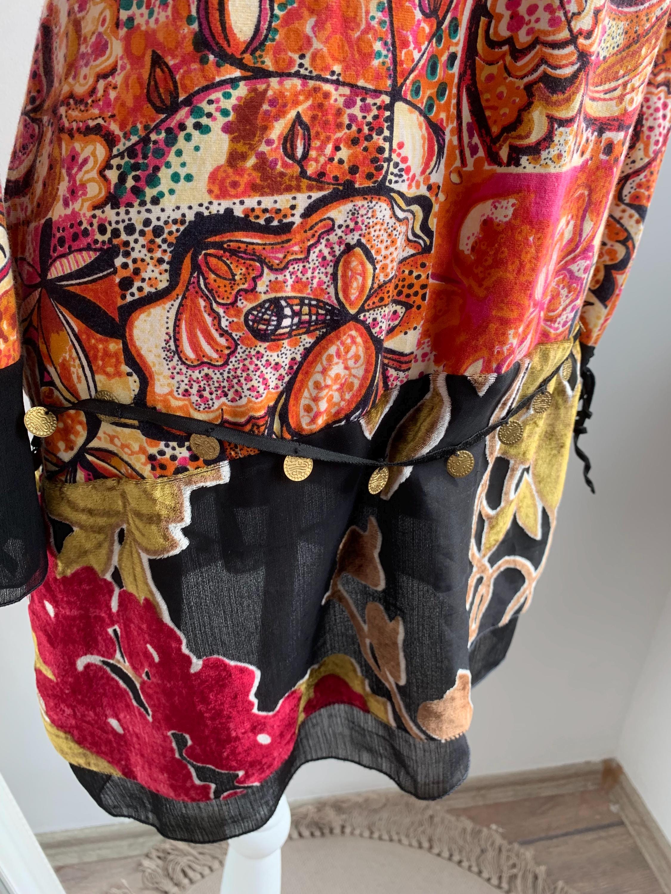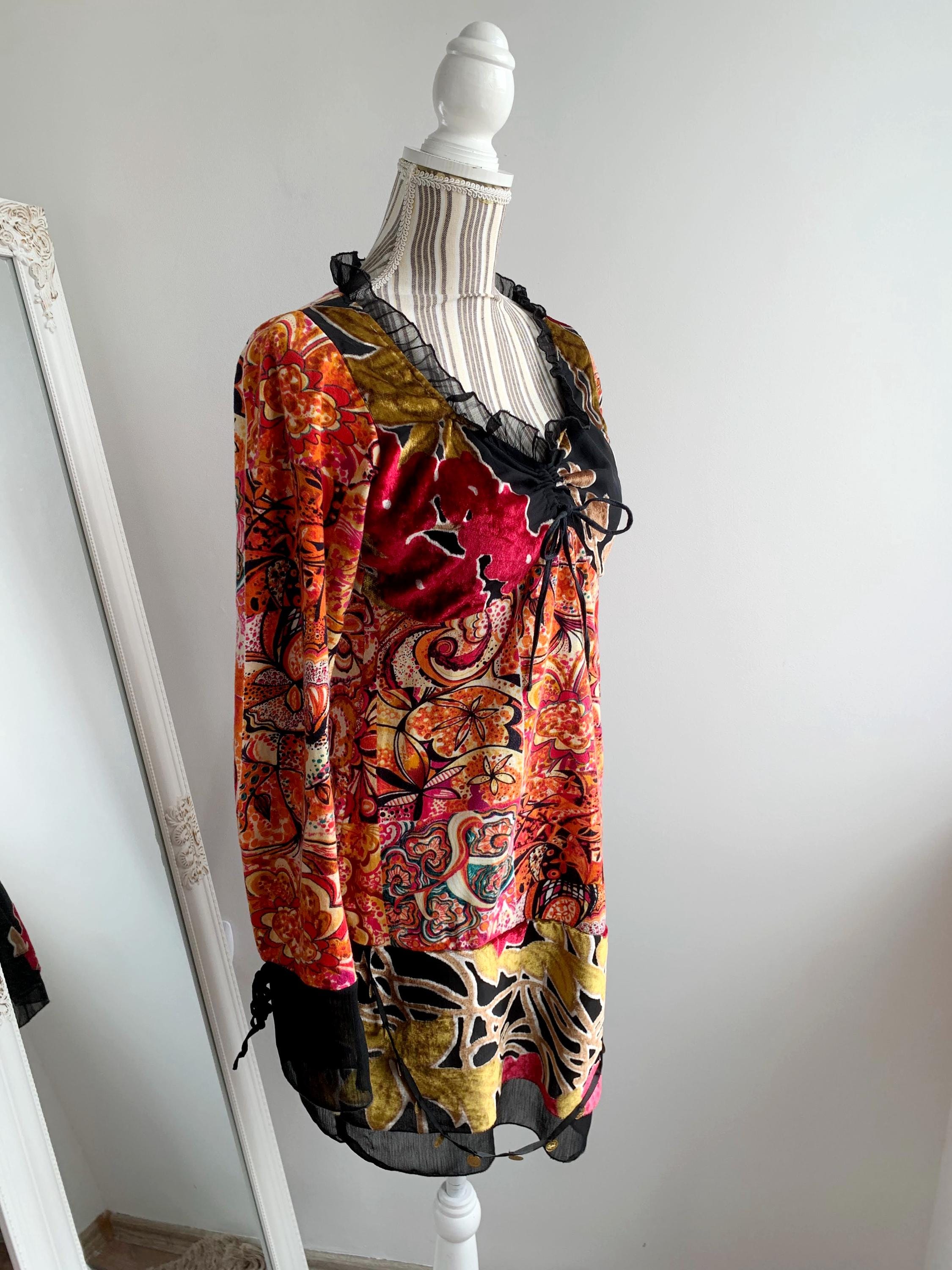 This is a beautiful 90s grunge dress by Savage Culture size M. This boho dress is made of stretchy viscose and elastane fabric (95% viscose and 5% elastane) with burn out velvet and black tulle accents at the neckline and sleeves. It has decorative coin strands at the bottom. It fits like women's size S/M.