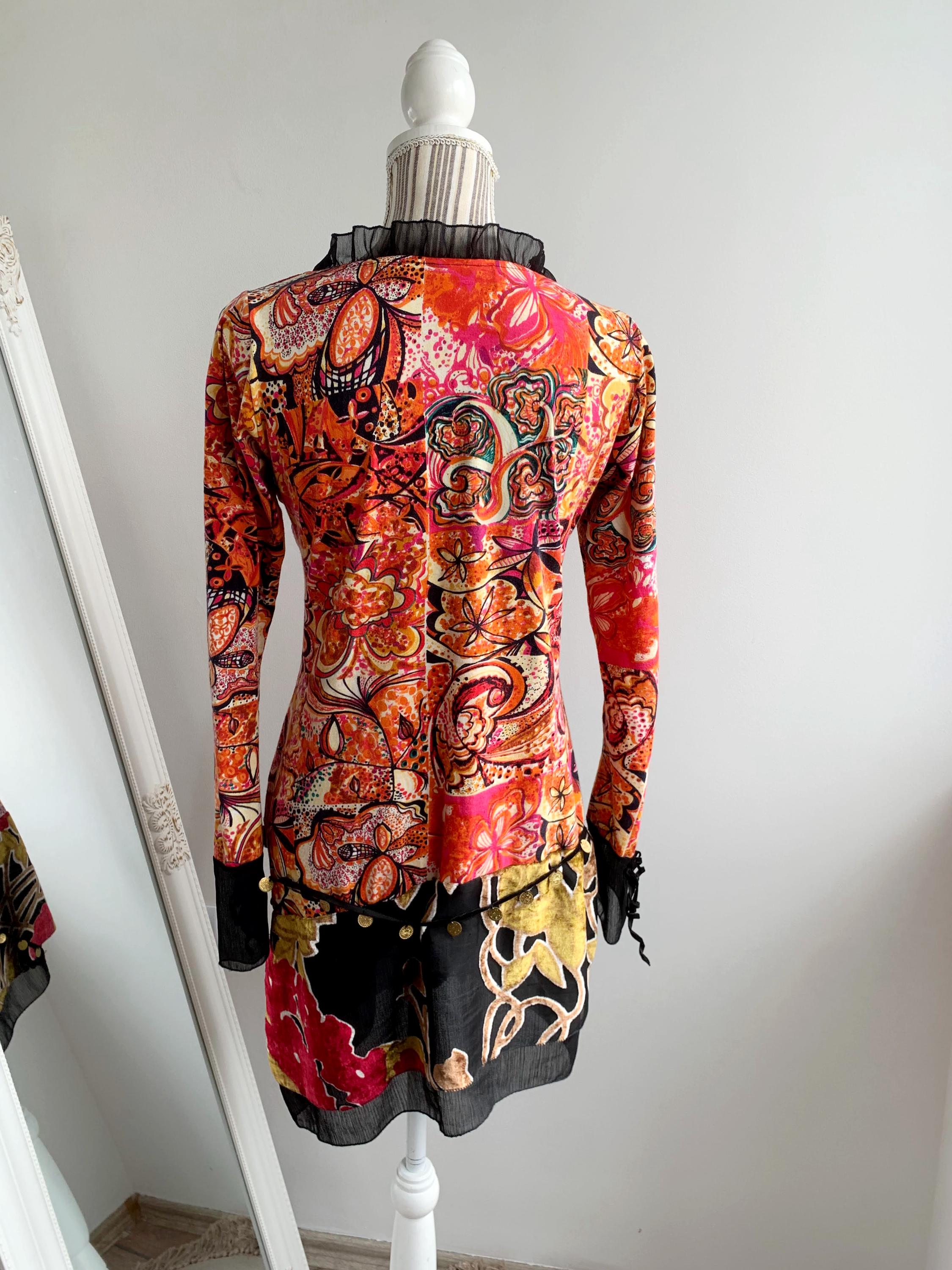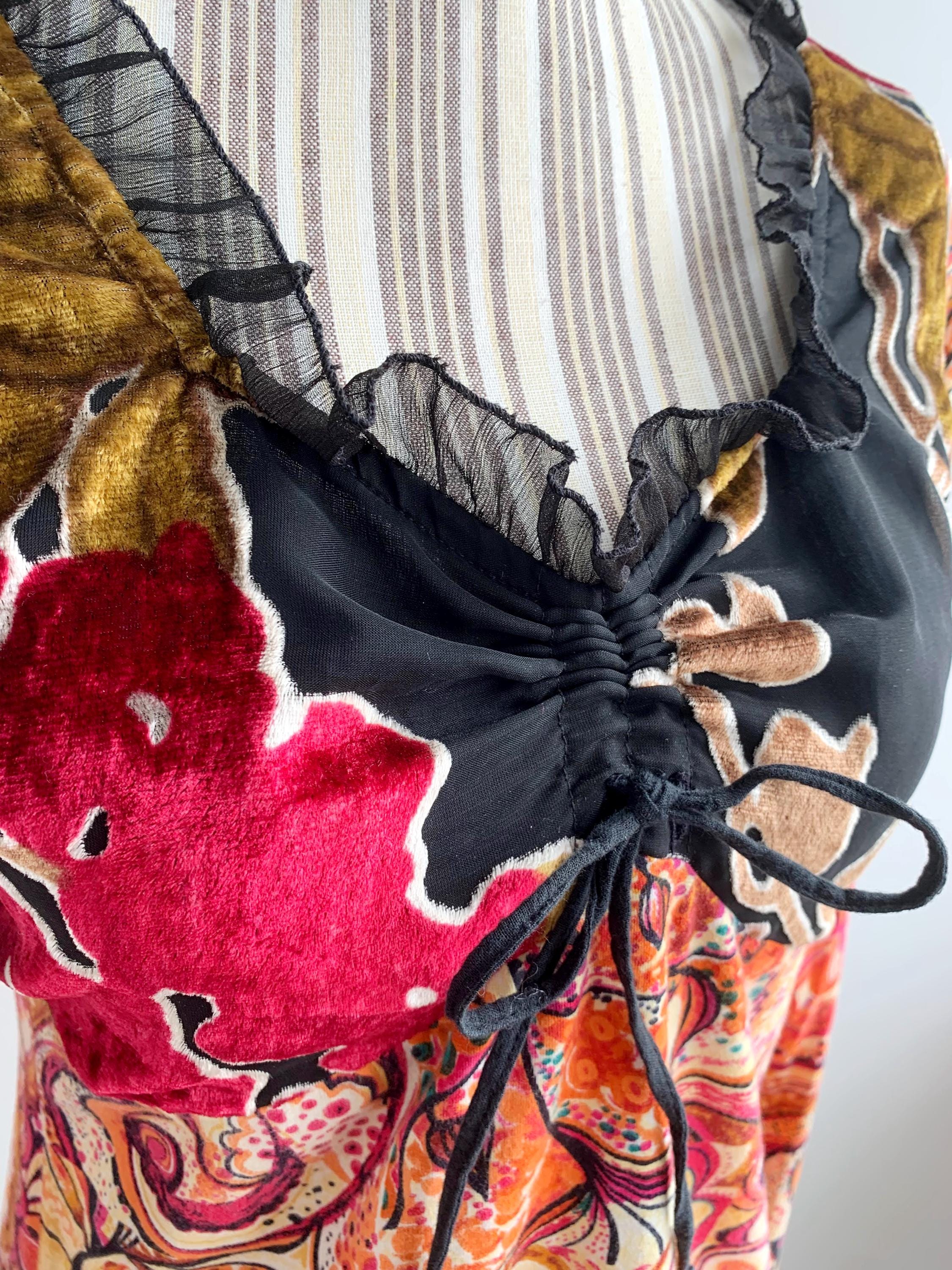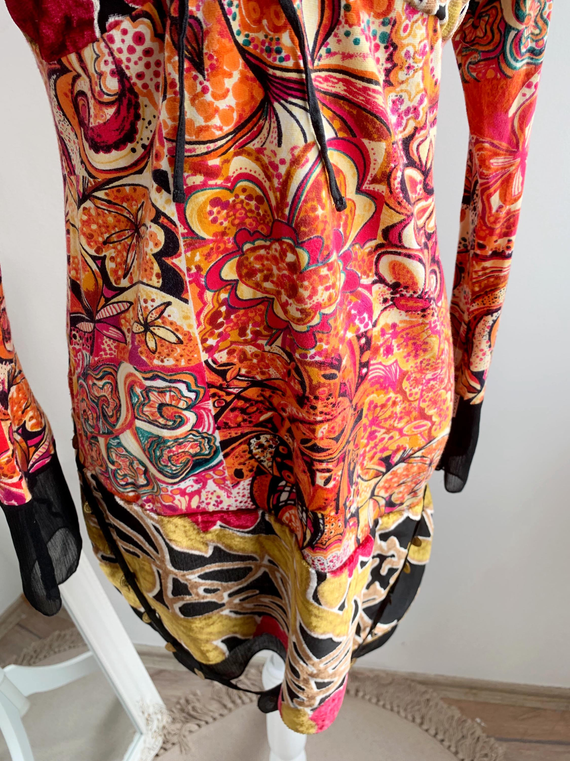 This is a beautiful 90s grunge dress by Savage Culture size M. This boho dress is made of stretchy viscose and elastane fabric (95% viscose and 5% elastane) with burn out velvet and black tulle accents at the neckline and sleeves. It has decorative coin strands at the bottom. It fits like women's size S/M.