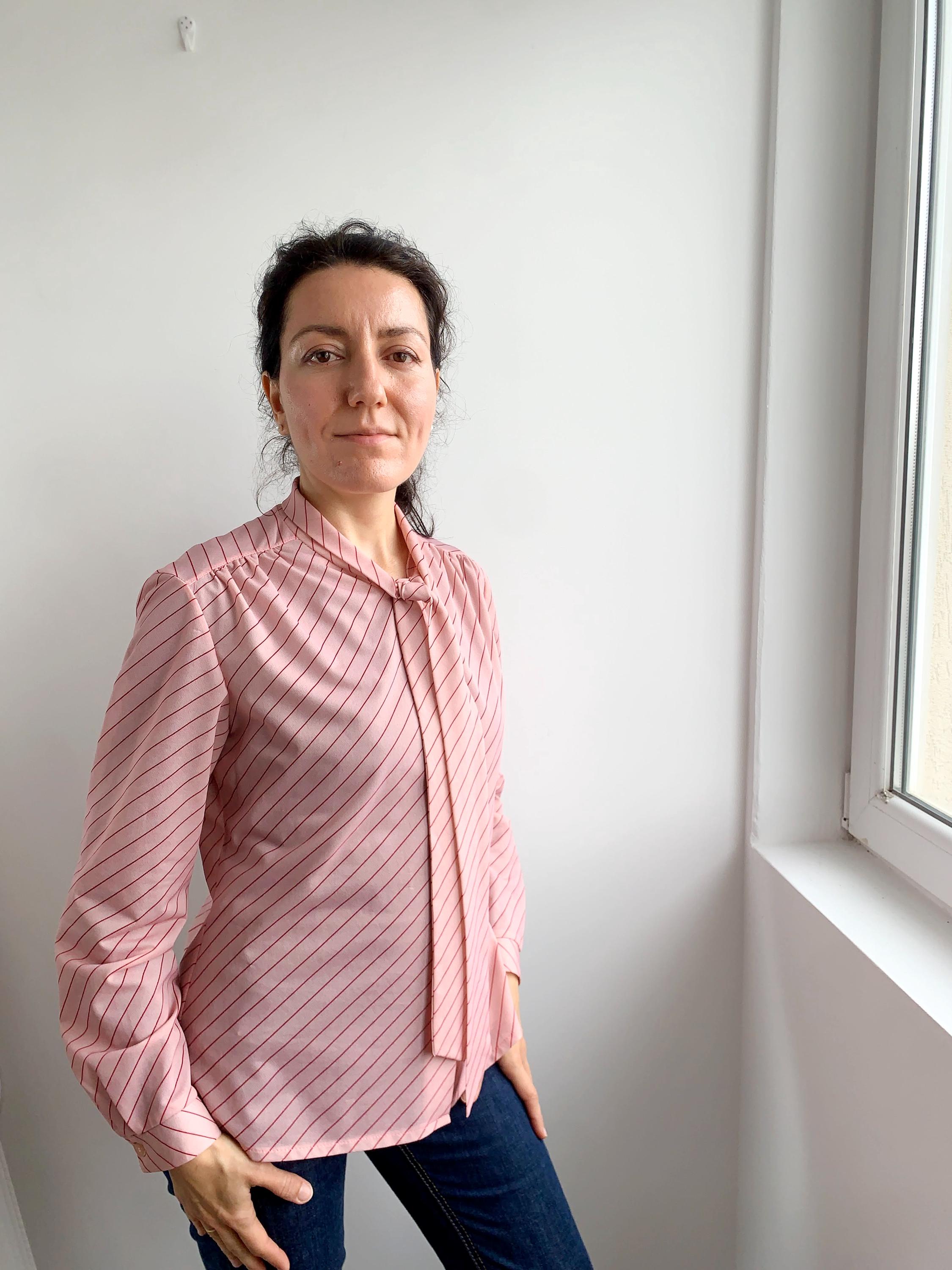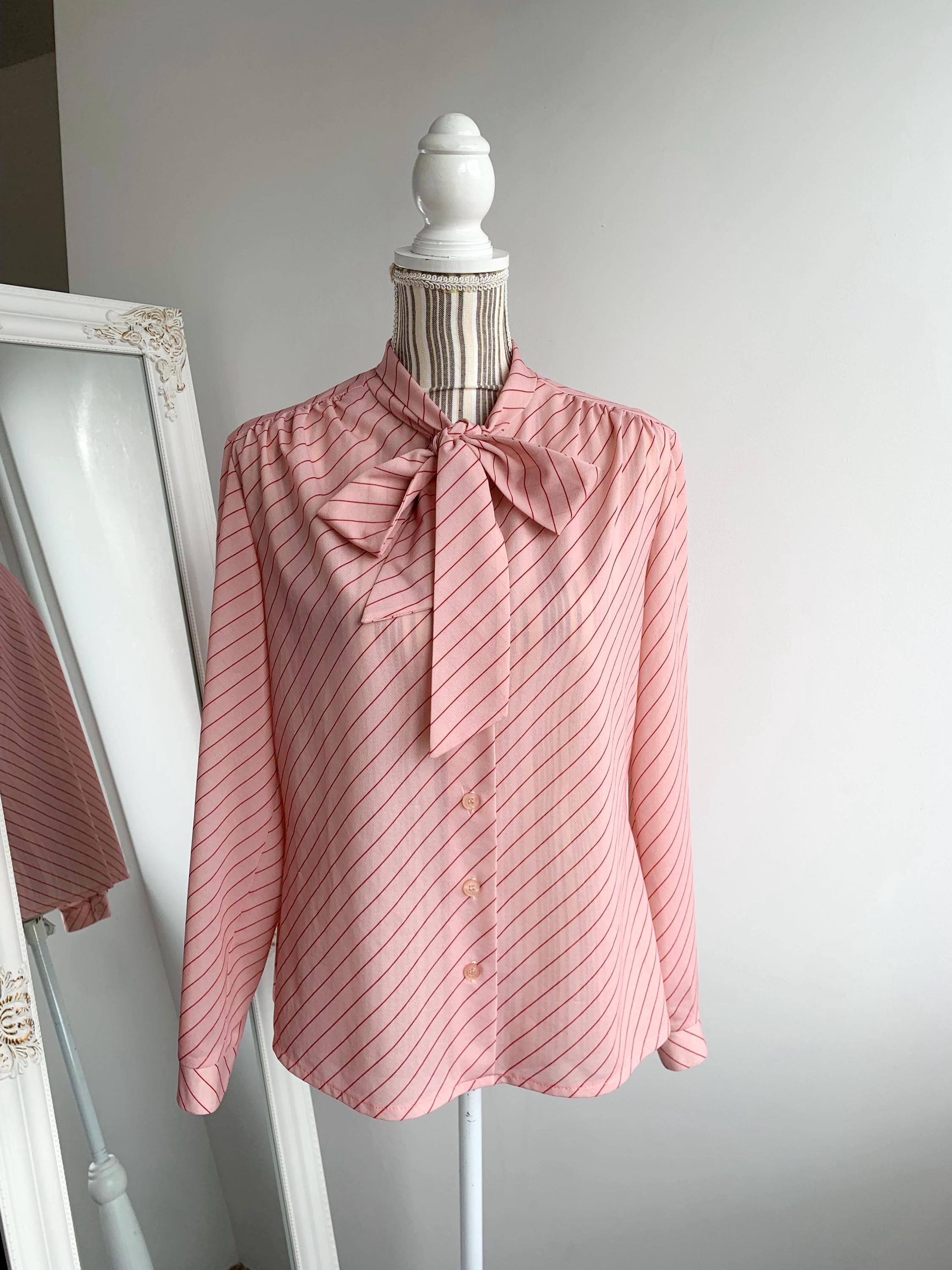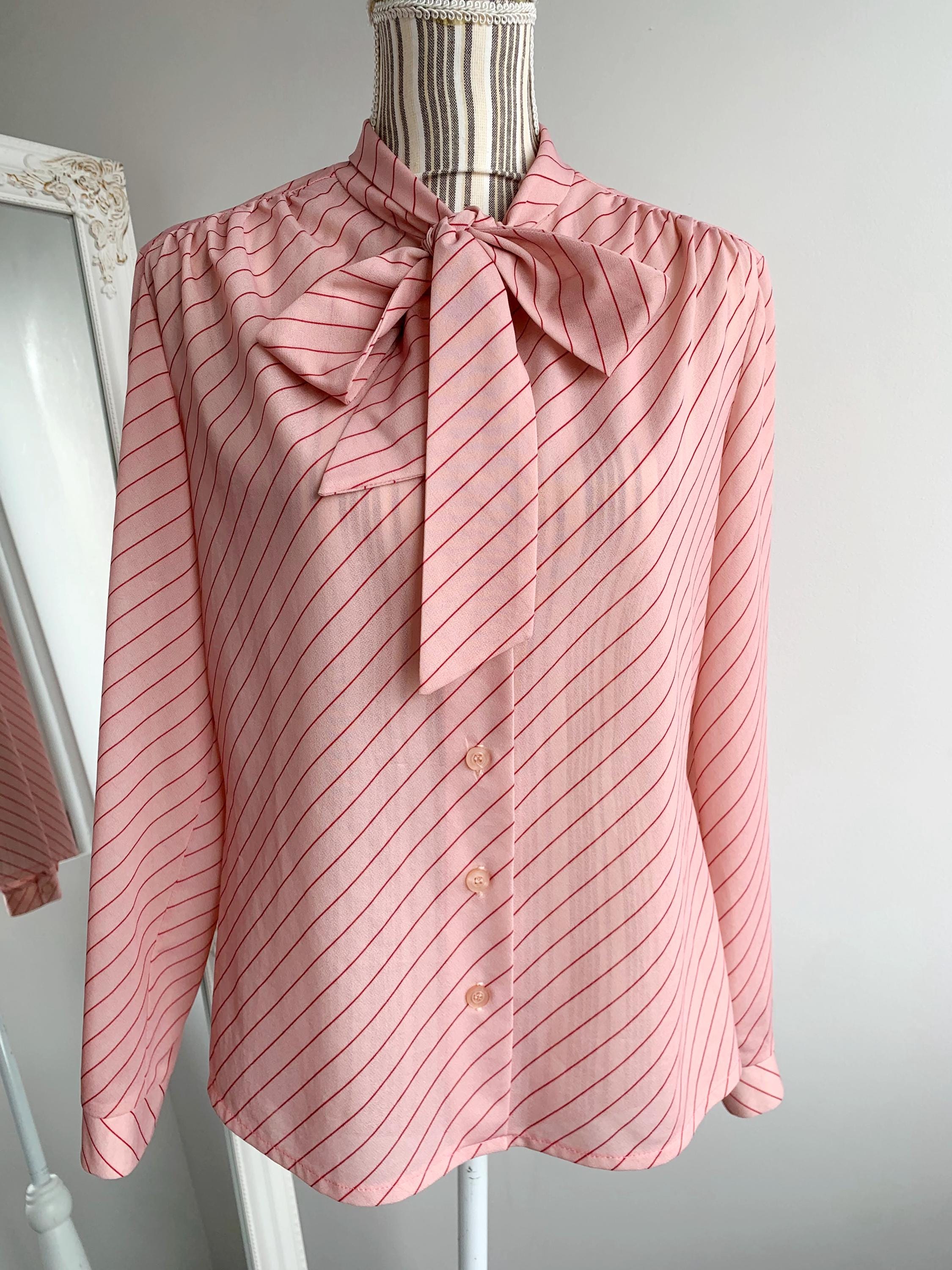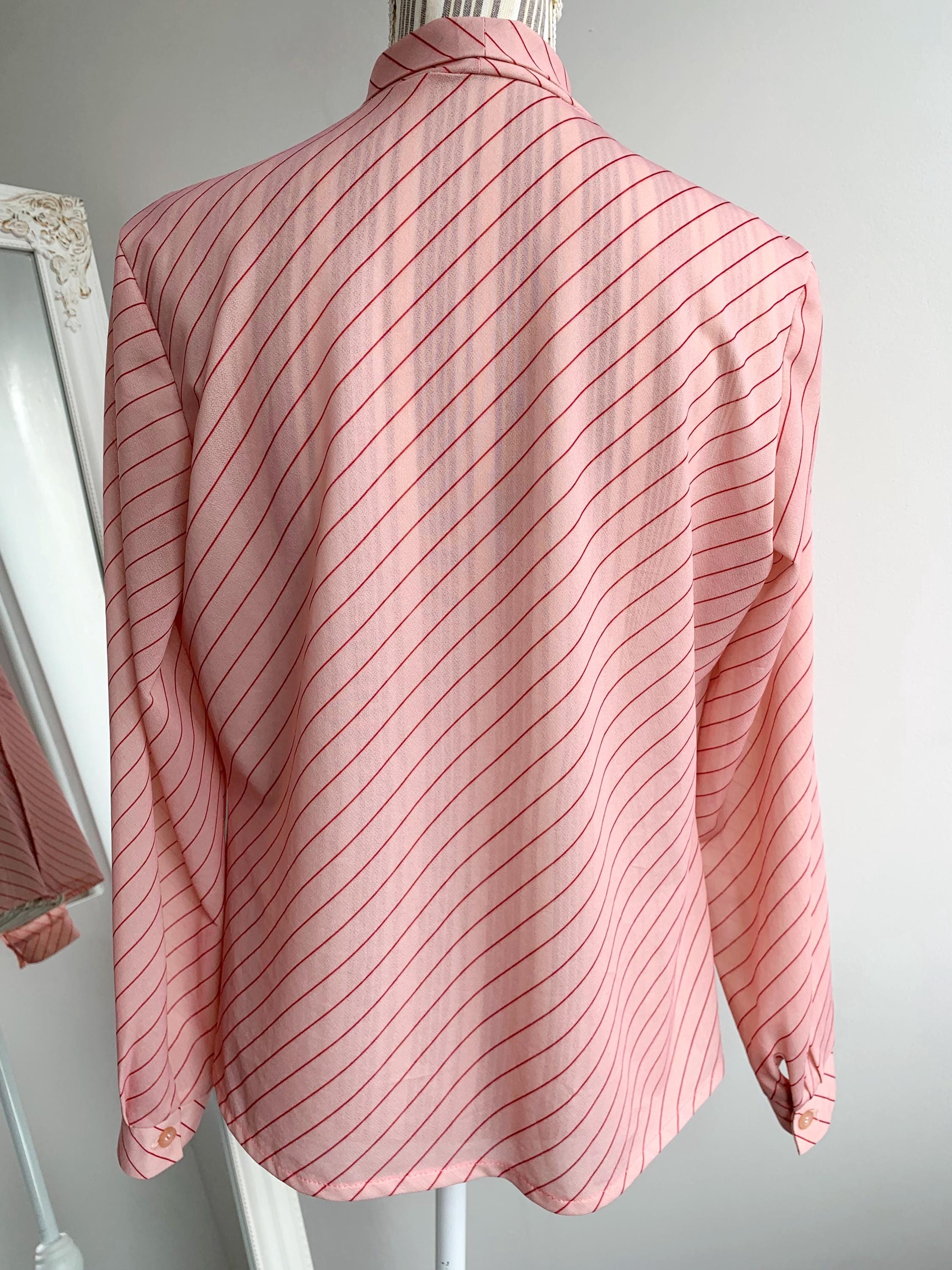 Embrace timeless style with this vintage 1970s light pink diagonal striped blouse, featuring a charming bowtie scarf collar and classic button-front design with pleats at the shoulders. Perfect for adding a retro flair to your wardrobe, this piece embodies the iconic fashion of the 70s era with its stylish relaxed and yet feminine silhouette. This semi sheer secretary blouse is made of stretchy jersey polyester fabric in light pink color with delicate red diagonal stripes. This retro bowtie shirt fits like size M/L.
