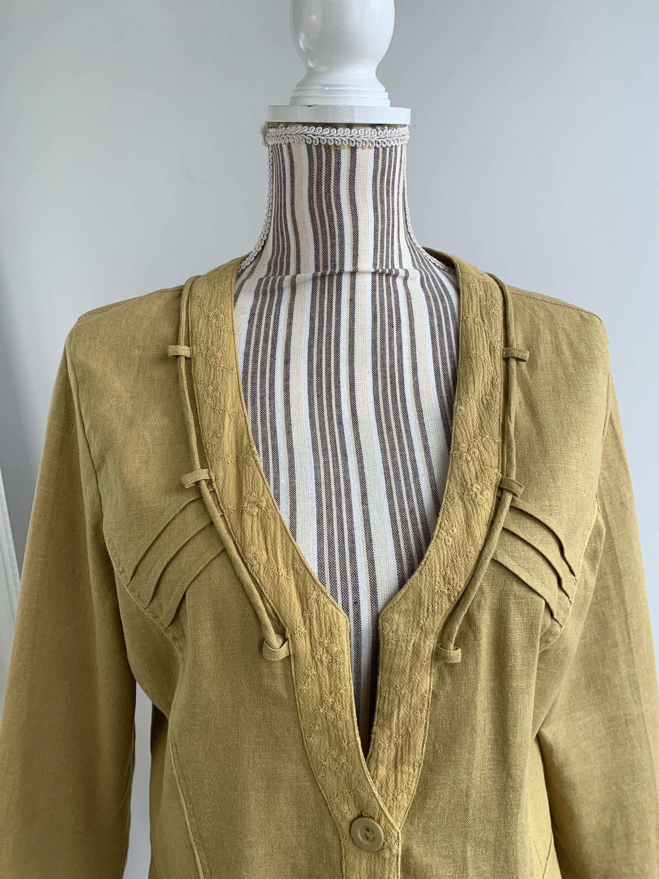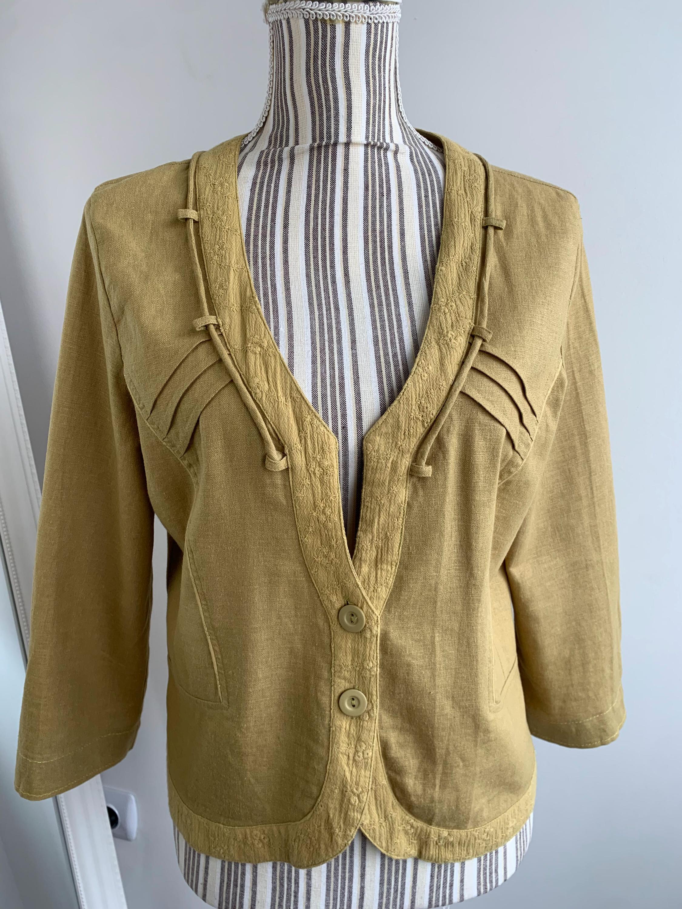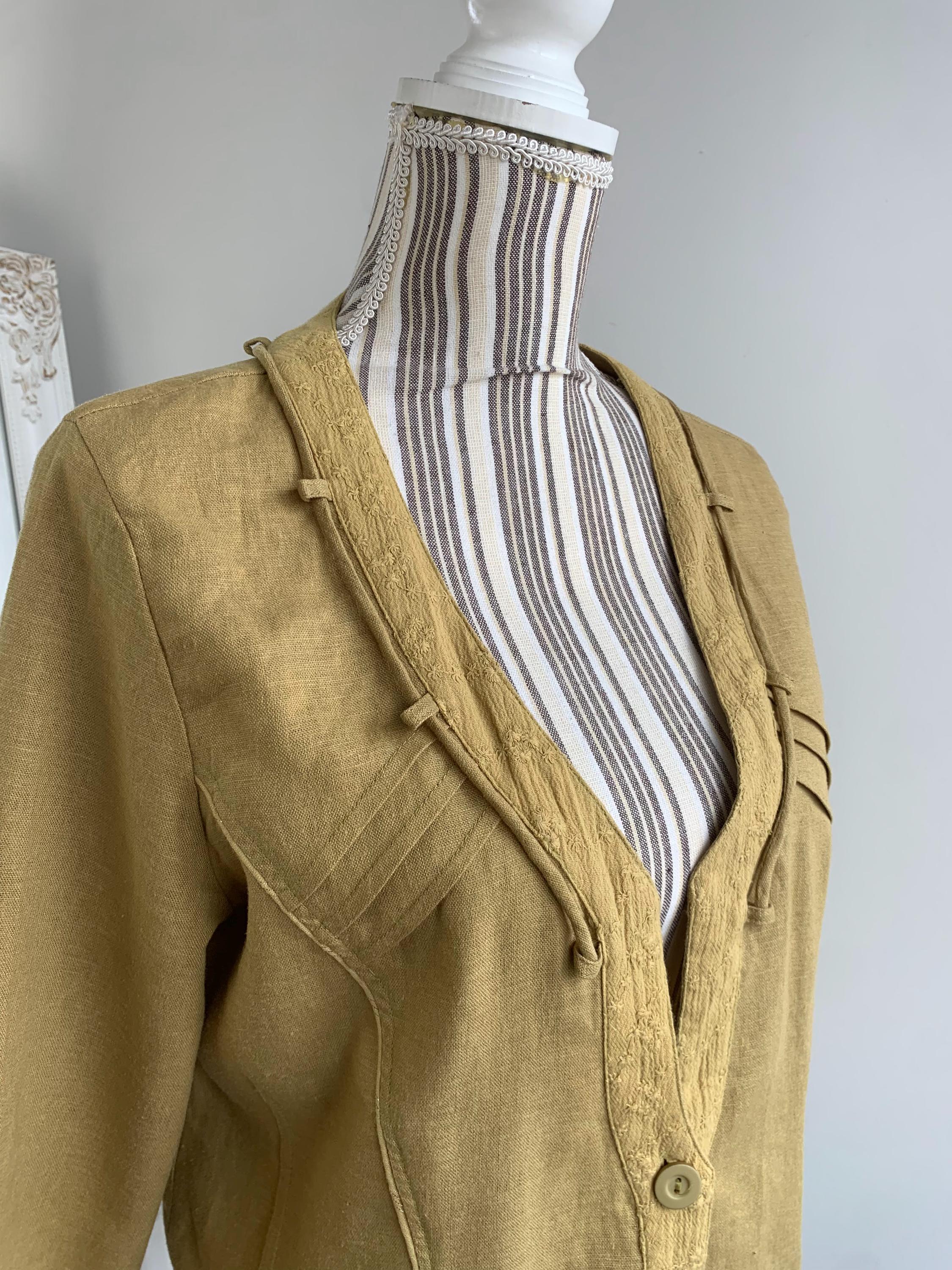 This is a beautiful vintage rayon linen blazer for women with 3/4 sleeves for women. This light unlined short linen coat is made of 55% linen and 45% rayon fabric in mustard green color. It has embroidery trim. This linen cropped blazer has button up closure. The linen fabric has some texture but still in great condition. Sustainable piece of linen clothing that you can enjoy. The size marked is France L, US/CA/ AUS M, it fits like size L. Please check the measurements below